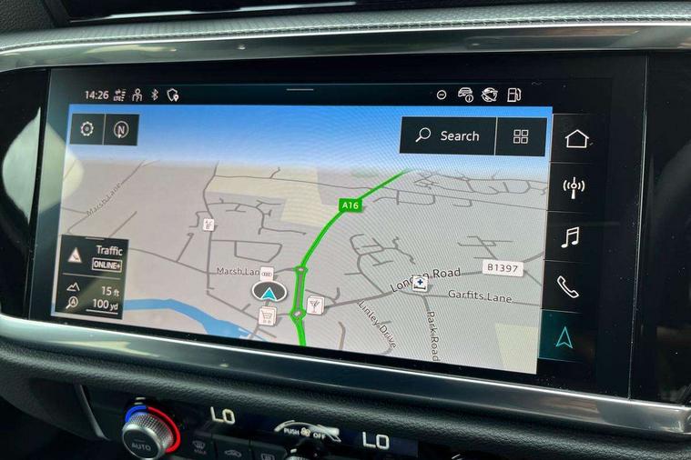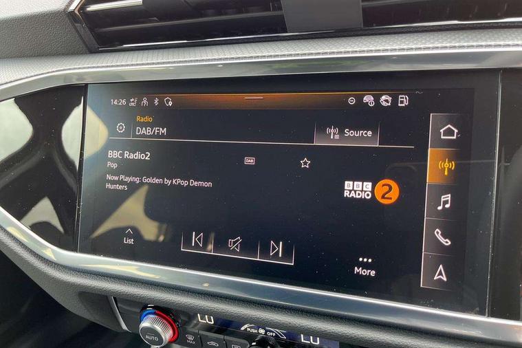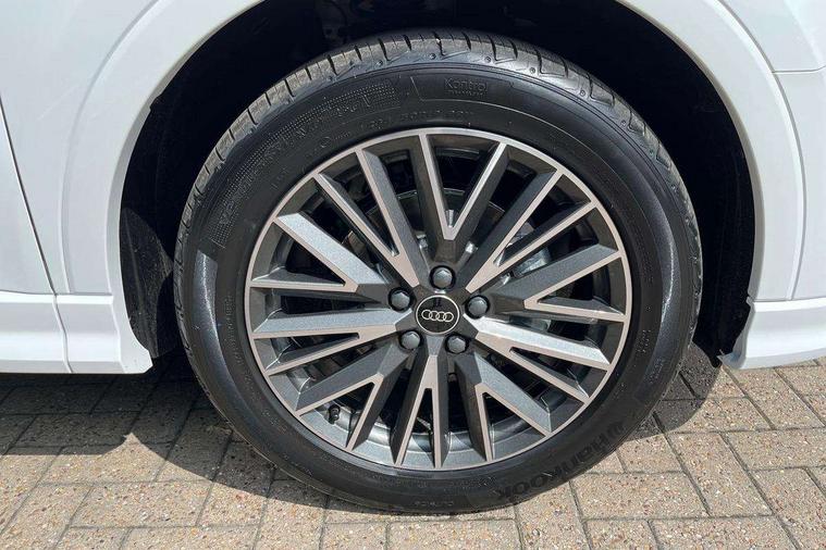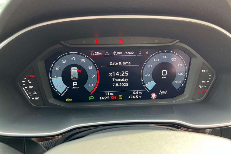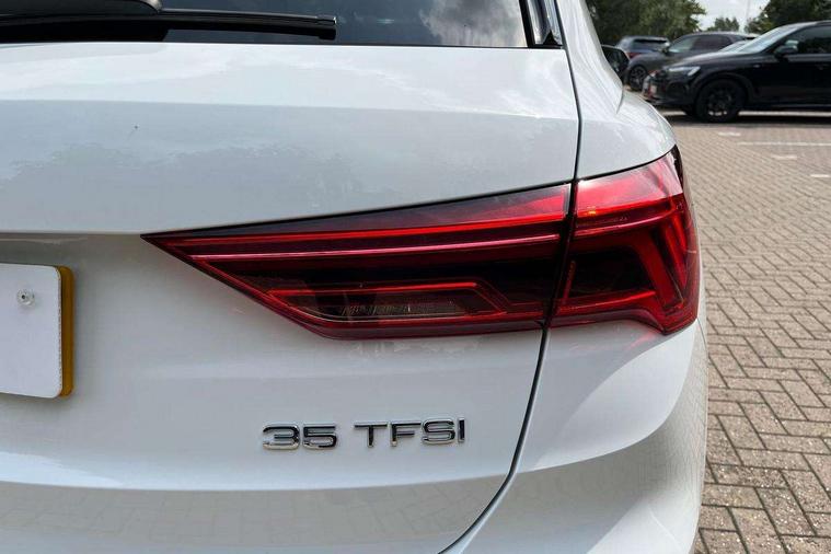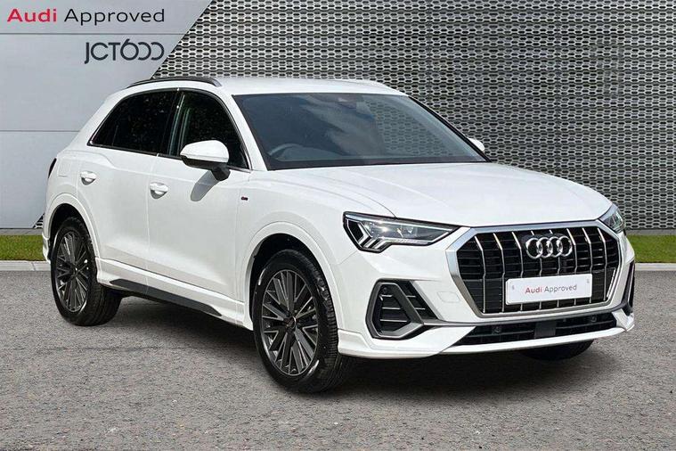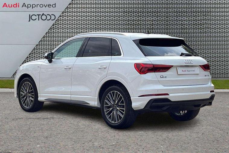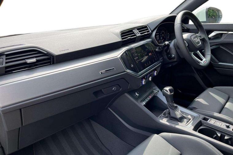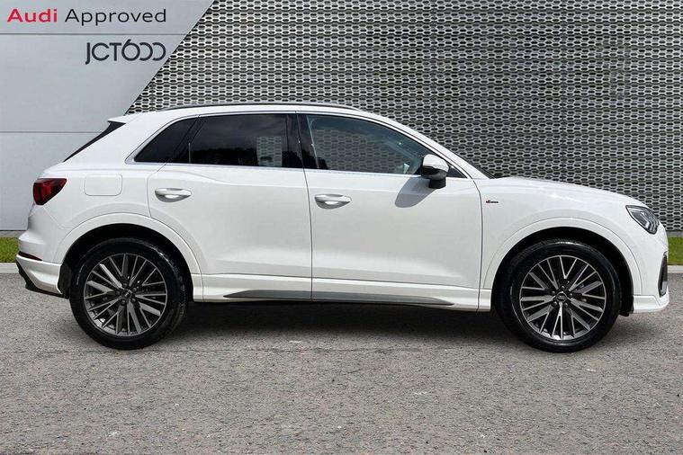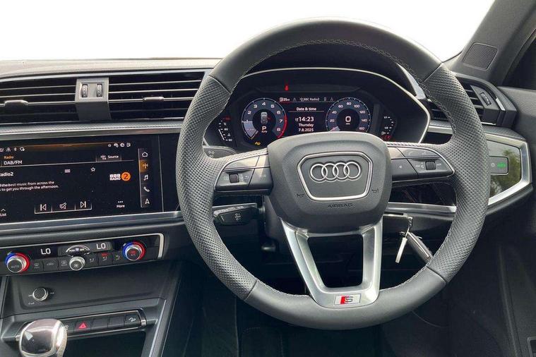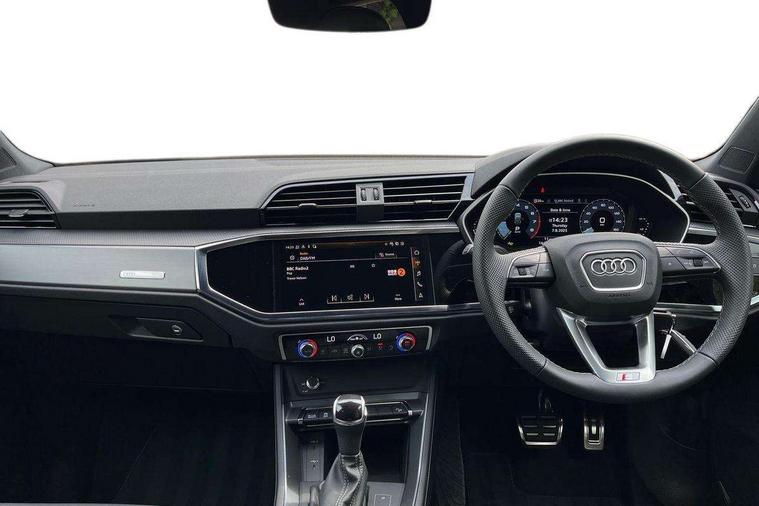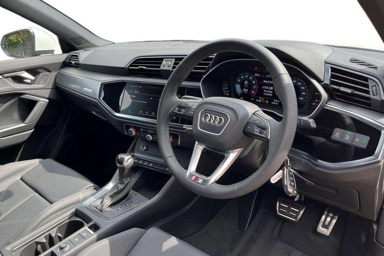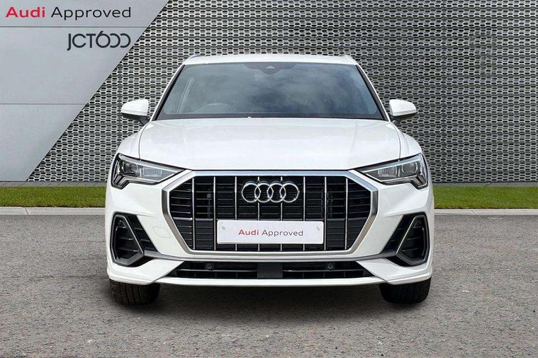 Amazon alexa Integration, Audi connect safety and service, Audi drive select, Audi lane departure warning, Audi Virtual Cockpit - 10.25" display, Bluetooth interface, Camera based traffic sign recognition, Distraction and Fatigue warning, Legal emergency call, MMI Navigation Plus with high resolution 10.1 inch touchscreen colour display, Power operated tailgate, Progressive steering, Service interval indicator, Smartphone interface includes wireless Apple carplay/Android Auto, Start stop system with recuperation, Voice control system with natural language interaction, Sports suspension, 2 USB-C ports with charge and data functions, 6 passive loudspeakers, DAB digital radio module, Acoustic windscreen, Aluminium roof rails, Aluminium window trim, Anthracite black radiator grille, Auto dimming door mirrors, Auto dimming frameless rear view mirror, Body colour front spoiler blade, Electrically folding, adjustable and heated door mirrors with integrated LED side indicators and kerb view function for passenger side, Front and rear electric windows, Front fog lights, Front side air inlets in matt platinum grey, Grille vertical bars in aluminium silver/Matt, High gloss black finish B and C pillars, LED Dynamic rear indicators, LED headlights with LED daytime running lights, LED rear lights, LED third brake light, Privacy glass dark tinted rear and rear-side windows (from B-pillar backwards), Rain and light sensors, Rear diffuser grille in grained matt black, Rear diffuser strip in matt anthracite black, Rear side wing doors, Rear wiper, S line badges on front wings, S Line front and rear bumpers and side skirts, Side skirt insert in matt Platinium grey, Variable front intermittent wipers, 12V socket in rear centre console, 3 seat bench in 2nd row, 3 spoke leather multifunction steering wheel features S badging and grips in perforated leather with contrast stitching, 40:20:40 folding with manual adjustment for 60:40 forwards/backwards position and backrest angle, Adjustable rear seat bench/backrest with centre armrest and cupholder, Black carpet mats, Black cloth headlining, Dual zone electronic climate control, Electric lumbar support, Front and rear black floor mats with contrast stitching in rock grey, Front and rear headrests, Front centre armrest, Height and reach adjustable steering wheel, Horizontal trim strip in matt platinum grey, Illuminated door sill trims with S logo, ISOFIX child seat mounting for front passenger with airbag deactivation and outer rear seat including top tether attachment point for outer rear seats, Luggage compartment sill protection in stainless steel, Manual front seats with height adjustment, Perforated leather gearknob, Single front passenger seat, Stainless steel pedals, Twin leather upholstery with front sport seats + S embossing, Non smoking pack - Q3, 3x3 point rear seatbelts, 6 airbags - Driver, front passenger, curtain and side windows, Audi pre-sense front with pedestrain and cyclist recognition, Electrically operated child locks on rear doors, Electromechanical parking brake, Electronic stabilisation control including ABS, ASR and EDL, Front seatbelt reminder, Hill descent control, Hill hold assist, Pre sense basic, Seatbelt monitoring, Tyre pressure warning, Warning triangle and first aid kit, Anti theft wheel bolts, Immobiliser, Remote central locking, Thatcham approved category 1 anti theft alarm, Aluminium look interior elements, Dark matt brushed aluminium inlay, Detail dashboard around MMI touch colour display in glass look, black with surround in aluminium look, Leatherette door armrest,