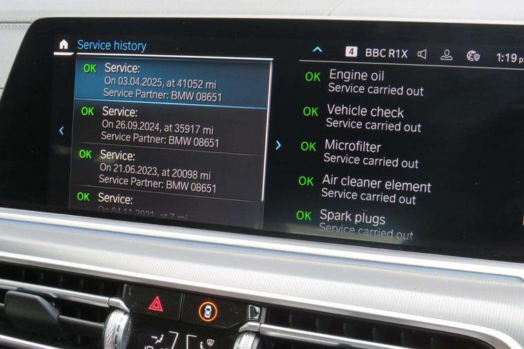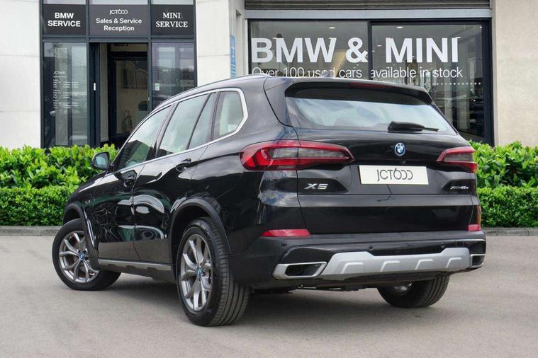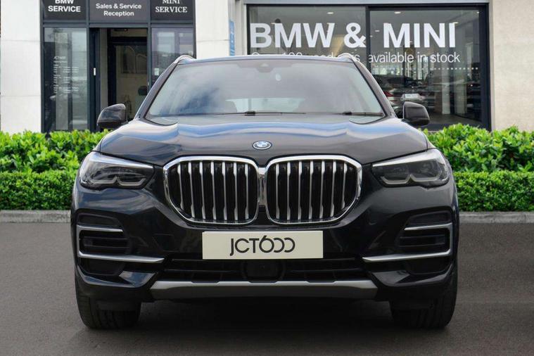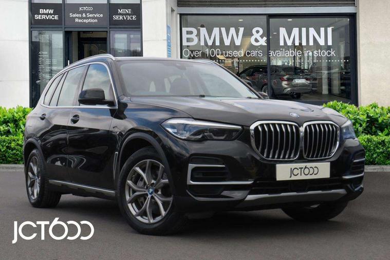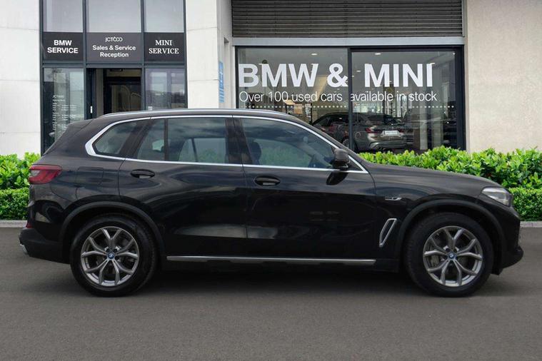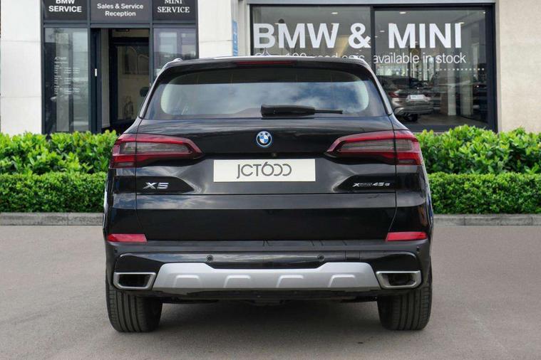 20GB hard disc drive (HDD) memory, Active guard plus, Attentiveness assist, Automatic tailgate with top hinged section open and manual bottom hinged section, BMW ConnectedDrive online services, BMW digital live cockpit professional - 12.3" digital instrument panel and 12.3" CID, with touch/voice command, BMW legal emergency call, BMW Teleservices, Brake force display, Brake pad wear indicator warning light, eDrive button to select between AUTO eDrive, MAX eDrive and SAVE Battery settings, Front/rear park distance control, Lights on warning, Oil sensor for level and grade, On board computer inc. average speed, fuel consumption, liquid crystal Info display, journey computer, outside temperature display, personal profile, Service interval indicator, Speed limit info display, 5 metre AC Fast charge cable, Adaptive 2-axle air suspension, Double VANOS, Double wishbone front axle, Drive performance control with ECO PRO comfort + sport mode, eDrive exterior sound, Eight speed steptronic sport automatic transmission and gearshift paddles on the steering wheel, High precision injection, Petrol Particulate Filter, Safety battery terminal clamp, Standard Charging cable (Mode 2) for home socket, Twin scroll turbocharger with Valvetronic, DAB Tuner enables digital radio reception, Favourite buttons, USB connection, USB type A 1.5A in cupholder, USB Type C 3A in centre armrest, Active Air Stream kidney grille with high-gloss chrome, Adaptive air flap control bar in high-gloss black, Aluminium exterior trim, Automatically dimming rear view mirror, Body colour bumpers, Body colour door handles, Body colour mirror housing, Dynamic brake lights with LED technology, Exhaust tailpipes - single, left and right with Chrome finisher, Follow me home headlight function, Front and rear electric windows with open and close fingertip control, anti trap facility and comfort closing, Heated windscreen washer jets, High beam assistant, High gloss black outer and central air intakes on front bumper with pearlescent chrome finish, High gloss black Side elements, LED daytime running lights, LED rear lights, Left charging flap on the front side, Matt aluminium roof rails, Pearlescent chrome front grille bars, Rain sensor with automatic headlight activation and windscreen wiper control, Rear side wing doors, Satin aluminium side window graphic, Third brake light in rear spoiler, Variable intermittent rear wash/wipe, Welcome light carpet, X5 on left tailgate, xDrive designation on right tailgate, 12V - Power sockets with 2x centre console and 1x luggage compartment, 3 seat bench in 2nd row, 40:20:40 split folding rear seats, Ambient interior lighting with 6 pre-designed selectable lights including dynamic function, Centre and rear interior light, Child seat ISOFIX attachment with rear outer seats includes top tether, Compartment in front of cupholder, Electric front seat adjustment with driver and front passenger memory function, Electrical steering column with adjustable height and length with activation and control on the steering column, Foldable rear centre armrest with 2 cupholders and storage compartment, Front and rear cupholders x 2, Front and rear door pockets, Front and rear door sill finishers with illuminated BMW designation, Front and rear side armrest integrated into door trim, Front footwell lights, Front reading lights, Light inside glove compartment, Lockable glove compartment, Luggage compartment floor panel with integral storage tray, Luggage compartment lighting, Make-up mirror lights, Multifunction controls for leather steering wheel, Multifunctional hooks, Rear head restraints, Seat back with flap pocket, Securing rings in luggage compartment, Storage bins on all doors, Storage tray and compartment with cover in centre console, Sunvisors with illuminated vanity mirrors, Three spoke sport leather steering wheel, Toolkit located in luggage compartment, Velour floormats, Connected Package Professional - X5 xDrive45e, Expanded exterior mirror pack - X5/X5 M, Non-smokers pack - X5, Airbags - driver/front passenger, rear and side, first and second row seats head airbags, front passenger seat airbag deactivation + knee airbag, Anti-lock braking system (ABS), Automatic Stability Control (ASC), Brake drying, Brake energy regeneration, Brake fade compensation, Braking pre-tensioning, Child proof locking system in rear door, Cornering brake control (CBC), Crash sensor activating central locking release, hazard warning lights, fuel cut off, interior lighting + activation of safety battery terminal clamp, Deformation zones - front and rear with door reinforcements and bumpers up to 2.5 mph, DSC - Dynamic Stability Control, Dynamic brake control, Dynamic Traction Control - DTC, Electromechanical parking brake with automatic drive away release and auto hold function, Electronic brake force distribution, Front and rear seatbelts with seatbelt stopper, seatbelt tensioner for front and outer rear seats and belt force limiter, Front head restraints with anti-whiplash, Height adjustable front seatbelts, Hill start assistant, Integrated brake system, Mechanical child proof lock on rear doors, Passive protection for pedestrians, Seat occupancy detection for driver and passenger side, Side impact protection, Three 3 point inertia reel seatbelts, Two tone horn, Tyre pressure monitoring system, Ventilated front and rear disc brakes, Warning triangle and first aid kit, Closing system with central locking, Driver and front passenger door centre lock switch, Locking wheel bolts, Thatcham 1 alarm system with remote control and engine immobiliser, Vehicle key, Start/stop toggle diamond shaped trim finisher in pearl chrome,