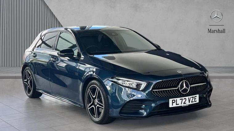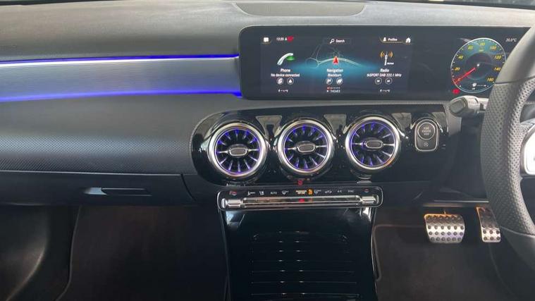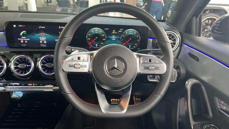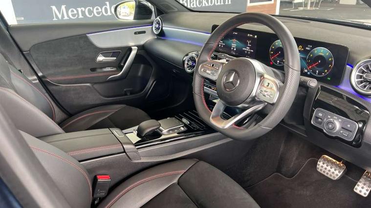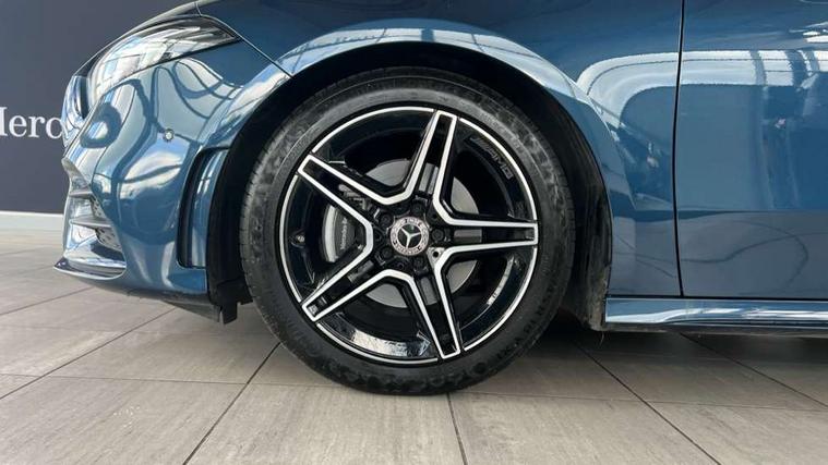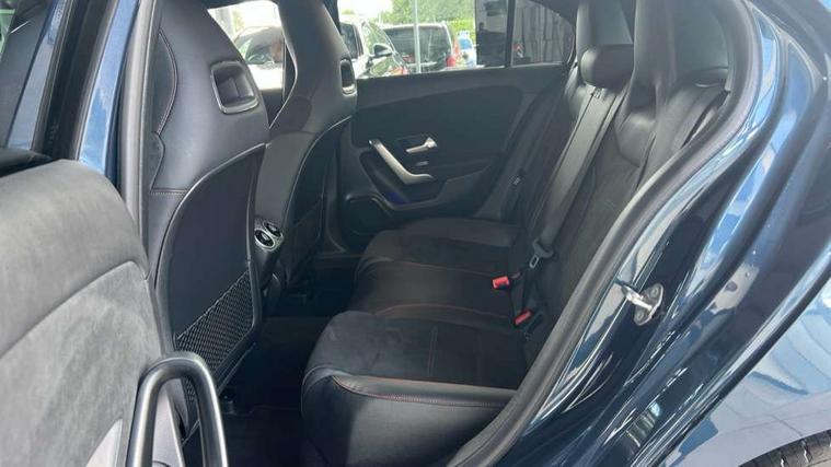 10.25" Digital instrument cluster display screen, 10.25" media display, 180 degree rear view camera with parking guidelines, Active parking assist with visual and audible warning of detected obstacles, Attention assist, Brake pad wear indicator warning light, Car wash mode, Cruise control + speed limiter, Direct steering, Dual bluetooth interfaces, DYNAMIC SELECT with a choice of driving modes (ECO, Comfort, Sport and Individual), ECO start/stop function, Fluid level warning indicator for fuel, oil, coolant and washer fluid, Hard-disk navigation, Hey Mercedes Voice activation, Lamp failure indicator, Lane keeping system, Mercedes me connect including emergency call system, accident recovery, breakdown and maintenance management, Mercedes me remote services, Outside temperature gauge, Owners manual in English, Pre-installation for private car sharing, Preinstallation for Mercedes Benz link, Service indicator (ASSYST), Smartphone integration with Apple CarPlay and Android auto, Speed limit assist, Speed sensitive power steering, Trip computer, Ultrasonic sensors positioned in the front and rear bumpers, Lowered comfort suspension, Rear axle torsion beam, 2 USB ports (type C) in rear stowage compartment and one in front of center console, 6 speakers, DAB Digital radio, MBUX multimedia system with DAB digital radio and touchpad including satellite navigation, Mercedes-Benz sound system - 100W, 4 Electric Front and Rear windows, Adaptive brake lights, AMG bodystyling - Front apron with splitter in chrome, rear apron with chrome trim and chrome visible trim elements in tailpipe, Automatic headlights, Black weather strip, Body colour bumpers, Body colour door handles with chrome inserts, Body colour side skirt, Electric adjustable and heated door mirrors with integrated LED side indicators, Exclusive diamond radiator grille, Exhaust system - Twin visible tailpipes in polished stainless steel, Headlamp assist automatic headlamp activation, Heated glass rear windscreen + timer control, LED High level third brake light, LED high performance headlamps with integrated LED daytime running lights, LED tail lamp, Privacy glass, Radio aerial, Rain sensing windscreen wipers with two sensitivity settings, Rear fog lights, Rear side wing doors, Rear wiper, 3 seat bench in 2nd row, 3 Spoke flat bottom leather multi function steering wheel with perforated leather in grip area, 40:20:40 split folding rear seats, Artico man-made leather/Microfibre Dinamica upholstery with red contrast stitching, Auto Mercedes-Benz child seat recognition sensor, Black air vents with surround in silver chrome, Black roof lining, Brushed stainless steel sports pedals with rubber studs, Controller on centre console with chrome surround, Floor mats with AMG lettering, Front centre armrest with storage compartment, Front seat backs luggage nets, Galvanished gear shift paddles on steering wheel, Heated front seats, Height/reach adjustable steering column, Illuminated Mercedes Benz lettering front door sills with changeable cover, Interior lighting - 64 colour Ambient lighting, Interior mirror with reading lamps in black and frameless, Manual height adjustable front seats, Rear head restraints, Seat occupancy sensor for front passenger seat, Single front passenger seat, Sports seats with integrated headrests, Stowage compartment in centre console with retractable cover, Sunvisors with illuminated vanity mirrors, Touchpad on center console, Twin front cupholders, Two zone thermotronic luxury automatic climate control, Light and sight pack - A Class, Mirror package - A Class, Night pack - A Class Saloon/Hatchback, Seat comfort pack - A Class, 3 rear 3 point seatbelts, ABS with Brake Assist, Active bonnet, Active brake assist includes forward collision warning system with autonomous braking, Adaptive brake assist with hold function and hill start assist, Black seatbelts, Childproof locks manually operated for rear doors and electrically operated for rear power windows, Crash responsive emergency lighting, Driver and passenger head and side airbags, Drivers knee airbag, Dual stage driver/passenger airbags, Electronic parking brake, ESP curve dynamic assist, ESP with ASR, Front and rear seatbelt reminder, Front brake callipers with Mercedes Benz lettering, ISOFIX and top tether child seat fixing points in two outer rear seats, Tyre pressure monitoring system, Warning triangle and first aid kit, Window airbags, Alarm system/interior protection/immobiliser, Keyless Go, Remote central locking and crash sensor with emergency opening function, Urban guard vehicle protection system with immobiliser and interior protection, Matrix look light longitudinal grain aluminium trim element, 18" AMG 5 twin spoke light alloy wheels aerodynamically optimised painted in black with highsheen finish, Summer tyres, Tirefit sealant kit,