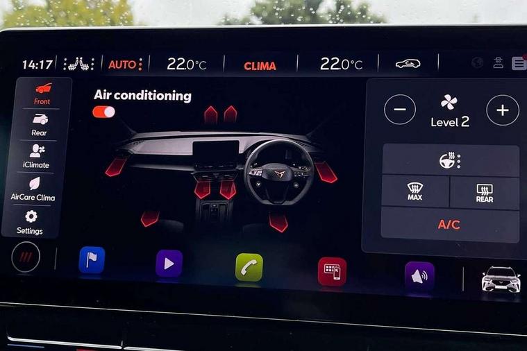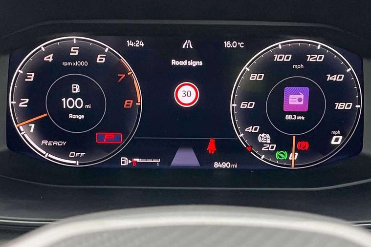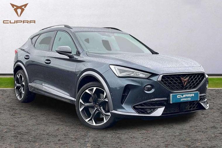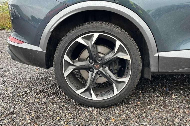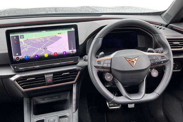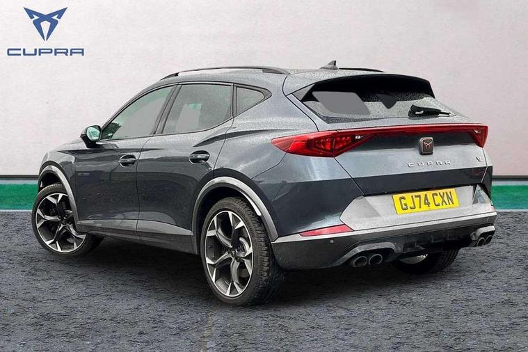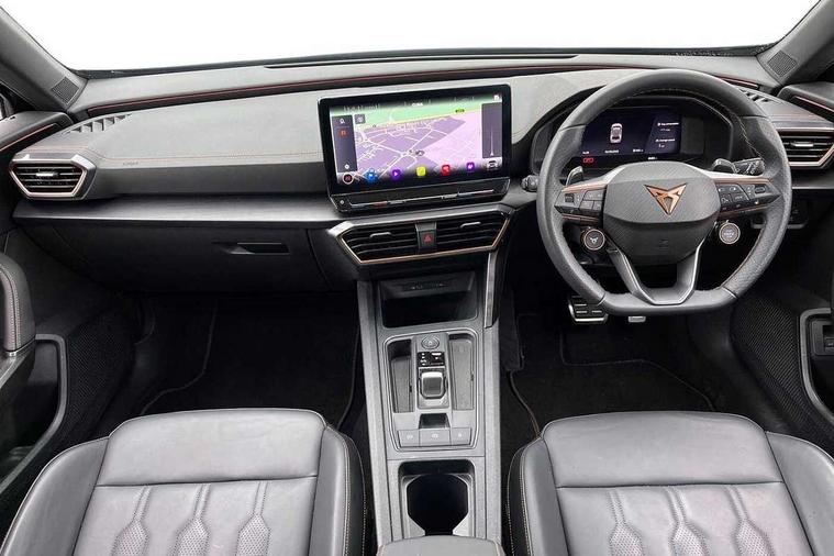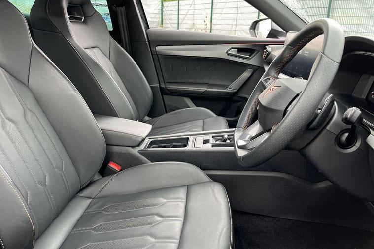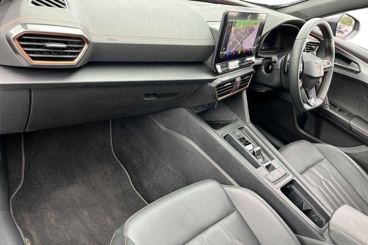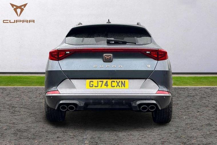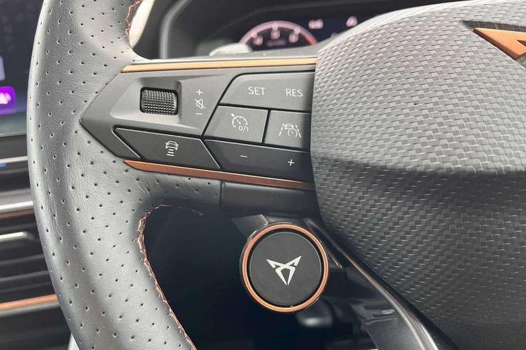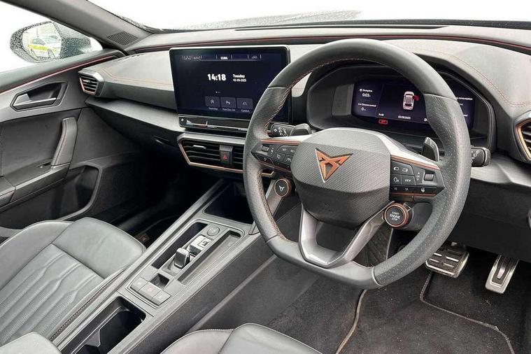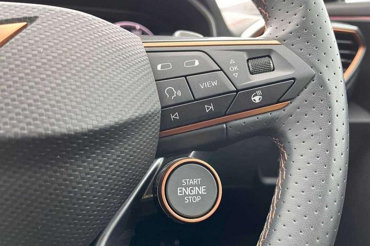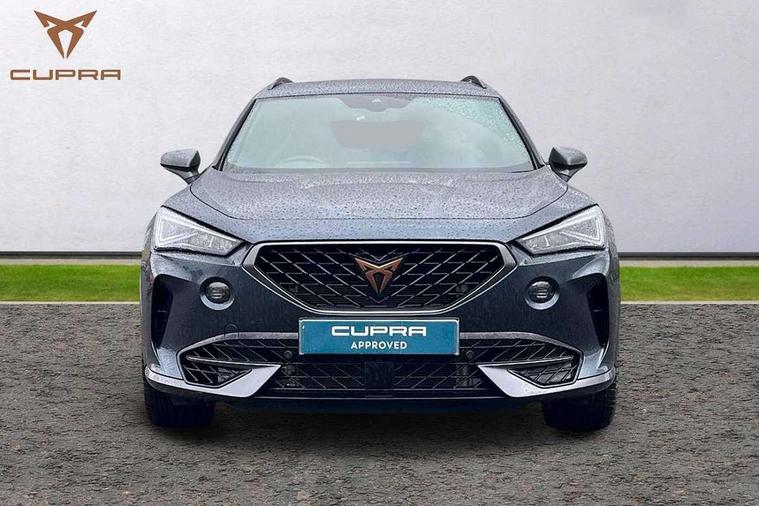 Digital cockpit and configurable dashboard, Driver alert system, Dynamic chassis control with driving profile selection (Comfort, Sport, CUPRA, Individual), Forward collision warning with automatic braking, Lane assist, Navigation system with 12'' Touchscreen Display, Park assist (inc front/rear parking sensors), Predictive adaptive cruise control with speed limiter, RPM, trip computer, outside temp gauge, instrument light brightness, low fuel warning light, lights on reminder, gearshift indicator, Service interval indicator, Speed sensitive power steering, Start/stop system with regenerative braking, Virtual pedal and electric tailgate, Voice control system, Wired Android Auto, Wireless apple carplay, Wireless phone charger, Electronic locking differential and dynamic traction support, Sports suspension with front shock absoption, 2 front and 2 rear USB type C sockets, Auxiliary input socket, DAB radio, Auto dimming rear view mirror, Body colour door handles, Body coloured bumpers, Dark grey wing mirror, Daytime running light with automatic headlight control and coming home feature, Dynamic headlight range control, Electric front/rear windows, Electrically adjustable heated and folding door mirrors with memory function, Front fog lamps with cornering function, Gloss black roof rails and window surrounds, LED Headlights, LED Taillights with dynamic indicator, Rain sensing wipers, Rear diffuser with twin exhaust pipe on each side, Rear side wing doors, Rear wash/wipe, Sports bumpers, Third brake light, Tinted rear windows, VZ logo rear badging, Welcome lights, 12v power supply in centre console, 12V socket, 12v socket in loadspace, 2 front and 2 rear reading lights, 230V socket, 3 seat bench in 2nd row, 60/40 split rear bench seat with armrest and mechanical seat release, Black headlining, Cupra sports pedals, Dust/pollen filter, Front and rear head restraints, Front centre armrest, Height/reach adjust steering wheel, Illuminated interior front door sills, Illuminated sunvisor with mirror, Isofix, Leather heated multi-function sports steering wheel with start stop, CUPRA mode button and gear shift paddles, Luggage tie-down hooks, Single front passenger seat, Three zone climate control with control panel in rear, Variable luggage/load compartment floor, Wraparound lighting, Genuine Nappa leather Pack - Cupra, Safety and driving pack (XL) - Formentor, 3 point seatbelts on all rear seats, ABS, Brake control system - ESC and brake booster, Child proof door locks, Driver and front passenger airbags with front passenger airbag de-activation, Electronic parking brake, Front and rear disc brakes, Front side curtain airbags, Hill hold control, Public e-call, Seat belt reminder for front and rear seats, Tyre pressure monitoring system, Anti theft alarm system, Keyless entry and start system (KESSY), Locking wheel bolts, Copper and aluminium interior detailing, 19" 'Exclusive' machined sport matte black and silver alloy wheels, Space saver spare wheel,