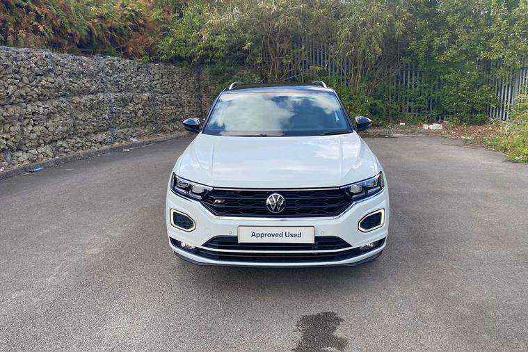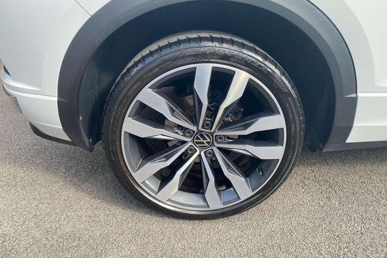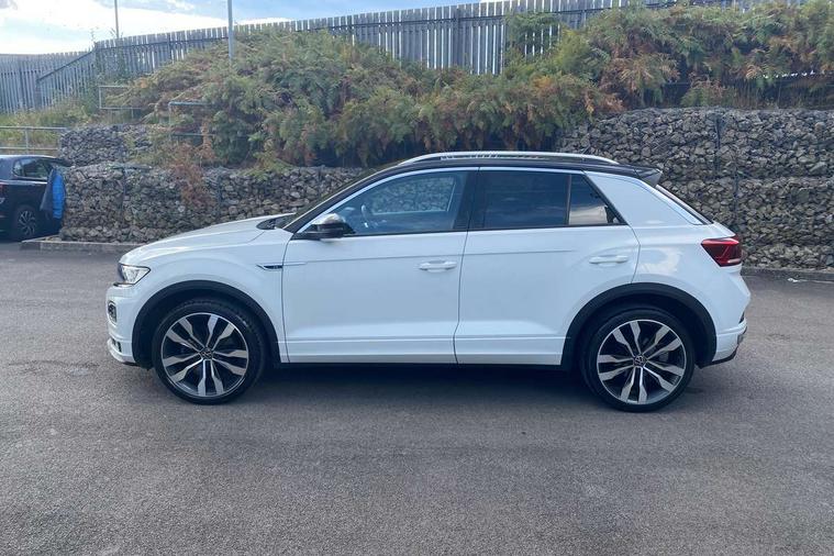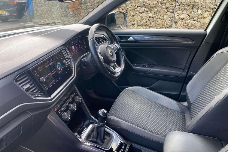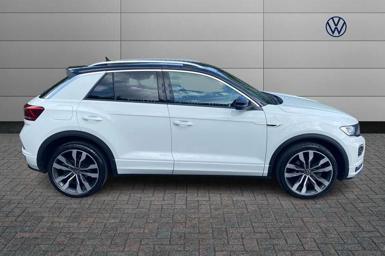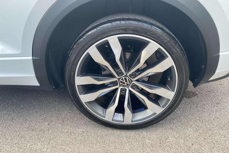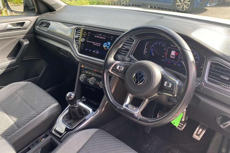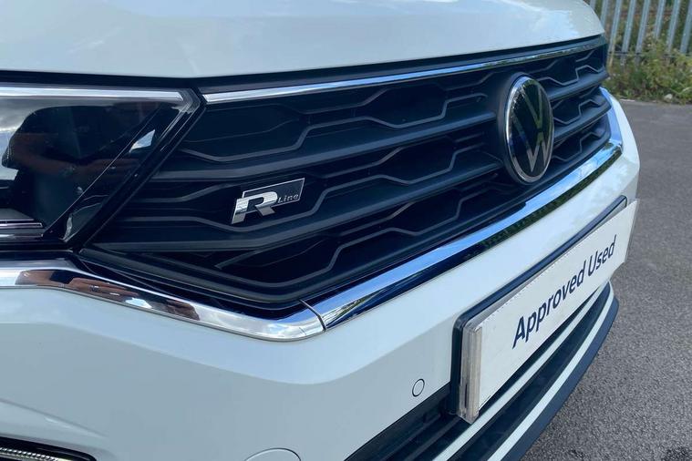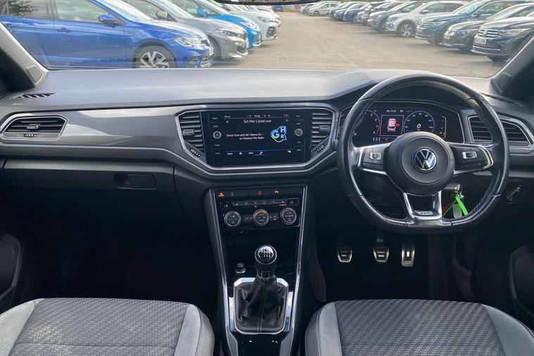 'Lights On' Reminder warning buzzer, Adaptive cruise control with front assist, radar sensor controlled distance monitoring, city emergency braking, Automatic start/stop system, Bluetooth telephone and audio connection for compatible devices, Car information display, Digital Cockpit Pro - Active info display, Discover navigation including 8" touch screen display, streaming and internet, Driver alert system with audible and visual fatigue detection system, Driver tips and journey analysis, Dusk sensor, Lane assist with warning text instrument cluster, Modified key software - reduce switch off time for key status change to Long no motion, Multifunction computer with visual gear change recommendation for fuel consumption, Service interval indicator, Think blue trainer driver tips and journey analysis, Voice activation, Wireless app connect for apple carPlay, Battery regeneration during braking, Centre arm rest including USB type C interface and USB charging socket, DAB Digital radio, Diversity antenna for FM reception, Front USB type C Interface 2X and USB charging socket, Music playback - MP3, WMA and AAC files, Premium USB cable in choice of either Apple or Android smartphone compatibility, SD card slot, Simultaneous pairing of 2 compatible mobile devices, SMS functionality - read, compose and send SMS messages using touch-screen display, Storage compartment with longitudinal and height adjustable in armrest and two rear air vents, Three route options - Fast, Short, Eco, Title and cover art display, Auto dimming interior rear view mirror, Automatic hazard lights activation under emergency braking, Black grained lower door protectors, Body colour door handles, Body colour rear roof spoiler, Chrome effect left and right trapezoid exhaust tailpipe fascia surround, Chrome trim on upper and lower radiator grille, Electrically foldable, adjustable and heated door mirrors with puddle lights and reverse activated kerb-view adjustment on passenger's door mirror, Front and rear electric windows, Front fog lights with static cornering function, Front windscreen wiper with intermittent wipe and 4 position delay, Fully galvanised body, Heated rear window, High level 3rd brake light, LED darkened rear light clusters, LED dipped and main beam headlights with automatic range adjustment including signature LED daytime running lights, LED rear number plate lights, Manual coming/automatic leaving home lighting function, Rain sensor, Rear tinted glass from B-pillar backwards approx 65% tinted, Rear wash/wipe with intermittent wipe setting, Volkswagen roundel, 2 Front and rear reading lights incorporating LED technology, 3 rear head restraints, 4 load lashing points in luggage compartment, Aluminium pedals, Ambient lighting in front footwell and light strips below trim in front doors, Black roof lining and sun visors, Branded points of interest, Carbon flag cloth upholstery, Climate control - 2 zone electronic air conditioning with automatic air recirculation and allergy filter, Drawer under drivers seat, Front + rear carpet mats, Front cupholders x 2, Front seat back storage pockets, Front sports seats with R-Line logo on seat backrest, Glovebox, Height adjustable front seats, Height/reach adjust steering wheel, Illuminated vanity mirrors, Instrument lighting, white adjustable panel illumination, Interior light delay, Isofix easy fit child seat preparation for 2 outer rear seats, Load through provision with single cup holder when folded down, Luggage compartment cover, removable, Luggage compartment lighting, R Line badge, Split folding rear seat backrests with centre armrest, Storage compartment in left and right luggage area, Storage compartment in rear doors, Storage compartments in driver and front passenger doors, Three spoke multi-function leather trimmed steering wheel and gearknob, Unique R Line door sill protectors, R line styling pack - T-Roc, Winter pack - T-Roc, 3 rear three point seatbelts, ABS, Curtain airbags, Driver and front passenger safety-optimised head restraints, Drivers and front passengers airbags with passengers deactivation switch, Drivers seatbelt reminder, Electronic parking brake with auto hold, Electronic stability control (ESC) includes ASR, EDL, EDTC and trailer stabilisation function, Front seat side impact airbags, Predictive pedestrian protection, Rigid safety cell with front and rear crumple zones, Three point height adjust front seatbelts + pretensioners, Tyre pressure loss indicator, Ventilated front and rear disc brakes, Volkswagen roadside assistance, Alarm with remote central locking and interior protection, Electronic engine immobiliser, Remote central locking with 2 remote folding keys, Shadow grey decorative inserts in dash and door panel, 19" Suzuka alloy wheels with low rolling resistance tyres and anti wheel bolts,