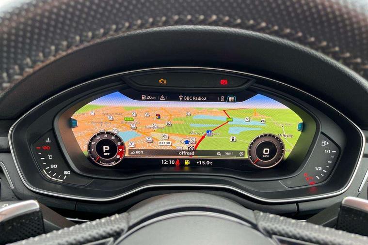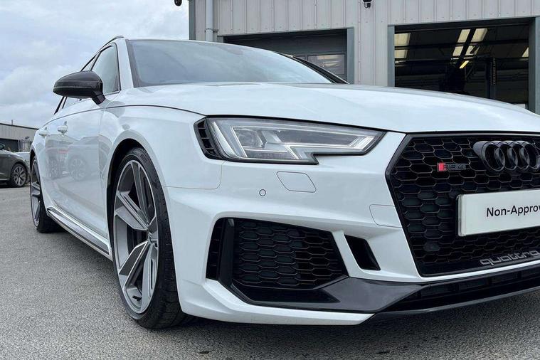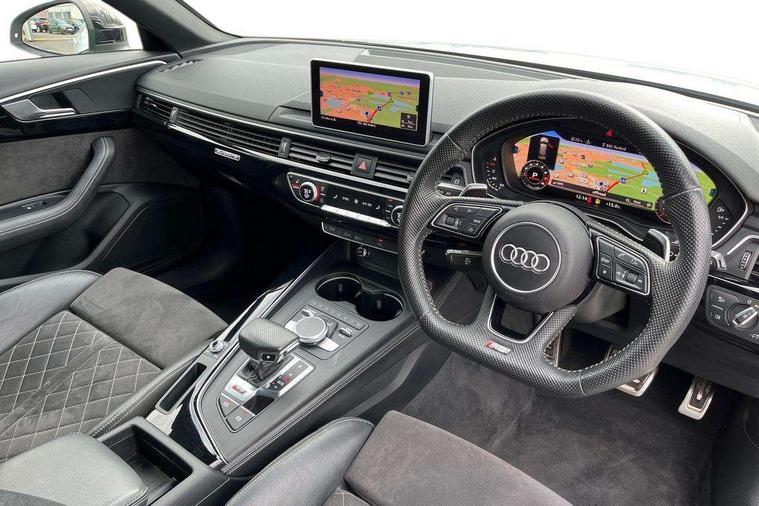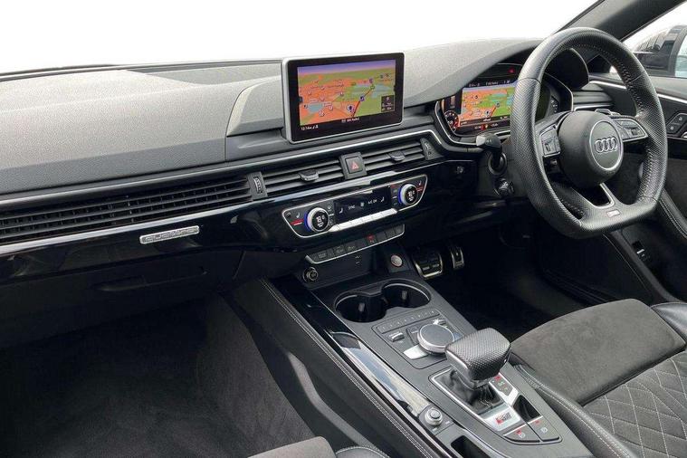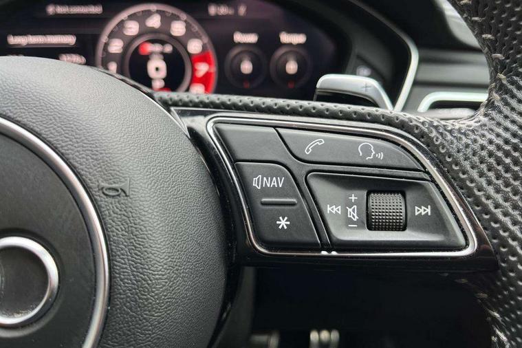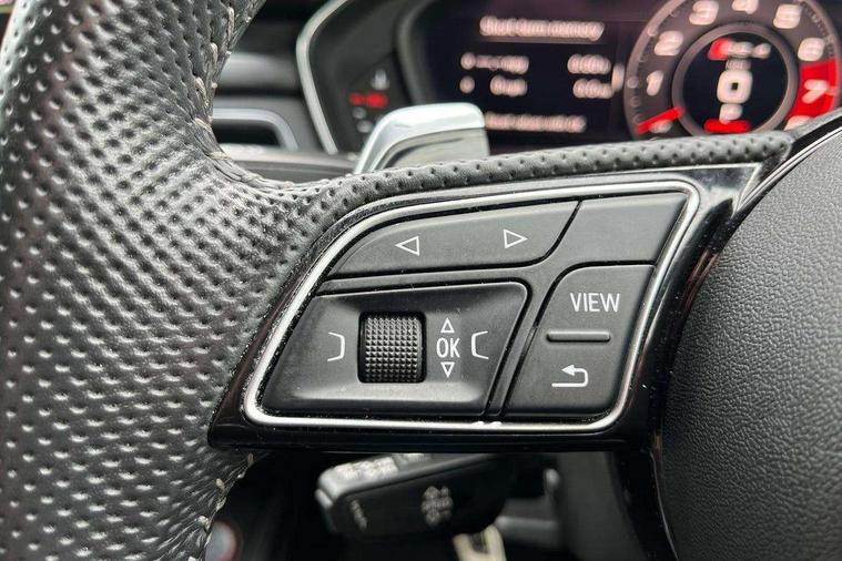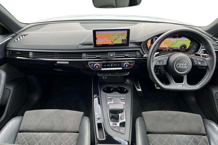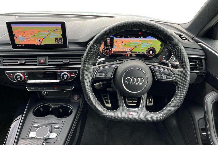 Audi connect safety and service (e-call), Audi parking system plus with front and rear sensors, Audi side assist, Audi smartphone interface, Audi Virtual Cockpit with RS specific design and 12.3" display, Automatic start-stop system with coasting functionality and efficiency programme, Bluetooth interface, Camera based traffic sign recognition, Electromechanical power steering, Email, calendar and text messages displayed via MMI, Lane departure warning, MMI Navigation plus with MMI touch includes 10.1" high resolution colour MMI display, 3D map, Rear view camera, RS Audi drive select, RS drive modes on steering wheel, Service interval indicator, Voice control system, Quattro sports differential, 2 x USB charging port with aux input socket, Audi sound system, DAB digital radio reception, Audi Beam uses LEDs to project the RS logo, Audi matrix LED headlights with LED rear lights + dynamic front and rear indicators, Audi rings and lettering glossy black, Auto dimming rear view mirror, Body colour door handles, Electric front windows, Electric rear windows, Electrically folding, adjustable and heated door mirrors with integrated LED side indicators and kerb view function for passenger side, Exterior mirror housing in high gloss black, High beam assistant, Larger singleframe grill, LED 3rd brake light, LED daytime running lights, Privacy glass with rear acoustic glazing, Rain and light sensors, Rear side wing doors, RS bumper with quattro lettering, RS5 badges on grille, the front wing panels and rear, RS5 dual branch chrome tailpipes with left and right oval pipes, Windscreen with acoustic glazing, 40:20:40 split folding 3 rear bench seat in 2nd row with rear centre armrest, Aluminium shift paddles, Black cloth headlining, Deluxe 3 zone electronic climate control, Electrically adjustable front seats, Front centre armrest, Front head restraints, Front knee pads in Leatherette, Front/rear floor mats, Heated front seats, Illuminated door sill trims with RS5 logo, ISOFIX child seat mounting and top tether, Pneumatic massage function, Rear head restraints, RS Super Sports seats with contrast honeycomb stitching, Single front passenger seat, Stainless steel pedals, Carbon black styling pack - RS5, LED Interior light pack - RS5, 3x3 point rear seatbelts, 6 airbags - Driver, front passenger, curtain and side airbags, Attention and drowsiness assist, Child locks on rear doors, Electromechanical parking brake, Electronic Stabilisation Control (ESC) including ABS, ASR and EDL, Front passenger airbag deactivation, Height adjustable front seatbelts, Hill hold assist, Multi collision brake assist, Pop-up bonnet for pedestrian protection, Pre sense city, RS Model enhanced braking system, Seatbelt monitoring, Tyre pressure warning, Warning triangle and first aid kit, Anti theft alarm system, Anti theft wheel bolts, Immobiliser, Keyless Go, Remote control key with RS emblem, Carbon twill inlays, 20" 5 Segment spoke Evo style design audi sport alloy wheels in glossy black, Tool kit, Tyre repair kit,