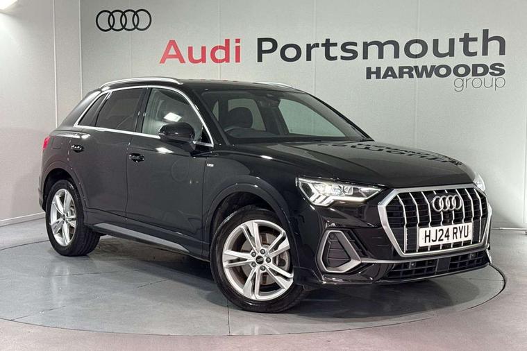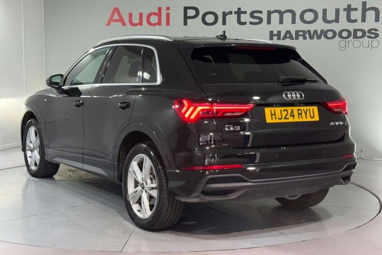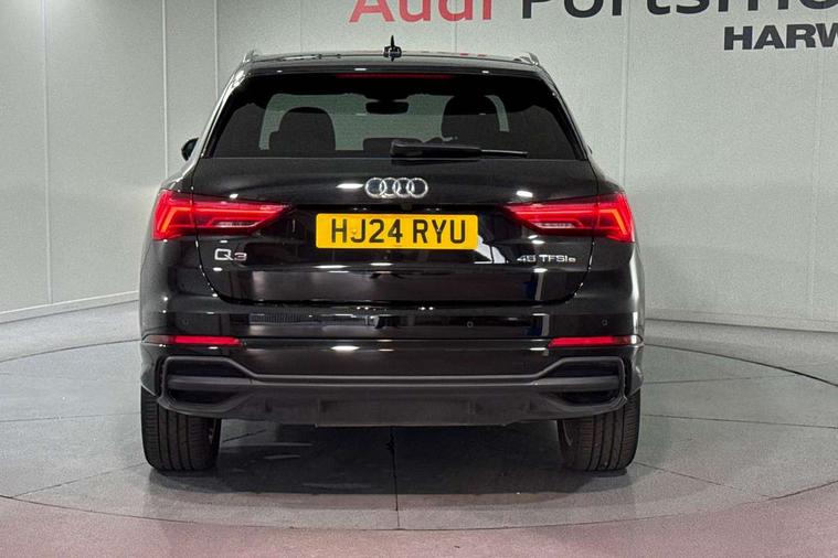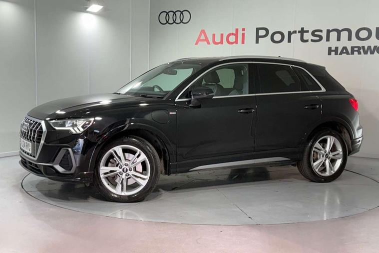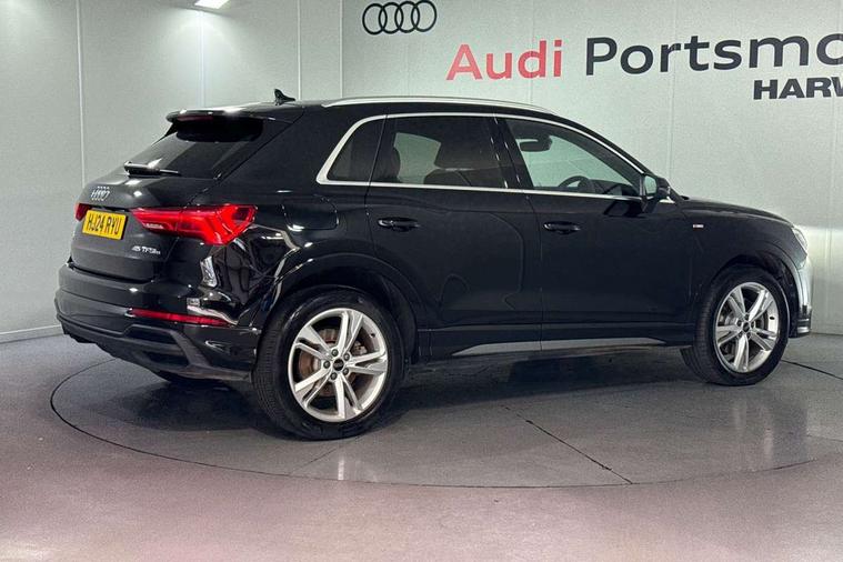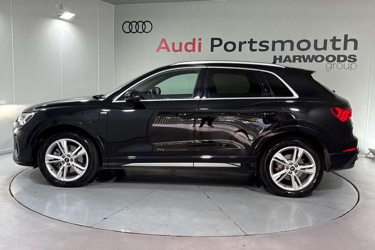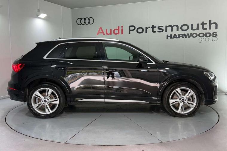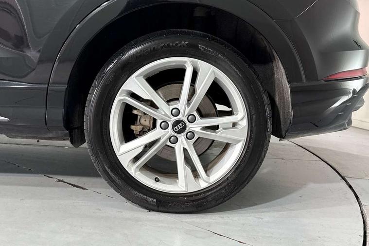 Amazon alexa Integration, Audi drive select, Audi lane departure warning, Audi Virtual Cockpit - 10.25" display, Bluetooth interface, Camera based traffic sign recognition, Legal emergency call, MMI Navigation Plus with high resolution 10.1 inch touchscreen colour display, Power operated tailgate, Progressive steering, Service interval indicator, Smartphone interface includes wireless Apple carplay/Android Auto, Start stop system with recuperation, Voice control system with natural language interaction, 3 pin 10 amp domestic charging cable, 3.6 kw On-board charger, Type 2 mode 3 32 amp charging cable, Type 2 socket for AC charging, 2 USB-C ports with charge and data functions, 6 passive loudspeakers, DAB digital radio module, Acoustic windscreen, Aluminium roof rails, Aluminium window trim, Anthracite black radiator grille, Auto dimming frameless rear view mirror, Body colour front spoiler blade, Body coloured bumpers, Electrically folding, adjustable and heated door mirrors with integrated LED side indicators and kerb view function for passenger side, Front and rear electric windows, Front fog lights, Front side air inlets in matt platinum grey, Grille vertical bars in aluminium silver/Matt, High gloss black finish B and C pillars, LED Dynamic rear indicators, LED headlights with LED daytime running lights, LED rear lights, LED third brake light, Privacy glass dark tinted rear and rear-side windows (from B-pillar backwards), Rain and light sensors, Rear diffuser grille in grained matt black, Rear diffuser strip in matt anthracite black, Rear side wing doors, Rear wiper, S line badges on front wings, S Line front and rear bumpers, Side skirt insert in matt Platinium grey, Variable front intermittent wipers, 12V socket in rear centre console, 3 seat bench in 2nd row, 3 spoke leather multifunction steering wheel features S badging and grips in perforated leather with contrast stitching, 40:20:40 folding with manual adjustment for 60:40 forwards/backwards position and backrest angle, Adjustable rear seat bench/backrest with centre armrest and cupholder, Black cloth headlining, Dual zone electronic climate control, Front and rear black floor mats with contrast stitching in rock grey, Front and rear headrests, Front and rear roof module including reading lights, Front centre armrest, Glove compartment lighting, Height and reach adjustable steering wheel, Illuminated door sill trims with S logo, ISOFIX child seat mounting for front passenger with airbag deactivation and outer rear seat including top tether attachment point for outer rear seats, Luggage compartment light, Manual front seats with height adjustment, Perforated leather gearknob, Single front passenger seat, Stainless steel luggage compartment sill finisher, Stainless steel pedals, Ambient lighting pack - Q3, Non smoking pack - Q3, 3x3 point rear seatbelts, 6 airbags - Driver, front passenger, curtain and side windows, Audi pre-sense front with pedestrain and cyclist recognition, Electrically operated child locks on rear doors, Electromechanical parking brake, Electronic stabilisation control including ABS, ASR and EDL, Front seatbelt reminder, Hill descent control, Hill hold assist, Pre sense basic, Seatbelt monitoring, Tyre pressure warning, Warning triangle and first aid kit, Anti theft alarm, Anti theft wheel bolts, Immobiliser, Remote central locking, Aluminium look interior elements, Dark matt brushed aluminium inlay, Detail dashboard around MMI touch colour display in glass look, black with surround in aluminium look, Leatherette door armrest, Tool kit, Tyre repair kit,