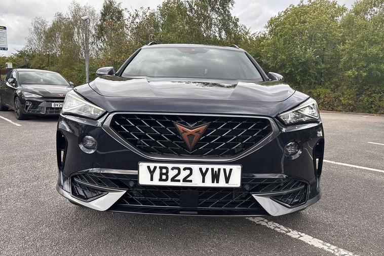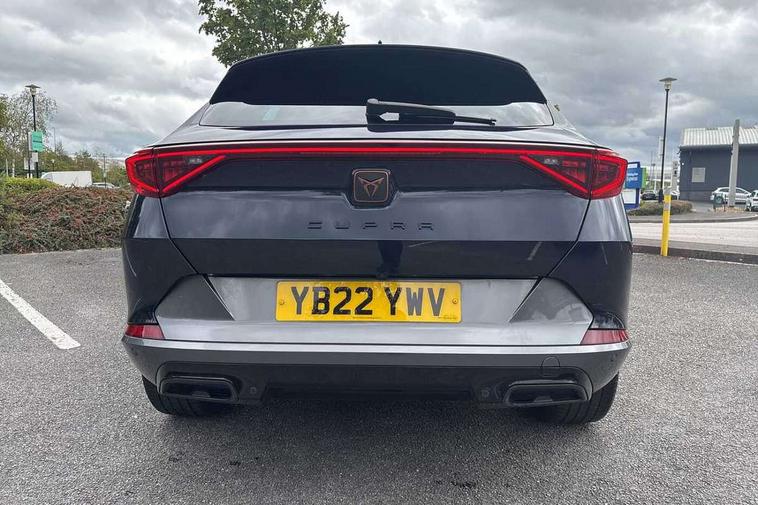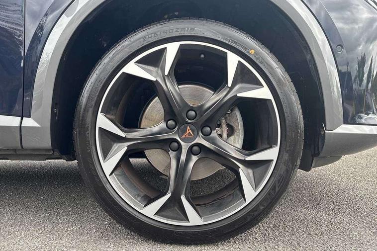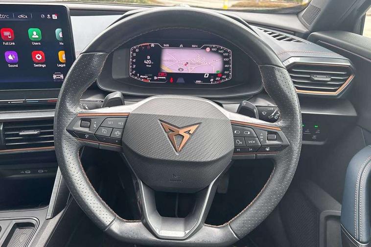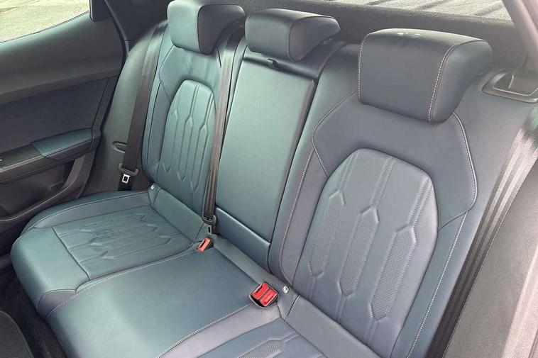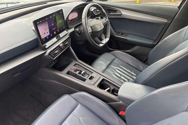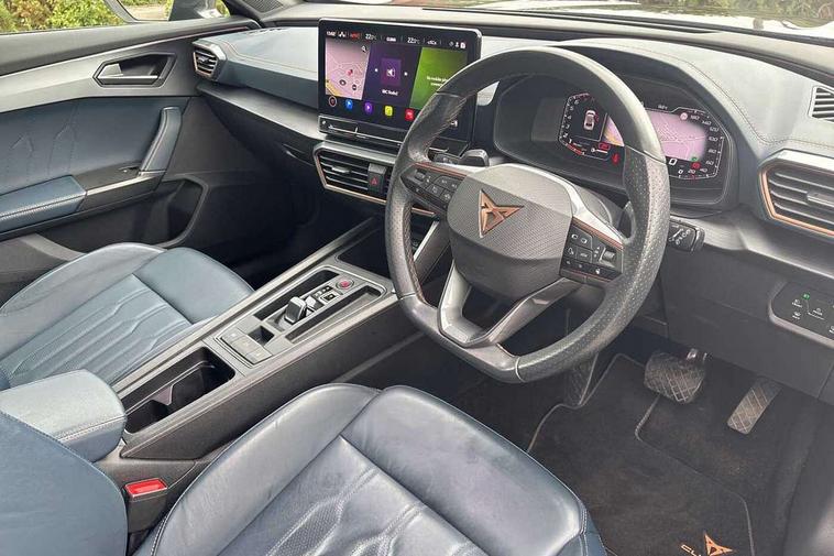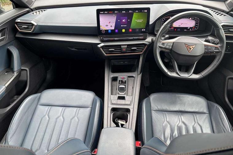Digital cockpit and configurable dashboard, Driver alert system, Driving profile selection, E-call, Forward collision warning with automatic braking, Lane assist, Navigation system with 12'' Touchscreen Display, Park assist (inc front/rear parking sensors), PAS, Predictive adaptive cruise control with speed limiter, Rear view camera, RPM, trip computer, outside temp gauge, instrument light brightness, low fuel warning light, lights on reminder, gearshift indicator, Service interval indicator, Start/stop system with regenerative braking, Voice control system, Wireless apple carplay, Wireless phone charger, Electronic locking differential and dynamic traction support, Standard suspension, 2 front and 2 rear USB type C sockets, Auxiliary input socket, DAB radio, Auto dimming rear view mirror, Body colour door handles, Body coloured bumpers, Dark grey wing mirror, Daytime running light with automatic headlight control and coming home feature, Dynamic headlight range control, Electric front/rear windows, Electrically adjustable heated and folding door mirrors with memory function, Front fog lamps with cornering function, Gloss black roof rails and window surrounds, LED Headlights, LED Taillights with dynamic indicator, Rain sensing wipers, Rear diffuser with black simulated exhaust pipes, Rear side wing doors, Rear wash/wipe, Third brake light, Tinted rear windows, Welcome lights, 12v power supply in centre console, 12V socket, 12v socket in loadspace, 2 front and 2 rear reading lights, 230V socket, 3 seat bench in 2nd row, 60/40 split rear bench seat with armrest and mechanical seat release, Dust/pollen filter, Front and rear head restraints, Front centre armrest, Height/reach adjust steering wheel, Illuminated interior front door sills, Illuminated sunvisor with mirror, Isofix, Leather multi function heated steering wheel with gear shift paddles, Luggage tie-down hooks, Single front passenger seat, Three zone climate control with control panel in rear, Variable luggage/load compartment floor, Wraparound lighting, Genuine Nappa leather Pack - Cupra, 3 point seatbelts on all rear seats, ABS, Brake control system - ESC and brake booster, Child proof door locks, Driver and front passenger airbags with front passenger airbag de-activation, Electronic parking brake, Front and rear disc brakes, Front side curtain airbags, Hill hold control, Seat belt reminder for front and rear seats, Tyre pressure monitoring system, Anti theft alarm system, Keyless entry and start system (KESSY), Locking wheel bolts, Copper and aluminium interior detailing, 19" 'Exclusive' machined sport matte black and silver alloy wheels,