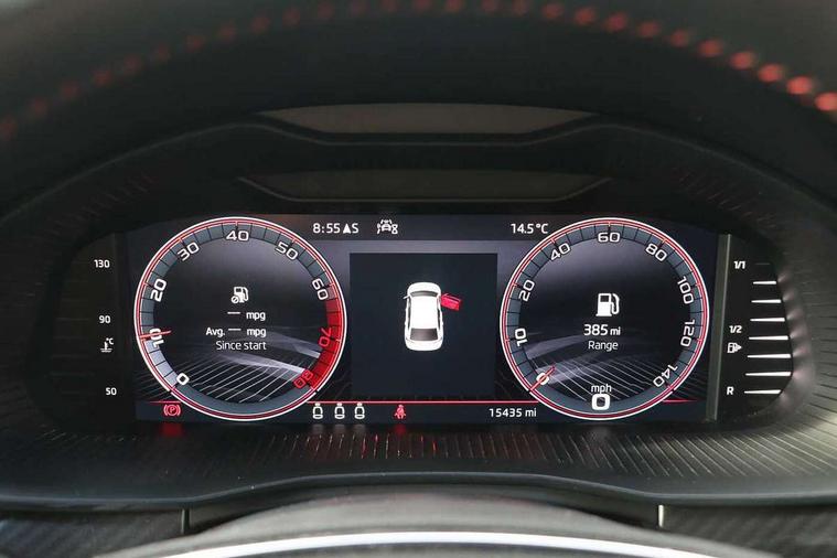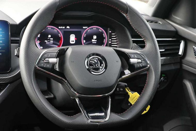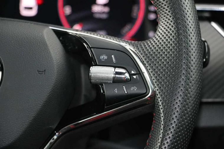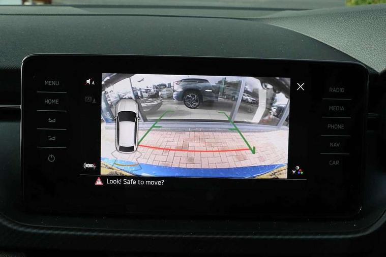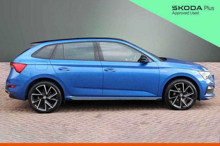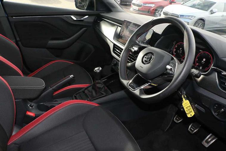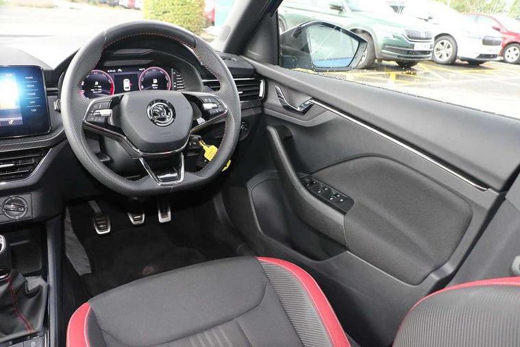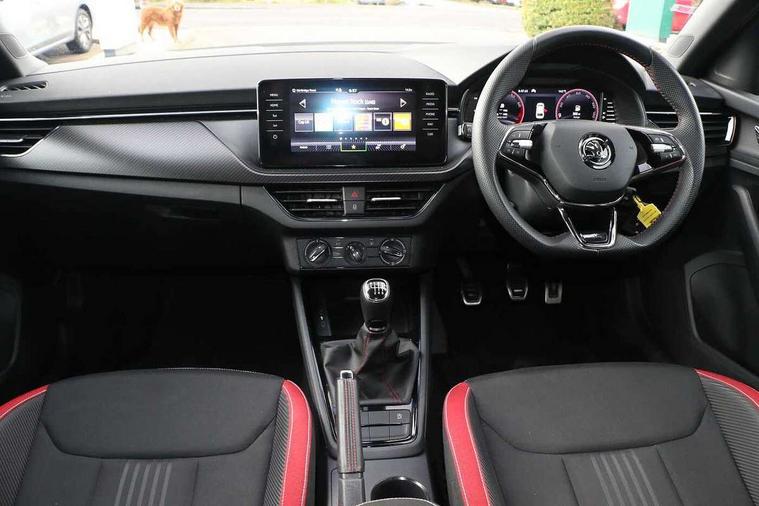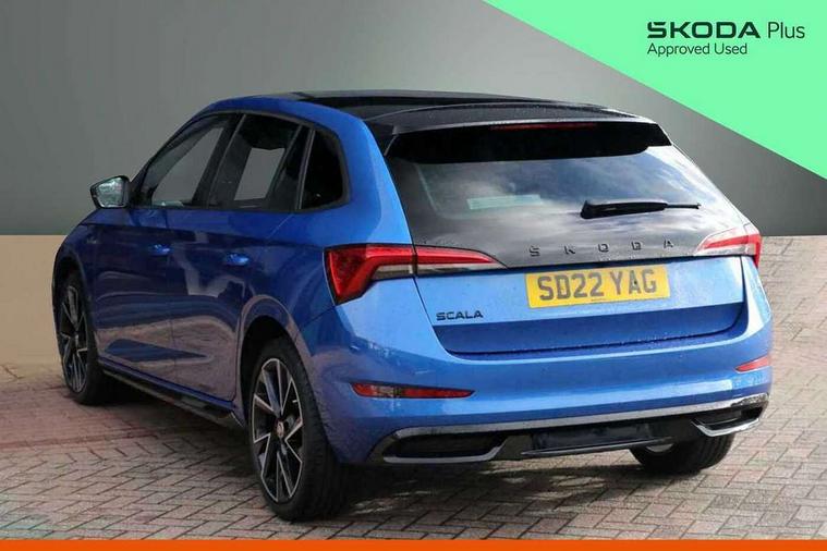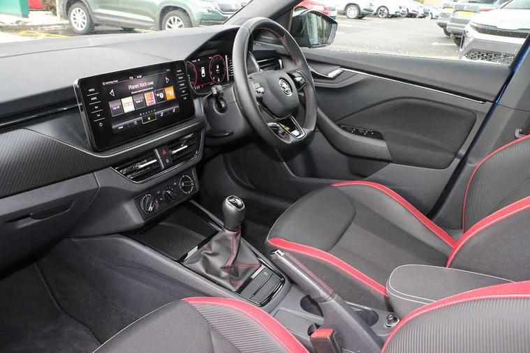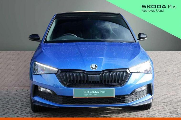 Amundsen satellite navigation with 9.2" glass colour touchscreen with virtual cockpit, web radio, Bluetooth system, eCall emergency system, Monte carlo instrument cluster, PAS, Rain and light assist with auto dimming rear view mirror, Rear view camera, Speed limiter, Traffic sign recognition, Virtual cockpit, Voice control system, 2 USB - C ports, 8 loudspeakers, DAB Digital radio, 3rd brake light, Adaptive front light system, Automatic headlamp activation with Coming home and Leaving home feature, Black door mirrors, Black radiator grille, Black rear diffuser, Black roof spoiler, Body colour door handles, Dimming rear view mirror with black frame, Electric folding door mirrors, Electrically adjustable and heated door mirrors, Front and rear electric windows, Front fog lights, LED daytime running lights, LED rear tail lights with dynamic indicators, Privacy glass, Rear side wing doors, Rear wiper, Skoda across tailgate in black, Tinted windows, 12V Accessory socket in centre console, 3 seat bench in 2nd row, Aluminium pedals, Chrome inner door handles, Cloth upholstery, Front head restraints, Glasses storage in roof liner, Height adjustable passenger seat, ISOFIX for rear passenger seat, Leather gearknob and handbrake lever, Manual lumbar support for front seats, Reading lights for driver and front passenger, Single front passenger seat, Sun visor with make up mirror for front passenger, Textile floor mats, Third rear headrest, Umbrella, Exterior design pack - Scala, 3x3 point rear seatbelts, Curtain airbags, Emergency call and proactive services, Front head and side airbags, Hill hold control, Manual rear child locks, One tone horn, Passenger airbag switch off function, Seat belt reminder for all seats, Alarm, Anti-theft wheel bolts, Remote central locking with 2 remote folding keys, SAFE function for remote central locking, 18" Vega alloy wheels in black, Temporary space saver wheel,