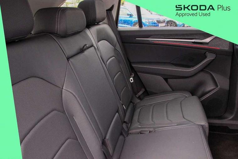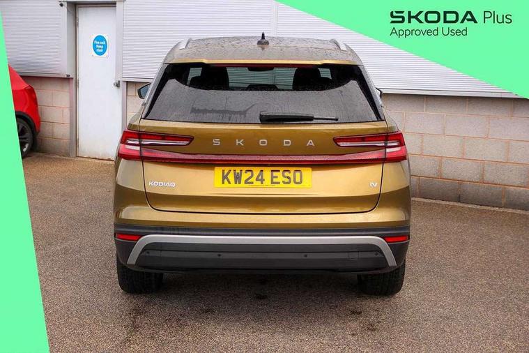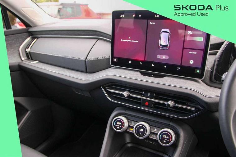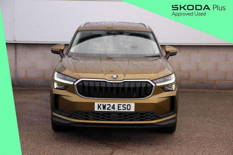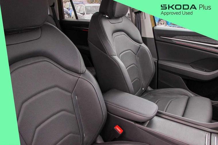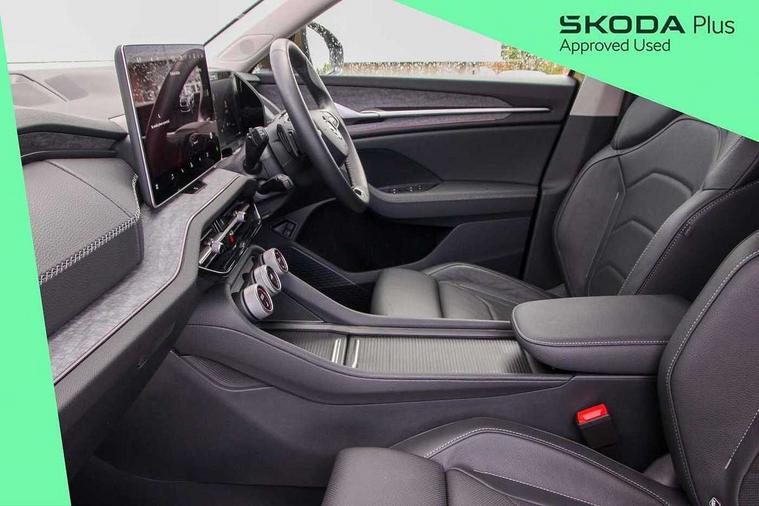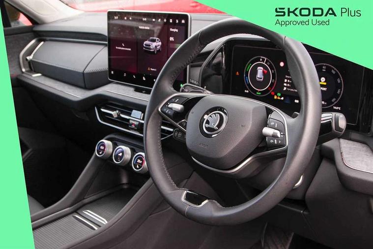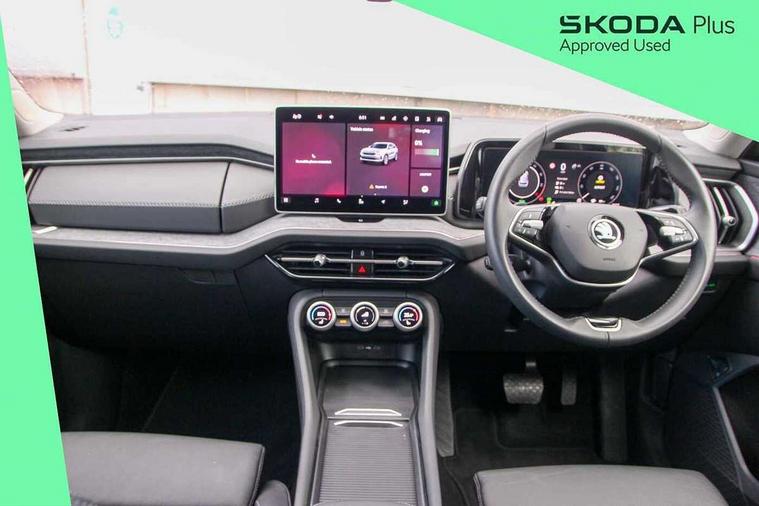 13" satellite navigation touchscreen display, Blind spot detection with door exit warning, Bluetooth system, Drive mode selector, Driver alert with fatigue sensor, Driver drowsiness alert system, Dry display cleaner, e call+, Front cross traffic assist, Lane assist, PAS, Rear traffic assist, Tailgate unlocking from outside, Traffic sign recognition, USB C Port x 2 in front centre console, Virtual Cockpit - 10.25" digital display, Voice control system, Wireless charging for two smartphones (15W) with cooling function, Wireless SmartLink for Apple CarPlay and Android Auto, 32A charging cable, Stop/start function, 2x USB-C in the rear, DAB Digital radio, Aero front windscreen wipers with intermittent function, Auto dimming rear view mirror, Black wheel arch surrounds, Body colour bumpers, Body colour door mirrors and handles, Cornering light and poor weather light, Electric folding /adjustable/separted heated/folding door mirrors, auto dimming with boarding sports and memory function, Electric front and rear windows, Heat insulating glass in windshield, Heated rear window, Ice scraper in fuel tank cap, Invisible tailpipe, LED daytime running lights, LED rear fog light, LED third brake light in rear spoiler, Light assistant with automatic headlight control and coming home feature, Logo projection in door mirrors, Privacy glass, Rear side wing doors, Rear spoiler, Rear window wiper, Safety reflectors on front and rear doors, Window control switches with black trim, Windscreen wipers with rain sensor, Without engine designation, 1.5l bottle holder points in all door, 12V socket in boot, 1x centre rear reading light, 3 configurable smart dials with 32mm coloured display, 3 seat bench in 2nd row, 4 foldable roof handles with rear coat hooks, Automatic gear selector on steering wheel, Chrome interior door handles, Driver/front passenger reading lights, Fabric headlining, Fixed bench 40:60:40 split folding backrests, Front and rear floor mats, Front centre armrest with jumbo box storage compartment, cup holder and 12V socket, Front courtesy lights, Height adjustable front headrests, Interior ambient lighting, Isofix child seat fittings in outer rear seats and front passenger with top tether, iV badging on boot, Manually adjustable steering column, Pollen filter, Rear centre armrest with cupholders, Rear seat boot backrest release, Retractable luggage compartment cover, Single front passenger seat, Sliding trunk cover, Small Bags on the inner sides of the front backrests, Storage pocket including mobile phone pockets on the backs of the front seats, Sunvisors with illuminated vanity mirrors, Three rear height adjustable headrests, Ticket holder on A Pillar, Tri zone climate control, Umbrella in door panel x1 made from sustainable materials, Upper and lower glovebox with card holder and coin compartment, USB C port by rear view mirror for charging only (15W), Exterior styling package - Kodiaq, Auto door release and activation of warning lights in the event of an accident, Driver and front passenger airbag with knee airbag and front passenger airbag deactivation, Electric child locks, Electronic parking brake, ESC (incl. ABS+EMD+MSR+ASR+EDL+HBA+DSR+RBS+ESBS+MCB+TSA+XDS), Front assist with braking reaction to vehicles, pedestrians and cyclists, Front disc brakes, Fuel cut off safety device, Height adjustable front 3 point seatbelts + pretensioners, Hill hold control, Junction assist with automatic emergency braking, Rear disc brakes, Safety vest holder in door, Seat belt reminder for all seats, Three point rear seat belts, Two tone horn, Tyre pressure monitor, Anti-theft wheel bolts, Immobiliser, Remote central locking with 2 keys, Black/grey fabric with green cross stitching on dashboard, Swan feathers grey dashboard and door decorative inserts, Breakdown kit,