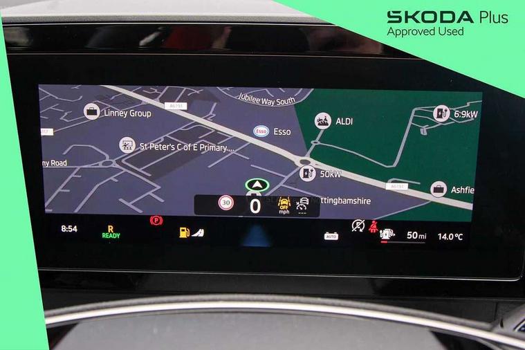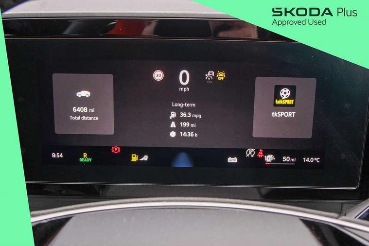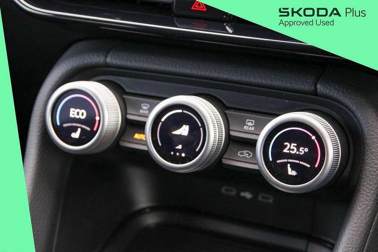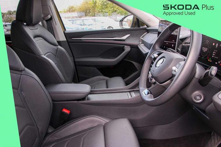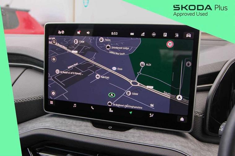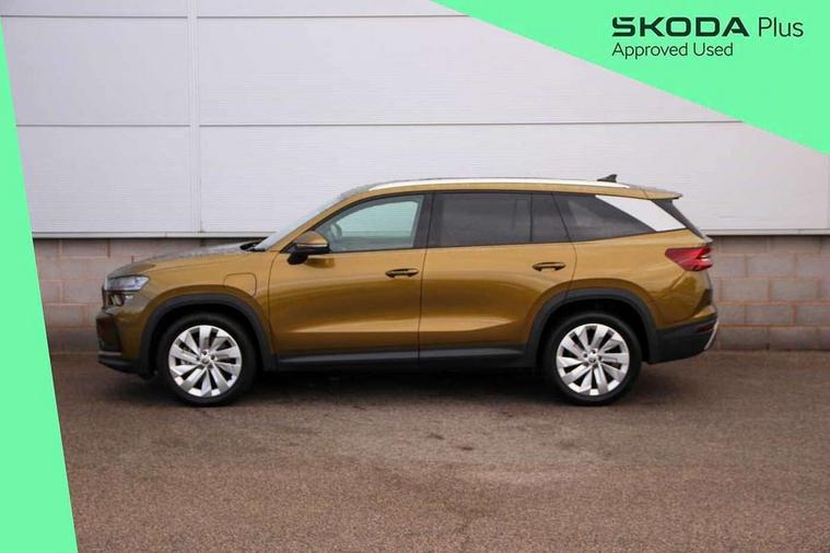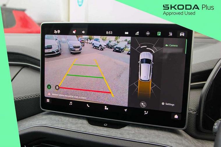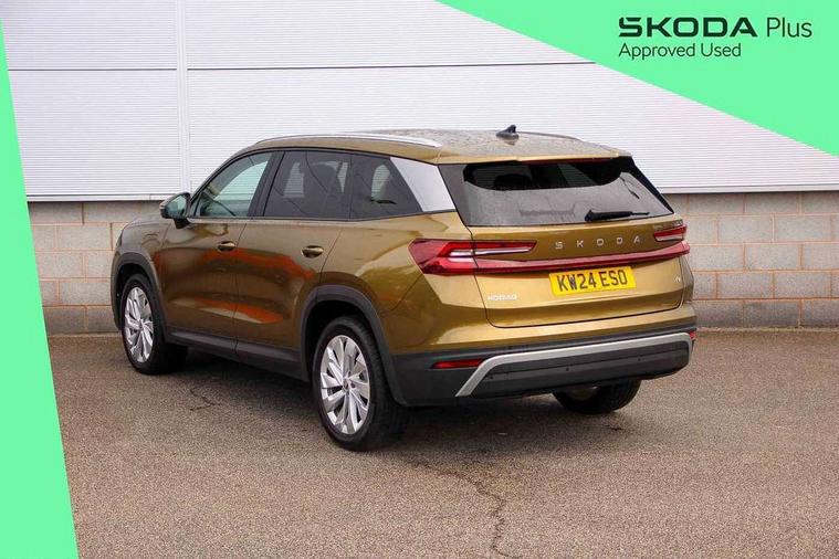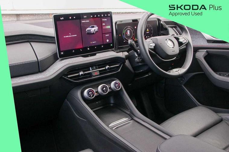 13" satellite navigation touchscreen display, Blind spot detection with door exit warning, Bluetooth system, Drive mode selector, Driver alert with fatigue sensor, Driver drowsiness alert system, Dry display cleaner, e call+, Front cross traffic assist, Lane assist, PAS, Rear traffic assist, Tailgate unlocking from outside, Traffic sign recognition, USB C Port x 2 in front centre console, Virtual Cockpit - 10.25" digital display, Voice control system, Wireless charging for two smartphones (15W) with cooling function, Wireless SmartLink for Apple CarPlay and Android Auto, 32A charging cable, Stop/start function, 2x USB-C in the rear, DAB Digital radio, Aero front windscreen wipers with intermittent function, Auto dimming rear view mirror, Black wheel arch surrounds, Body colour bumpers, Body colour door mirrors and handles, Cornering light and poor weather light, Electric folding /adjustable/separted heated/folding door mirrors, auto dimming with boarding sports and memory function, Electric front and rear windows, Heat insulating glass in windshield, Heated rear window, Ice scraper in fuel tank cap, Invisible tailpipe, LED daytime running lights, LED rear fog light, LED third brake light in rear spoiler, Light assistant with automatic headlight control and coming home feature, Logo projection in door mirrors, Privacy glass, Rear side wing doors, Rear spoiler, Rear window wiper, Safety reflectors on front and rear doors, Window control switches with black trim, Windscreen wipers with rain sensor, Without engine designation, 1.5l bottle holder points in all door, 12V socket in boot, 1x centre rear reading light, 3 configurable smart dials with 32mm coloured display, 3 seat bench in 2nd row, 4 foldable roof handles with rear coat hooks, Automatic gear selector on steering wheel, Chrome interior door handles, Driver/front passenger reading lights, Fabric headlining, Fixed bench 40:60:40 split folding backrests, Front and rear floor mats, Front centre armrest with jumbo box storage compartment, cup holder and 12V socket, Front courtesy lights, Height adjustable front headrests, Interior ambient lighting, Isofix child seat fittings in outer rear seats and front passenger with top tether, iV badging on boot, Manually adjustable steering column, Pollen filter, Rear centre armrest with cupholders, Rear seat boot backrest release, Retractable luggage compartment cover, Single front passenger seat, Sliding trunk cover, Small Bags on the inner sides of the front backrests, Storage pocket including mobile phone pockets on the backs of the front seats, Sunvisors with illuminated vanity mirrors, Three rear height adjustable headrests, Ticket holder on A Pillar, Tri zone climate control, Umbrella in door panel x1 made from sustainable materials, Upper and lower glovebox with card holder and coin compartment, USB C port by rear view mirror for charging only (15W), Exterior styling package - Kodiaq, Auto door release and activation of warning lights in the event of an accident, Driver and front passenger airbag with knee airbag and front passenger airbag deactivation, Electric child locks, Electronic parking brake, ESC (incl. ABS+EMD+MSR+ASR+EDL+HBA+DSR+RBS+ESBS+MCB+TSA+XDS), Front assist with braking reaction to vehicles, pedestrians and cyclists, Front disc brakes, Fuel cut off safety device, Height adjustable front 3 point seatbelts + pretensioners, Hill hold control, Junction assist with automatic emergency braking, Rear disc brakes, Safety vest holder in door, Seat belt reminder for all seats, Three point rear seat belts, Two tone horn, Tyre pressure monitor, Anti-theft wheel bolts, Immobiliser, Remote central locking with 2 keys, Black/grey fabric with green cross stitching on dashboard, Swan feathers grey dashboard and door decorative inserts, Breakdown kit,