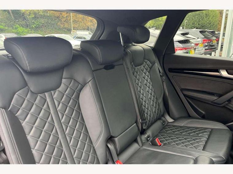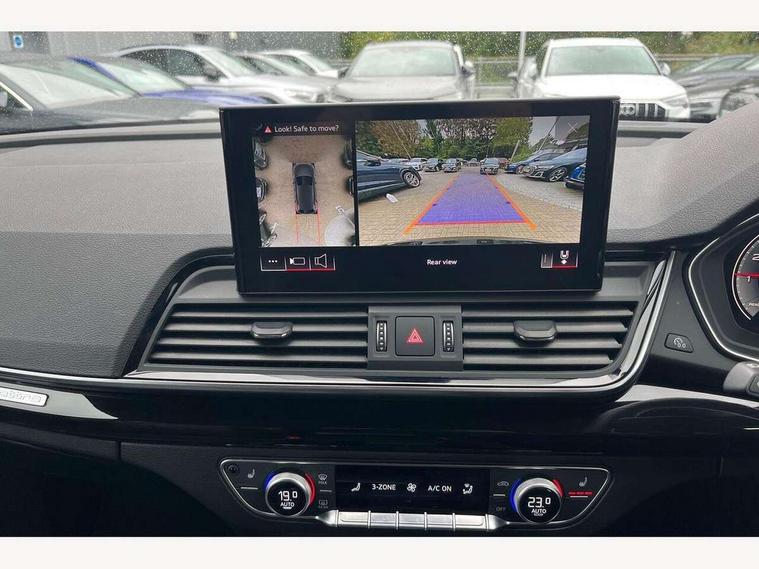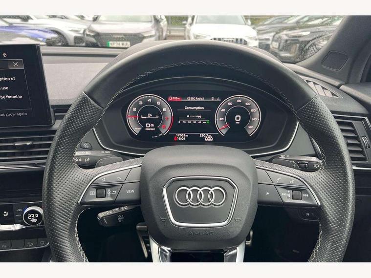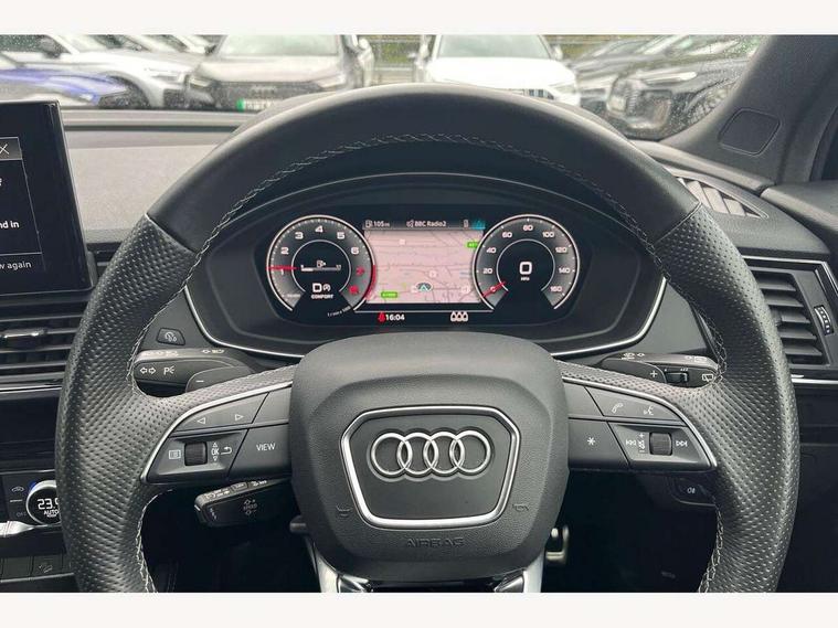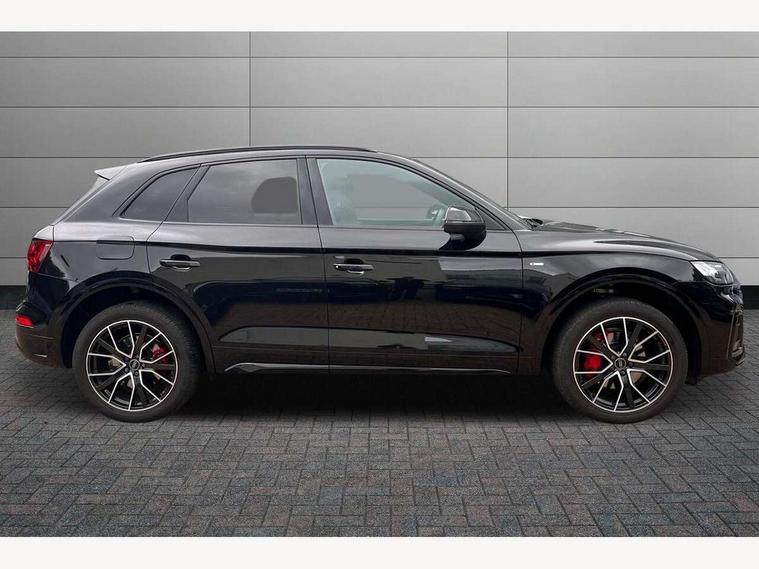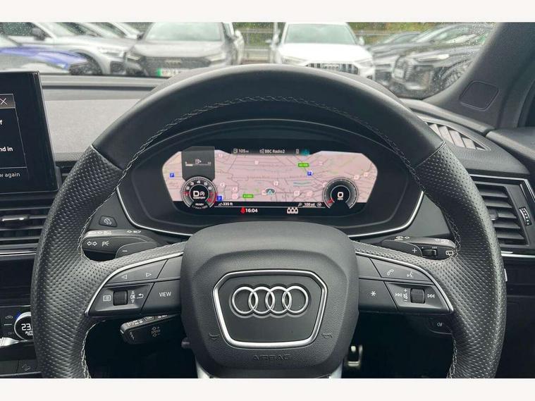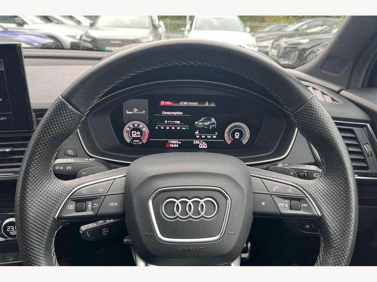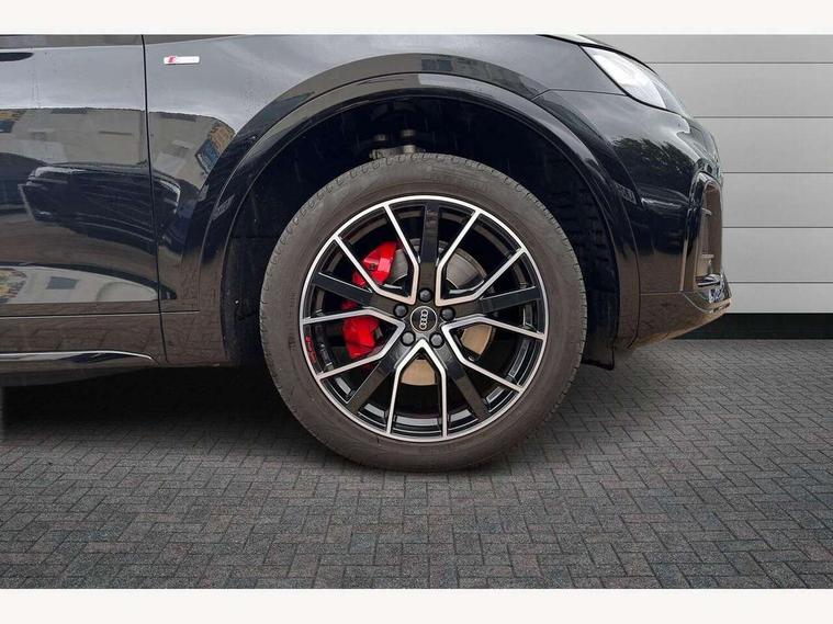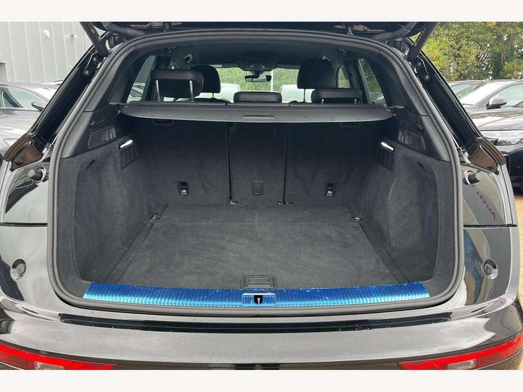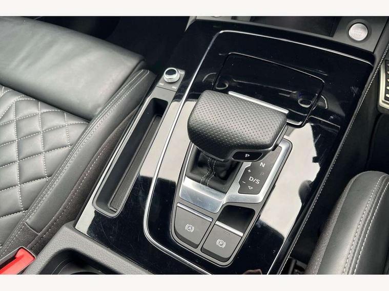Audi connect safety and service (e-call), Audi connect with Amazon Alexa Integration, Audi drive select, Audi virtual cockpit plus with 12.3" screen and three different layout designs, Audi wireless smartphone interface, Automatic start-stop system with coasting functionality and efficiency programme, Bluetooth interface, Electro - mechanical power assisted steering, MMI navigation plus with 10.1" touch screen, Power tailgate, Reversing camera, Service interval indicator, Voice control system with Audi hotword activation "Hey Audi", Quattro on demand, S line sports suspension, 2 x USB charging port with aux input socket, DAB Digital radio, Acoustic windscreen, Audi beam with Audi rings logo, Audi matrix LED headlights with dynamic front and rear indicators, Audi rings at front and rear in black, Audi rings decal on rear doors, Auto dimming door mirrors, Auto dimming rear view mirror, Automatic headlights and windscreen wipers, Black door mirrors, Black roof rails, Body colour bumpers, Body colour underbody protection, Chrome plated exhaust trims, Daytime running lights, Door sills in Selenite silver, Electric adjustable/heated/folding door mirrors, Front air inlet surrounds in titanium black, Front and rear electric windows, Headlight washers, High gloss black B pillar trims and triangular rear door trim, High level LED brake light, Rear chrome trim strip below lights, Rear privacy glass and rear side windows, Rear side wing doors, Rear spoiler, Rear wiper, Roof bars, Without model and engine badging at rear, 3 rear headrests, 4 way electric lumbar support for driver and front passenger, 40:20:40 split folding 3 rear bench seat in 2nd row with rear centre armrest, Black cloth headlining, Comfort front centre armrest, Contrast stitching on seats, steering wheel and gear lever gaiter, Deluxe 3 zone electronic climate control, Electrically adjustable front seats, Fine Nappa leather upholstery with diamond pattern contrast stitching + front sport seats with S embossed logo, Front/rear floor mats, Gear lever in black leather, Heated front seats, Height adjustable front head restraints, Height/reach adjustable steering column, Illuminated door sill trims with S logo, ISOFIX child seat mounting and top tether, Luggage compartment cover, Rear seat bench plus, Removable luggage compartment floor, Single front passenger seat, Stainless steel pedals, Sunvisors with vanity mirrors, Black styling package - Q5 Edition 1, Extended interior upholstery pack - Q5, Extended LED Interior multi coloured Lighting Pack - Q5, 3 point seatbelts on all seats, 6 airbags - Driver, front passenger, curtain and side airbags, Electrically operated child locks on rear doors, Electromechanical parking brake, Electronic stabilisation control including ABS, ASR and EDL, Front and rear brake calipers painted in red, Front passenger airbag deactivation, Hill descent control, Hill hold assist, Multi collision brake assist, Pop-up bonnet for pedestrian protection, Pre sense city, Seat belt force limiter, Seatbelt monitoring, Tyre pressure warning, Warning triangle and first aid kit, Anti theft alarm, Anti-theft wheel bolts, Keyless Go access/ignition system, Remote central locking, Piano black finish inlay,