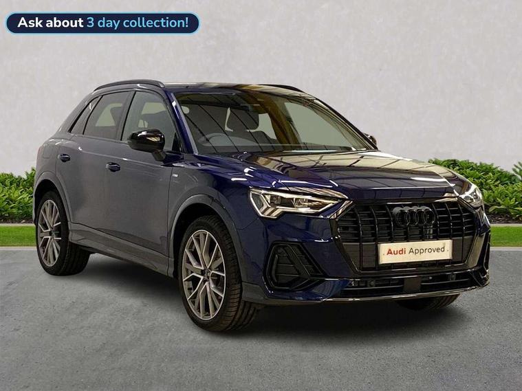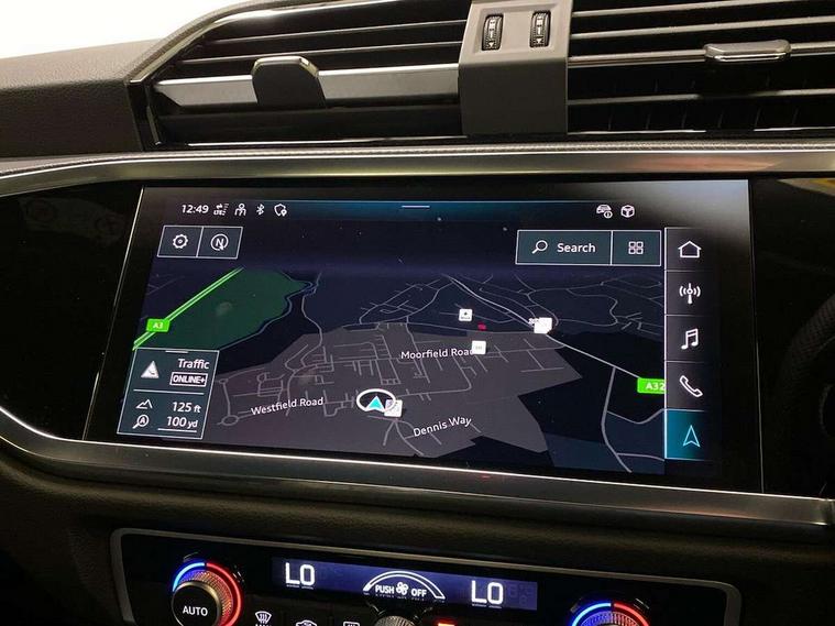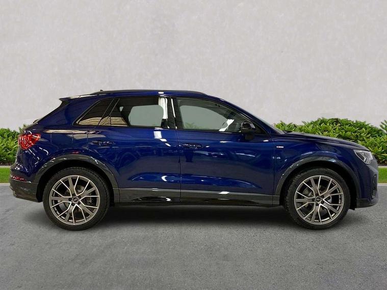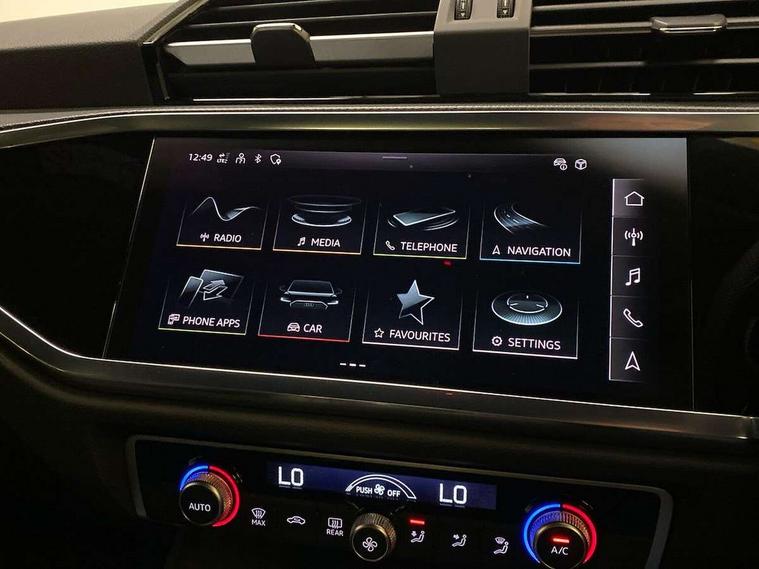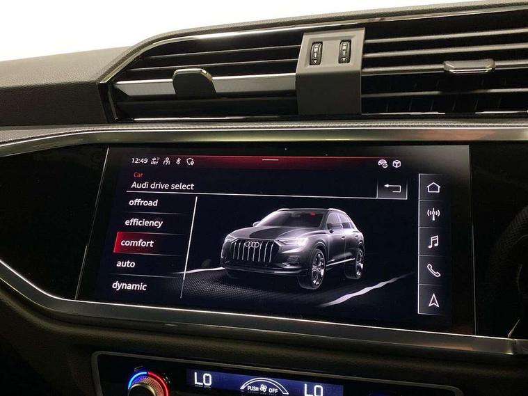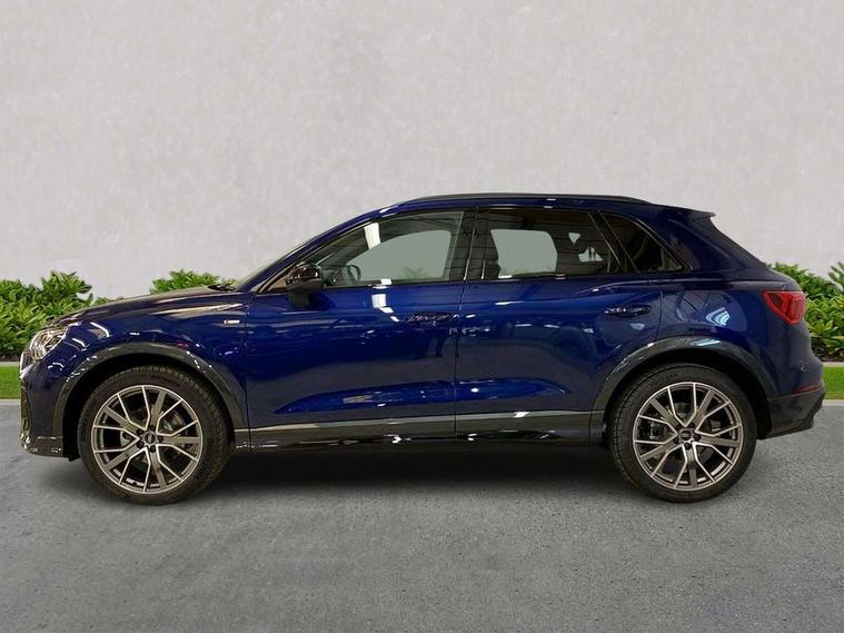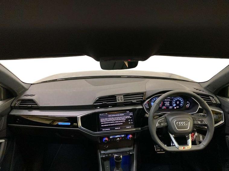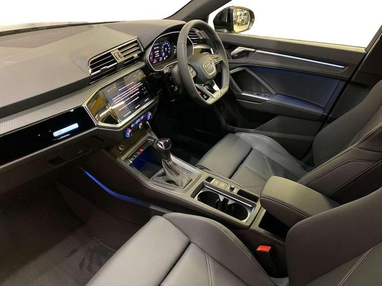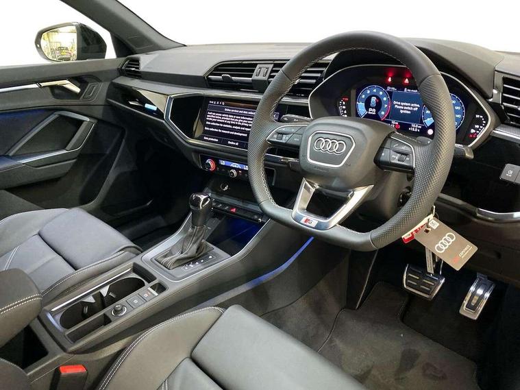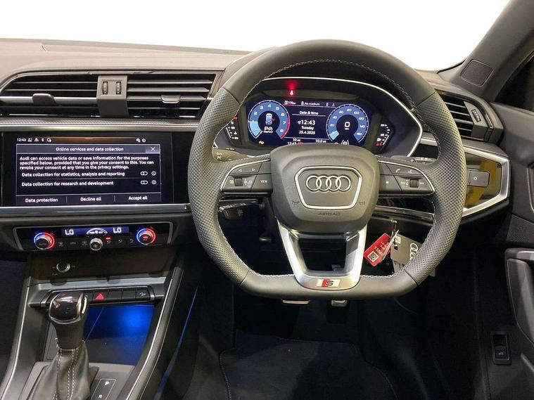 Amazon alexa Integration, Audi connect safety and service, Audi drive select, Audi lane departure warning, Audi Virtual Cockpit - 10.25" display, Bluetooth interface, Camera based traffic sign recognition, Distraction and Fatigue warning, Legal emergency call, MMI Navigation Plus with high resolution 10.1 inch touchscreen colour display, Power operated tailgate, Progressive steering, Service interval indicator, Smartphone interface includes wireless Apple carplay/Android Auto, Start stop system with recuperation, Voice control system with natural language interaction, Sports suspension, 2 USB-C ports with charge and data functions, 6 passive loudspeakers, DAB digital radio module, Acoustic windscreen, Audi Beam uses LEDs to project the Audi logo onto the ground as you exit your Q3, Auto dimming door mirrors, Auto dimming frameless rear view mirror, Black roof rails, Electrically folding, adjustable and heated door mirrors with integrated LED side indicators and kerb view function for passenger side, Front and rear electric windows, Front fog lights, Grille vertical bars in aluminium silver/Matt, High gloss black finish B and C pillars, LED Dynamic rear indicators, LED headlights with LED daytime running lights, LED rear lights, LED third brake light, Privacy glass dark tinted rear and rear-side windows (from B-pillar backwards), Rain and light sensors, Rear diffuser grille in grained matt black, Rear diffuser strip in matt anthracite black, Rear side wing doors, Rear wiper, S line bumpers in contrasting Manhattan grey, Variable front intermittent wipers, 12V socket in rear centre console, 3 seat bench in 2nd row, 40:20:40 folding with manual adjustment for 60:40 forwards/backwards position and backrest angle, Adjustable rear seat bench/backrest with centre armrest and cupholder, Black cloth headlining, Dual zone electronic climate control, Electric lumbar support, Front and rear black floor mats with contrast stitching in rock grey, Front and rear headrests, Front centre armrest, Height and reach adjustable steering wheel, Illuminated door sill trims with S logo, ISOFIX child seat mounting for front passenger with airbag deactivation and outer rear seat including top tether attachment point for outer rear seats, Manual front seats with height adjustment, Perforated leather gearknob, Single front passenger seat, Stainless steel luggage compartment sill finisher, Stainless steel pedals, Twin leather upholstery with front sport seats + S embossing, Black styling pack - Q3, Non smoking pack - Q3, 3x3 point rear seatbelts, 6 airbags - Driver, front passenger, curtain and side windows, Audi pre-sense front with pedestrain and cyclist recognition, Electrically operated child locks on rear doors, Electromechanical parking brake, Electronic stabilisation control including ABS, ASR and EDL, Front seatbelt reminder, Hill descent control, Hill hold assist, Pre sense basic, Seatbelt monitoring, Tyre pressure warning, Warning triangle and first aid kit, Anti theft wheel bolts, Immobiliser, Remote central locking, Thatcham approved category 1 anti theft alarm, Aluminium look interior elements, Detail dashboard around MMI touch colour display in glass look, black with surround in aluminium look, Leatherette door armrest, Piano black inlay,