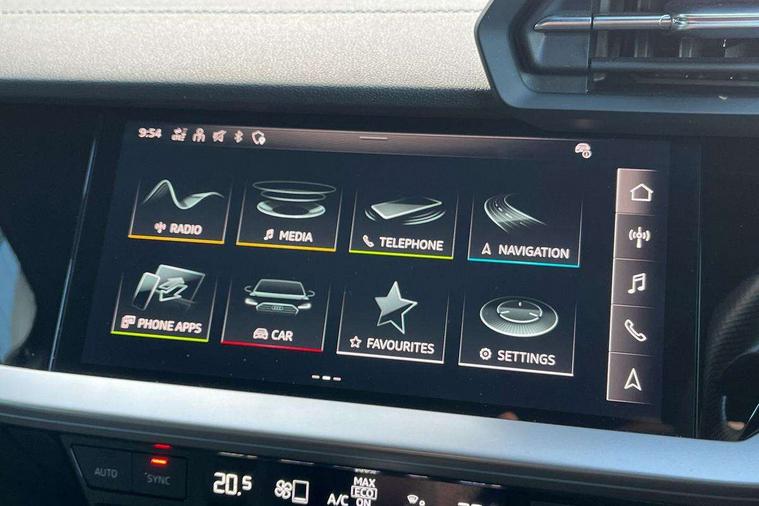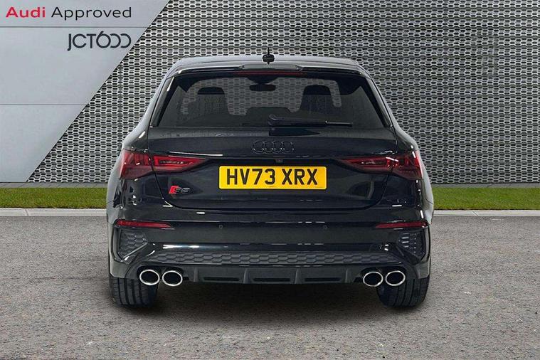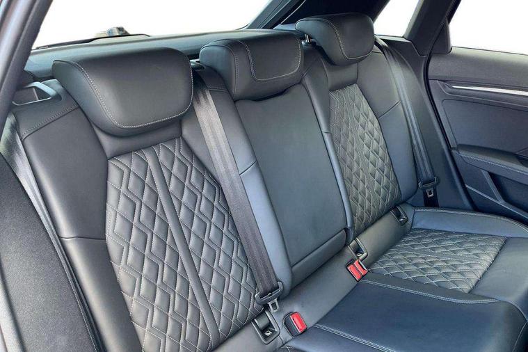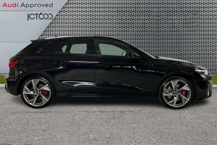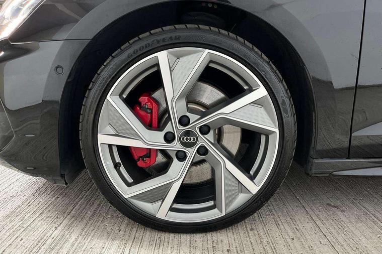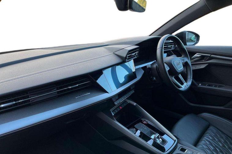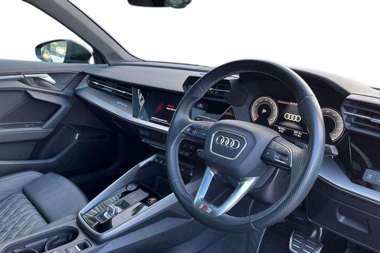 Adaptive cruise assist, Audi drive select (Auto, Comfort, Dynamic, Efficiency and Individual), Audi smartphone interface, Audi virtual cockpit plus - 12.3" full HD resolution dynamic digital instrument cluster, Automatic start/stop system with recuperation, Bluetooth interface, Collision avoidance assistant, e-Call (emergency call), Head up Display, Lane change assistant with exit warning system and rear cross traffic alert, Lane departure warning system, MMI Navigation Plus with high resolution 10.1" colour touch screen display, Power operated tailgate - Luggage compartment lid opens/closes electrically, Progressive steering, Service indicator, Trip computer, Voice control system with natural language interaction, Quattro permanent all wheel drive, S suspension with damper control, 2xUSB-C connection with data and charging functions, DAB Digital radio, 3rd brake light, Acoustic glass windscreen, Audi Beam uses LEDs to project Vorsprung onto the ground as you exit your S3, Auto dimming frameless rear view mirror, Carbon door mirror housings, Dual branch oval twin tailpipes in chrome plated finish, Electrically adj heated/folding + automatically dimming exterior mirrors with memory + automatic kerb side function for passenger side exterior mirror, Front electric windows, Headlight washers, Heat insulating glass windscreen, Illuminated door sills with aluminium inserts at the front with S logo, Integrated LED indicators in door mirrors, LED daytime running lights, Light and rain sensors, Privacy glass - dark tinted rear window, rear door and side windows, Rear electric windows, Rear side air outlets in grained matt black, Rear side wing doors, Rear wiper, 12V socket and storage compartment in front centre console, 3 seat bench in 2nd row, 3 spoke leather multifunction steering wheel with gear shift paddles, 4 way electrically adjustable lumbar support for driver and front passenger, 60/40 split folding rear seat bench, Black cloth headlining, Dual zone electronic climate control, Fine Nappa leather upholstery with front sports seats S embossed logo, Front and rear centre armrest in artificial leather, Front and rear headrests, Front/rear floor mats, Height and reach adjustable steering wheel, Interior lighting - glove compartment light and right hand side, Luggage compartment floor covering, Seat side bolsters, Single front passenger seat, Stainless steel pedals and front footrest in black, Aluminium interior elements pack - A3 Sportback, Black styling pack - A3 Sportback/S3, Body styling design pack - S3, Extended ambient lighting pack - A3 Sportback, Storage pack - A3 Sportback, Technology pack pro with 360 camera - A3 Sportback/Voursprung, 3x3 point rear seat belts, Driver and front passenger airbag with passenger airbag deactivation, Electronic Stabilisation Control (ESC) including ABS, ASR and EDL, First aid kit with warning triangle and 2 safety vests, Front side airbags with head airbags and interaction airbag, Pre-sense front with pedestrian and cyclist detection, Seatbelt monitoring, Tyre pressure loss indicator, Anti theft alarm, Anti-theft wheel bolts, Electronically operated child locks, Immobiliser, Remote control central locking, Carbon inlays, accent surfaces in the dashboard and centre console in platinum grey silk effect paint finish,
