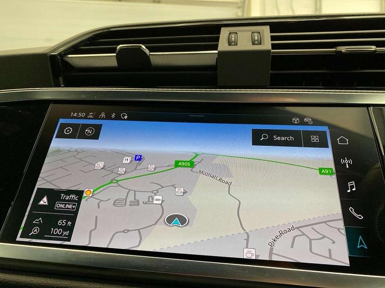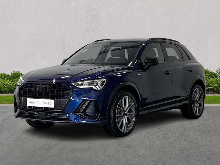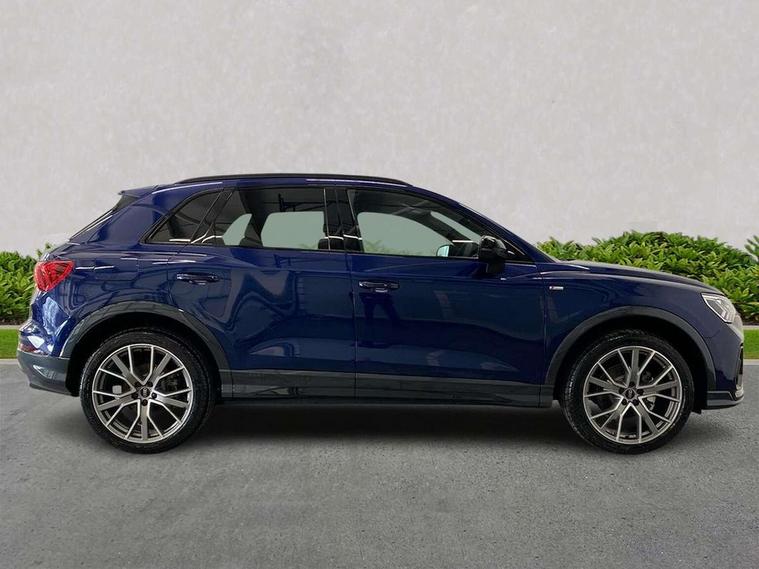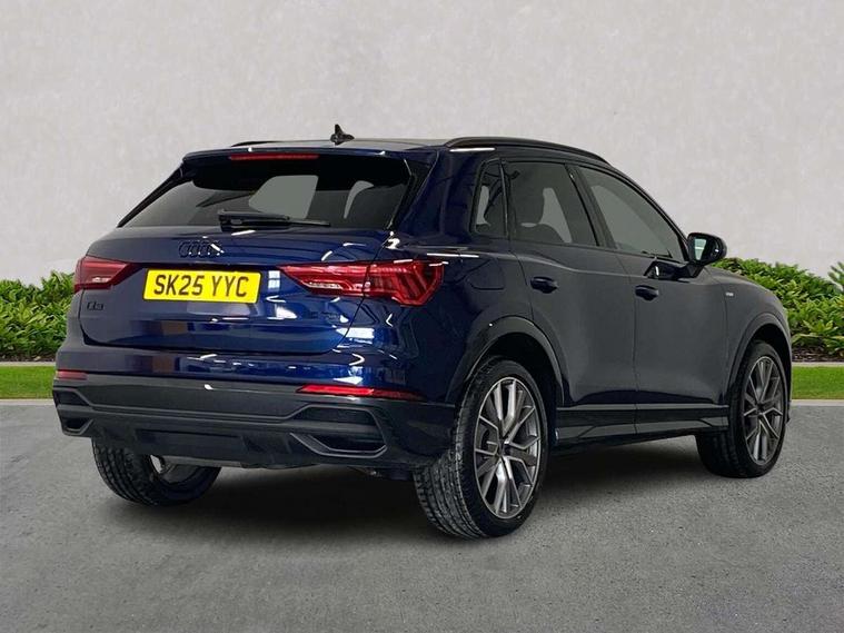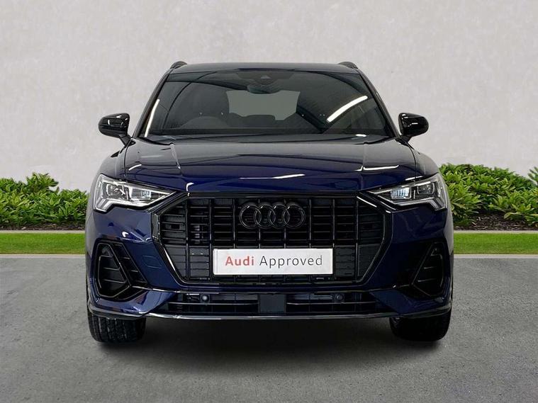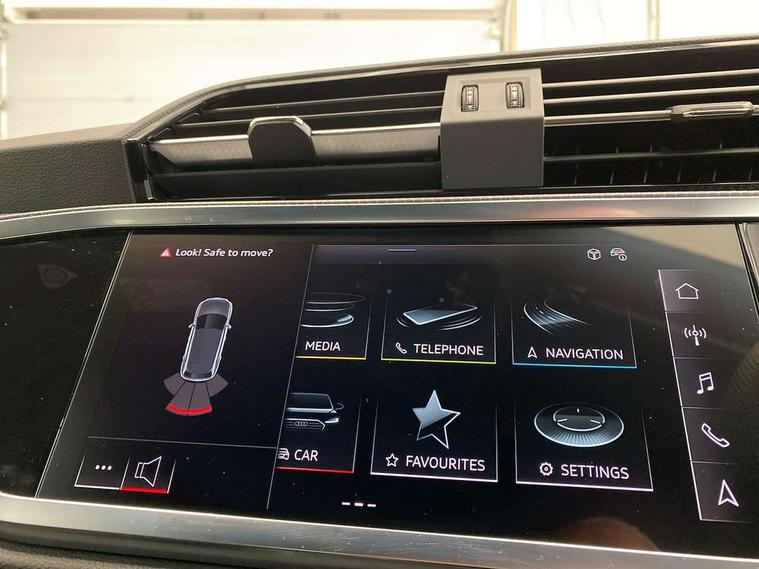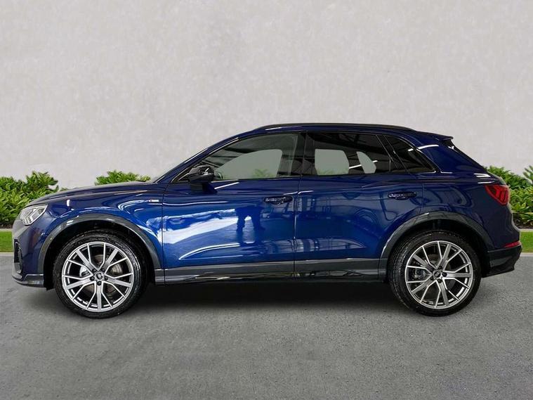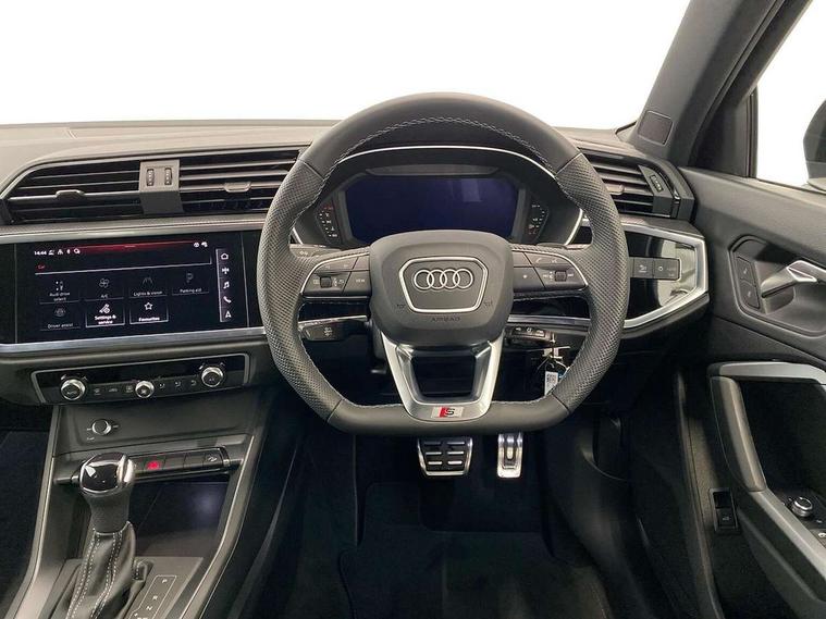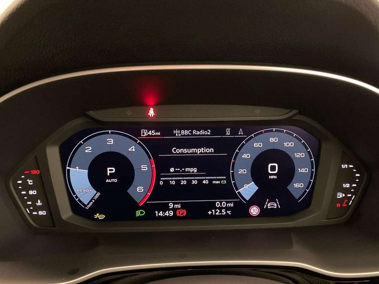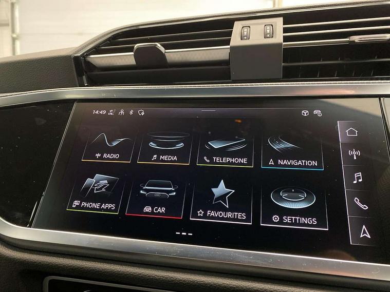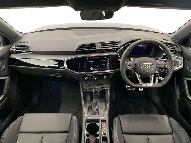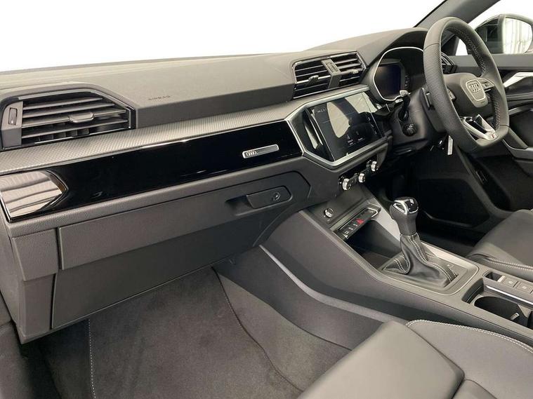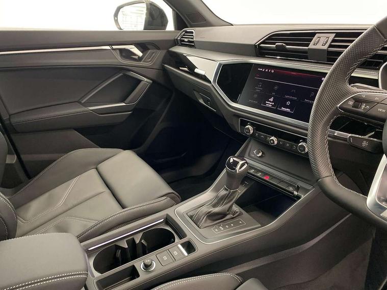 Amazon alexa Integration, Audi connect safety and service, Audi drive select, Audi lane departure warning, Audi Virtual Cockpit - 10.25" display, Bluetooth interface, Camera based traffic sign recognition, Distraction and Fatigue warning, Legal emergency call, MMI Navigation Plus with high resolution 10.1 inch touchscreen colour display, Power operated tailgate, Progressive steering, Service interval indicator, Smartphone interface includes wireless Apple carplay/Android Auto, Start stop system with recuperation, Voice control system with natural language interaction, Diesel particulate filter, Sports suspension, 2 USB-C ports with charge and data functions, 6 passive loudspeakers, DAB digital radio module, Acoustic windscreen, Audi Beam uses LEDs to project the Audi logo onto the ground as you exit your Q3, Auto dimming door mirrors, Auto dimming frameless rear view mirror, Black roof rails, Electrically folding, adjustable and heated door mirrors with integrated LED side indicators and kerb view function for passenger side, Front and rear electric windows, Front fog lights, Grille vertical bars in aluminium silver/Matt, High gloss black finish B and C pillars, LED Dynamic rear indicators, LED headlights with LED daytime running lights, LED rear lights, LED third brake light, Privacy glass dark tinted rear and rear-side windows (from B-pillar backwards), Rain and light sensors, Rear diffuser grille in grained matt black, Rear diffuser strip in matt anthracite black, Rear side wing doors, Rear wiper, S line bumpers in contrasting Manhattan grey, Variable front intermittent wipers, 12V socket in rear centre console, 3 seat bench in 2nd row, 40:20:40 folding with manual adjustment for 60:40 forwards/backwards position and backrest angle, Adjustable rear seat bench/backrest with centre armrest and cupholder, Black cloth headlining, Dual zone electronic climate control, Electric lumbar support, Front and rear black floor mats with contrast stitching in rock grey, Front and rear headrests, Front centre armrest, Height and reach adjustable steering wheel, Illuminated door sill trims with S logo, ISOFIX child seat mounting for front passenger with airbag deactivation and outer rear seat including top tether attachment point for outer rear seats, Manual front seats with height adjustment, Perforated leather gearknob, Single front passenger seat, Stainless steel luggage compartment sill finisher, Stainless steel pedals, Twin leather upholstery with front sport seats + S embossing, Black styling pack - Q3, Non smoking pack - Q3, 3x3 point rear seatbelts, 6 airbags - Driver, front passenger, curtain and side windows, Audi pre-sense front with pedestrain and cyclist recognition, Electrically operated child locks on rear doors, Electromechanical parking brake, Electronic stabilisation control including ABS, ASR and EDL, Front seatbelt reminder, Hill descent control, Hill hold assist, Pre sense basic, Seatbelt monitoring, Tyre pressure warning, Warning triangle and first aid kit, Anti theft alarm, Anti theft wheel bolts, Immobiliser, Remote central locking, Aluminium look interior elements, Detail dashboard around MMI touch colour display in glass look, black with surround in aluminium look, Leatherette door armrest, Piano black inlay,