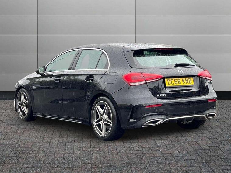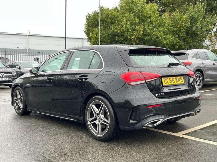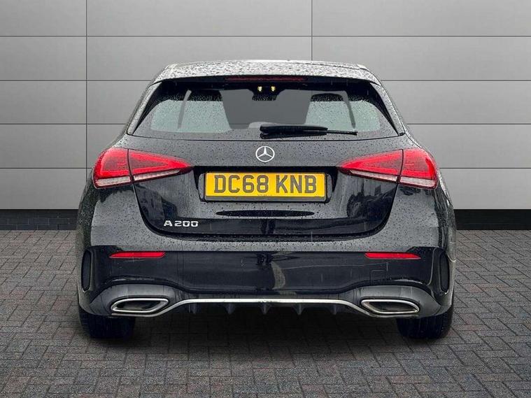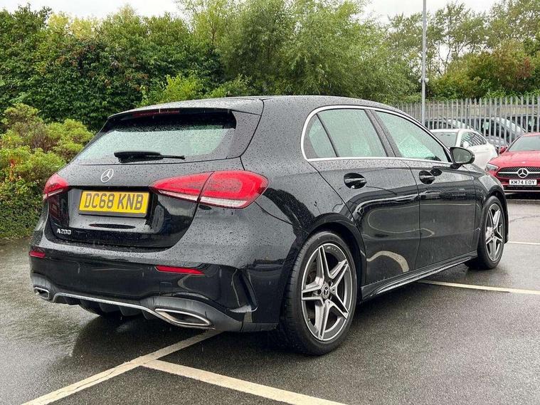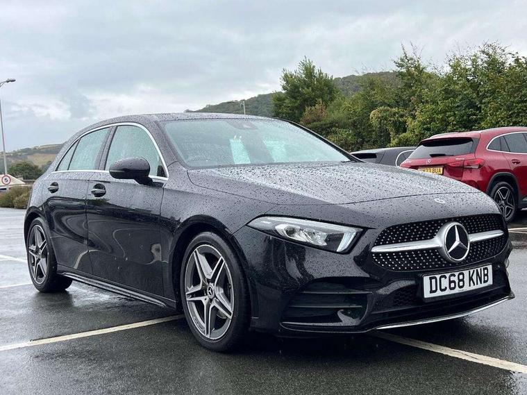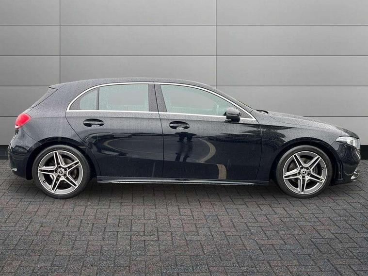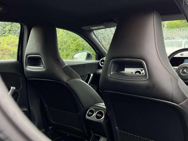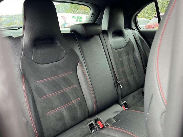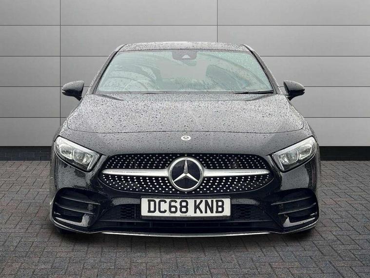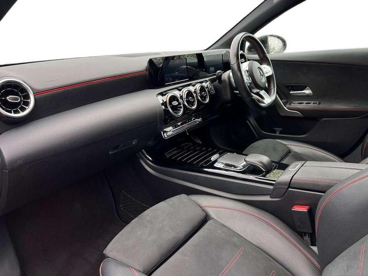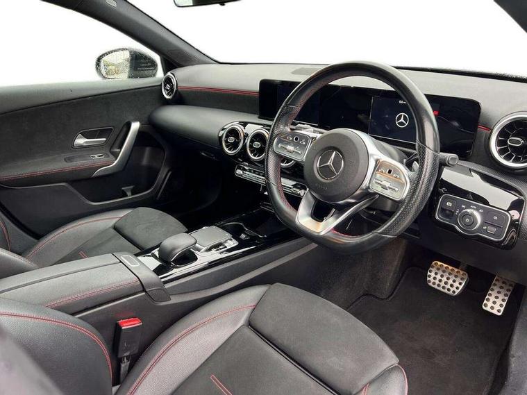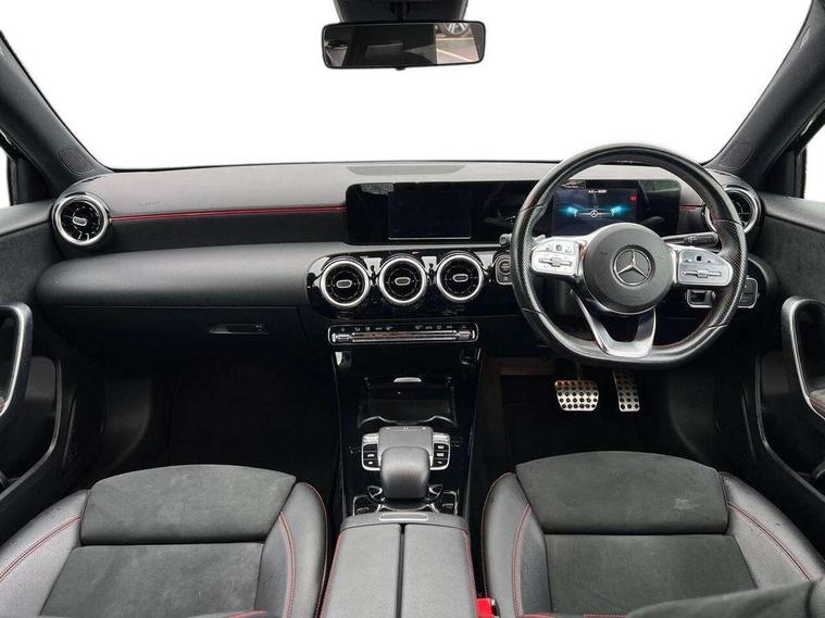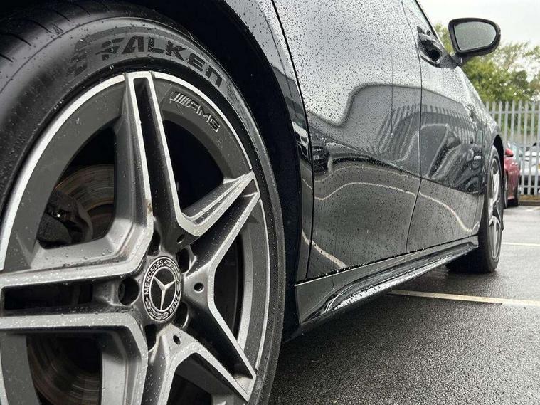 7" colour screen in instrument panel, 7" tablet style colour display, Active lane keep assist, Attention assist, Bluetooth interface for hands free telephone, Bulb failure indicator, Cruise control + speed limiter, Direct steering, DYNAMIC SELECT with a choice of driving modes (ECO, Comfort, Sport, Sport+ and Individual), External temperature gauge, HDD Navigation system, Low fluid warning light, Mercedes connect me with remote online services, Radio aerial integrated into roof spoiler, Reversing camera, Service indicator (ASSYST PLUS), Speed sensitive power steering, Stop/start system, Trip computer, Voice control system, Warning lamp for direction indicators, Lowered comfort suspension, 2 USB ports in centre console, DAB Digital radio, MBUX Multimedia system including digital instrument cluster and phone mirroring, Adaptive brake lights, AMG body styling, Body colour bumpers, Body colour door handles, Body colour side skirt, Body coloured door mirrors, Chrome beltline trim, Diamond radiator grille with chrome pins and silver louvre + chrome insert, Electric adjustable heated door mirrors, Electric front windows, Electric rear windows, Headlamp assist, Heated rear window with timer, High level third brake light, LED daytime running lights, LED Headlights, LED rear lights, Rain sensor windscreen wipers, Rear fog lights, Rear wiper, Twin Trapezoidal tailpipes, 1/3 to 2/3 split folding rear seats, 12V socket, 3 spoke flat bottomed nappa leather sport steering wheel, AMG floor mats with red stitching, Artico man-made leather/Dinamica upholstery, Auto Mercedes-Benz child seat recognition sensor, Black headlining, Brushed stainless steel sports pedals with rubber studs, Controller on centre console with chrome surround, Dual zone automatic climate control, Exit lights, Footwell lights, Front and rear reading lights, Front centre armrest with storage compartment, Front door sills with Mercedes Benz lettering, Front head restraints, Front seat backs luggage nets, Front sport seats, Gearshift paddles on steering wheel, Height adjustable front seats, Height/reach adjustable steering column, Illuminated cup holders, Illuminated glovebox, Illuminated storage compartment, Integrated head restraints, Interior door handle illumination, Isofix rear child seat preparation, Load securing rings in luggage compartment, Luggage compartment cover, Multifunction steering wheel, Oddments tray lighting, Reading lights, Rear head restraints, Storage compartment under load area floor, Sunvisors with illuminated vanity mirrors, Touchpad, Twin front cupholders, Seat comfort pack - A Class, 3 rear 3 point seatbelts, ABS with Brake Assist, Active bonnet, Brake calipers with Mercedes-Benz lettering + perforated brake discs, Child proof door locks, Crash responsive emergency lighting, Drivers knee airbag, Dual stage driver/passenger airbags, Electronic parking brake, ESP with ASR, Front and rear seatbelt reminder, Front head airbags, Front passenger seat occupancy sensor, Front side airbags, Hill start assist, Tyre pressure monitoring system, Warning triangle and first aid kit, Window airbags, Alarm system/interior protection/immobiliser, Keyless ignition, Remote central locking, Chrome air vent surrounds, 18" AMG 5 twin spoke light alloy wheels in titanium grey with highsheen finish, Tirefit sealant with electric air pump,
