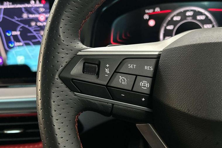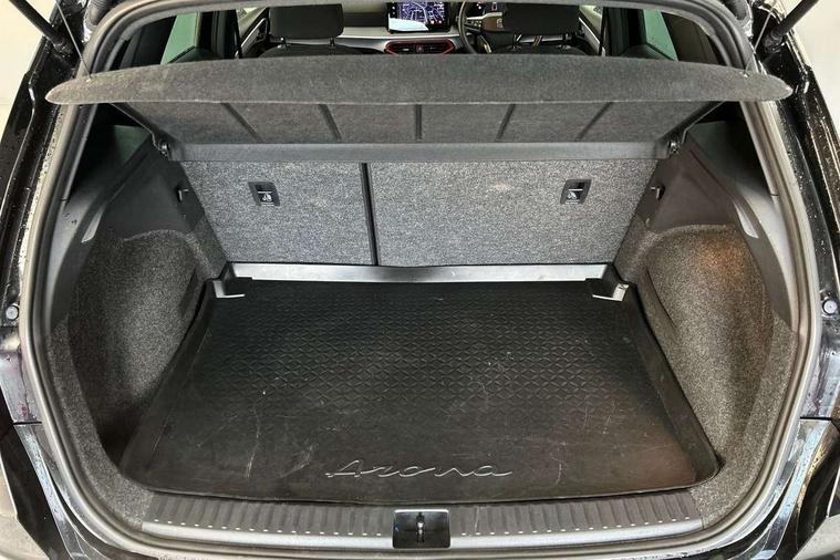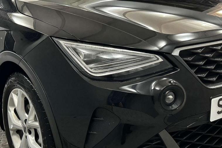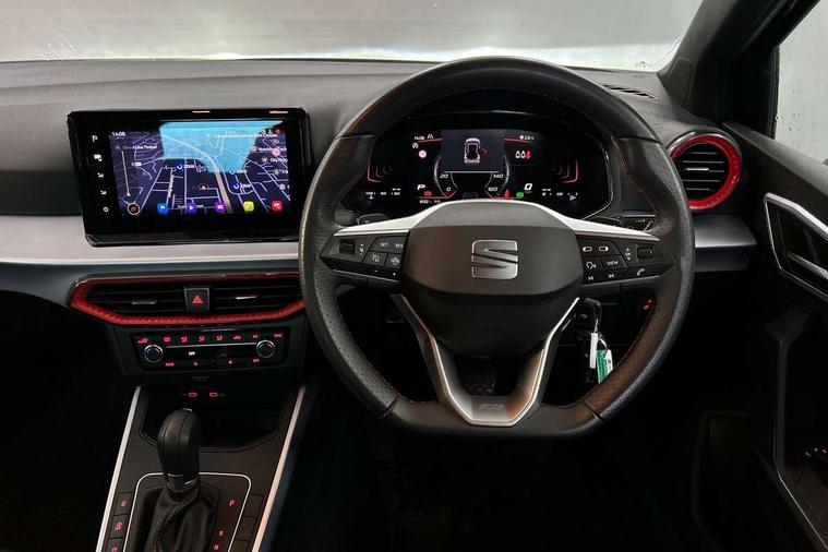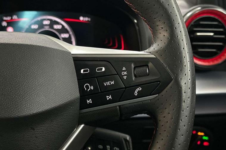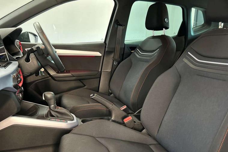 'Lights On' Reminder warning buzzer, 8" Digital cockpit, Digital clock, E-call, Electric speed sensitive power steering, Full link smartphone integration with mirror link, wireless apple carplay, Google android auto + USB Type C cable for apple and android devices, Lane keeping system, Low fuel warning light, Outside temperature display, RPM counter, SEAT Drive profile - Four different models normal-sport-eco-individual, steering response, throttle response and gear shifts mode, Trip computer, Wireless phone charger, 6 speakers, 9.2" colour touchscreen with navigation system, voice control and USB port (type c), Bluetooth interface for hands free and audio streaming, DAB digital radio and AM/FM radio, Steering wheel mounted audio controls, Anti theft roof antenna, Auto dimming interior rear view mirror, Automatic activation of hazard warning lights, Body coloured bumpers, Body coloured door handle inserts, Chrome roof rails and window surrounds, Dark tinted rear windows, Electric front/rear windows, Electrically adjustable, heated and folding door mirrors, Front fog lights with cornering function and rear fog light, FULL LED automatic headlights with dynamic headlight range control, coming and leaving home, LED daytime running lights, LED rear tail lights and licence plate lights, Protective side mouldings, Rain sensing wipers, Rear side wing doors, Rear spoiler, Rear window wash/wipe, Roof colour door mirrors, Third brake light, Twin exhaust pipe styling hidden exhaust pipe, Visible VIN plate, 2 cupholders, 3 seat bench in 2nd row, 60/40 split folding rear seat, Aircare filter, Black interior roof, Cloth upholstery, Double boot floor, Driver sunvisor with covered mirror + card holder, Dual zone climate control, Front courtesy light with front reading lights, Gear shift indicator, Height adjustable front seats, Height/reach adjustable steering column, Illuminated air vent surrounds, Illuminated boot, Instrument lighting with brightness control, Interior ambient lighting, Interior light in footwell, central console and door panel, ISOFIX points in outer rear seats with top tether anchorage points, Passenger sunvisor with vanity mirror, Perforated flat bottomed leather steering wheel/gear knob/handbrake with red stitching and FR logo, Potentiometer, Single front passenger seat, Steering wheel mounted gearshift paddles, Two front and three rear height adjustable headrests, Interior chrome pack - Arona, Safe and driving pack (S) - Arona, 3 point seatbelts on all rear seats, ABS, Active front headrests, Child locks on rear doors, Driver and front passenger airbags with front passenger airbag de activation, front side and curtain airbags, Emergency Brake Assist (EBA) and front assist, Front and rear seatbelt reminder, Hill hold control, Multi-Collision braking, Tiredness recognition system, Traction control, Tyre pressure monitoring system, Alarm with back up horn with tow away protection, Deadlock, Electronic engine immobiliser, Locking wheel bolts, Remote central locking, Titan black dashboard, 17" Dynamic alloy wheels,