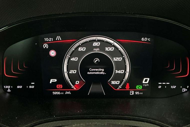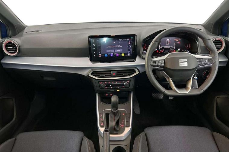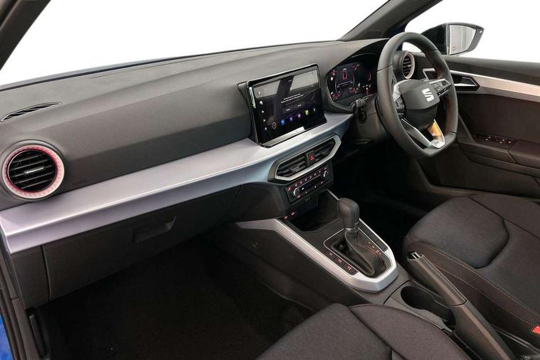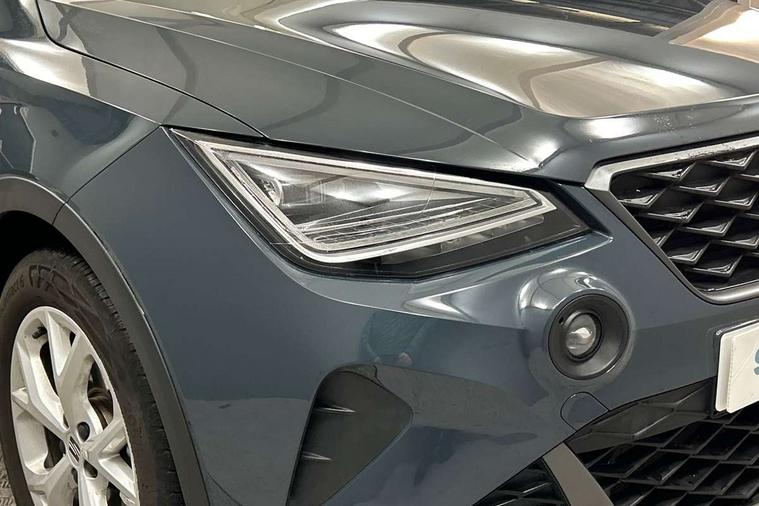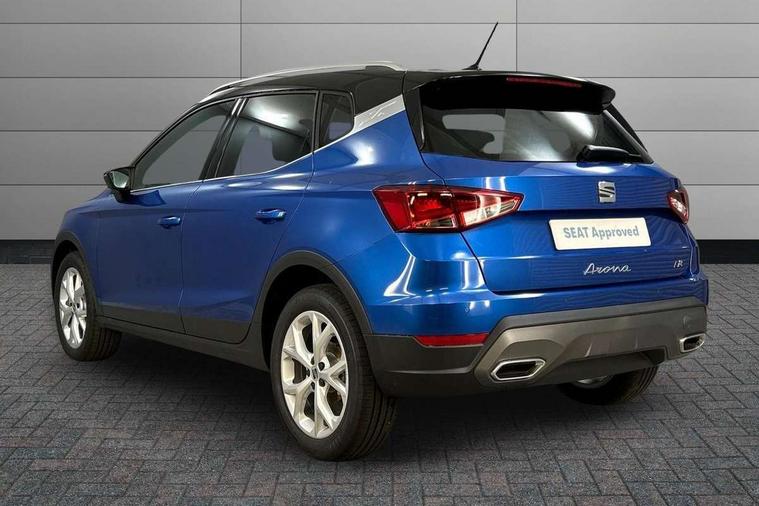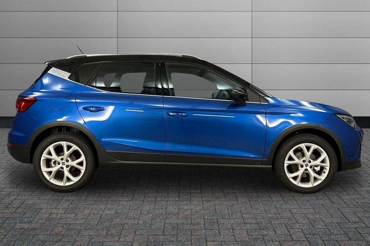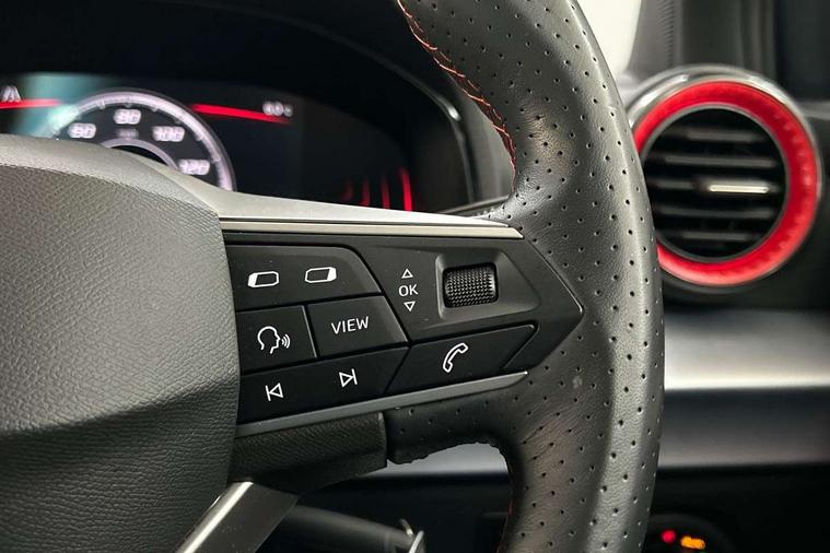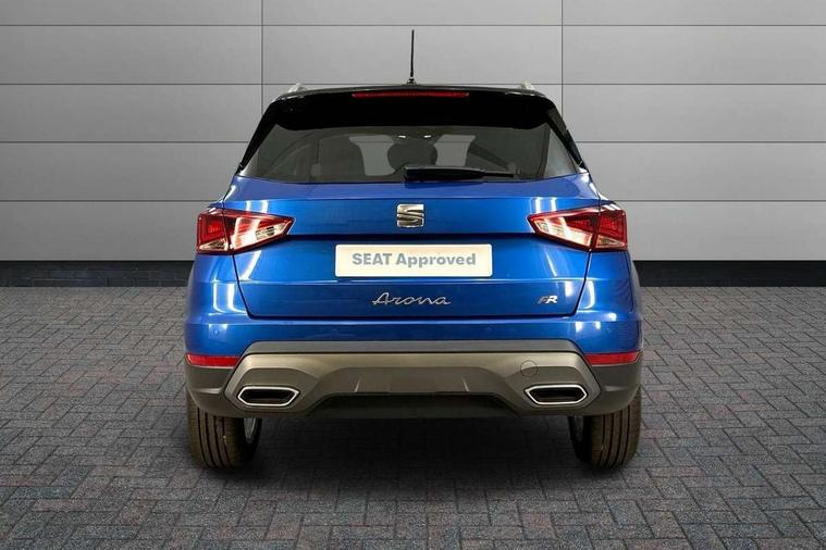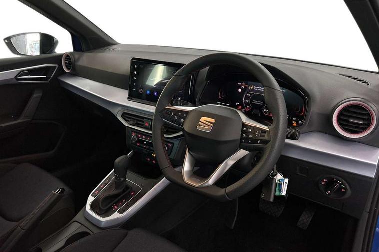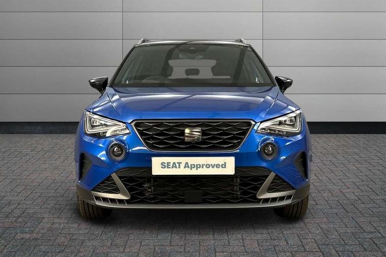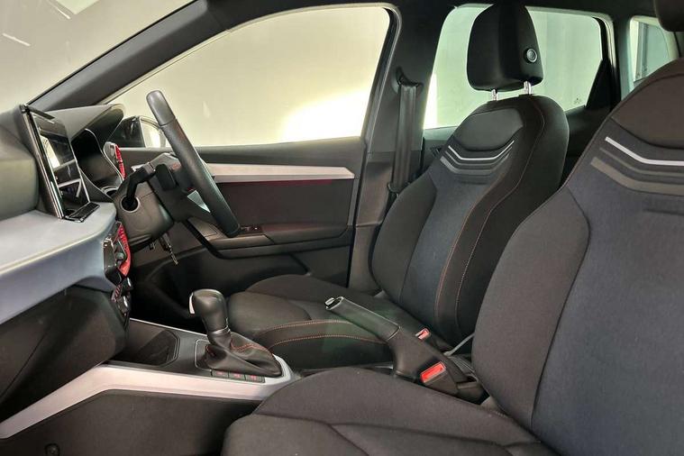 'Lights On' Reminder warning buzzer, 8" Digital cockpit, Digital clock, E-call, Electric speed sensitive power steering, Full link smartphone integration with mirror link, wireless apple carplay, Google android auto + USB Type C cable for apple and android devices, Lane keeping system, Low fuel warning light, Outside temperature display, RPM counter, SEAT Drive profile - Four different models normal-sport-eco-individual, steering response, throttle response and gear shifts mode, Trip computer, Wireless phone charger, 6 speakers, 9.2" colour touchscreen with navigation system, voice control and USB port (type c), Bluetooth interface for hands free and audio streaming, DAB digital radio and AM/FM radio, Steering wheel mounted audio controls, Anti theft roof antenna, Auto dimming interior rear view mirror, Automatic activation of hazard warning lights, Body coloured bumpers, Body coloured door handle inserts, Chrome roof rails and window surrounds, Dark tinted rear windows, Electric front/rear windows, Electrically adjustable, heated and folding door mirrors, Front fog lights with cornering function and rear fog light, FULL LED automatic headlights with dynamic headlight range control, coming and leaving home, LED daytime running lights, LED rear tail lights and licence plate lights, Protective side mouldings, Rain sensing wipers, Rear side wing doors, Rear spoiler, Rear window wash/wipe, Roof colour door mirrors, Third brake light, Twin exhaust pipe styling hidden exhaust pipe, Visible VIN plate, 2 cupholders, 3 seat bench in 2nd row, 60/40 split folding rear seat, Aircare filter, Black interior roof, Cloth upholstery, Double boot floor, Driver sunvisor with covered mirror + card holder, Dual zone climate control, Front courtesy light with front reading lights, Gear shift indicator, Height adjustable front seats, Height/reach adjustable steering column, Illuminated air vent surrounds, Illuminated boot, Instrument lighting with brightness control, Interior ambient lighting, Interior light in footwell, central console and door panel, ISOFIX points in outer rear seats with top tether anchorage points, Passenger sunvisor with vanity mirror, Perforated flat bottomed leather steering wheel/gear knob/handbrake with red stitching and FR logo, Potentiometer, Single front passenger seat, Steering wheel mounted gearshift paddles, Two front and three rear height adjustable headrests, Interior chrome pack - Arona, Safe and driving pack (S) - Arona, 3 point seatbelts on all rear seats, ABS, Active front headrests, Child locks on rear doors, Driver and front passenger airbags with front passenger airbag de activation, front side and curtain airbags, Emergency Brake Assist (EBA) and front assist, Front and rear seatbelt reminder, Hill hold control, Multi-Collision braking, Tiredness recognition system, Traction control, Tyre pressure monitoring system, Alarm with back up horn with tow away protection, Deadlock, Electronic engine immobiliser, Locking wheel bolts, Remote central locking, Titan black dashboard, 17" Dynamic alloy wheels,