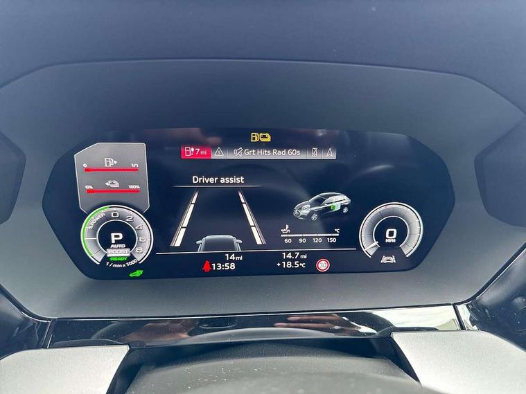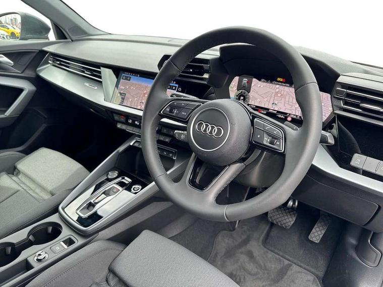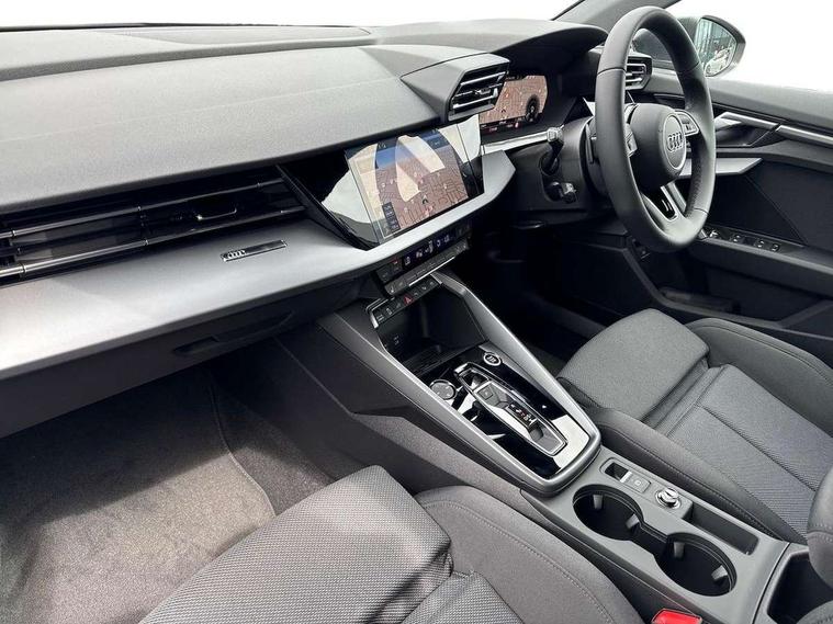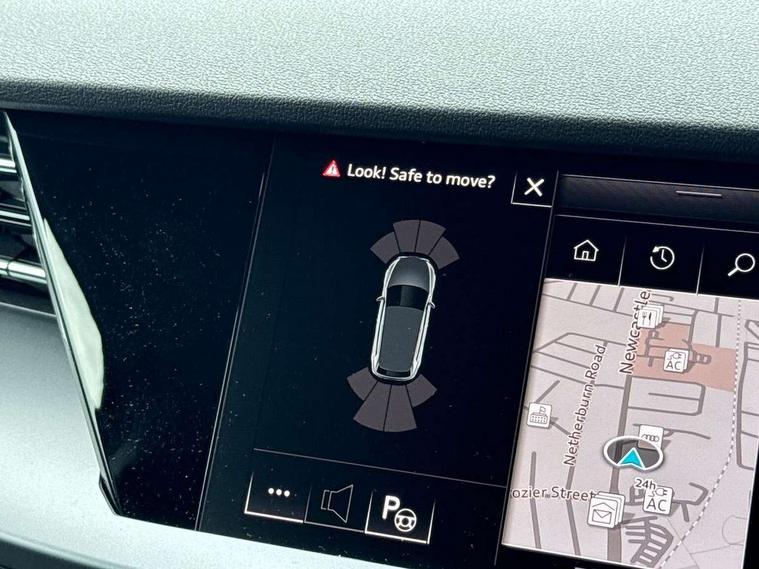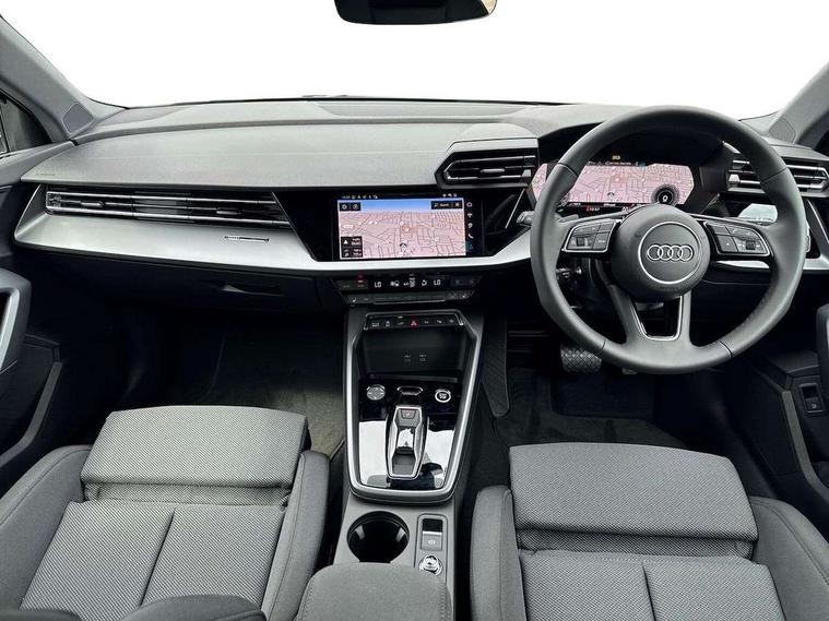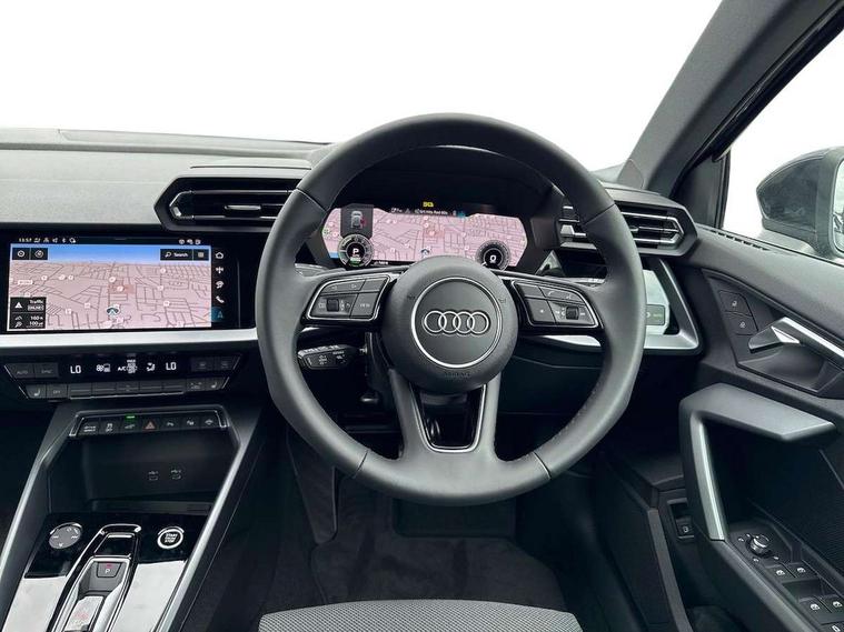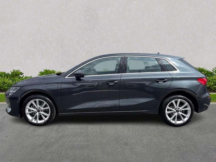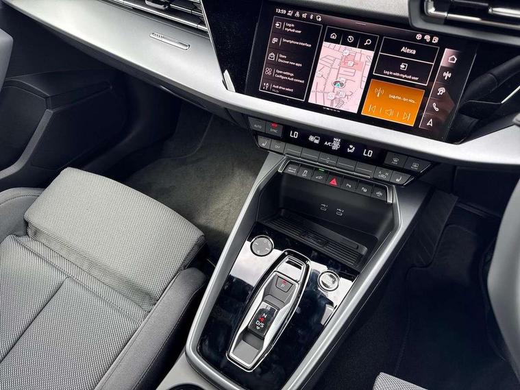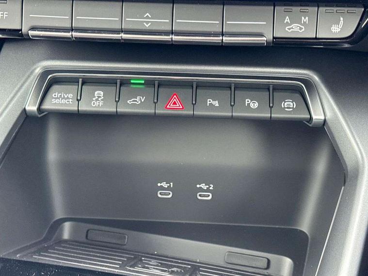 Adjustable speed limiter, Audi drive select, Audi smartphone interface with app store includes wireless Apple carplay, Android auto and Amazon alexa integration, Audi virtual cockpit plus - 12.3" full HD resolution dynamic digital instrument cluster, Automatic start/stop system with recuperation, Bluetooth interface, Camera based traffic sign recognition, Collision avoidance assistant, Cruise control, Distraction and Fatigue warning, e-Call (emergency call), Electromechanical power speed sensitive steering, Emergency assist, Lane departure warning system, MMI Navigation Plus with high resolution 10.1" colour touch screen display, Park Assist with parking system Plus, Service indicator, Trip computer, Voice control system with natural language interaction, 3 pin 10 amp domestic charging cable, CCS socket for DC charging, Charging cable for public charging, mode 3 (type 2), 32 A, Compact charging system, Industrial connector CEE 32 A, 230 V, length 1.6 m, Standard suspension, Type 2 socket for AC charging, Audi Phonebox light with wireless charging, Audi sound system - 10 loudspeakers including centre loudspeaker and subwoofer, DAB Digital radio, USB ports with charging function in the rear, 3rd brake light, Acoustic glass windscreen, Aluminium window trim, Auto dimming frameless rear view mirror, Body colour exterior mirrors, Body colour roof spoiler, Dipped beam, main beam, position light and turning light, Electrically adjustable/heated/folding/auto dimming door mirrors with integrated LED indications + kerb view function for passenger side, Exterior model badging, Front electric windows, Front radiator grill in high gloss dark chrome, Front side air inlets in grained matt black with silver frame, Heat insulating glass windscreen, LED daytime running lights, LED headlights and halogen rear lights, Light and rain sensors, Rear diffuser and grill in grained matt black with silver frame, Rear electric windows, Rear side wing doors, Rear window, rear door windows and rear side windows in clear glass, Rear wiper, 12V socket and storage compartment in front centre console, 3 seat bench in 2nd row, 3 spoke leather multifunction steering wheel with gear shift paddles, 3-zone deluxe automatic air conditioning, 4 way electrically adjustable lumbar support for driver and front passenger, 60/40 split folding rear seat bench, Black front and rear floor mats, Convenience auxiliary air conditioning, Front and rear headrests, Front centre armrest, Front door sill trims with aluminium inlay, Heated front seats, Height and reach adjustable steering wheel, Manual boot compartment lid, Manually adjustable front seats, Routine cloth upholstery with front sports seats, Seat side bolsters, Single front passenger seat, Steel grey cloth headlining, Aluminium interior elements pack - A3, LED interior lighting pack -A3, 3x3 point rear seat belts, Acoustic vehicle alerting system, Driver and front passenger airbag with passenger airbag deactivation, Electronic Stabilisation Control (ESC) including ABS, ASR and EDL, First aid kit with warning triangle and 2 safety vests, Front side airbags with head airbags and interaction airbag, Hill hold assist, Pre-sense front with pedestrian and cyclist detection, Seatbelt monitoring, Tyre pressure loss indicator, Anti theft alarm, Anti-theft wheel bolts, Electronically operated child locks, Immobiliser, Remote central locking with safelock, Black dashboard, Inlays in volcano grey fine paint finish, Tyre repair kit,