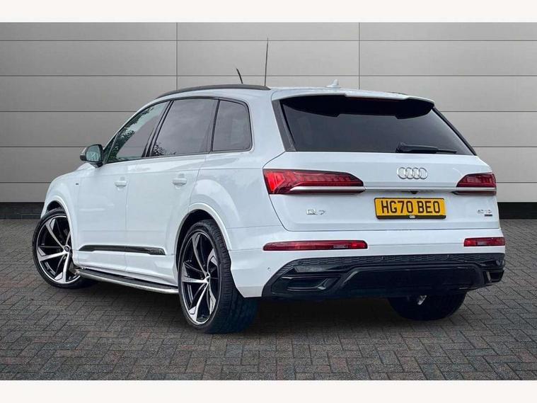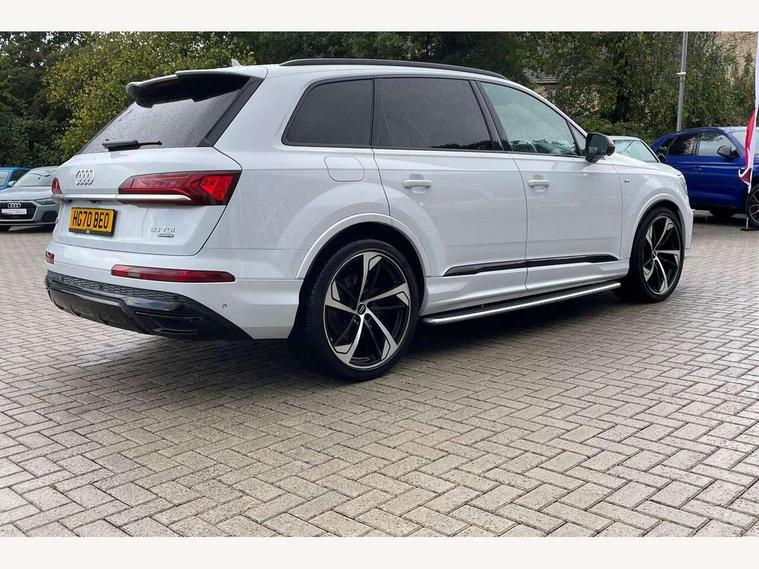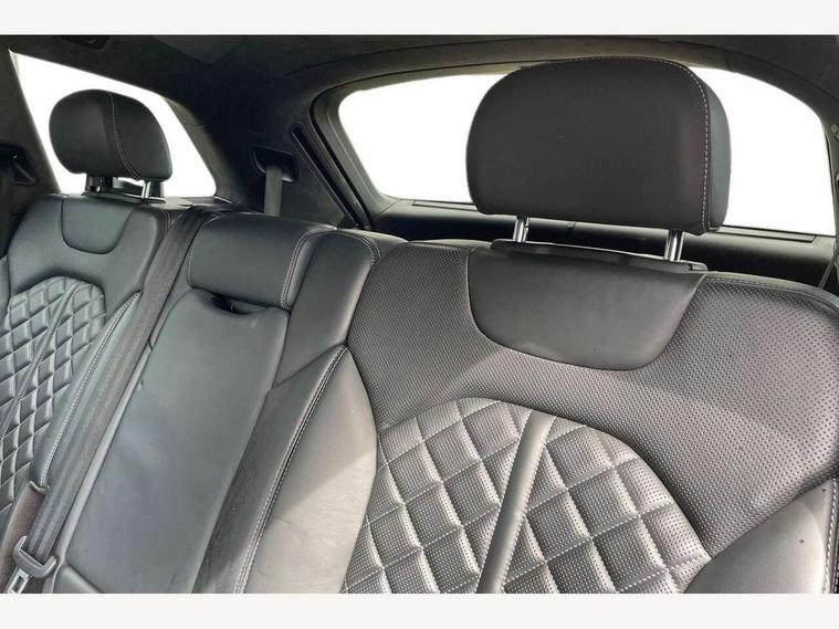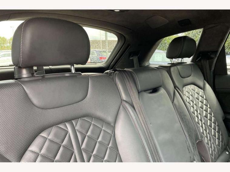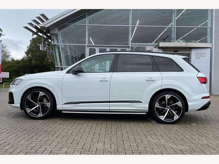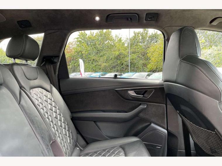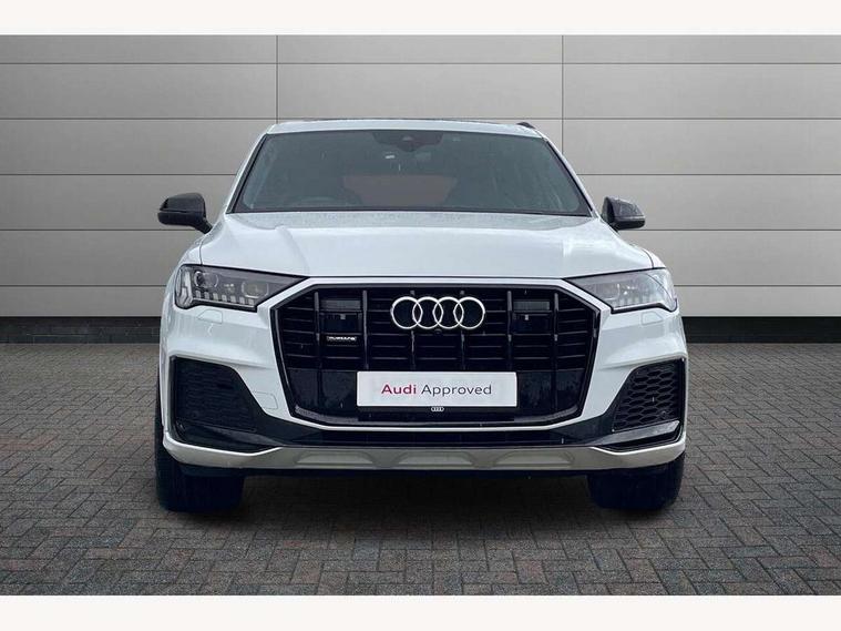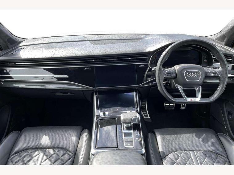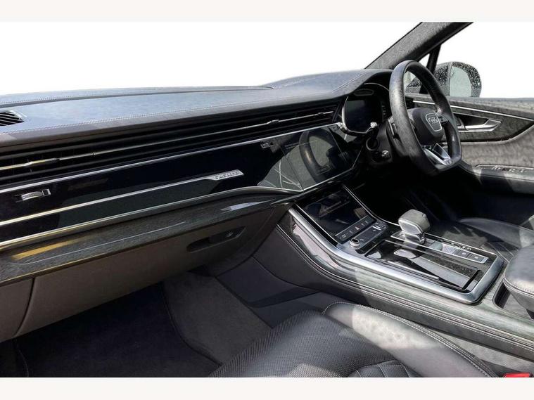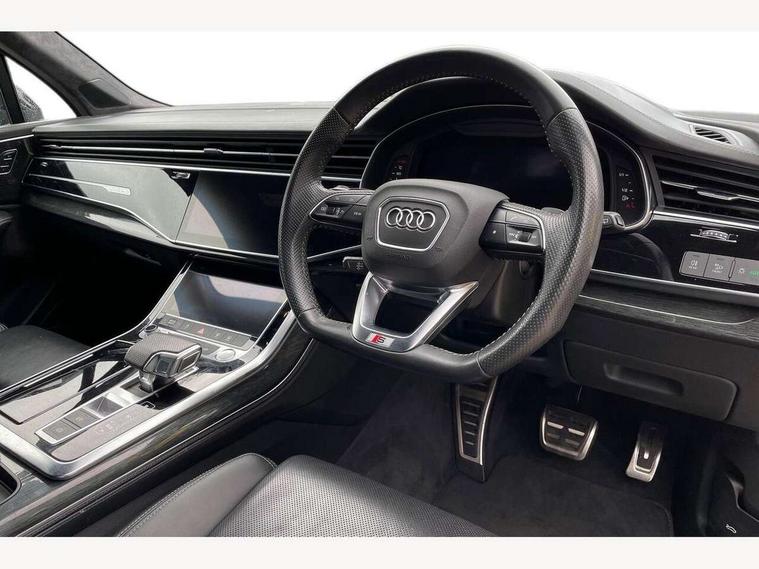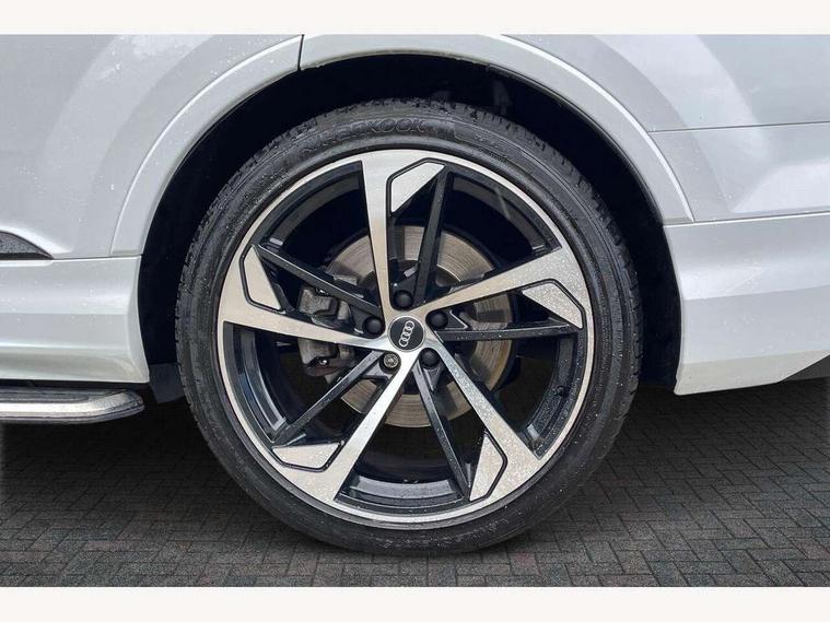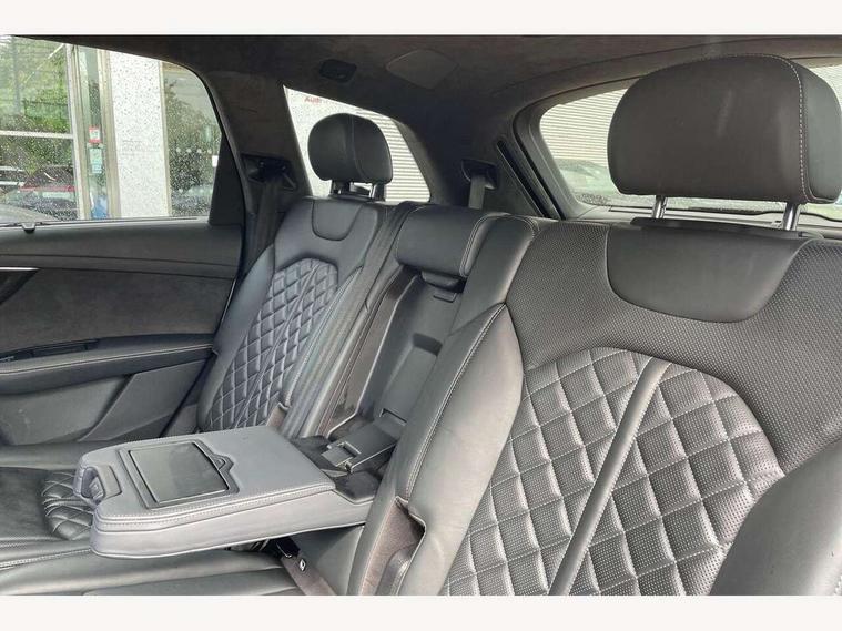 All wheel steering, Audi connect safety and service (e-call), Audi drive select (Auto, Comfort, Dynamic, Efficiency, Individual, Off-road and All road), Audi phone box with wireless charging, Camera based traffic sign recognition, Head up Display, MMI navigation plus with MMI touch screens includes 10.1" and 8.6" screens with haptic feedback, Natural voice recognition, PAS, Power door closure, Power operated tailgate, Smartphone interface includes wireless Apple carplay/Android Auto, Start/stop system, 48V Mild hybrid technology, Adaptive air sports suspension, Quattro all wheel drive with self locking centre differential, 2 USB-C ports with charging functionality in the rear, DAB digital radio module, Audi Beam uses LEDs to project Vorsprung logo, Audi HD matrix LED headlights with Audi laser light + dynamic front and rear indicators, Auto dimming frameless rear view mirror, Black roof rails, Bumpers in contrast paint scandium grey finish includes door trim and wheel arch trim strips, inlays in door strip contain quattro embossing, Electric panoramic glass sunroof, Electrically adj heated/folding + automatically dimming exterior mirrors with memory + automatic kerb side function for passenger side exterior mirror, Headlight washers, Heat insulating glass in windshield, LED daytime running lights, LED rear tail lights, Privacy glass - dark tinted rear and rear side windows from B-pillar backwards, Side running boards, 3 spoke flat bottomed high multi-function leather sport steering wheel with gearshift paddles, 4 zone deluxe automatic climate control, 7 seat layout with ISOFIX points for the front passenger seat and rear passenger seat, Black alcantara headlining includes double sun visors with extendable driver and front passenger side illuminated vanity mirrors, Comfort front centre armrest, Electric height/reach adjustable steering column with memory + auto easy-entry and exit function, Folding rear seats, Front head restraints, Front/rear floor mats, Heated front and outer rear seats for second row, LED interior ambient lighting, Rear head restraints, Seat ventilation and massage function in the front, Stainless steel pedals, Valcona leather upholstery with front super sport seat + S embossed, electric adj front seats/backrest bolsters, lumbar support, memory functionality, City assist pack - Q7, Comfort and sound pack with Bang + Olufsen premium sound system - Q7, Extended leather pack - Q7, Titanium black styling pack - Q7/SQ7, Tour pack with Adaptive cruise assist - Q7, 3 point seatbelts on all rear seats, Audi pre sense front, Driver and front passenger, front side and curtain airbags, Electromechanical parking brake, Electronic Stabilisation Control (ESC) including ABS, ASR and EDL, Extended pedestrian protection measures, Hill hold assist, Seatbelt monitoring, Tyre pressure loss indicator, Warning triangle and first aid kit, Anti theft alarm, Anti-theft wheel bolts and wheel loosening detection, Keyless go with remote central locking, Polished oak trim with grey finish inlay, Tool kit, Tyre repair kit,
