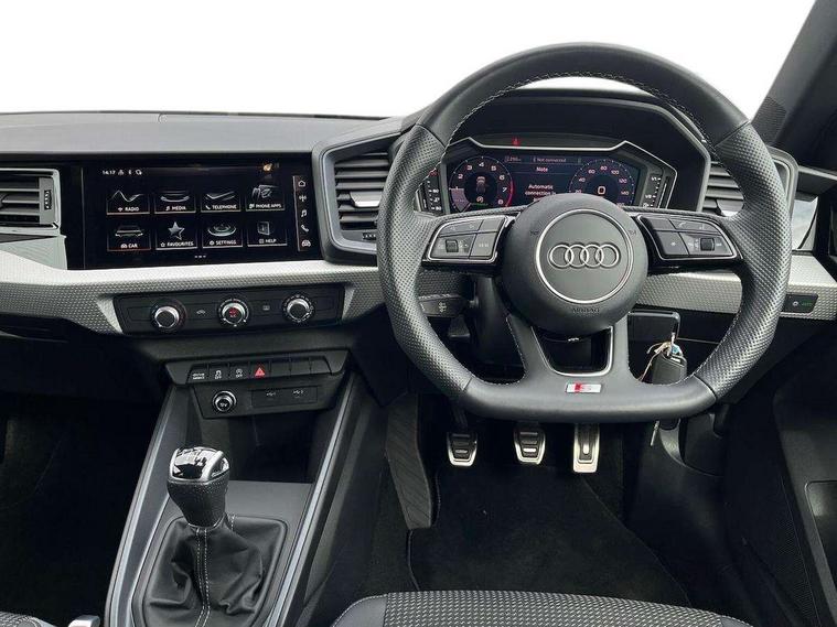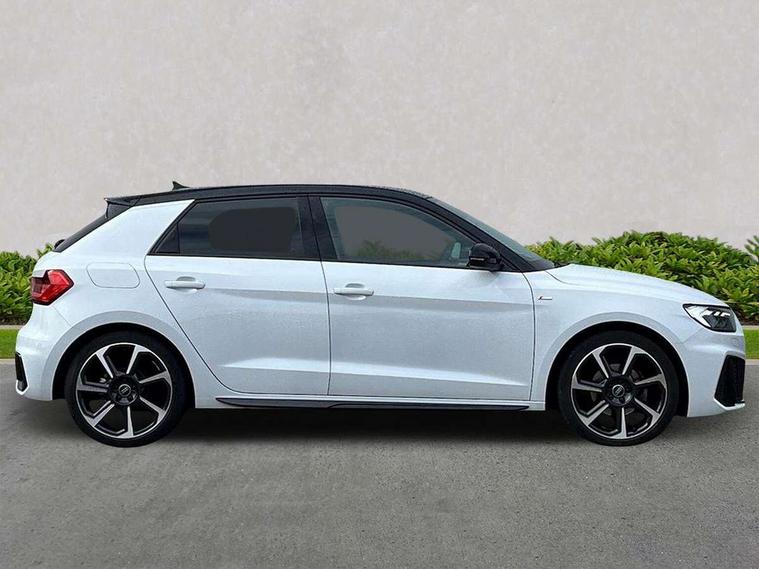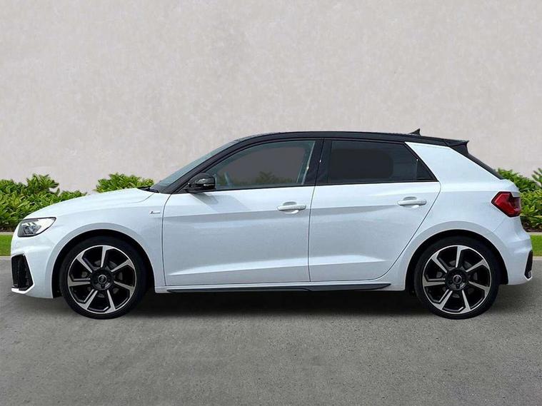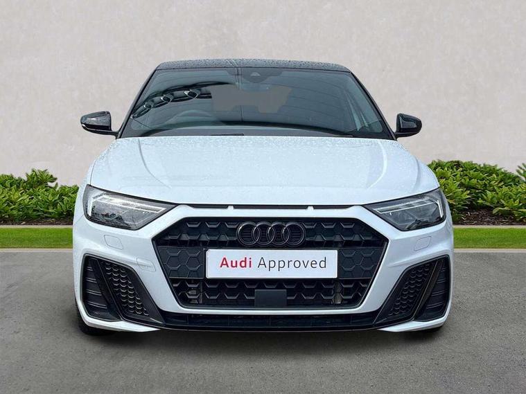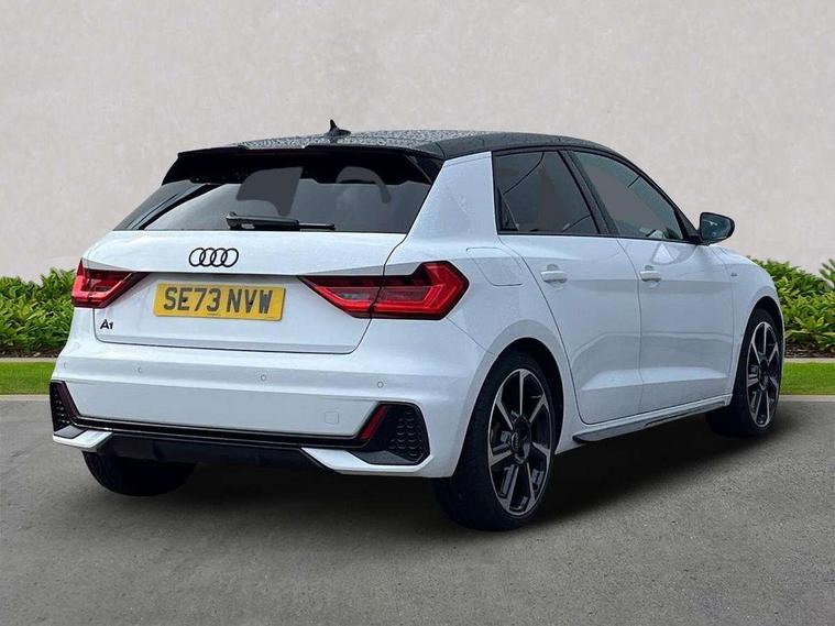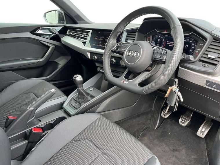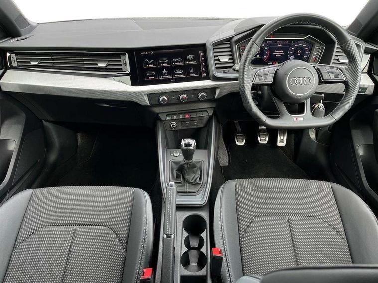 Aluminium trim for control switches, air vents and digital instrument cluster, Silver grey inlays polygon structure in diamond paint finish, Structured grey accent areas including air vents, door handle recesses and centre console in quartz paint finish, Black styling pack - A1 Sportback Black Edition, LED interior lighting pack - A1, Luggage compartment pack - A1, 18" 7 spoke rotor design alloy wheels in gloss anthracite black, diamond cut finish, Anti theft alarm, Anti theft wheel bolts and loose wheel warning, Audi pre-sense front with pedestrain and cyclist recognition, Immobiliser, Remote central locking with 2 foldaway keys, 1 x SDXC card reader, 1 x USB type C and 1 USB type A charging points, DAB Digital radio, MMI radio plus with 8.8" colour MMI display screen and MMI touch, 3x3 point rear seatbelts, Brake assist function, Driver and front passenger airbag with front side and head airbags, Electronic Stability Control including ABS, EBD, ASR and EDL, Front and rear seatbelt reminder, Front passenger airbag deactivation switch, Hill hold assist, Seatbelt height adjustment for front seats, Seatbelt monitoring, Tyre pressure warning light, Warning triangle and first aid kit, Auto dimming rear view mirror, Black door mirrors, Black side skirts, Door sills with aluminium inlays and S Line logo, Electric front and rear windows, Electrically adjustable, heated, folding door mirrors with integrated LED side indicator, Front side air inlets in grained matt black and C frame in titanium black, Heat insulating glass windscreen and side windows, Heated rear windscreen, LED headlights with LED rear lights + dynamic rear indicators + headlight adjustment and high beam, turning light + LED daytime running lights, Radiator protective grille frame in matt aluminium silver, Rain and light sensors, Rear fog lights, Rear wiper, Side front spoiler lips in grained matt black, 12V socket in centre console with two cup holders, 3 rear seats with headrests, 3 spoke flat bottomed multi-function plus leather steering wheel with S badging, grips in preforated leather and contrast stitching, 40:60 Split folding rear seat or folded fully, Black cloth headlining, Driver and passenger seat with manual height adjust with forward and backwards adjustment, Front and rear black floor mats with contrast stitching in fine silver, Front head restraints, Height and reach adjustable steering wheel, ISOFIX child seat mounting for front passenger and outer rear seats including top tether attachment point of outer rear seats, Leather gear knob with aluminium trim, Luggage compartment light with front and rear reading lights, Manually adjustable lumbar support in front seats, Stainless steel pedals, 10.25" Digital instrument cluster display classis style instrument dials + speed, odometer, time, outside temperature, telephone menu + fuel level warning, Audi connect safety emergency and service including E-call, Audi drive select - power steering assistance + engine, Audi smartphone interface with connect compatible smartphone via USB directly MMI display + Nav, music, third party apps controlled via MMI controller, Automatic start/stop system, Bluetooth interface, Cruise control, Driver's information system, Electromechanical power steering, Lane departure warning system, Rear parking sensor, Service interval indicator, Speed limiter, Voice control system, Washer fluid level indicator, Sports suspension,
