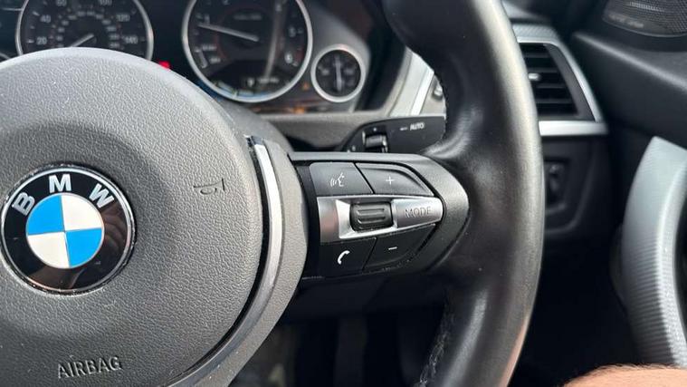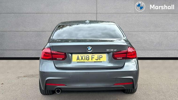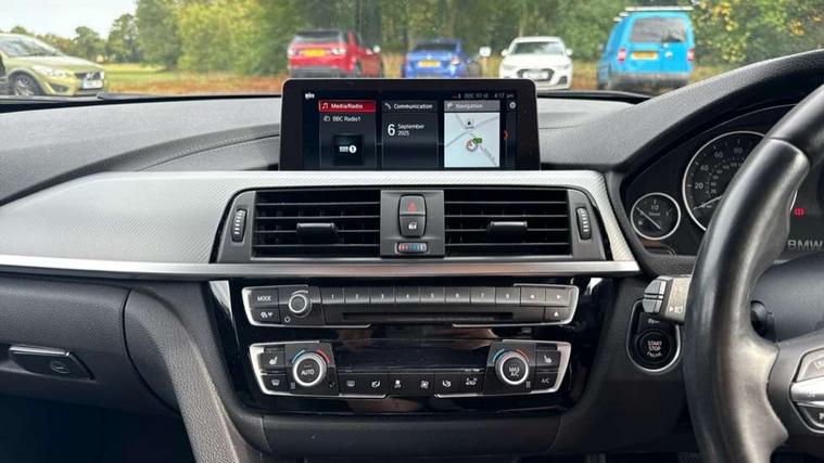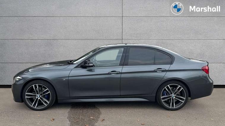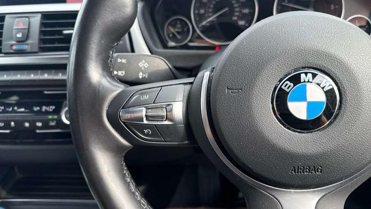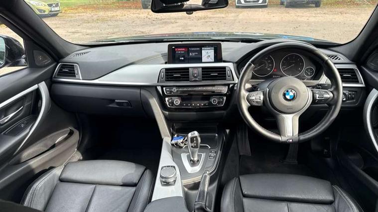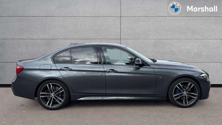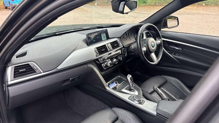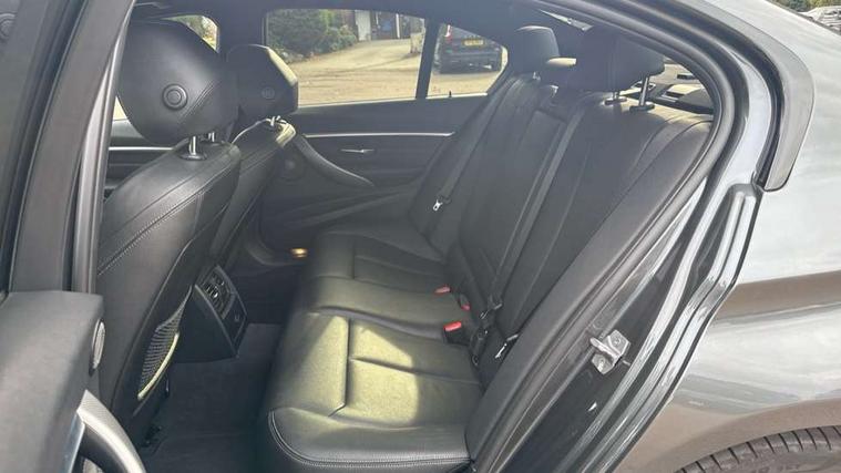 BMW Online services, BMW remote services, BMW Teleservices, Brake force display, Brake pad wear indicator warning light, Check control system, Cruise control with brake function + speed limiter, Digital clock, Door/boot open warning light, Lights on warning, Oil temperature gauge, On board computer, On board diagnostics, Operation warning of all exterior lights, Outside temperature display, Push button starter, Real time traffic information, Run flat tyre indicator, Service interval indicator, Traffic message channel (TMC), Diesel particulate filter, Drive Performance Control, Electronic differential lock, BMW professional radio/CD/MP3, CD Changer preparation, DAB Digital radio, Harman/Kardon logic 7 surround sound system, 'Guide me home' headlamps, 2 speed adjustable intermittent wipers with wash/wipe function, Auto dimming rear view mirror, Automatic headlight beam throw control, Black high gloss door mirrors, Body colour bumpers, Body colour door handles, Body colour roof mouldings, Clear indicator lenses, Dark chrome exhaust tailpipe, Dark headlamp surround, Door sill finishers, Dynamic brake lights, Electric adjustable door mirrors, Electric front and rear windows with one touch/convenient open/close function, Green tinted heat insulating glass, Heated rear window with automatic switch off, Heated windscreen washer jets, High beam assistant, High gloss shadow line, Individual sun protection dark tinted glazing for rear window and rear side door windows, kidney grille with high gloss black vertical slats, LED daytime running lights, LED fog lights, Rain sensor + automatic driving lights control, Shark fin roof aerial, 12V sockets in front centre console and passenger footwell, 2 x folding cupholders in instrument panel above glovebox, 3 rear seat head restraints, 4 foldable grab handles - rear with clothes hook, 4 lashing points to secure luggage, 40:20:40 split folding rear bench seat, Automatic interior light soft on/soft off system, Driver and passenger sunvisors with vanity mirrors + slide cover, Dual zone automatic air conditioning, Folding front centre armrest + storage, Front and rear door armrests, Front and rear velour floor mats, Front door storage bins with bottle holder, Front sports seats with electric side bolster adjustment, Glovebox light, Height adjustable front headrests, Indirect front interior illumination - soft-light function, Individual anthracite headlining, Isofix system on outer rear seats, Leather gear knob, Leather gear selector lever handle, Leather handbrake grip, Lockable glovebox, Luggage compartment lighting, Multi-function controls for steering wheel, Reach + rake adjustable steering column, Rear centre armrest with 2 cupholders, Rear storage compartment in multifunction centre console with sliding cover, Storage compartment in rear doors, Toolkit located in luggage compartment, Extended lighting package - 3 Series, Extended storage pack - 3 Series Saloon, 3 point inertia reel seatbelts + pre-tensioners on outer rear seats, ABS, Automatic Stability Control (ASC), BMW emergency call, Cornering brake control (CBC), Crash sensor, Driver and passenger airbags, DSC+, Dynamic brake control, Dynamic Traction Control - DTC, Front and rear head airbags, Front passenger airbag deactivation, Front seat side impact airbags, Front seatbelt pretensioners + load limiters, Hill start assist, M Sport braking system, Rear child proof door locks, Seatbelt warning, Three 3 point rear seatbelts, Twin horns, Tyre pressure monitor, Warning triangle and first aid kit, Automatic drive away locking facility, Central locking fuel filler cap, Centre lock switch, Electronic immobiliser, Key integrated remote control central locking, Remote control alarm, 19" M double spoke alloy wheels style in bicolour orbit grey - style 704M, Low rolling resistance tyres, Run-flat tyres,