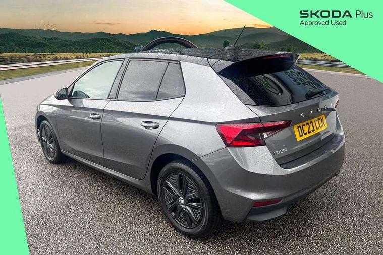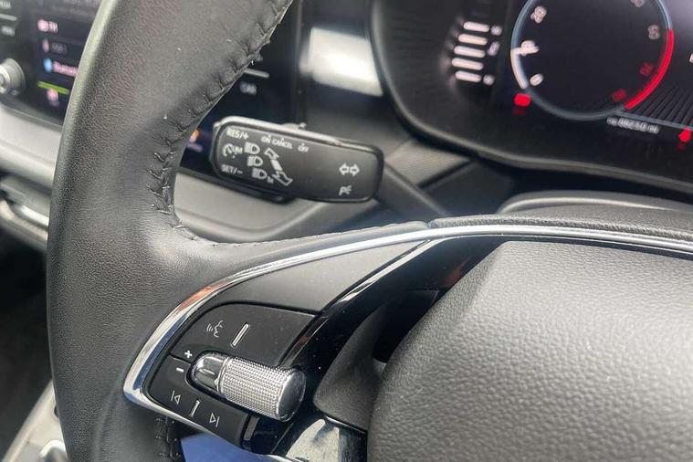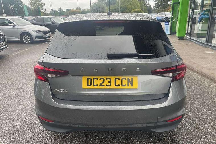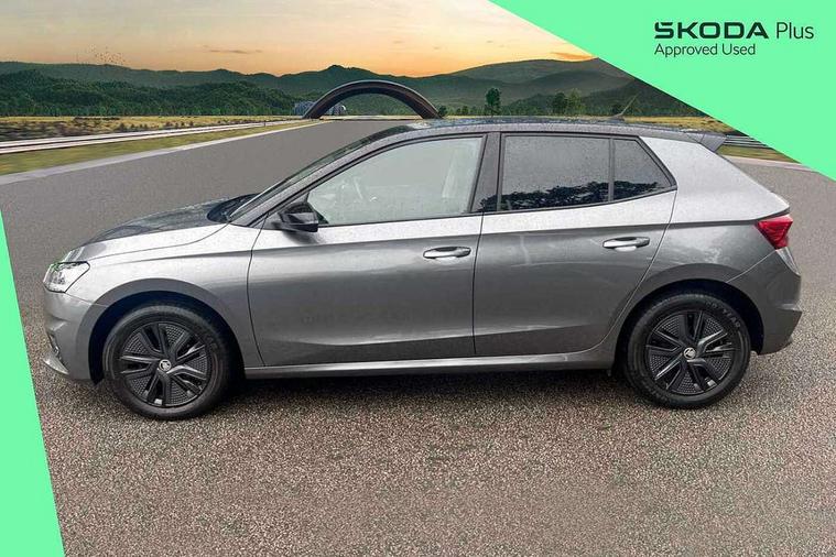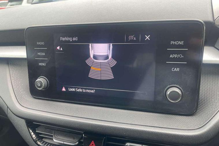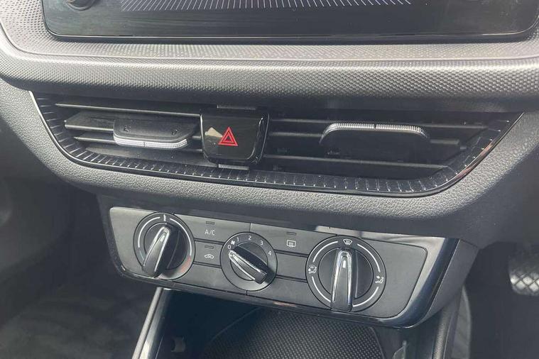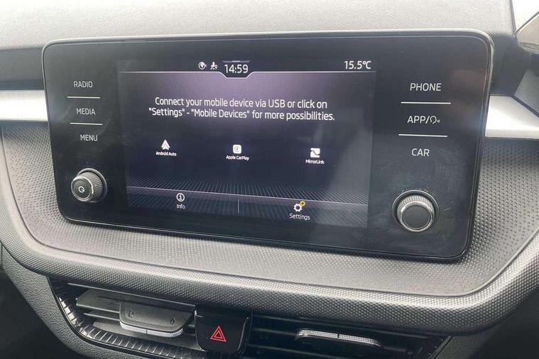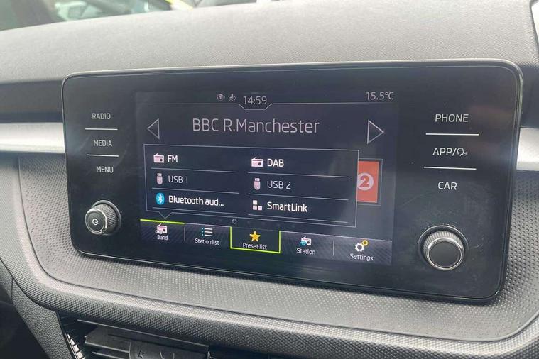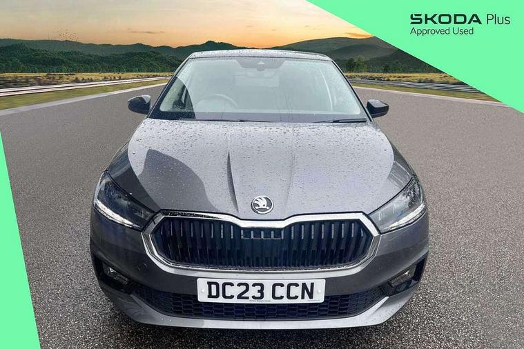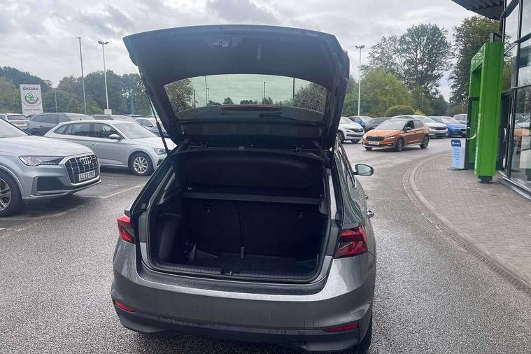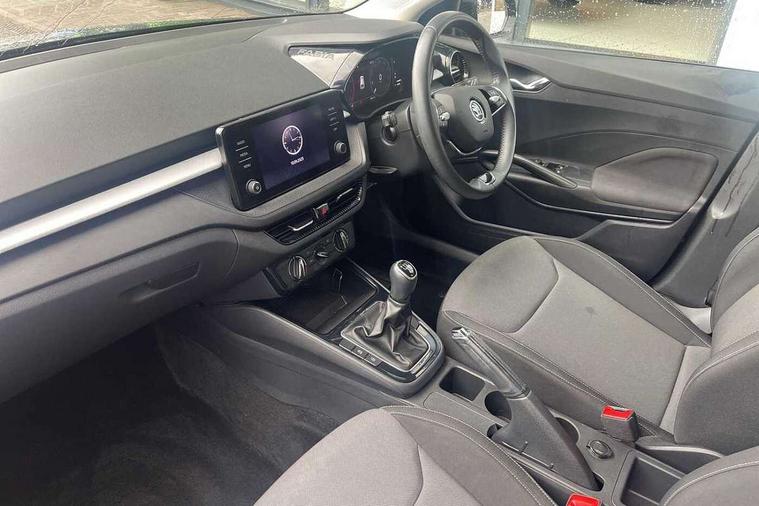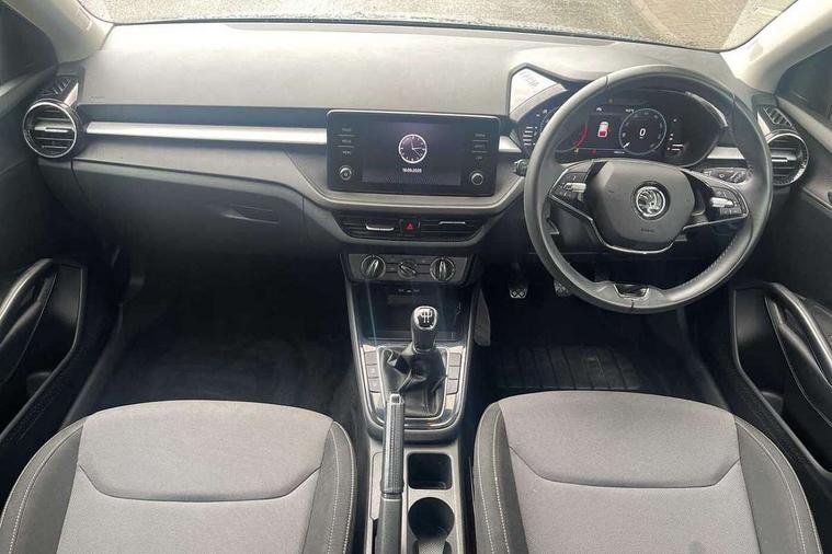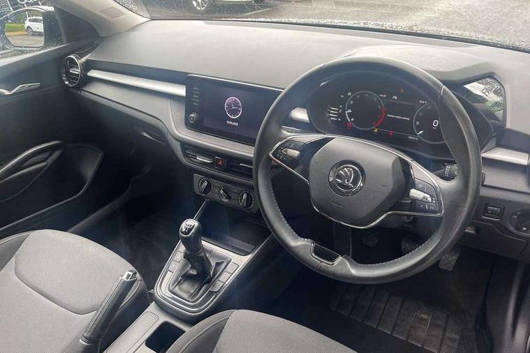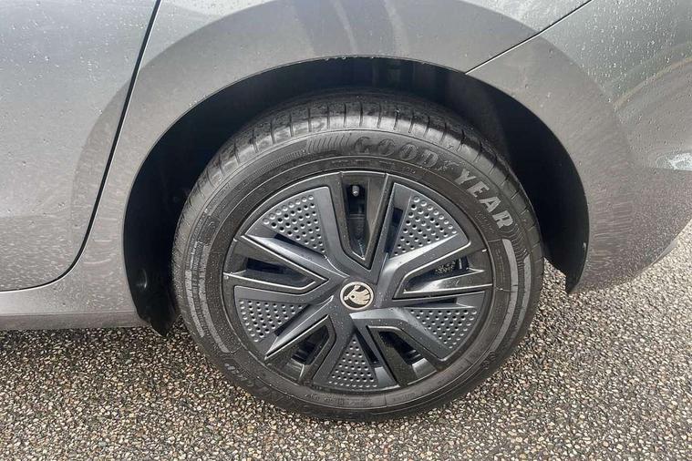 Bluetooth connection, Driver alert system - DAS, Electromechanical power steering, Exterior temperature gauge, Lane assist including road edge detection, Service interval indicator, Virtual cockpit with 10.25" colour display, 2x USB-C in the front (for data transmission and charging), 6 Speakers (4 in front and 2 in rear), Auxiliary socket for external MP3 player, Bolero radio with 8" colour display, DAB digital radio reception, Basic rear lights, Body coloured bumpers, Dimming rear view mirror with black frame, Door mirror integrated indicators, Electrically adjustable and heated door mirrors, Electrically adjustable front windows with function auto up/down, Front window wiper intermittent control, Headlight range control - Automatic, Ice scraper in fuel cap, LED daytime running lights with coming and leaving home feature, Mechanical adjustable rear windows, Privacy glass, Rear LED fog light, Rear side wing doors, Rear window wiper with washing nozzles, Roof colour door mirrors, Roof mounted spoiler, SKODA tailgate lettering in chrome, Third brake light, 3 rear headrests, Backrest split and folding, Central console with fixed cup holder and storage box, Chrome handbrake release button, Fabric upholstery, Gearshift knob/handle in leather, Grain satin black interior door handles, Hand brake lever handle in leather, Height adjustable front headrests, Height adjustable steering wheel, ISOFIX and TopTether anchorage points to the outer rear seats, ISOFIX and TopTether on the front passenger seat, Luggage compartment lighting, Pollen filter, Rear seat bench unsplit, Single front passenger seat, Storm grey headlining, Sun visors with mirror and airbag label on passenger side, Ticket holder, Umbrella in drivers door, 3-point height adjustable front seats belts with pretensioner and force limiter, Automatic warning lights in case of crash, Driver and passengers airbag with switch off function, e-Call+, ESC including ABS, MSR, ASR, EDS, HBA and XDS, Front and rear seat belt warning, FRONT ASSIST (AEB City and AEB Inter Urban), Front side airbags, Head airbags, One tone horn, Pedestrian protection, Three rear 3-points safety seat belts with pretensioner and force limiter including stop function for outer rear seat belts, Tyre pressure monitoring system, Anti-theft alarm system including immobiliser, interior monitoring, backup horn, and towing protection, Anodized cross line upper decorative trim, Colour Edition air vents, Grain satin black central console cover, Grain satin black lower decorative trim, Satin black door and side trim panel in front, Anti-theft wheel bolts protection, Super-low rolling resistance tyres,
