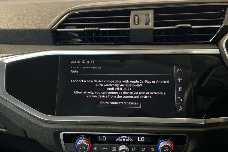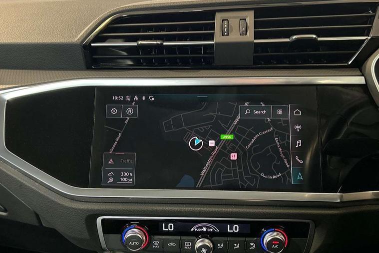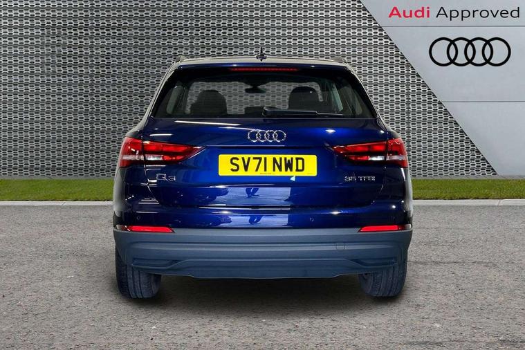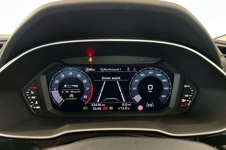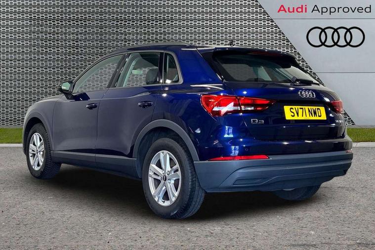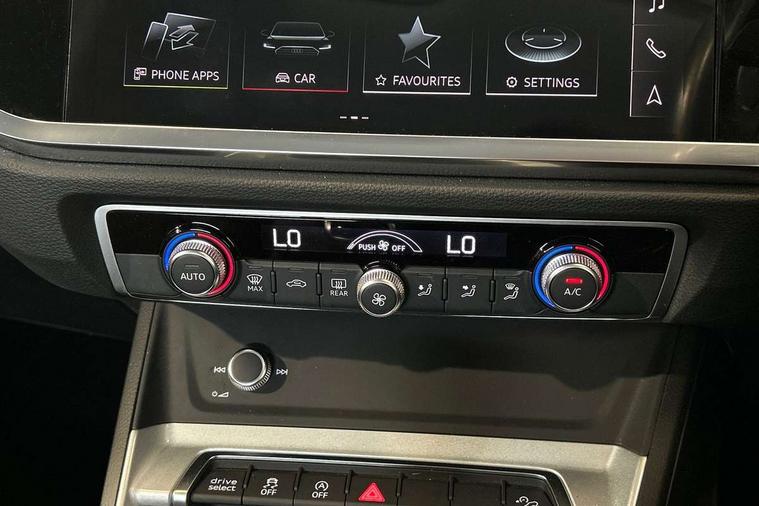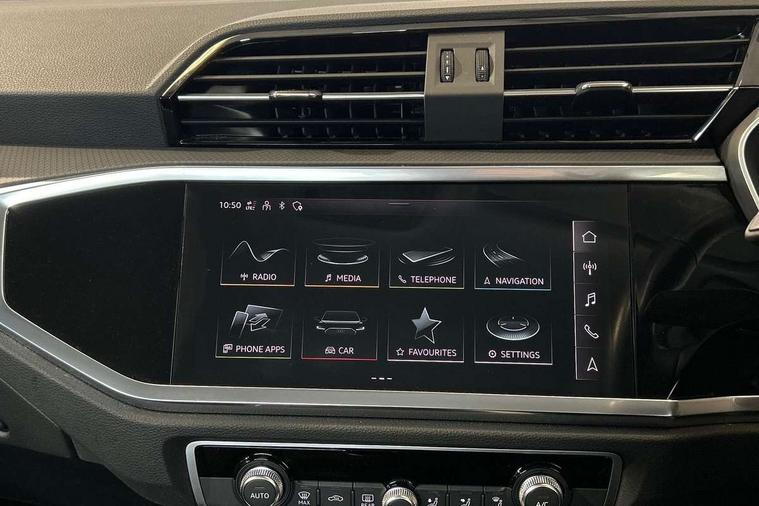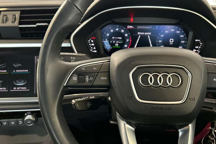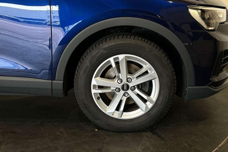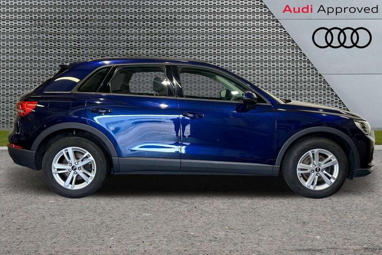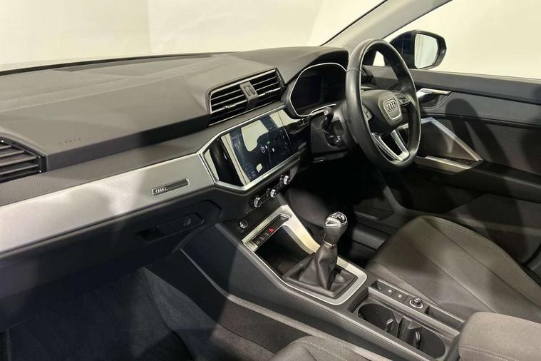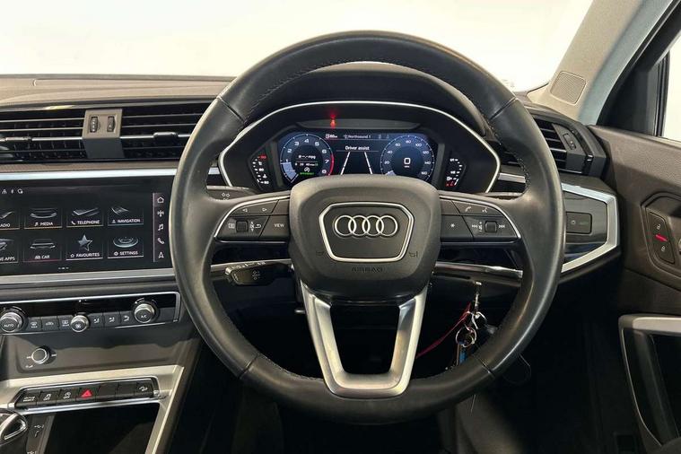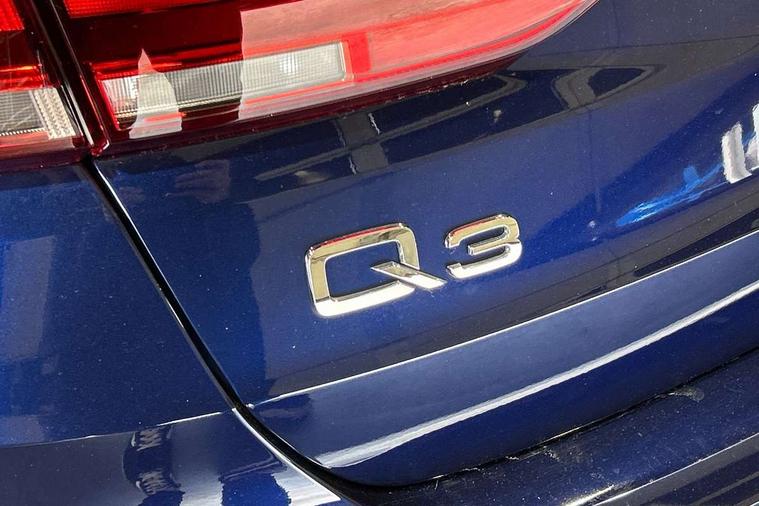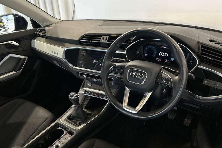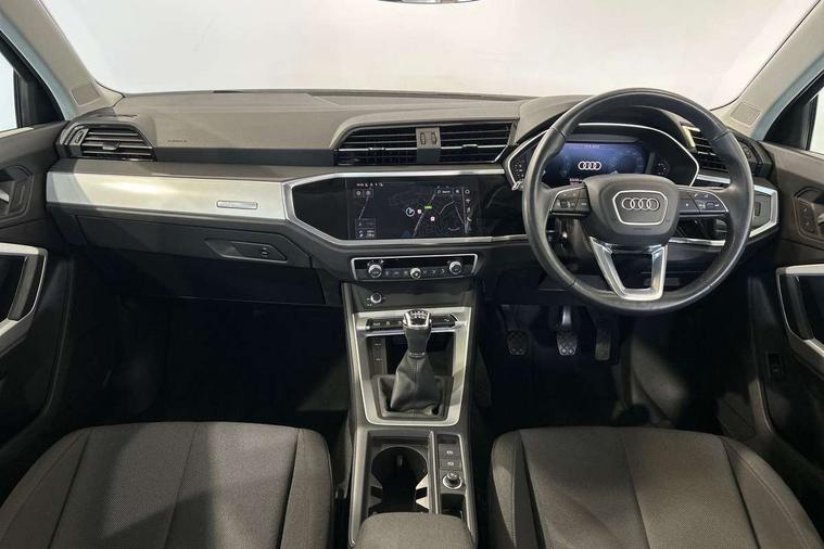 Amazon alexa Integration, Audi connect safety and service (e-call), Audi drive select, Audi lane departure warning, Audi Virtual Cockpit - 10.25" display, Bluetooth interface, Camera based traffic sign recognition, Cruise control + speed limiter, MMI Navigation Plus with high resolution 10.1 inch touchscreen colour display, Power operated tailgate, Progressive steering, Rear parking sensors, Service interval indicator, Smartphone interface includes wireless Apple carplay/Android Auto, Start stop system with recuperation, Voice control system with natural language interaction, Standard suspension, 2 USB-C ports with charge and data functions, 6 passive loudspeakers, DAB digital radio module, Acoustic windscreen, Auto dimming frameless rear view mirror, Black roof rails, Body colour door mirrors, Diffuser in grained anthracite, Electrically folding, adjustable and heated door mirrors with integrated LED side indicators and kerb view function for passenger side, Exterior bumper with wheel arch trims and side sill trims in grained black matt, Front and rear electric windows, Grained radiator protective grille, Halogen rear lights, LED headlights with LED daytime running lights, Rain and light sensors, 12V socket in rear centre console, 3 spoke multi-function leather steering wheel, 40:20:40 folding with manual adjustment for 60:40 forwards/backwards position and backrest angle, Dual zone electronic climate control, Front and rear floor mats, Front and rear headrests, Front and rear roof module including reading lights, Front centre armrest, Glove compartment lighting, Height and reach adjustable steering wheel, ISOFIX child seat mounting for front passenger with airbag deactivation and outer rear seat including top tether attachment point for outer rear seats, Luggage compartment light, Lunar silver cloth headlining, Manual front seats with height adjustment, Stainless steel luggage compartment sill finisher, Non smoking pack - Q3, 3x3 point rear seatbelts, 6 airbags - Driver, front passenger, curtain and side windows, Audi pre-sense front with pedestrain and cyclist recognition, Electrically operated child locks on rear doors, Electromechanical parking brake, Electronic stabilisation control including ABS, ASR and EDL, Hill descent control, Hill hold assist, Pre sense basic, Seatbelt monitoring, Tyre pressure warning, Warning triangle and first aid kit, Anti theft alarm, Anti theft wheel bolts, Remote central locking, Detail dashboard around MMI touch colour display in glass look, black with surround in aluminium look, Micrometallic silver inlay, 17" 5 twin spoke design alloy wheels,