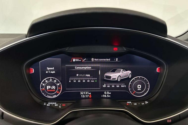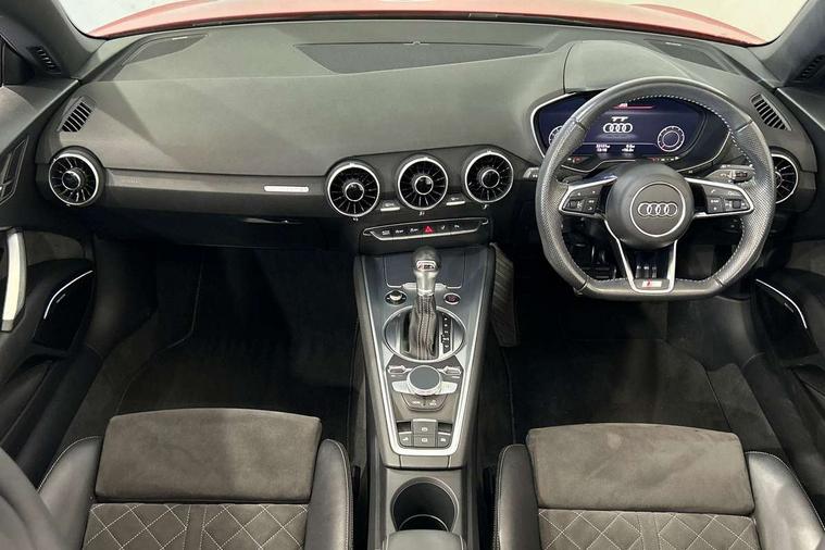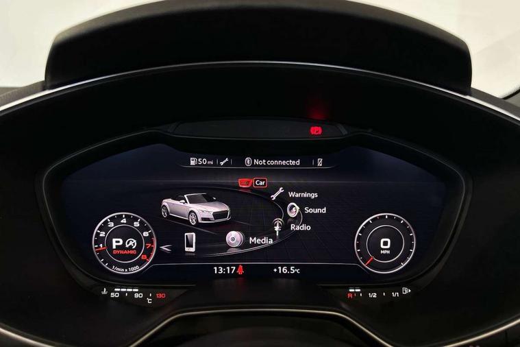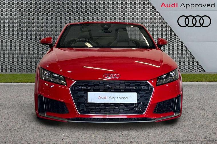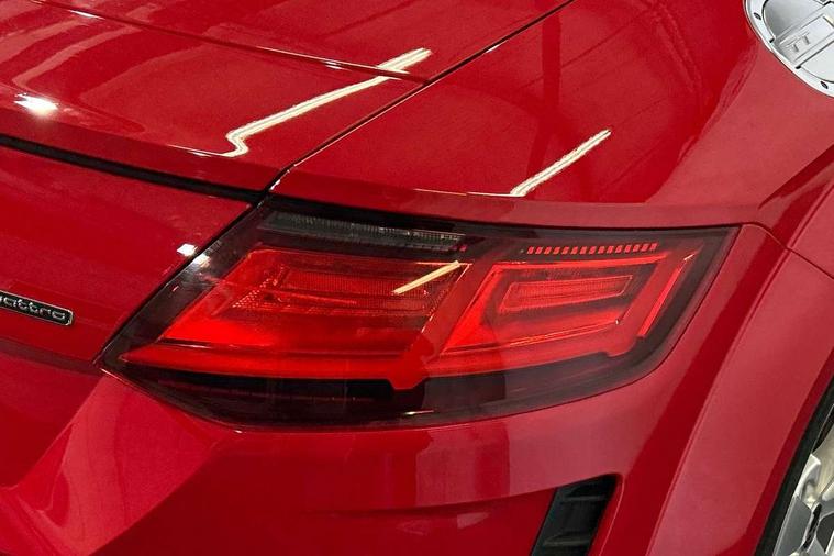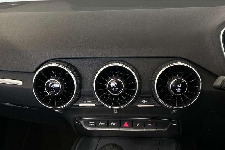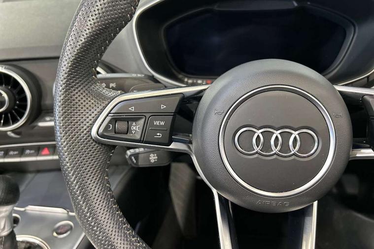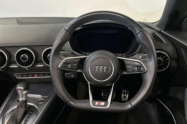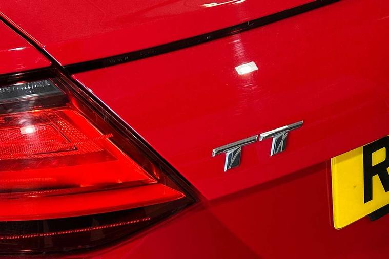 Audi drive select with 4 Pre configured modes, Audi smartphone interface, Cruise control + speed limiter, Emergency call service, MMI touch panel, Mobile phone preparation with bluetooth interface, Progressive power assisted steering, Seat belt microphone, Service interval indicator, Start/Stop system with energy recuperation, TP memo, S line sports suspension, AM/FM radio, Bluetooth audio streaming, DAB Digital radio, MMI Radio with CD player and SD/XC card slot, Auto dimming rear view mirror, Auto headlight range control, Black door mirrors, Body colour bumpers, Electric folding door mirrors, Electric front windows, Electrically adjustable and heated door mirrors with integrated LED side indicators, Front fog lights, Fully automatic acoustic hood, Green tinted heat insulating glass, High gloss black radiator grille, LED 3rd brake light, LED daytime running lights, LED headlights with LED rear lights + dynamic rear indicators, Light and rain sensors, Rear boot, Retractable rear spoiler, S line badges on front wings, Sunband for windscreen, 12V socket, 3 spoke flat bottomed high multi-function leather sport steering wheel with gearshift paddles, 4 way electric lumbar support for driver and front passenger, Black headlining, Black roll bar, Contrasting silver stitching in steering wheel, Door sill trims with S line logo, Extended aluminium look with stainless steel pedals, Front centre armrest, Front passenger seat, Front super sports seats, Heated front seats, Height/reach adjust steering wheel, Integrated head restraints, ISOFIX child seat mounting for front passenger seat with airbag deactivation, Manual adjustment of seat height, fore/aft position, seat angle, seat depth and backrest angle, Perforated leather gearknob in black, S Line badge on steering wheel, Tool kit, Non smoking pack - TT/TT RS, S Line design styling pack - TT, 3 point front seat belts, ABS, ASR traction control, Curtain airbags, Driver and front passenger airbag with front passenger airbag deactivation, EDL traction control, Electromechanical parking brake, ESP, First aid kit, Front side airbags, Hill hold assist, Seatbelt warning, Tyre pressure loss indicator, Warning triangle, Anti theft alarm, Anti theft wheel bolts, Immobiliser, Keyless Go, Remote central locking, Matt brushed aluminium inlays, Tyre repair kit,
