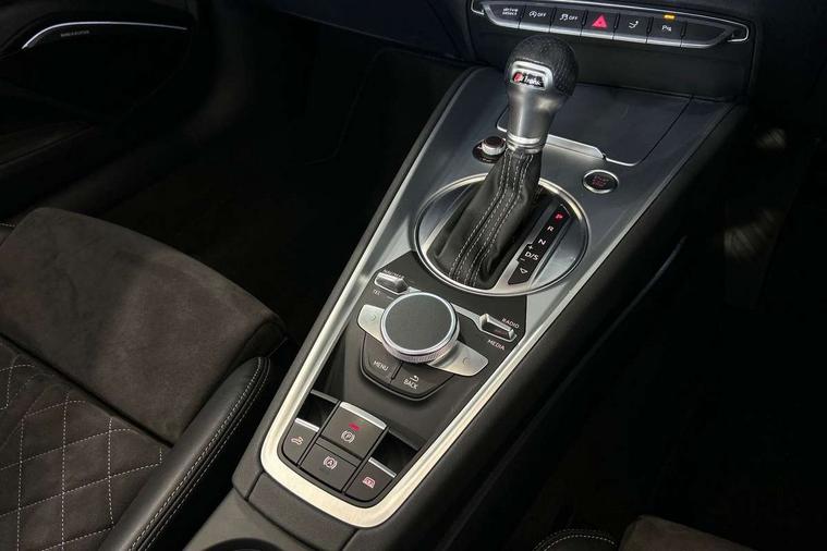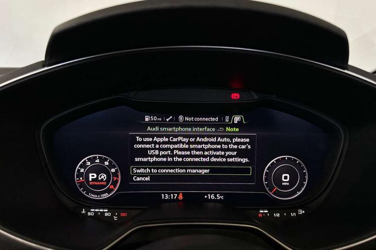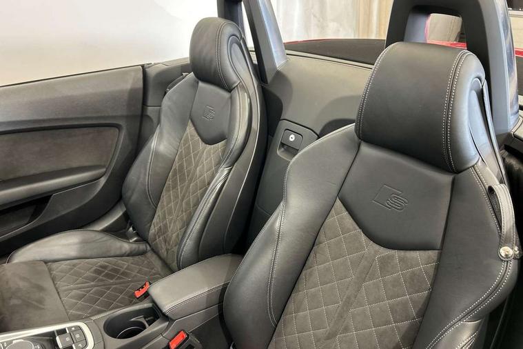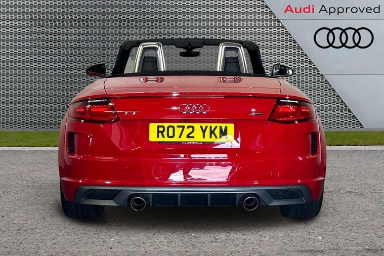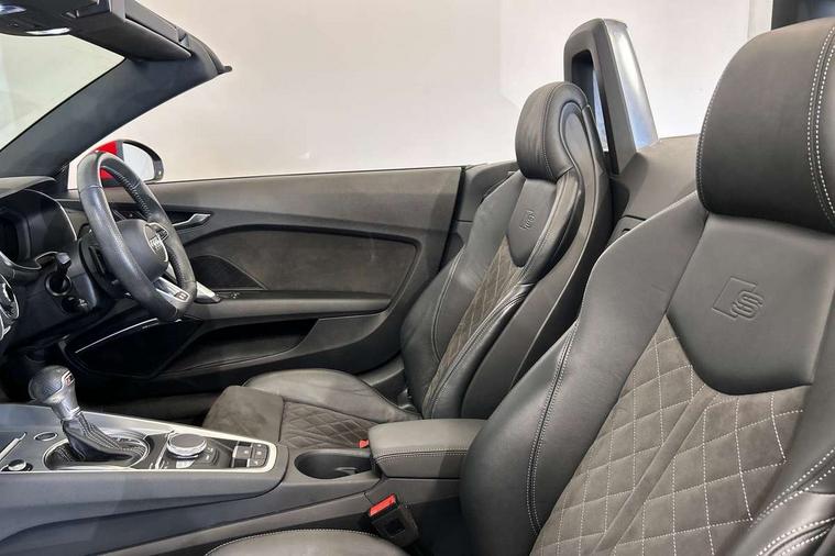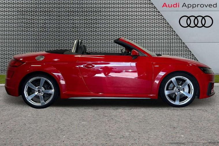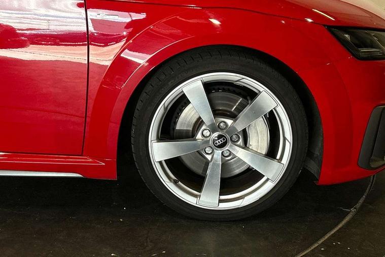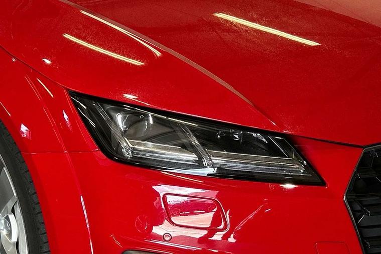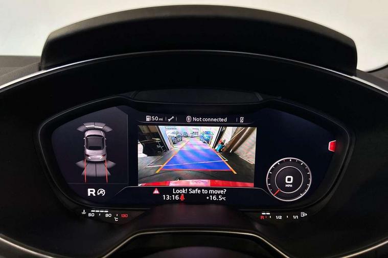 Audi drive select with 4 Pre configured modes, Audi smartphone interface, Cruise control + speed limiter, Emergency call service, MMI touch panel, Mobile phone preparation with bluetooth interface, Progressive power assisted steering, Seat belt microphone, Service interval indicator, Start/Stop system with energy recuperation, TP memo, S line sports suspension, AM/FM radio, Bluetooth audio streaming, DAB Digital radio, MMI Radio with CD player and SD/XC card slot, Auto dimming rear view mirror, Auto headlight range control, Black door mirrors, Body colour bumpers, Electric folding door mirrors, Electric front windows, Electrically adjustable and heated door mirrors with integrated LED side indicators, Front fog lights, Fully automatic acoustic hood, Green tinted heat insulating glass, High gloss black radiator grille, LED 3rd brake light, LED daytime running lights, LED headlights with LED rear lights + dynamic rear indicators, Light and rain sensors, Rear boot, Retractable rear spoiler, S line badges on front wings, Sunband for windscreen, 12V socket, 3 spoke flat bottomed high multi-function leather sport steering wheel with gearshift paddles, 4 way electric lumbar support for driver and front passenger, Black headlining, Black roll bar, Contrasting silver stitching in steering wheel, Door sill trims with S line logo, Extended aluminium look with stainless steel pedals, Front centre armrest, Front passenger seat, Front super sports seats, Heated front seats, Height/reach adjust steering wheel, Integrated head restraints, ISOFIX child seat mounting for front passenger seat with airbag deactivation, Manual adjustment of seat height, fore/aft position, seat angle, seat depth and backrest angle, Perforated leather gearknob in black, S Line badge on steering wheel, Tool kit, Non smoking pack - TT/TT RS, S Line design styling pack - TT, 3 point front seat belts, ABS, ASR traction control, Curtain airbags, Driver and front passenger airbag with front passenger airbag deactivation, EDL traction control, Electromechanical parking brake, ESP, First aid kit, Front side airbags, Hill hold assist, Seatbelt warning, Tyre pressure loss indicator, Warning triangle, Anti theft alarm, Anti theft wheel bolts, Immobiliser, Keyless Go, Remote central locking, Matt brushed aluminium inlays, Tyre repair kit,