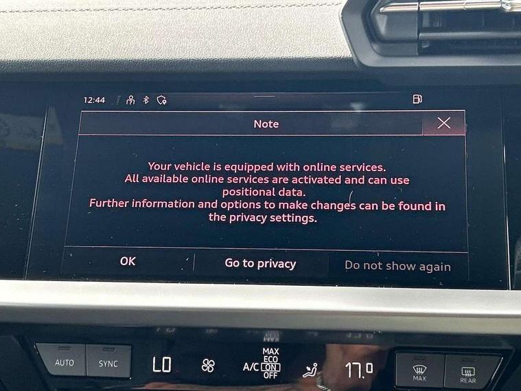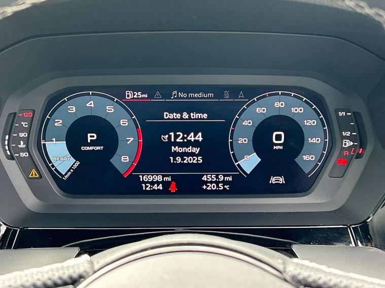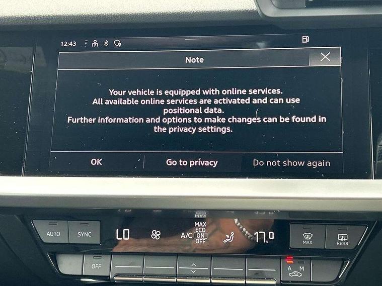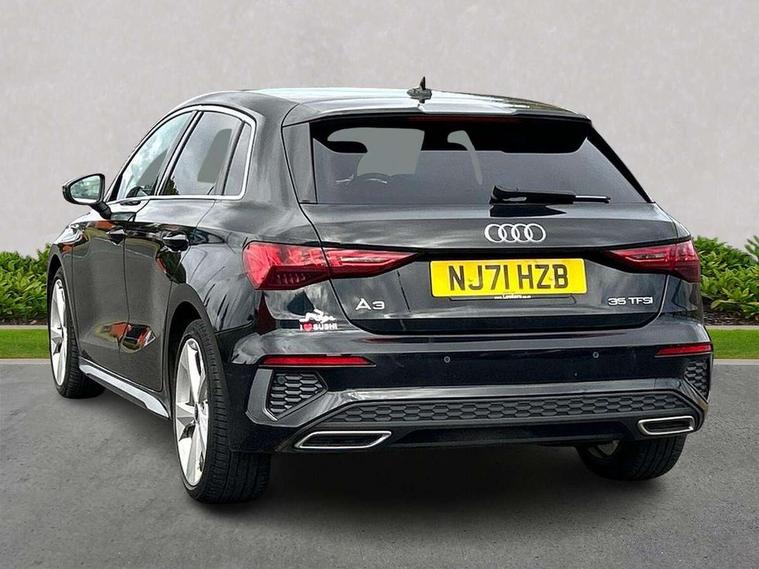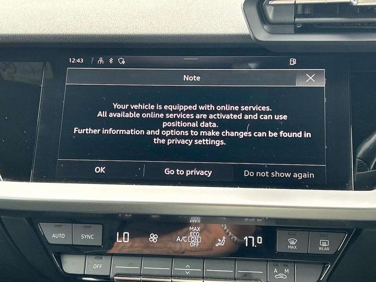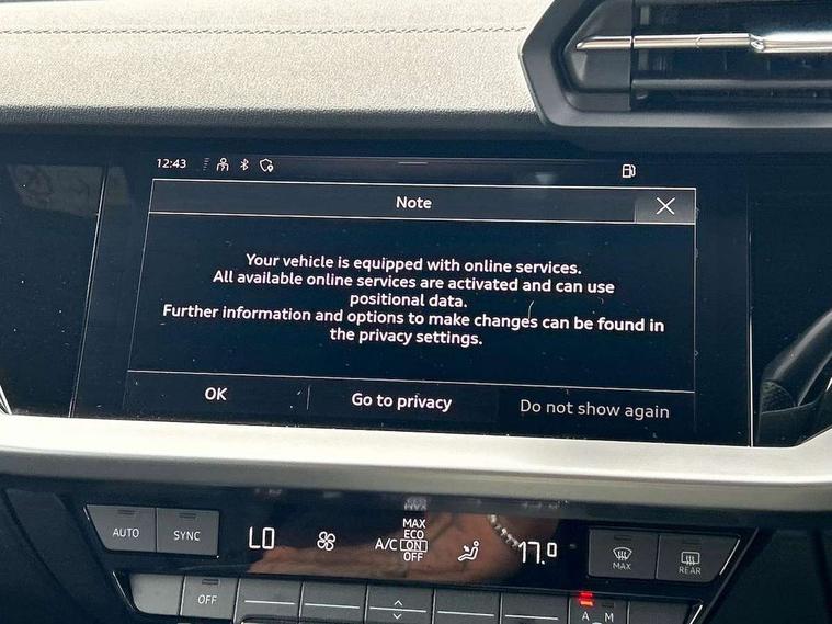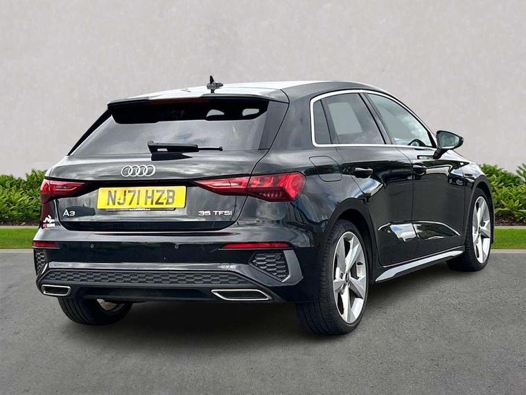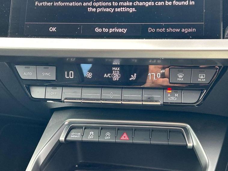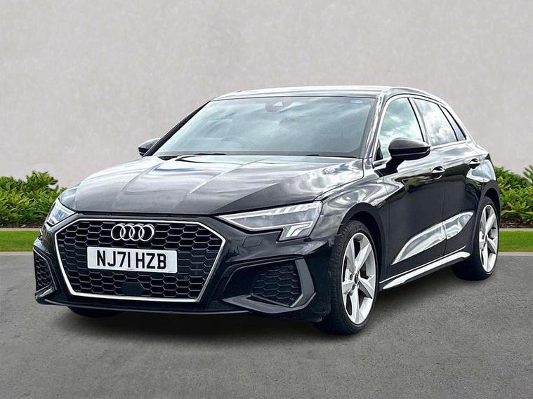 Audi connect emergency call and service, Audi drive select (Auto, Comfort, Dynamic, Efficiency and Individual), Audi smartphone interface, Audi Virtual Cockpit - 10.25" digital and colour instrument cluster, Automatic start/stop system with recuperation, Bluetooth interface, Collision avoidance assistant, Electromechanical power speed sensitive steering, Lane departure warning system, MMI Navigation Plus with high resolution 10.1" colour touch screen display, Service indicator, Trip computer, Voice control system with natural language interaction, 2xUSB-C connection with data and charging functions, 6 passive loudspeakers, DAB Digital radio, 3rd brake light, Acoustic glass windscreen, Aluminium window trim, Auto dimming frameless rear view mirror, Electrically adjustable/heated/folding/auto dimming door mirrors with integrated LED indications + kerb view function for passenger side, Front electric windows, Illuminated aluminium inserts front door sills with S logo, LED daytime running lights, LED headlights with LED rear lights and dynamic rear indicators, Light and rain sensors, Privacy glass - dark tinted rear window, rear door and side windows, Rear electric windows, Rear side air outlets in grained matt black, Rear wiper, S line bumpers, S roof spoiler, 12V socket and storage compartment in front centre console, 40/20/40 split folding rear seat bench with cupholder, Black cloth headlining, Dual zone electronic climate control, Front and rear centre armrest in leather, Front and rear headrests, Front/rear floor mats, Height and reach adjustable steering wheel, Interior lighting - glove compartment light and right hand side, Luggage compartment floor covering, Manual boot compartment lid, Manually adjustable front seats, Seat side bolsters, Stainless steel pedals and front footrest, Twin leather upholstery with front sports seats S embossed logo, Aluminium interior elements pack - A3 Sportback, S line styling pack - A3 Sportback, 3x3 point rear seat belts, Driver and front passenger airbag with passenger airbag deactivation, Electronic Stabilisation Control (ESC) including ABS, ASR and EDL, First aid kit with warning triangle and 2 safety vests, Front side airbags with head airbags and interaction airbag, Hill hold assist, Pre-sense front with pedestrian and cyclist detection, Seatbelt monitoring, Tyre pressure loss indicator, Anti theft alarm, Anti-theft wheel bolts, Electronically operated child lock, Immobiliser, Remote control central locking, Accent surfaces in the dashboard and centre console in platinum grey silk effect paint finish, Dark spectrum aluminium inlays,