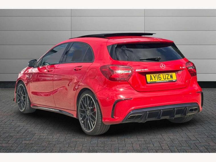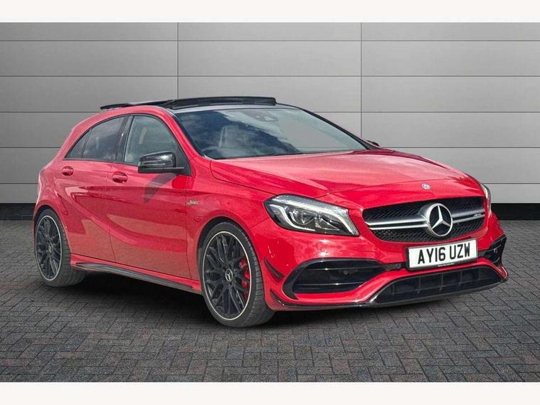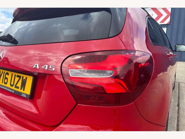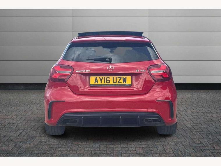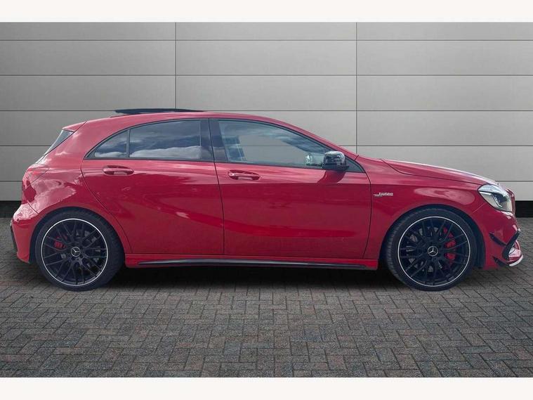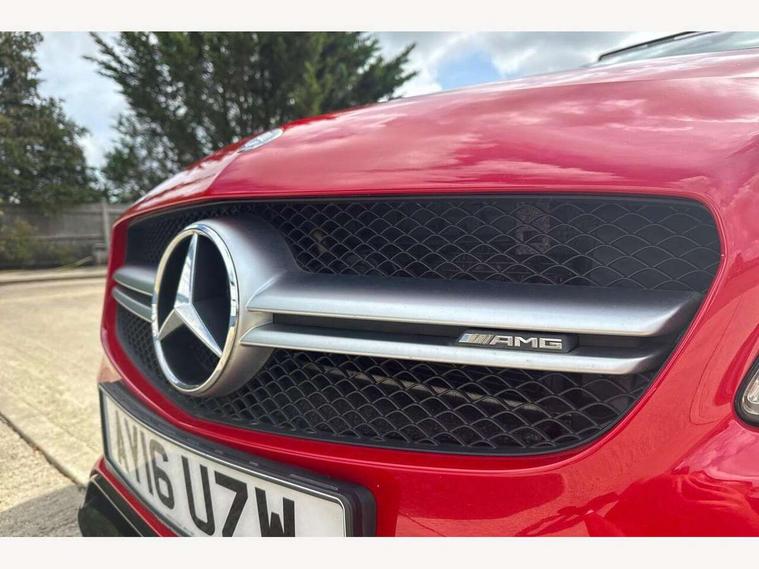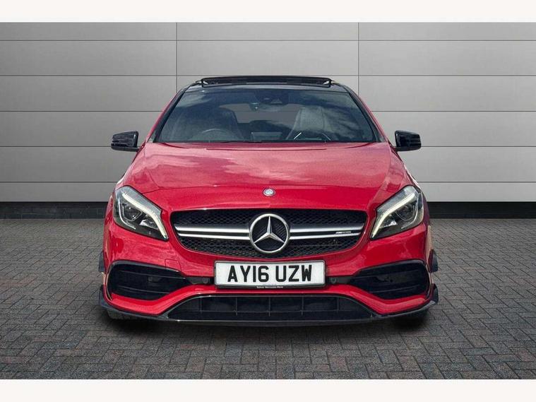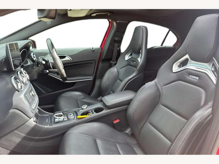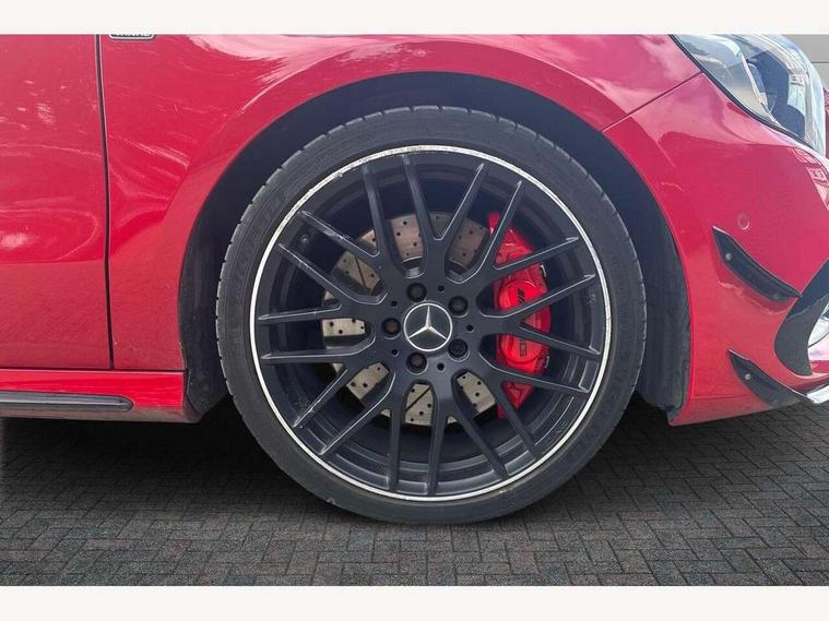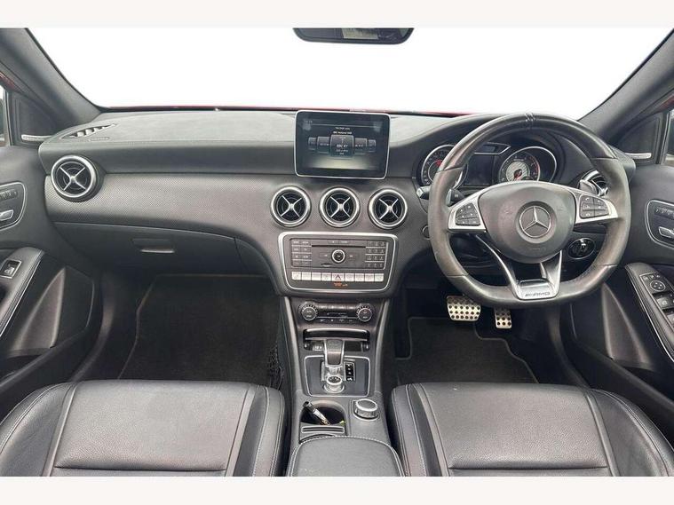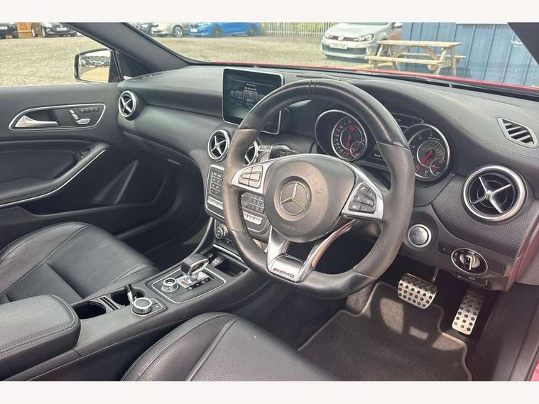 8" colour display screen, Active park assist with parktronic system, AMG instrument cluster, AMG speed sensitive sports steering, Attention assist, Bluetooth interface for hands free telephone, Bulb failure indicator, Collision prevention assist plus, DYNAMIC SELECT with a choice of driving modes (ECO, Comfort, Sport, Sport+ and Individual), External temperature gauge, Low fluid warning light, Reversing camera, Service indicator (ASSYST PLUS), Trip computer, DAB Digital radio, Harman/Kardon logic 7 surround sound system + 12 speakers, USB port, Adaptive brake lights, AMG body styling, AMG front and rear apron, AMG radiator grille in silver chrome with twin louvre, Auto dimming driver's door mirror, Auto dimming rear view mirror, Body colour bumpers, Body colour door handles, Body colour side skirt, Electric adjustable heated door mirrors, Electric folding door mirrors, Electric front windows, Electric rear windows, Front splitter in titanium grey, Headlamp assist, Heated rear window with timer, Heated windscreen wash system, High beam assist, LED daytime running lights, LED Headlights, LED rear lights, Panoramic sliding sunroof, Rain sensor windscreen wipers, Rear wiper, Roof spoiler, 1/3 to 2/3 split folding rear seats, 12 colour Ambient lighting, 12V socket, 4 way adjustable lumbar support, Aluminium gear shift paddles, AMG floor mats with red stitching, AMG illuminated door sills, AMG performance dinamica/nappa leather steering wheel, AMG performance seats, Auto Mercedes-Benz child seat recognition sensor, Black headlining, Brushed stainless steel sports pedals, Dual zone automatic climate control, Electric front seats with memory function, Footwell lights, Front and rear reading lights, Front centre armrest with storage compartment, Front head restraints, Gearshift paddles on steering wheel, Heated front seats, Height adjustable front seats, Height/reach adjustable steering column, Illuminated glovebox, Illuminated storage compartment, Isofix rear child seat preparation, Leather gearshift, Load securing rings in luggage compartment, Luggage compartment cover, Rear head restraints, Red stitching on steering wheel, Sunvisors with illuminated vanity mirrors, Twin front cupholders, Seat comfort pack - A Class, 3 rear 3 point seatbelts, ABS with Brake Assist, Active bonnet, Adaptive brake system, Brake calipers with Mercedes-Benz lettering + perforated brake discs, Child proof door locks, Crash responsive emergency lighting, Drivers knee airbag, Dual stage driver/passenger airbags, Electronic parking brake, ESP with ASR, Front and rear seatbelt reminder, Front head airbags, Front passenger seat occupancy sensor, Front side airbags, Hill start assist, Red painted brake calipers, Tyre pressure monitoring system, Warning triangle and first aid kit, Window airbags, Alarm system/interior protection/immobiliser, Keyless Go access/ignition system, Remote central locking, Black air vent surrounds with red insert, Carbon effect trim, Tirefit sealant with electric air pump,