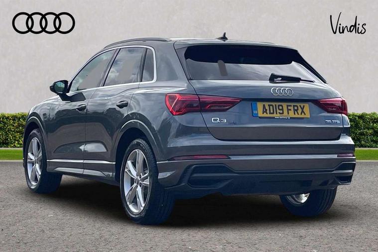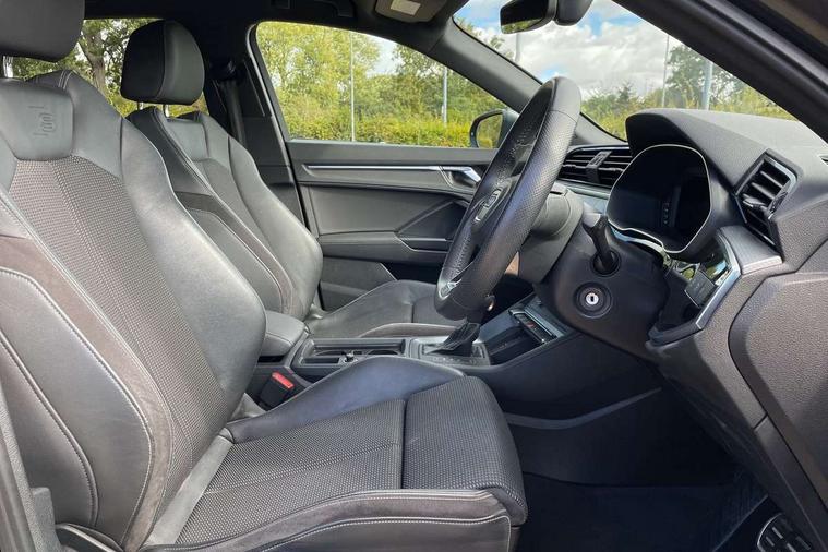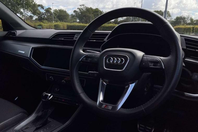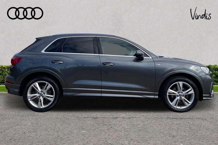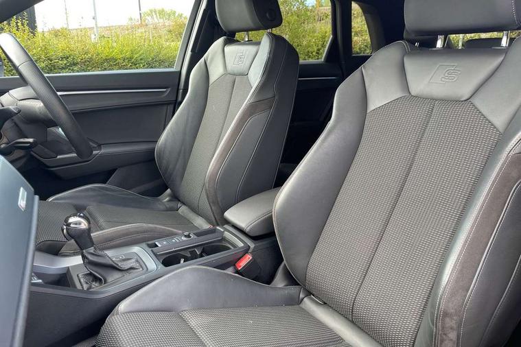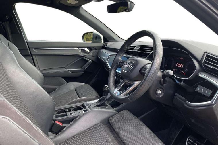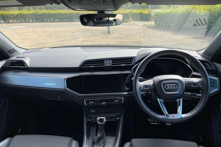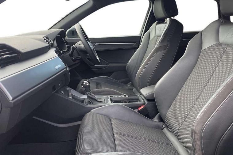 Audi connect safety and service (e-call), Audi drive select, Audi lane departure warning, Audi side assist, Audi smartphone interface, Bluetooth interface, Camera based traffic sign recognition, MMI navigation plus with MMI touch, Power opening/closing tailgate, Progressive steering, Rear parking sensors, Service interval indicator, Stop/start system, Voice control system, Sports suspension, 1 x USB type C and 1 USB type A charging points, 6 speakers, DAB digital radio module, Acoustic windscreen, Aluminium roof rails, Aluminium window trim, Auto dimming rear view mirror, Body coloured bumpers, Diffuser in matt Platinum grey, Electrically adjustable and heated door mirrors with integrated LED side indicators, Front and rear electric windows, Front fog lights, Front side air inlets in matt platinum grey, Front spoiler blade in matt platinum grey, Grille vertical bars in aluminium silver/Matt, High gloss black finish B and C pillars, LED headlights with LED daytime running lights and dynamic rear indicator, LED rear lights, Privacy glass, Rain and light sensors, Rear diffuser strip in matt titanium black, S Line badge on wings, S Line front and rear bumpers, Side skirt insert in matt Platinium grey, Titanium black radiator grille, 12V socket in rear centre console, 40:20:40 split folding rear bench seat, Adjustable rear seat bench/backrest with centre armrest and cupholder, Aluminium door sill trims, Black cloth headlining, Dual zone climate control, Front and rear black floor mats with contrast stitching in rock grey, Front and rear headrests, Front centre armrest with storage compartment and angle adjustment, Illuminated door sill trims with S logo, ISOFIX child seat mounting and Top Tether with front passenger airbag deactivation, Manual front seats with height adjustment, Perforated leather gearknob, Stainless steel luggage compartment sill finisher, Stainless steel pedals, Tool kit, Non smoking pack - Q3, 3x3 point rear seatbelts, 6 airbags - Driver, front passenger, curtain and side windows, Electrically operated child locks on rear doors, Electromechanical parking brake, Electronic stabilisation control including ABS, ASR and EDL, Hill hold assist, Pre sense basic, Seatbelt monitoring, Tyre pressure warning, Warning triangle and first aid kit, Anti theft alarm, Anti theft wheel bolts, Audi pre-sense front with pedestrain and cyclist recognition, Remote central locking, Dark matt brushed aluminium inlay, MMI touch colour display in gloss black with aluminium surround, Tyre repair kit,