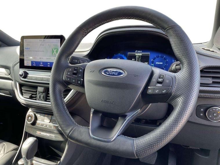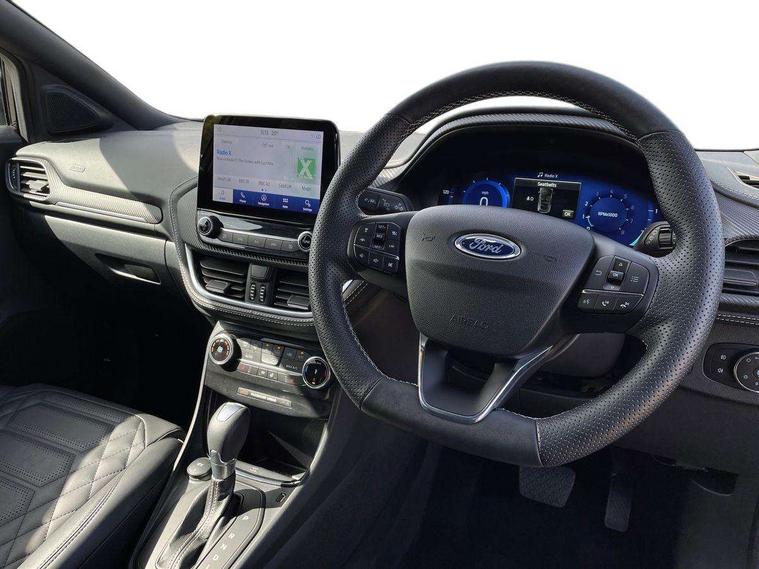 Driver impairment monitor, Emergency call service, Ford easy fuel, Front and rear parking sensors, Full digital 12.3" instrument cluster, Lane keeping aid with lane departure warning, Power assist steering, Selectable drive modes(Normal, sport, Eco, trail, slippery), Speed sign recognition, Sport suspension, Automatic headlights with auto high beam, Automatic rain sensing wipers, Bodyside chrome styling, Fixed LED signature headlamps, Front fog lamps, Gloss black with chrome elements on front and rear bumpers, High chrome waistline, LED daytime running lights, LED rear lamps, Power foldable heated door mirrors with puddle lamps and puma logo protection, Privacy glass to side rear windows and tailgate glass, Quickclear heated windscreen, Rear side wing doors, Rear wiper, Third brake light, Vignale body styling kit with unique grille and large body colour rear spoiler, 3 seat bench in 2nd row, Centre console with armrest and stowage, Ford megabox extended bootspace, Front and rear floor mats, Front and rear head restraints, Manual 4 way driver seat adjust with lumbar adjustment and massage function, Manual 4 way passenger seat adjust with lumbar adjustment and massage function, Premium sensico leather upholstery with metal grey stitching, Premium sensico perforated flat bottomed steering with metal grey stitching, Premium sensico wrapped instrument cluster, Single front passenger seat, Wireless charging pad with electronic air temperature control (EATC), B&O Premium Audio system + Ford SYNC 3 navigation pack - Puma, Winter pack - Puma, 3 rear seatbelts, Child safety lock, Electronic stability control (ESC) and hill start assist, Pedestrian/cyclist detection & post-collision braking, Pre collision assist system, Tyre pressure monitoring system (TPMS), Keyless entry and power start button, Thatcham alarm, Carbon look interior deco spears,