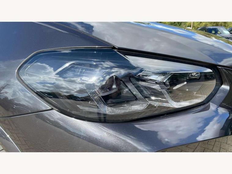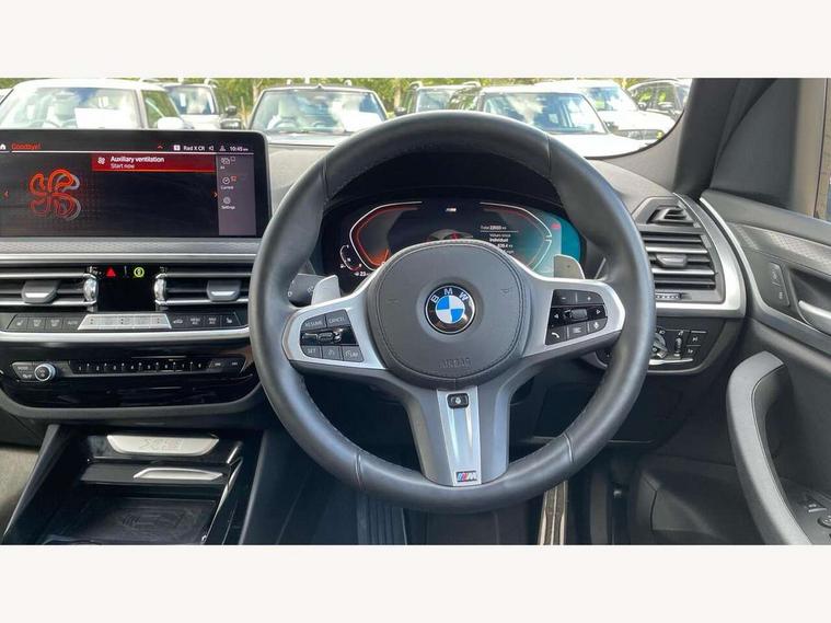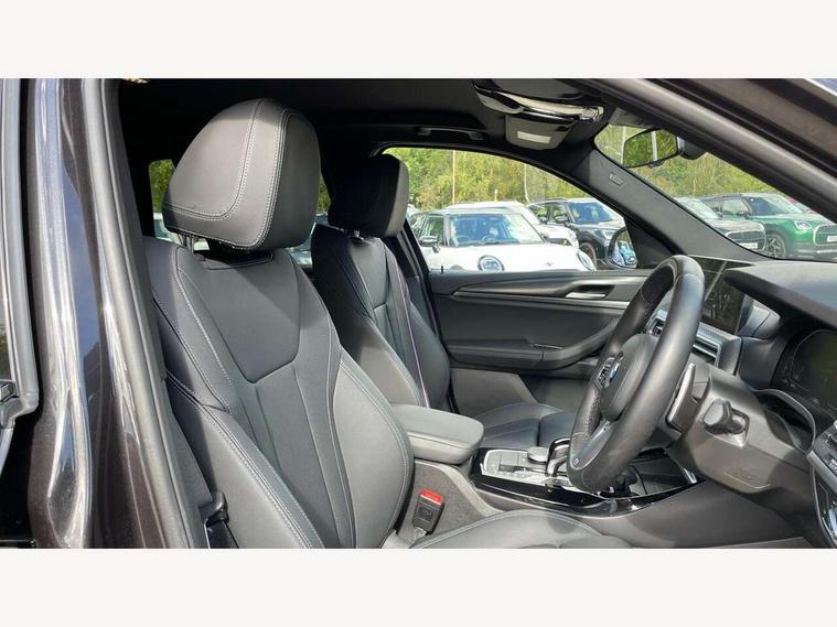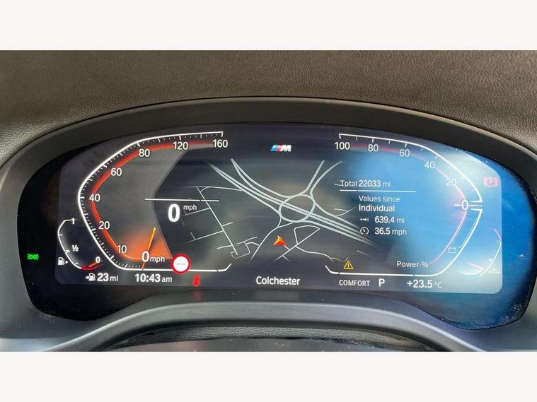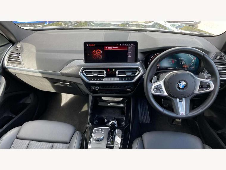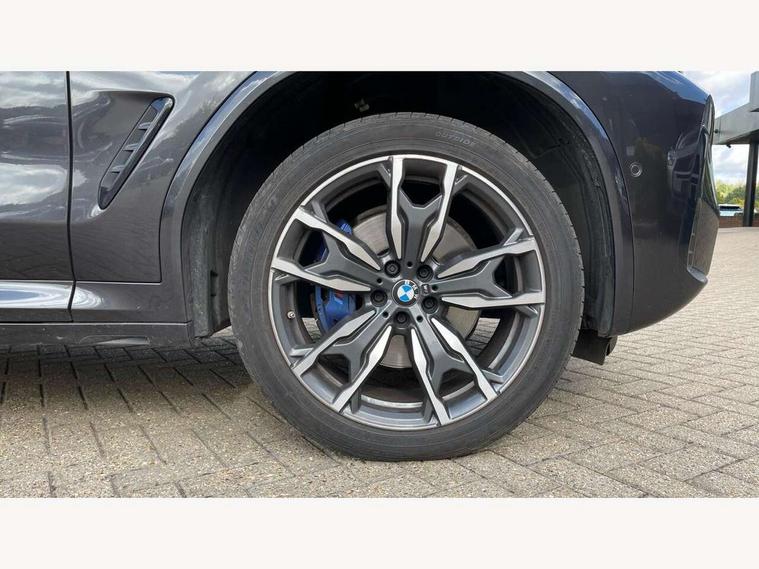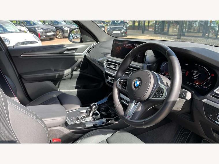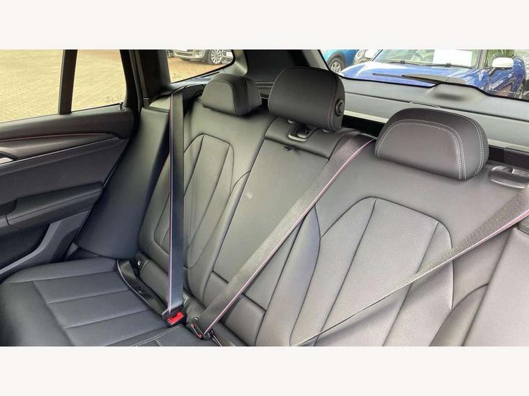 Active Guard, Attentiveness assist, BMW Live Cockpit Professional nav system including 12.3" instrument display + 12.3 high resolution control display, BMW Online services, BMW Teleservices, Brake pad wear indicator in front and rear, Check Control warning system for monitoring of lights and door/luggage compartment open warning, Condition based service - BMW service history, electronic service booklet, integrated owner's handbook, Connected drive services, Electric boot lid, Front/rear Parking distance control, iDrive touch controller with 8 favourite buttons, Instrument cluster with speedometer with mph readout, tachometer, fuel gauge and oil temperature gauge, Lights on warning by audio warning signal when ignition is switched off, Oil sensor for level and grade, warning by check control system, On board computer - average speed+fuel consumption, service interval, clock/date, odometer/trip meter, outside temperature display and ice warning, Optimum shift indicator, Personal Profile - automatic lock when driving away selectable, Run flat indicator, Stop/start system, Variable sports power steering with drive performance control Sport+ mode, Automatic transmission with gearshift paddles, Incorrect fuelling protection, M sport suspension, Multi-link rear suspension, BMW professional radio/CD/MP3, DAB tuner, Acoustic glazing, Automatic windscreen wipers and automatic headlight, Black finish on B pillars, Body colour door handles, Body colour electric adjust heated aspherical door mirrors, Body colour roof mouldings, Body coloured bumpers, Direction indicator, side repeaters, integrated in exterior mirrors, Dynamic brake lights, Exhaust tailpipes - dual, round, split left and right with chrome finisher, Fingertip control / anti-trap function on electric window, Folding wing mirrors with auto dimming, Follow me home headlights, Front and rear bumper system with replaceable deformation elements, Front and rear electric windows, Gloss chrome tailpipes finishers, Green tinted heat insulating glass, Heated windscreen washer jets, High beam assistant, High gloss black shadow line roof rails, High gloss shadowline exterior trim in decorative moulding side frame/recess cover/guide rail/B, C pillars/mirror frame and triangle with mirror base, High level 3rd brake light incorporating LED Technology, Interior rear view electrochromatic mirror with automatic anti dazzle function, LED tail lights, Lightweight engineering, M aerodynamic bodystyling, M Sport entry door sill strips, Model designation, Rain sensor, Rear side wing doors, Rear wing door, Rear wiper, Shark fin antenna, Side exterior M designation badges, Visible VIN plate, Welcome lighting, Windscreen wipers with adjustable interval, 12V power point in luggage area, 12V power socket in front centre console, 2 x USB Type C ports for charging and data transmission (front centre console) and 2 x USB Type C ports for charging (rear centre console), 3 rear headrests, 3 seat bench in 2nd row, 3 zone automatic air conditioning, 4 lashing points to secure luggage, 40:20:40 split folding rear seat with loading system, Ambient lighting, Anthracite headlining, Automatic interior light when door is opened/ignition switched off or via remote key, Floor mats in velour, Foldable storage floor with compartment, Four grab handles integrated in roof lining, Front and rear bottle holders integrated into door trim storage compartments, Front and rear side armrests integrated into door trim, Front centre armrest with storage compartment, Front footwell lights, Front head restraints, Front passenger seat, Front sports seats, Front/rear courtesy lights with soft on/off dimming, Front/rear reading lights, Heated front seats, Isofix rear child seat preparation, Leather gear knob, Lockable glove compartment, Luggage area underfloor compartment, Luggage compartment lighting, M sport leather steering wheel, Multifunction steering wheel, Parcel shelf removeable and storable under boot floor, Reach and rake adjustable steering column, Rear centre armrest with 2 cupholders, Removable / retractable luggage cover, Slope adjustable rear seats, Storage compartment in rear centre console and front/rear door trims, Sun visors with vanity mirrors and ticket pocket, Toolkit located in luggage compartment, Two front cupholders with removable oddments tray/lid, Connected pro pack - X3, ADB - Automatic Differential Brake, Anti-lock braking system (ABS) with brake assist, Automatic Stability Control (ASC), Battery safety cut-off, BMW emergency call, Brake drying, Brake energy regeneration, Braking pre-tensioning, Child locks on rear doors, Cornering brake control (CBC), Crash Sensor - activation of central locking release, hazard warning light and interior lighting, Deactivation of fuel pump in the event of a crash, Driver and front passenger front and side airbags with passenger deactivation and ITS front and rear head airbags, Driver and front passenger knee airbag, DSC+, Dynamic brake control, Dynamic Traction Control - DTC, Electromechanical parking brake, Hill descent control, Hill start assist, Seatbelt security check for front seats, Side impact protection, Three point seatbelts to all seats with front and outer rear pyrotechnic belt tensioners and seat belt force limiters, Two tone horn, Tyre pressure sensor, Ventilated front and rear disc brakes, Warning triangle and first aid kit, Central locking switch for all doors, fuel filler cap and luggage compartment, Electronic engine immobiliser, Locking wheel nuts, Remote control including two integrated key - one button for open/close all lockable content, windows and separate button for open luggage compartment, Remote control Thatcham category 1 alarm, Start/stop button with Comfort Go keyless engine start and auto Start/stop deactivation button, Low rolling resistance tyres,