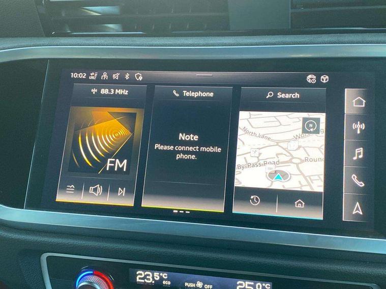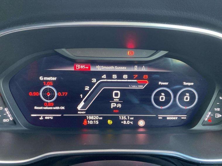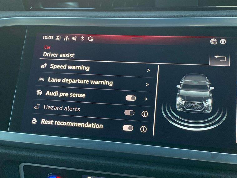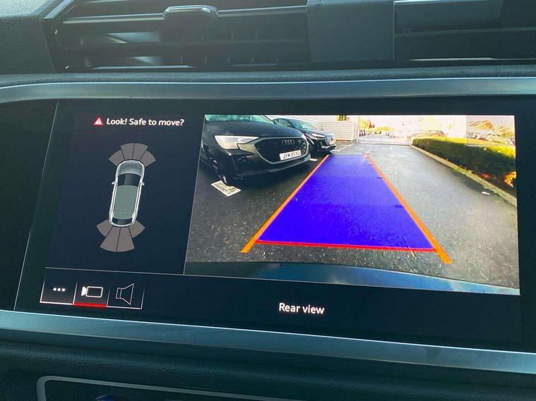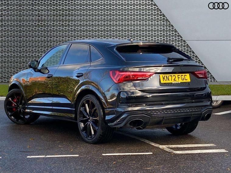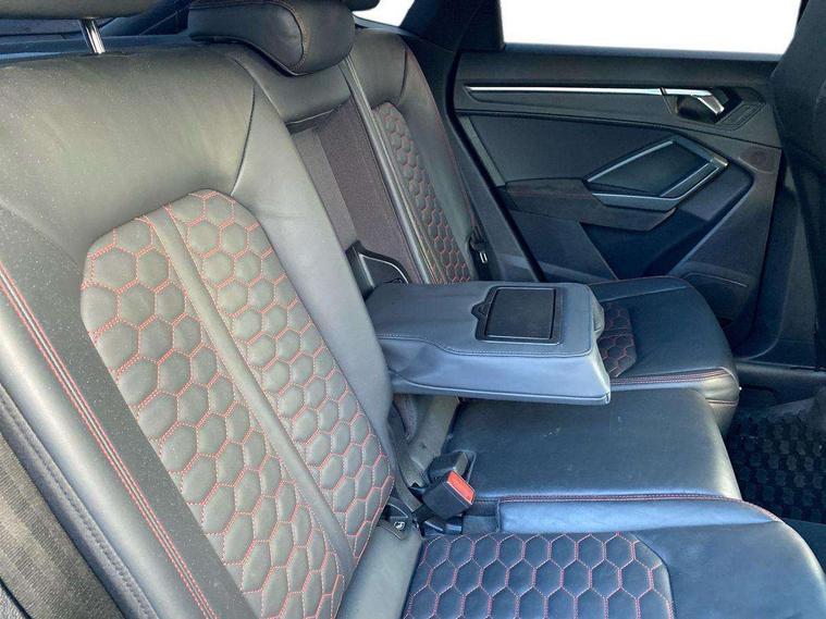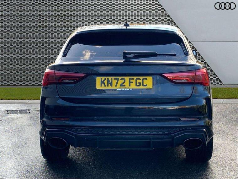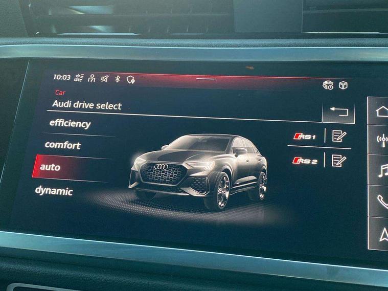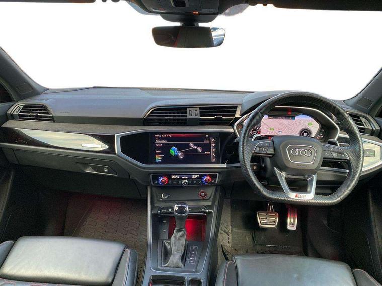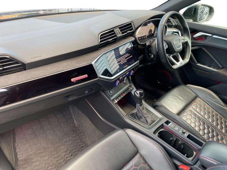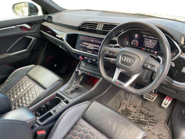 Audi drive select with new RS modes, Audi lane departure warning, Audi parking system plus with front and rear sensors, Audi virtual cockpit plus - 12.3 inch display, Bluetooth interface, Camera based traffic sign recognition, Emergency e-call, MMI Navigation Plus with high resolution 10.1 inch touchscreen colour display, Power operated tailgate, Progressive steering, Smartphone interface includes wireless Apple carplay/Android Auto, Start stop system with recuperation, Voice control system with natural language interaction, Quattro all wheel drive, 2 USB-C ports with charge and data functions, Audi sound system, DAB digital radio module, Acoustic windscreen, Audi Beam uses LEDs to project the Audi Sport logo, Auto dimming frameless rear view mirror, Body colour rear spoiler with lip in gloss black, Electrically folding, adjustable and heated door mirrors with integrated LED side indicators and kerb view function for passenger side, Flared wheel arches, Flat slits on single frame grille, Headlight washers, High gloss black finish B and C pillars, Honeycomb radiator grille in gloss black, Illuminated door sill trims with RS logo, LED headlights with LED daytime running lights and dynamic rear indicator, LED rear lights, LED third brake light, Panoramic glass sunroof, Privacy glass dark tinted rear and rear-side windows (from B-pillar backwards), Rain and light sensors, Rear side wing doors, Rear wiper, RS specific bumpers with large front air inlets in black, RS Sport exhaust system, dual branch with exhaust flap control and gloss black oval tailpipe trims, Tinted rear windows, Variable front intermittent wipers, 3 seat bench in 2nd row, 4 way electric lumbar support for driver and front passenger, Adjustable rear seat bench/backrest with centre armrest and cupholder, Black Alcantara elements - dashboard and the armrests in the front and rear doors, Black cloth headlining, Dual zone electronic climate control, Electrically adjustable front seats, Fine Nappa leather upholstery with front sports seats + honeycomb stitching and RS embossed logo, Front and rear floor mats, Front and rear head restraints, Front centre armrest, Heated front seats, ISOFIX child seat mounting for front passenger with airbag deactivation and outer rear seat including top tether attachment point for outer rear seats, Single front passenger seat, Stainless steel luggage compartment sill finisher, Stainless steel pedals, Ambient lighting pack - RS Q3, Black styling pack - RS Q3, Non smoking pack - RS Q3, 3x3 point rear seatbelts, 6 airbags - Driver, front passenger, curtain and side windows, Audi pre-sense front with pedestrain and cyclist recognition, Electrically operated child locks on rear doors, Electromechanical parking brake, Electronic stabilisation control including ABS, ASR and EDL, Front seatbelt reminder, Hill descent control, Hill hold assist, Pre sense basic, RS brake system, Seatbelt monitoring, Tyre pressure warning, Warning triangle and first aid kit, Advanced key, Anti theft alarm, Anti theft wheel bolts, Immobiliser, Aluminium look interior elements, Detail dashboard around MMI touch colour display in glass look, black with surround in aluminium look, Inlay - Black piano finish, Tool kit, Tyre repair kit,