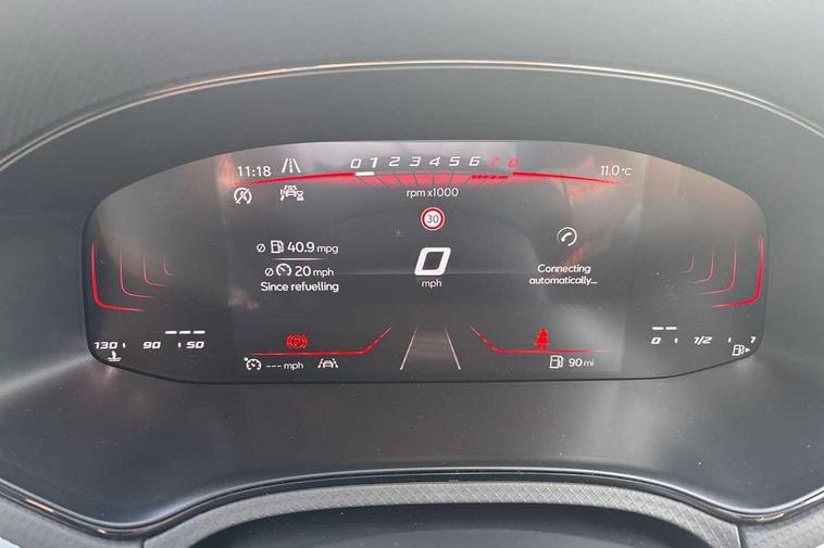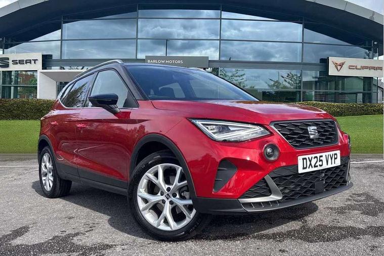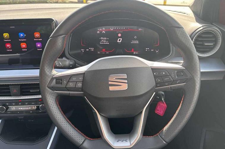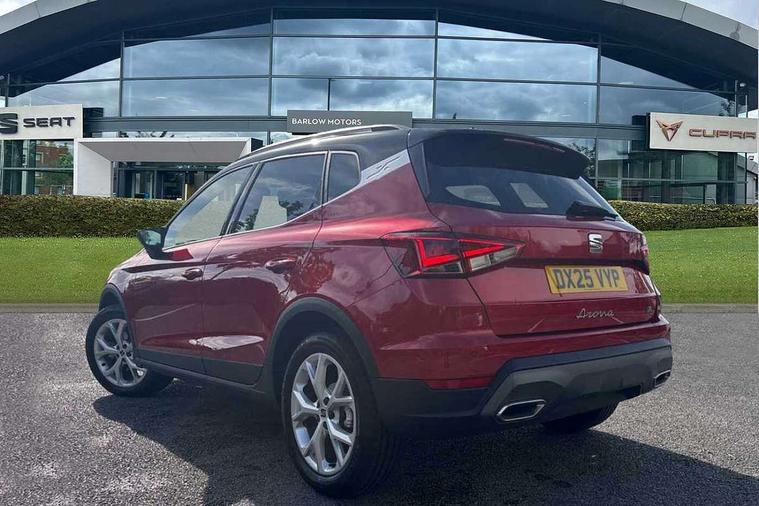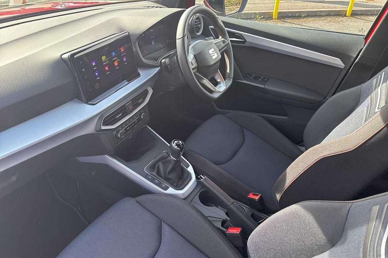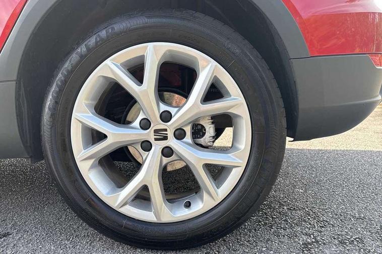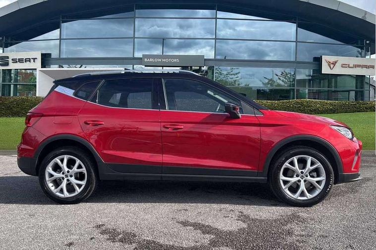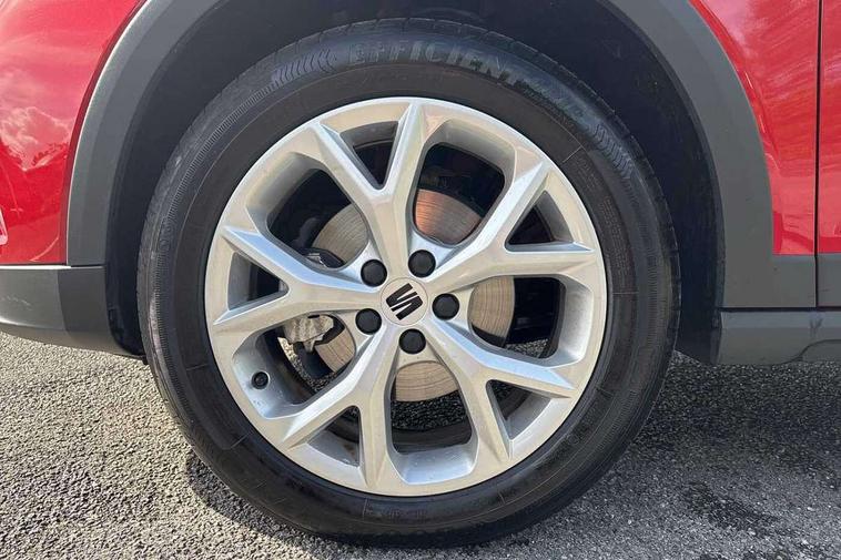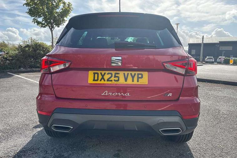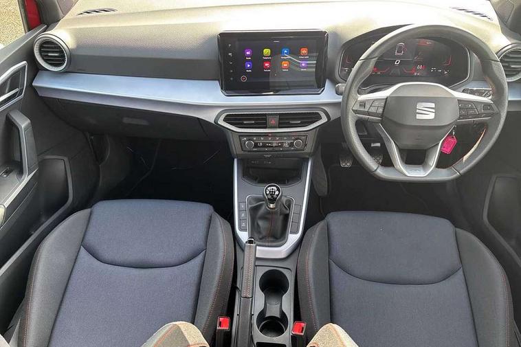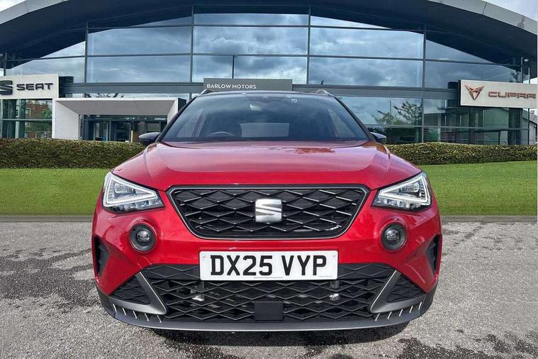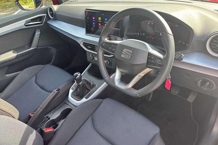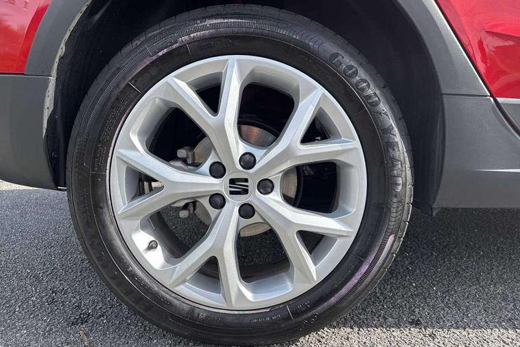 'Lights On' Reminder warning buzzer, 8" Digital cockpit, Digital clock, E-call, Electric speed sensitive power steering, Full link smartphone integration with mirror link, wireless apple carplay, Google android auto + USB Type C cable for apple and android devices, Lane keeping system, Low fuel warning light, Outside temperature display, RPM counter, SEAT Drive profile - Four different models normal-sport-eco-individual, steering response, throttle response, Trip computer, Wireless phone charger, 6 speakers, 9.2" colour touchscreen with navigation system, voice control and USB port (type c), Bluetooth interface for hands free and audio streaming, DAB digital radio and AM/FM radio, Steering wheel mounted audio controls, Anti theft roof antenna, Auto dimming interior rear view mirror, Automatic activation of hazard warning lights, Body coloured bumpers, Body coloured door handle inserts, Chrome roof rails and window surrounds, Dark tinted rear windows, Electric front/rear windows, Electrically adjustable, heated and folding door mirrors, Front fog lights with cornering function and rear fog light, FULL LED automatic headlights with dynamic headlight range control, coming and leaving home, LED daytime running lights, LED rear tail lights and licence plate lights, Protective side mouldings, Rain sensing wipers, Rear side wing doors, Rear spoiler, Rear window wash/wipe, Roof colour door mirrors, Third brake light, Twin exhaust pipe styling hidden exhaust pipe, Visible VIN plate, 2 cupholders, 3 seat bench in 2nd row, 60/40 split folding rear seat, Aircare filter, Black interior roof, Cloth upholstery, Double boot floor, Driver sunvisor with covered mirror + card holder, Dual zone climate control, Front courtesy light with front reading lights, Gear shift indicator, Height adjustable front seats, Height/reach adjustable steering column, Illuminated air vent surrounds, Illuminated boot, Instrument lighting with brightness control, Interior ambient lighting, Interior light in footwell, central console and door panel, ISOFIX points in outer rear seats with top tether anchorage points, Passenger sunvisor with vanity mirror, Perforated flat bottomed leather steering wheel/gear knob/handbrake with red stitching and FR logo, Potentiometer, Single front passenger seat, Two front and three rear height adjustable headrests, Interior chrome pack - Arona, Safe and driving pack (S) - Arona, 3 point seatbelts on all rear seats, ABS, Active front headrests, Child locks on rear doors, Driver and front passenger airbags with front passenger airbag de activation, front side and curtain airbags, Emergency Brake Assist (EBA) and front assist, Front and rear seatbelt reminder, Hill hold control, Multi-Collision braking, Tiredness recognition system, Traction control, Tyre pressure monitoring system, Alarm with back up horn with tow away protection, Deadlock, Electronic engine immobiliser, Locking wheel bolts, Remote central locking, Titan black dashboard, 17" Dynamic alloy wheels,