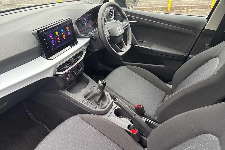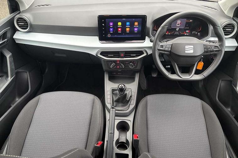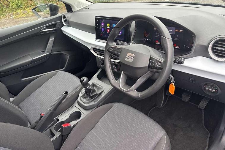 'Lights On' Reminder warning buzzer, 8" Digital cockpit, 9.2" touchscreen navigation system with type C USB socket, Voice control and DAB/AM/FM radio, Auto start and stop system, Bluetooth audio streaming with handsfree system, Cruise control, Digital clock, E-call, Full link smartphone integration with mirror link, wireless apple carplay, Google android auto + USB Type C cable for apple and android devices, Lane assist, Low fuel warning light, Outside temperature gauge, Power Steering, Rear parking sensor, Seat connect plus with safety, service, remote and online, SEAT logo boot release, Speed limiter, Traffic sign recognition, Trip computer, Comfort suspension, 6 speakers, Auxiliary input socket, Radio/MP3 player, SD card slot, Steering wheel mounted controls, Anti theft roof antenna, Body colour bumpers, Body colour door handles, Body colour door mirror caps, Dimming interior rear view mirror, ECO LED automatic headlights and LED daytime running lights, Electric front windows, Electric headlight adjustment, Electrically adjustable door mirrors, Front/rear fog lights, Halogen tailights, Rain sensor, Rear side wing doors, Rear wiper, Third brake light, 3 seat bench in 2nd row, 60/40 split folding rear seat, Air conditioning with dust and pollen filter, Chrome interior detailing and grey headlining, Cloth upholstery, Comfort seats, Front courtesy lights, Front cupholders x 2, Front reading lights, Gear shift indicator, Glovebox, Height adjustable front and rear headrests (five), Height adjustable front seats, Height/reach adjust steering wheel, Illuminated boot, Instrument lighting with brightness control, Isofix, Leather multifunction flat bottomed sports steering wheel, Passenger sunvisor, Single front passenger seat, Sunvisors with mirror and driver side card holder, Safety and driving pack (S) - Ibiza, 3 point seatbelts on all 3 rear seats, ABS, Active front headrests, Child locks on rear doors, Electronic stability control, Energy recovery system, Front assist forward collision warning and autonomous emergency braking, Front driver and passenger side airbags with curtain airbag and front passenger airbag deactivation, Hill hold control, Multi-Collision braking, Seat belt reminder for front and rear seats, Tiredness recognition system, Tyre pressure monitoring system, Electronic engine immobiliser, Locking wheel bolts, Remote central locking + deadlocks, 16" Design machined alloy wheels in Nuclear grey,