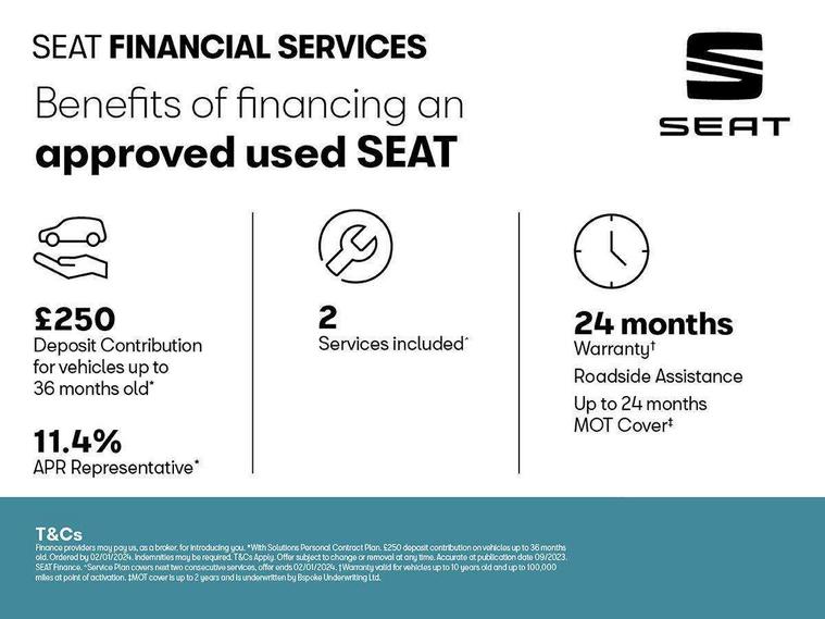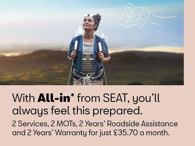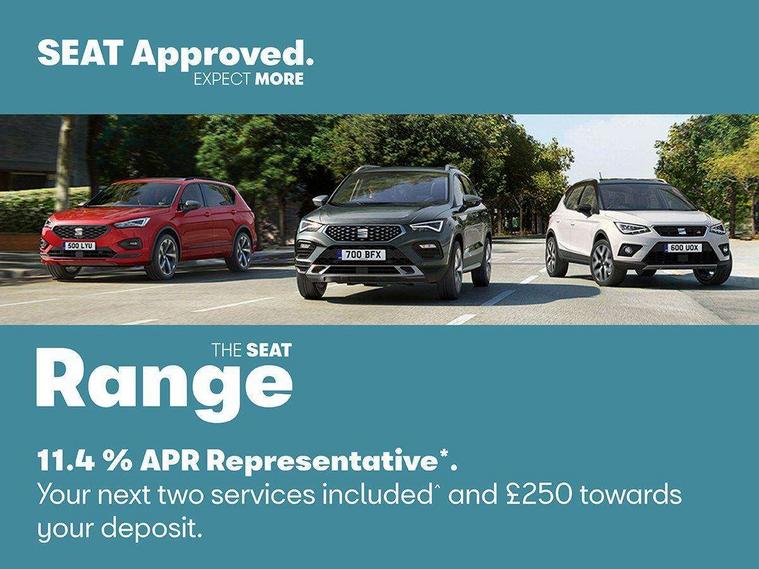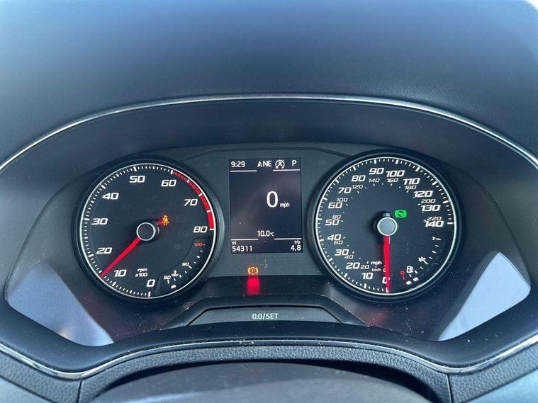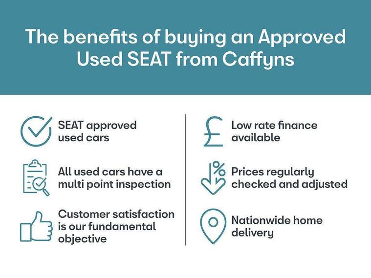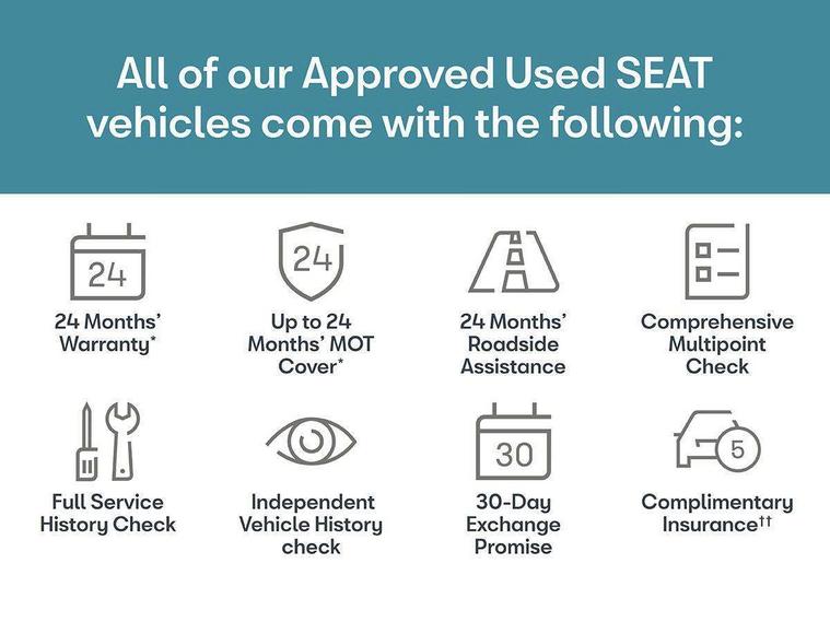 'Lights On' Reminder warning buzzer, Cruise control, Digital clock, Electric speed sensitive power steering, Front assistant collision mitigation, Full Link Smartphone Integration with Mirror Link, Apple Car Play, Google Android Auto, Low fuel warning light, Outside temperature display, Rear parking sensor, RPM counter, Trip computer, Comfort suspension, 6 speakers, Bluetooth interface for hands free and audio streaming, DAB Digital radio, SEAT USB media cable, Steering wheel mounted audio controls, Anti theft roof antenna, Automatic activation of hazard warning lights, Automatic headlights, Black roof rails, Black window surrounds, Body coloured bumpers, Body coloured door handle inserts, Chrome grille surround, Electric adjustable door mirrors, Electric front/rear windows with one touch/auto up/down, Electric headlight adjustment, Front fog lights with static cornering function, Halogen headlights, Hidden exhaust pipe, LED daytime running lights, LED licence plate lighting, LED tail lights, Rear fog lights, Rear window wash/wipe, Visible VIN plate, Windshield wiper with intermittent control and potentiometer, 2 cupholders, 3 rear height adjustable headrests, 60/40 split folding rear seat, Active head restraints, Air conditioning, Ambient interior lighting, Card holder, Cloth upholstery, Double boot floor, Driver and passenger sunvisors, Driver/front passenger seat height adjustment, Dust/pollen filter, Footwell ambient lighting, Front courtesy lights, Front reading light, Gear shift indicator, Height/reach adjustable steering column, Illuminated boot, Instrument lighting with brightness control, Isofix attachments on rear seats, Leather handbrake, Leather steering wheel and gear knob, Connectivity pack plus - Arona, 3 point seatbelts on all rear seats, ABS+EBA, Child locks on rear doors, Driver/Front Passenger airbags, Electronic stability control, Front and rear seatbelt reminder, Front side/curtain airbags, Height adjustable active front headrests, Hill hold control + Tyre Pressure monitor, Multi-Collision braking, Passenger airbag deactivate switch, Tiredness recognition system, Traction control, 2 folding remote keys with window open/close function, Immobiliser, Locking wheel bolts, Remote central locking + deadlocks, Interior chrome line trim, 17" Dynamic alloy wheels,