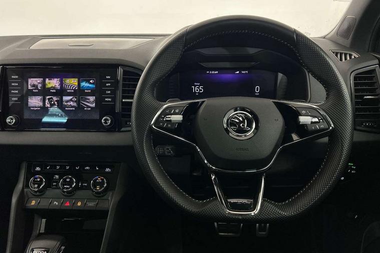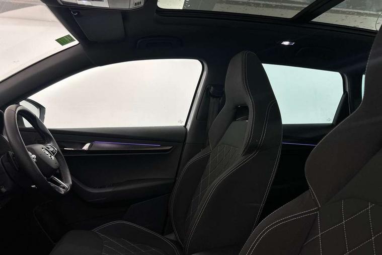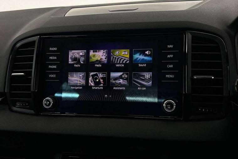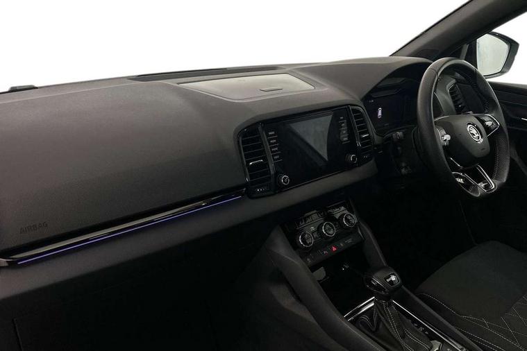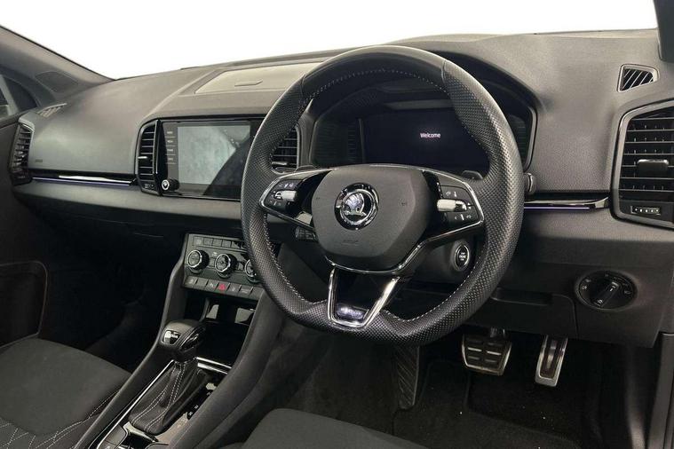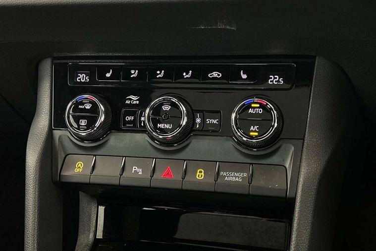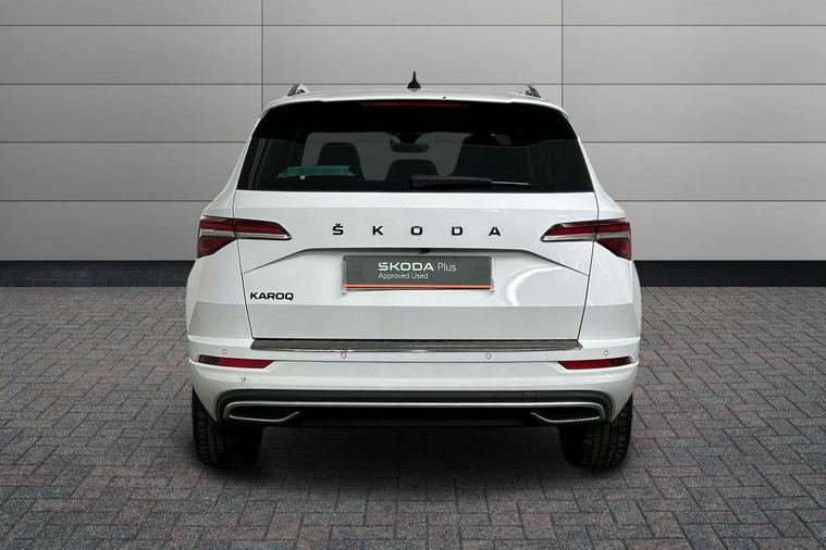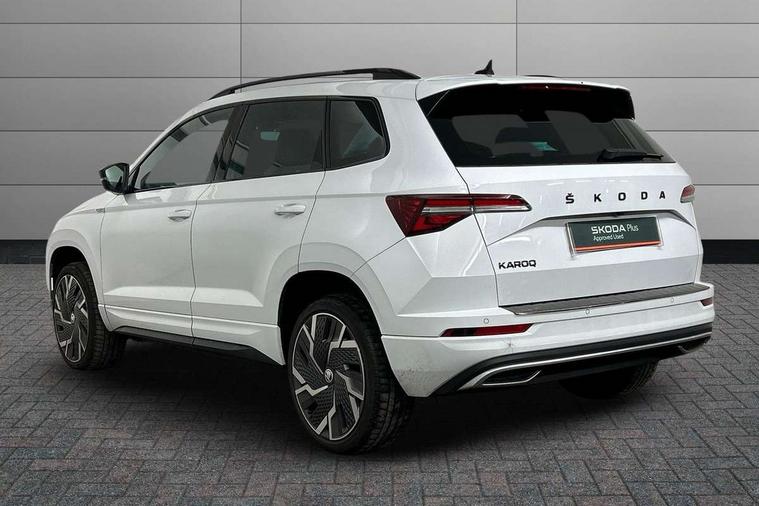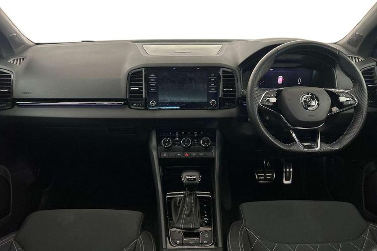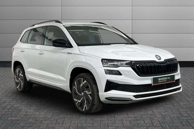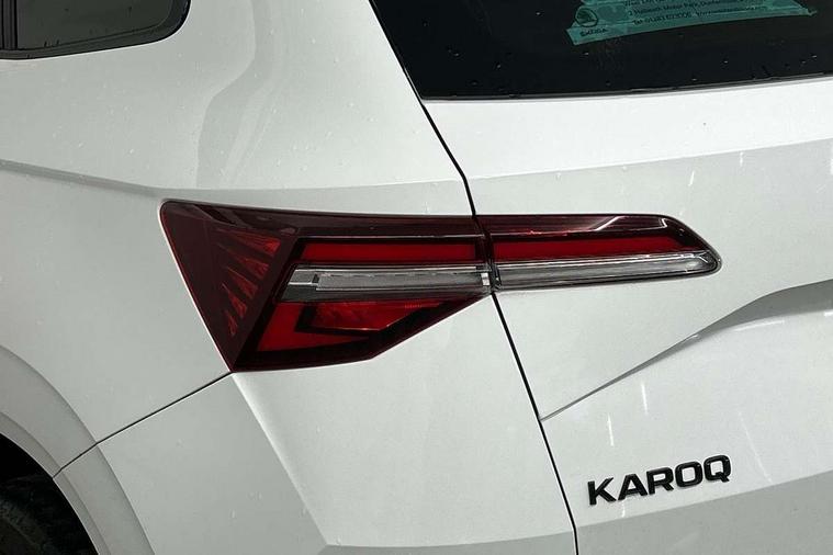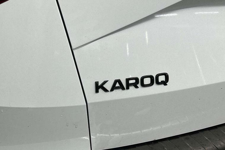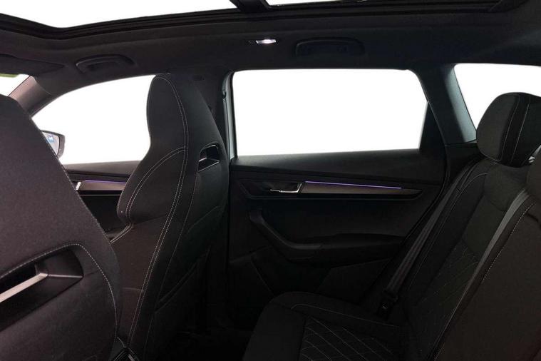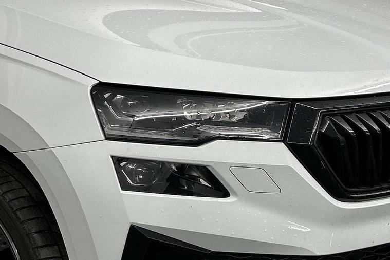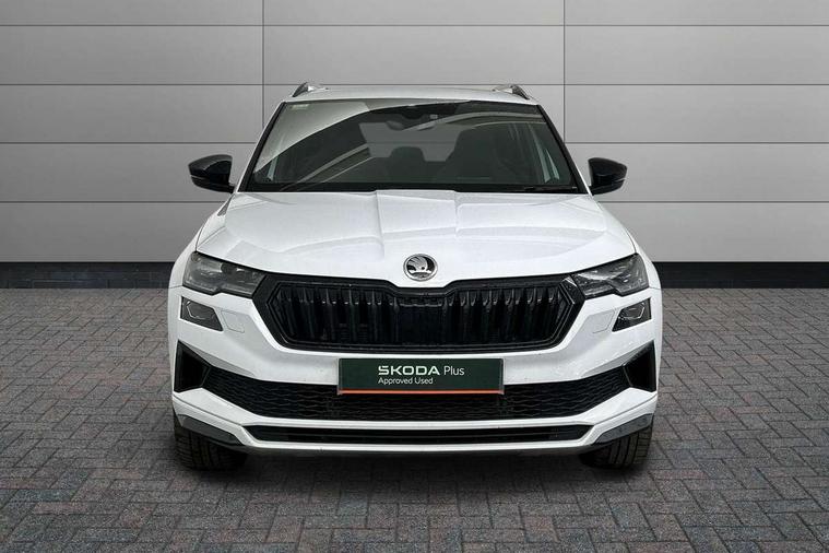 8" Digital display, Care connect, Driver fatigue sensor, Emergency services call system, Outside temperature gauge, Service interval indicator, SmartLink wireless for Apple and wired for Android, Start/stop system with regenerative braking, USB C Port x 2 in front centre console, Virtual pedal with electrically operated boot door, 8 Speakers, DAB radio with Bluetooth, USB connection, Acoustic glass, Aero front windscreen wipers with intermittent function, Auto dimming rear view mirror with light and rain sensors, Black door mirrors, Black electric window control buttons, Black radiator grille, Black roof rails, Body colour door handles, Dynamic headlight range control with cornering light function, Electric front and rear windows with child proof lock, Front door steps with SportLine logo, Heated rear windscreen, LED daytime running lights, LED rear lights with high functionality welcome effect and dynamic indicators, Light assistant (coming/leaving home/tunnel light), Panoramic sliding sunroof, Plastic scuff plates, Privacy glass, Protective door side sills in body colour, Rear diffuser, Rear side wing doors, Rear spoiler, Rear window wiper with washer system and intermittent control, Safety reflectors on front doors, Skoda lettering on tailgate in black, Sportline badge on front fender, Sportline decorative inserts with badging, Sports front and rear bumpers, 1.5 litre bottle holders in driver and front passenger door panels, 12V socket in boot, 12v socket in front centre armrest with storage compartment and rear air vents, 2 Folding hooks and nets in boot, 3 rear height adjustable headrests, 3 seat bench in 2nd row, 3 spoke leather sports multifunction steering wheel and silver stitching with gear shift paddles, 4 foldable roof handles with rear coat hooks, Black floor carpet, Black roof headlining, Chrome inner door handles, Double sided boot floor, Foldable hooks in the boot, Front head restraints, Height adjustable front three point seats belts with tensioners, Height/reach adjust steering wheel, Ice scraper, Illuminated glovebox, Illuminated luggage compartment, Isofix child seat preparation outer rear, Manual lumbar support for front seats, Pen holder, Pollen filter, Rear boot cover, Rear reading lights, Rear seats fixed folding and divided 60:40, Rubbish bin door, Safety vest holder, Single front passenger seat, Storage box in upper central dashboard closed, Sunvisors with illuminated vanity mirrors, Textile floor mats, Ticket holder, Titan black interior ceiling, Welcome animation with sportline logo, Light Pack - Karoq, Parking pack - Karoq, Automatic door unlocking in case of crash, Automatic fuel cut off in case of crash, Child locks on rear doors, Driver airbag, Electronic parking brake with auto hold function, Emergency rear braking signal, ESC including ABS, MSR, ASR, EDS, HBA, DSR, RBS, MKB and traction control, Front side airbags, Hill hold control, Knee airbags, Passenger airbag with switch-off function, Pedestrian monitor, Seatbelt reminder signalisation and pretensioner for all seats, Three point seatbelts rear, Two tone horn, Tyre pressure display, Tyre pressure monitor, Alarm with interior monitoring, back up horn and tilt sensor with safe function, Electronic engine immobiliser, Keyless entry and start/stop, Remote central locking with 2 remote folding keys, Black air vent surround, Black centre console, Satin black dashboard, Satin black door trim, 19" Vega black polished alloy wheels, Anti-theft wheel bolts protection, Matt black aero hub caps, Storage on wheel cover, Tool kit,