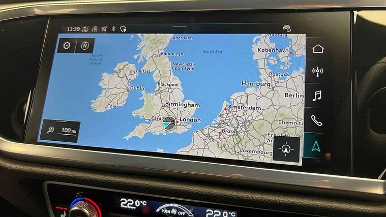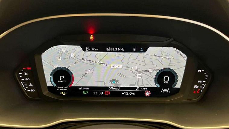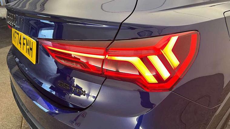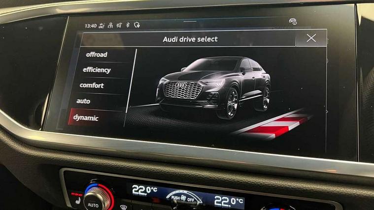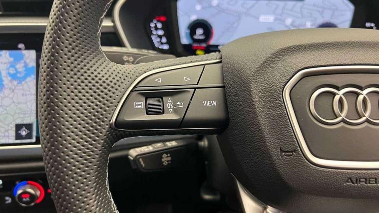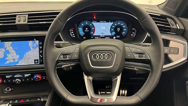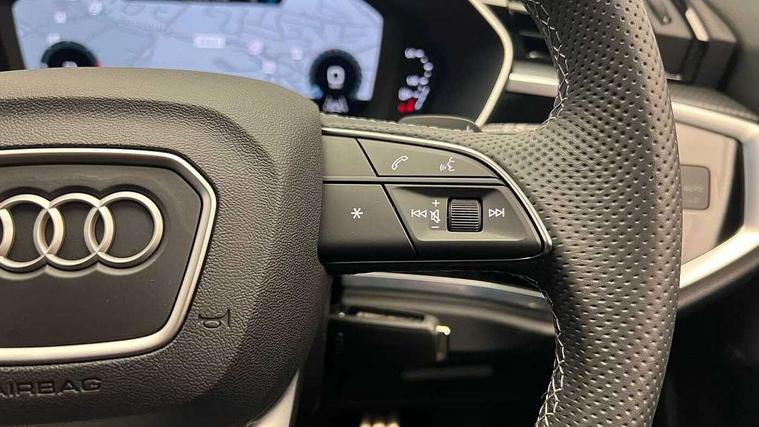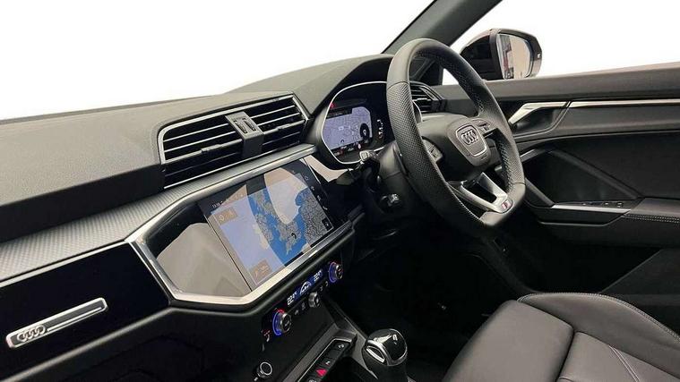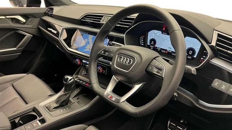 Audi connect safety and service, Audi drive select, Audi lane departure warning, Audi Virtual Cockpit - 10.25" display, Bluetooth interface, Camera based traffic sign recognition, Distraction and Fatigue warning, Legal emergency call, MMI Navigation Plus with high resolution 10.1 inch touchscreen colour display, Power operated tailgate, Progressive steering, Service interval indicator, Smartphone interface includes wireless Apple carplay/Android Auto, Start stop system with recuperation, Voice control system with natural language interaction, Diesel particulate filter, Sports suspension, 2 USB-C ports with charge and data functions, 6 passive loudspeakers, DAB digital radio module, Acoustic windscreen, Audi Beam uses LEDs to project the Audi logo onto the ground as you exit your Q3, Auto dimming door mirrors, Auto dimming frameless rear view mirror, Diffuser grille in grained matt black, Diffuser trim in selenite silver, Electrically folding, adjustable and heated door mirrors with integrated LED side indicators and kerb view function for passenger side, Front and rear electric windows, Front fog lights, Front underbody protection in manhattan grey paint finish, High gloss black finish B and C pillars, LED Dynamic rear indicators, LED headlights with LED daytime running lights, LED rear lights, LED third brake light, Privacy glass dark tinted rear and rear-side windows (from B-pillar backwards), Rain and light sensors, Rear side wing doors, Rear underbody protection in matt black, Rear wiper, S line front and rear bumpers and side skirts in contrasting Manhattan grey paint finish, Variable front intermittent wipers, 12V socket in rear centre console, 3 seat bench in 2nd row, 40:20:40 folding with manual adjustment for 60:40 forwards/backwards position and backrest angle, Adjustable rear seat bench/backrest with centre armrest and cupholder, Black cloth headlining, Dual zone electronic climate control, Electric lumbar support, Front and rear black floor mats with contrast stitching, Front and rear headrests, Front centre armrest, Height and reach adjustable steering wheel, Illuminated door sill trims with S logo, ISOFIX child seat mounting for front passenger with airbag deactivation and outer rear seat including top tether attachment point for outer rear seats, Luggage compartment sill protection in stainless steel, Manual front seats with height adjustment, Perforated leather gearknob, Single front passenger seat, Stainless steel pedals, Twin leather upholstery with front sport seats + S embossing, Black styling pack - Q3, Non smoking pack - Q3, 3x3 point rear seatbelts, 6 airbags - Driver, front passenger, curtain and side windows, Audi pre-sense front with pedestrain and cyclist recognition, Electrically operated child locks on rear doors, Electromechanical parking brake, Electronic stabilisation control including ABS, ASR and EDL, Front seatbelt reminder, Hill descent control, Hill hold assist, Pre sense basic, Seatbelt monitoring, Tyre pressure warning, Warning triangle and first aid kit, Anti theft alarm, Anti theft wheel bolts, Immobiliser, Remote central locking, Aluminium look interior elements, Detail dashboard around MMI touch colour display in glass look, black with surround in aluminium look, Leatherette door armrest, Piano black inlay,