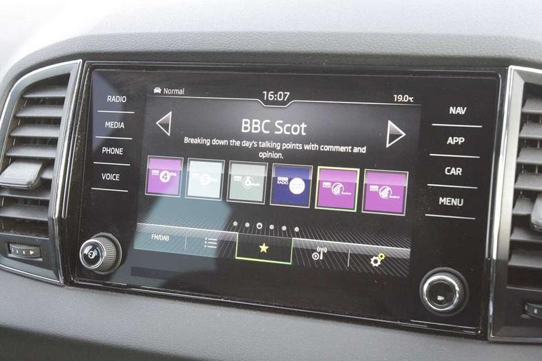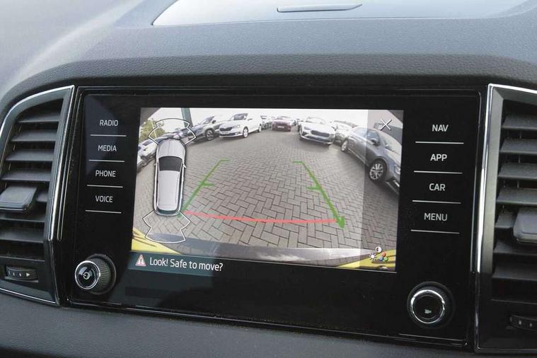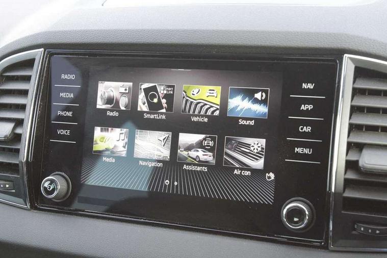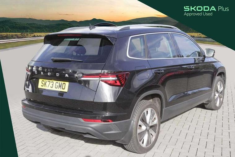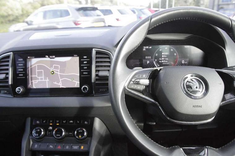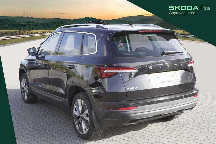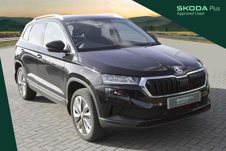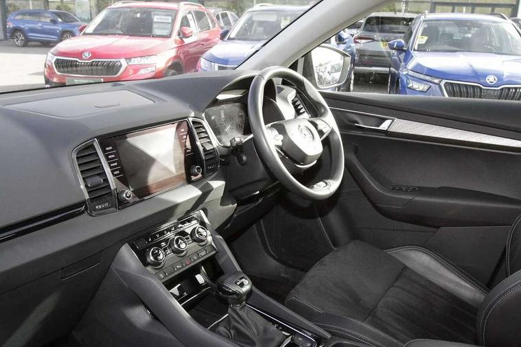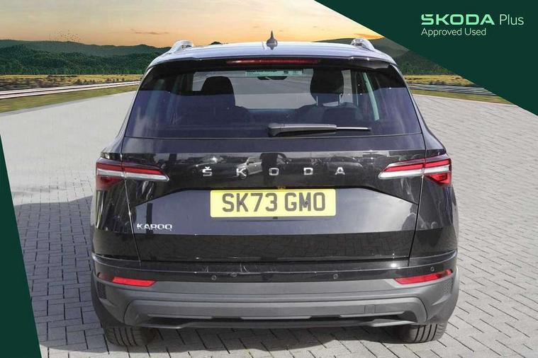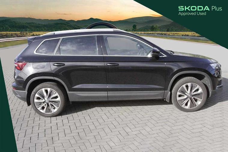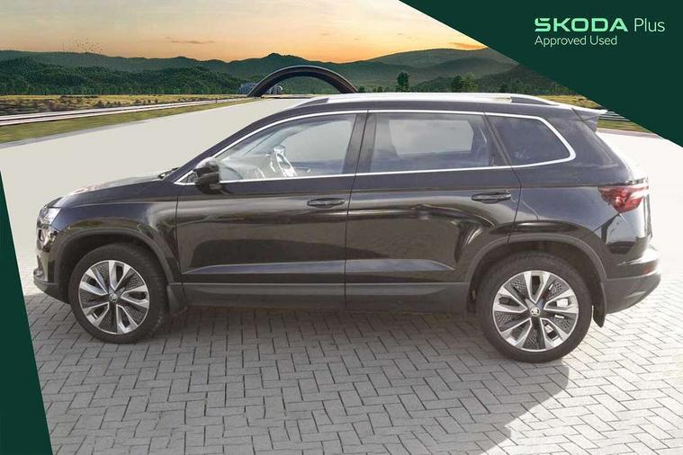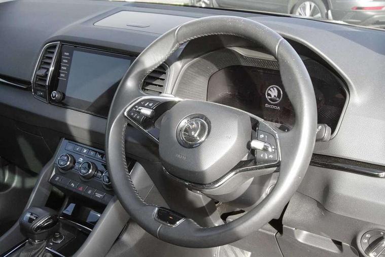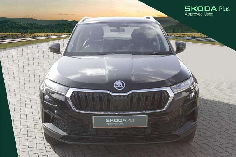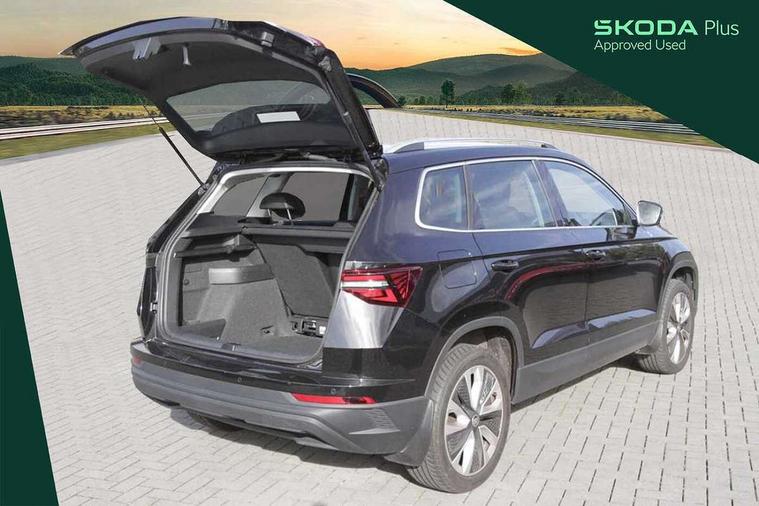 8" Digital display, Care connect, Driver fatigue sensor, Emergency services call system, Outside temperature gauge, Service interval indicator, SmartLink wireless for Apple and wired for Android, Start/stop system with regenerative braking, USB C Port x 2 in front centre console, 8 Speakers, DAB radio with Bluetooth, USB connection, Acoustic glass, Aero front windscreen wipers with intermittent function, Auto dimming rear view mirror with light and rain sensors, Black electric window control buttons, Body colour door mirrors and handles, Dynamic headlight range control with cornering light function, Electric front and rear windows with child proof lock, Heated rear windscreen, LED daytime running lights, LED rear lights with high functionality welcome effect and dynamic indicators, Light assistant (coming/leaving home/tunnel light), Plastic scuff plates, Privacy glass, Rear side wing doors, Rear spoiler, Rear window wiper with washer system and intermittent control, Safety reflectors on front doors, 1.5 litre bottle holders in driver and front passenger door panels, 12V socket in boot, 12v socket in front centre armrest with storage compartment and rear air vents, 2 spoke leather heated multifunction steering wheel with DSG paddles, 2 x Tablet holder, 3 rear height adjustable headrests, 3 seat bench in 2nd row, 4 foldable roof handles with rear coat hooks, Black floor carpet, Chrome inner door handles, Double sided boot floor, Foldable hooks in the boot, Front head restraints, Height adjustable front three point seats belts with tensioners, Height/reach adjust steering wheel, Ice scraper, Illuminated glovebox, Illuminated luggage compartment, Isofix child seat preparation for front passenger seat, Isofix child seat preparation outer rear, Manual lumbar support for front seats, Pen holder, Pollen filter, Rear boot cover, Rear reading lights, Rubbish bin door, Safety vest holder, Single front passenger seat, Storage box in upper central dashboard closed, Sunvisors with illuminated vanity mirrors, Textile floor mats, Ticket holder, VarioFlex seats with standard rear seat release, Boot pack - Karoq, Design Pack - Karoq, Parking pack - Karoq, Automatic door unlocking in case of crash, Automatic fuel cut off in case of crash, Child locks on rear doors, Driver airbag, Electronic parking brake with auto hold function, Emergency rear braking signal, ESC including ABS, MSR, ASR, EDS, HBA, DSR, RBS, MKB and traction control, Front side airbags, Hill hold control, Knee airbags, Passenger airbag with switch-off function, Pedestrian monitor, Seatbelt reminder signalisation and pretensioner for all seats, Three point seatbelts rear, Two tone horn, Tyre pressure display, Tyre pressure monitor, Alarm with interior monitoring, back up horn and tilt sensor with safe function, Electronic engine immobiliser, Keyless entry and start/stop, Remote central locking with 2 remote folding keys, Chrome framed air vents, 18" Miran alloy wheels in black, Anti-theft wheel bolts protection, Tool kit,