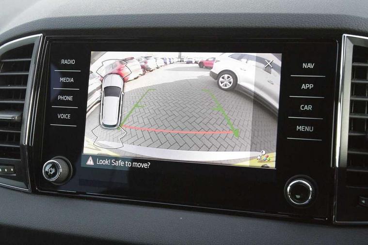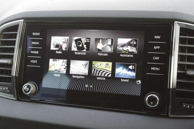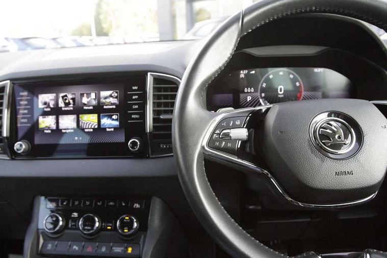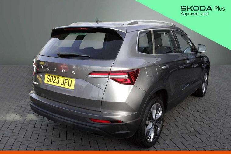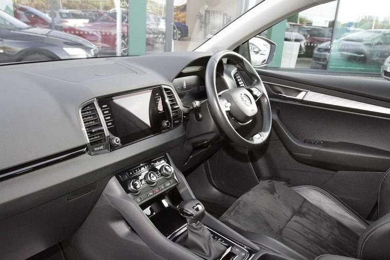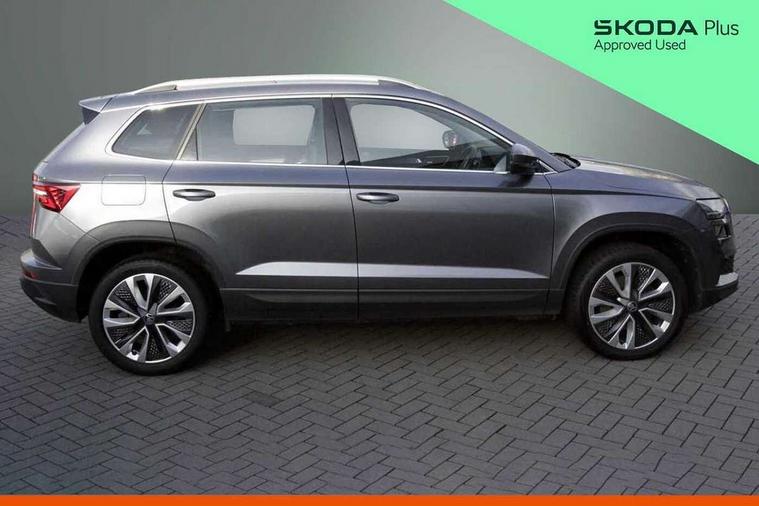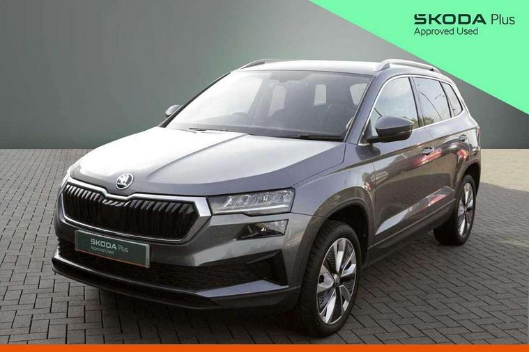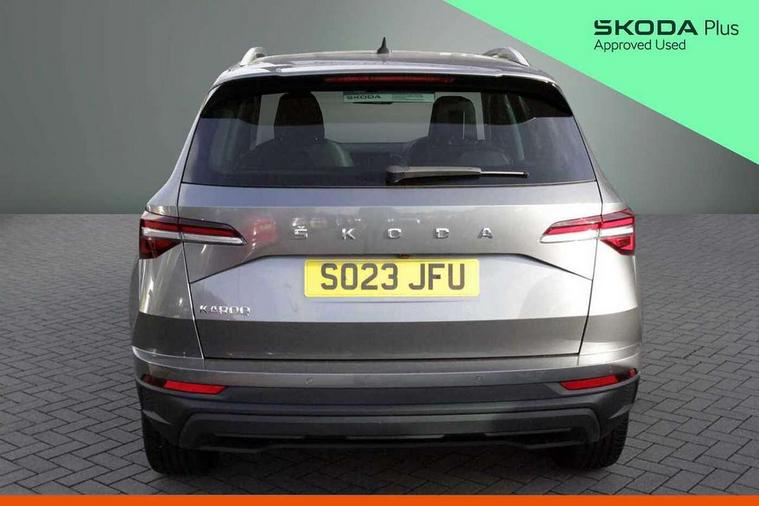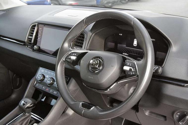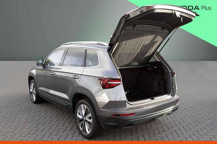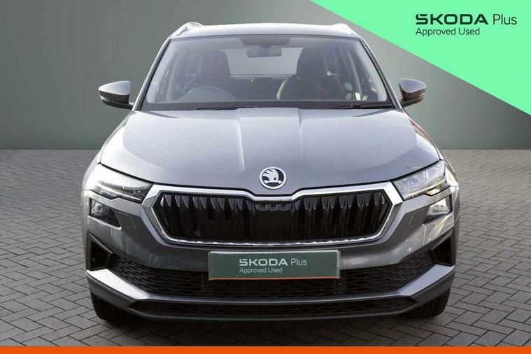 8" Digital display, Care connect, Driver fatigue sensor, Emergency services call system, Outside temperature gauge, Service interval indicator, SmartLink wireless for Apple and wired for Android, Start/stop system with regenerative braking, USB C Port x 2 in front centre console, 8 Speakers, DAB radio with Bluetooth, USB connection, Acoustic glass, Aero front windscreen wipers with intermittent function, Auto dimming rear view mirror with light and rain sensors, Black electric window control buttons, Body colour door mirrors and handles, Dynamic headlight range control with cornering light function, Electric front and rear windows with child proof lock, Heated rear windscreen, LED daytime running lights, LED rear lights with high functionality welcome effect and dynamic indicators, Light assistant (coming/leaving home/tunnel light), Plastic scuff plates, Privacy glass, Rear side wing doors, Rear spoiler, Rear window wiper with washer system and intermittent control, Safety reflectors on front doors, 1.5 litre bottle holders in driver and front passenger door panels, 12V socket in boot, 12v socket in front centre armrest with storage compartment and rear air vents, 2 spoke leather heated multifunction steering wheel with DSG paddles, 2 x Tablet holder, 3 rear height adjustable headrests, 3 seat bench in 2nd row, 4 foldable roof handles with rear coat hooks, Black floor carpet, Chrome inner door handles, Decorative door sills with KAROQ badging, Double sided boot floor, Foldable hooks in the boot, Front head restraints, Height adjustable front three point seats belts with tensioners, Height/reach adjust steering wheel, Ice scraper, Illuminated glovebox, Illuminated luggage compartment, Isofix child seat preparation for front passenger seat, Isofix child seat preparation outer rear, Manual lumbar support for front seats, Pen holder, Pollen filter, Rear boot cover, Rear reading lights, Rubbish bin door, Safety vest holder, Single front passenger seat, Storage box in upper central dashboard closed, Sunvisors with illuminated vanity mirrors, Textile floor mats, Ticket holder, VarioFlex seats with standard rear seat release, Boot pack - Karoq, Chrome roof rails + chrome pack - Karoq, Parking pack - Karoq, Automatic door unlocking in case of crash, Automatic fuel cut off in case of crash, Child locks on rear doors, Driver airbag, Electronic parking brake with auto hold function, Emergency rear braking signal, ESC including ABS, MSR, ASR, EDS, HBA, DSR, RBS, MKB and traction control, Front side airbags, Hill hold control, Knee airbags, Passenger airbag with switch-off function, Pedestrian monitor, Seatbelt reminder signalisation and pretensioner for all seats, Three point seatbelts rear, Two tone horn, Tyre pressure display, Tyre pressure monitor, Alarm with interior monitoring, back up horn and tilt sensor with safe function, Electronic engine immobiliser, Keyless entry and start/stop, Remote central locking with 2 remote folding keys, Chrome framed air vents, 18" Miran alloy wheels in black, Anti-theft wheel bolts protection, Storage on wheel cover, Tool kit,