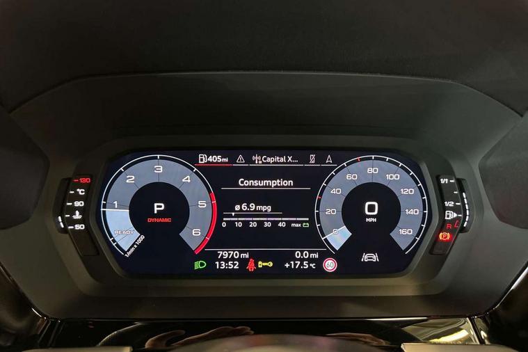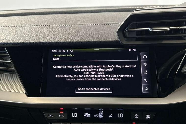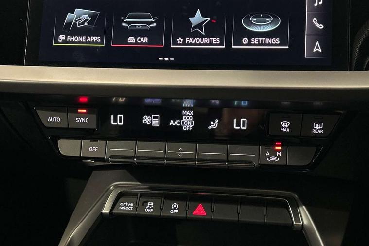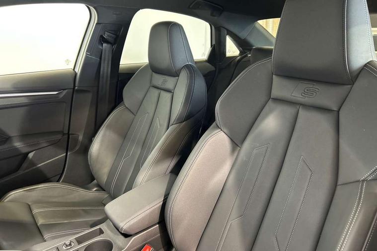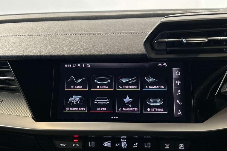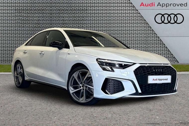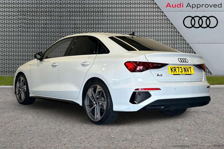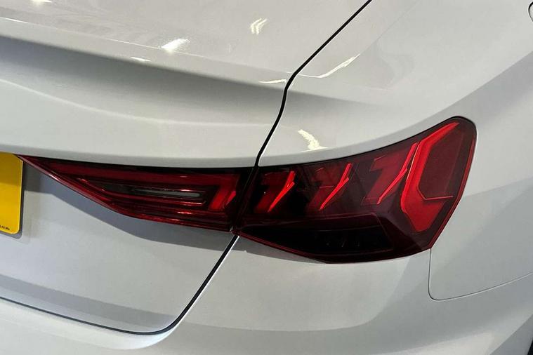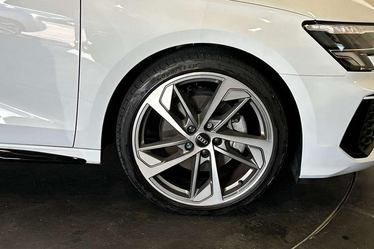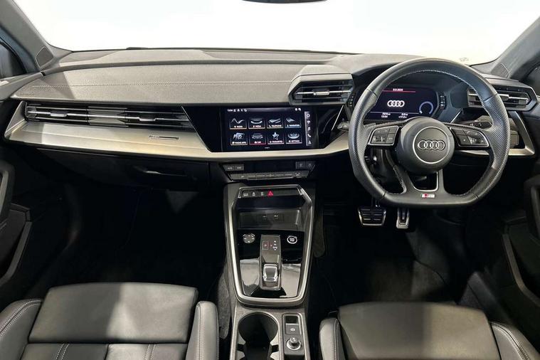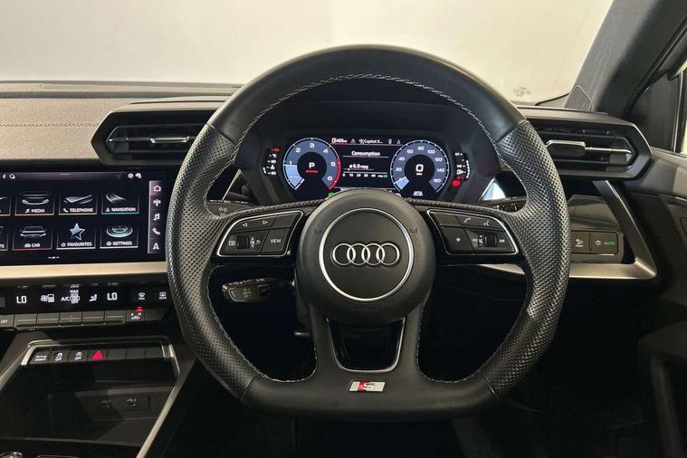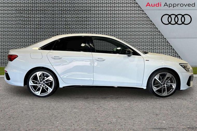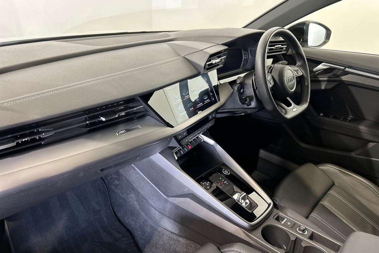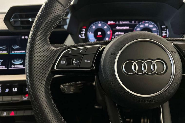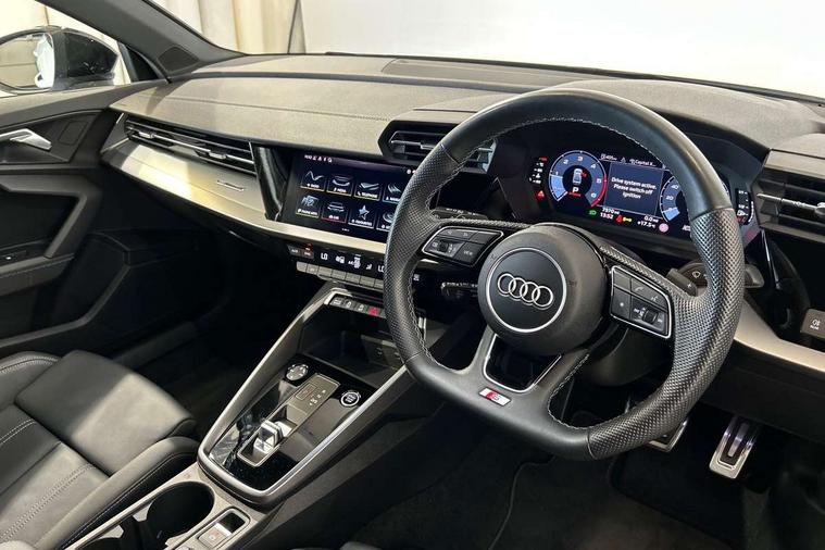 Audi drive select (Auto, Comfort, Dynamic, Efficiency and Individual), Audi smartphone interface, Audi Virtual Cockpit - 10.25" digital and colour instrument cluster, Automatic start/stop system with recuperation, Bluetooth interface, Camera based traffic sign recognition, Collision avoidance assistant, e-Call (emergency call), Electromechanical power speed sensitive steering, Lane departure warning system, MMI Navigation Plus with high resolution 10.1" colour touch screen display, Service indicator, Trip computer, Voice control system with natural language interaction, Diesel particulate filter, Sports suspension, 2xUSB-C connection with data and charging functions, 6 passive loudspeakers, CD player, DAB Digital radio, 3rd brake light, Acoustic glass windscreen, Audi beam uses LEDs to project the Audi logo onto the ground as you exit your A3, Auto dimming frameless rear view mirror, Electrically adjustable/heated/folding/dimming door mirrors with kerb view includes integrated LED indications + kerb view function for passenger side, Front electric windows, Illuminated door sills with aluminium inserts at the front with S logo, LED daytime running lights, LED headlights with LED rear lights and dynamic rear indicators, Light and rain sensors, Model and engine designation badges at rear, Privacy glass - dark tinted rear window, rear door and side windows, Rear boot, Rear electric windows, Rear side wing doors, S roof spoiler, 12V socket and storage compartment in front centre console, 3 seat bench in 2nd row, 3 spoke flat bottomed leather multifunction sport steering wheel with gear shift paddles, 4 way electrically adjustable lumbar support for driver and front passenger, 60/40 split folding rear seat bench, Black cloth headlining, Dual zone electronic climate control, Front and rear centre armrest in artificial leather, Front and rear headrests, Front/rear floor mats, Height and reach adjustable steering wheel, Interior lighting - glove compartment light and right hand side, Luggage compartment floor covering, Manual boot compartment lid, Single front passenger seat, Stainless steel pedals and front footrest in black, Twin leather upholstery with front sports seats S embossed logo, Aluminium interior elements pack - A3 Saloon, Black styling pack - A3 Saloon/Black edition, LED interior lighting pack - A3 Saloon, 3x3 point rear seat belts, Driver and front passenger airbag with passenger airbag deactivation, Electronic Stabilisation Control (ESC) including ABS, ASR and EDL, First aid kit with warning triangle and 2 safety vests, Front side airbags with head airbags and interaction airbag, Pre-sense front with pedestrian and cyclist detection, Seatbelt monitoring, Tyre pressure loss indicator, Anti theft alarm, Anti-theft wheel bolts, Electronically operated child locks, Immobiliser, Remote control central locking, Aluminium air vent surrounds, Dark spectrum aluminium inlays, accent surfaces in the dashboard and centre console in platinum grey silk effect paint finish, 19" 5 arm trapezoid design alloy wheels in matt grey with diamond cut finish,
