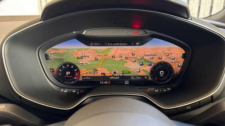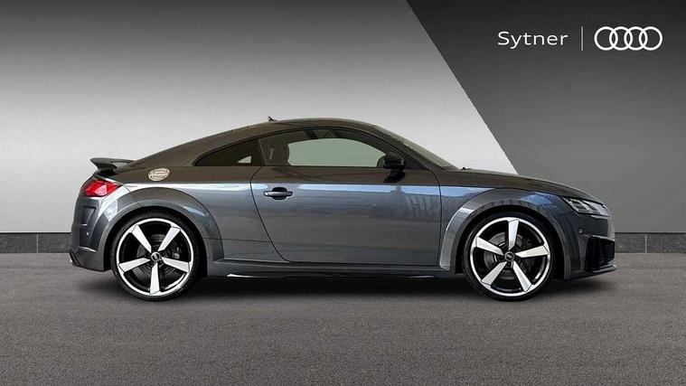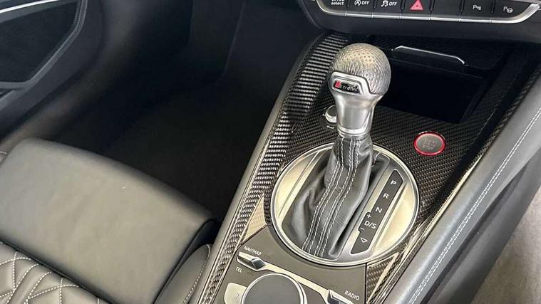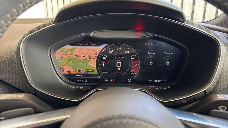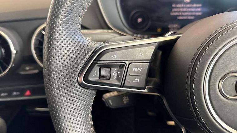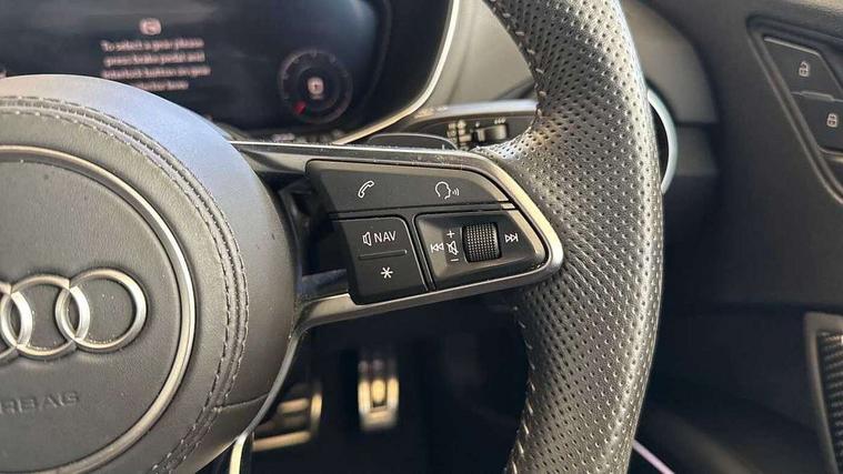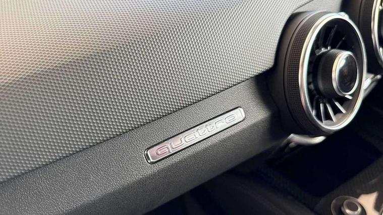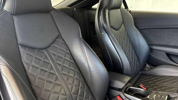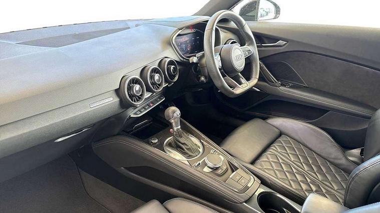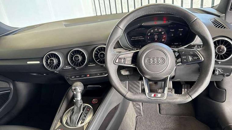 Audi drive select with 4 Pre configured modes, Audi side assist, Audi smartphone interface, Audi Virtual Cockpit with sport gauge, Camera based traffic sign recognition, Cruise control + speed limiter, Emergency call service, Mobile phone preparation with bluetooth interface, Progressive power assisted steering, Service interval indicator, Start/Stop system with energy recuperation, TP memo, Audi magnetic ride, AM/FM radio, Bluetooth audio streaming, DAB Digital radio, MMI Radio with CD player and SD/XC card slot, Audi Beam uses LEDs to project the Audi Sport logo, Auto dimming rear view mirror, Black door mirrors, Dark privacy glass from B-pillar backwards, Electric front windows, Electrically adjustable, foldable and heated auto dimming on driver side and automatic kerb view dipping function on the passenger side, Green tinted heat insulating glass, High beam assist, LED 3rd brake light, LED Dynamic rear indicators, Light and rain sensors, Matrix LED light+LED daytime running light, LED Indicator, Headlightclean, auto dynm headlight range+dynamic cornering light, Motorwaybeam/Manoeuvre light, Rear boot, Sunband for windscreen, 12V socket, 2 rear seats, 3 spoke flat bottomed contour leather multi-function TTS sport steering wheel and TTS badging, 4 way electric lumbar support for driver and front passenger, Black headlining, Black roll bar, Deluxe auto air conditioning with integrated digital display, Door sill trims with aluminium inlay and TTS logo, Electrically adjustable front seats with pneumatic backrest side bolster adjustment, Fine Nappa leather upholstery with Super Sport seats + "S" embossing, Front centre armrest, Front passenger seat, Heated front seats, Height adjustable front head restraints, Height/reach adjust steering wheel, ISOFIX child seat mounting for front passenger seat with airbag deactivation, Perforated leather gearknob in black, Rear head restraints, Rear top tether child seat ISOFIX attachment, Split folding rear seat, Stainless steel pedals, Black styling pack - TT, Comfort and sound pack - TT with park assist, Leather pack - TTS, LED interior light pack - TTS, Non smoking pack - TT/TT RS, Technology pack without Audi phone box - TT, 3 point front seat belts, ABS, ASR traction control, Curtain airbags, Driver and front passenger airbag with front passenger airbag deactivation, EDL traction control, Electromechanical parking brake, ESP, First aid kit, Front side airbags, Head airbags, Hill hold assist, Seatbelt warning, Tyre pressure loss indicator, Warning triangle, Anti theft alarm, Anti theft wheel bolts, Immobiliser, Keyless Go, Remote central locking, Carbon inlays, 20" 5 arm cutter style Audi sport in anthracite black diamond cut alloy wheels, Tool kit, Tyre repair kit,