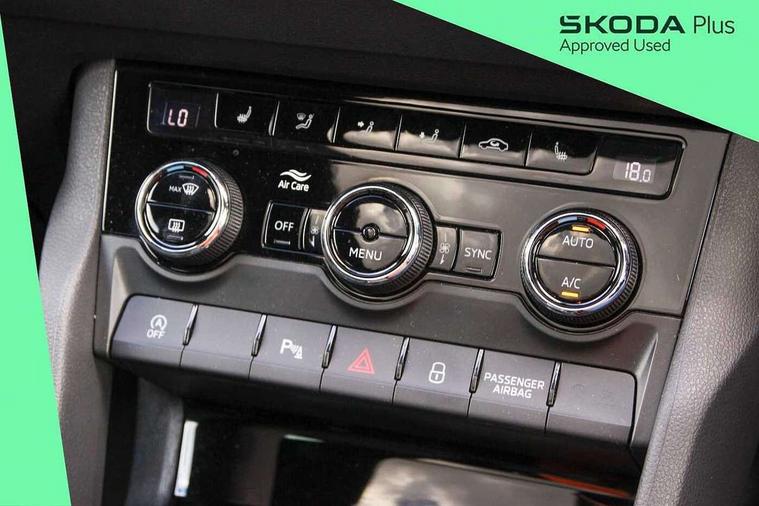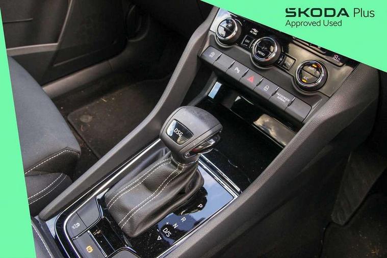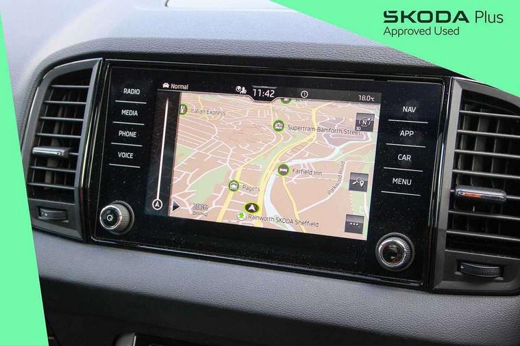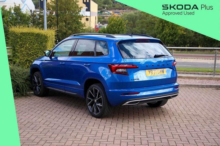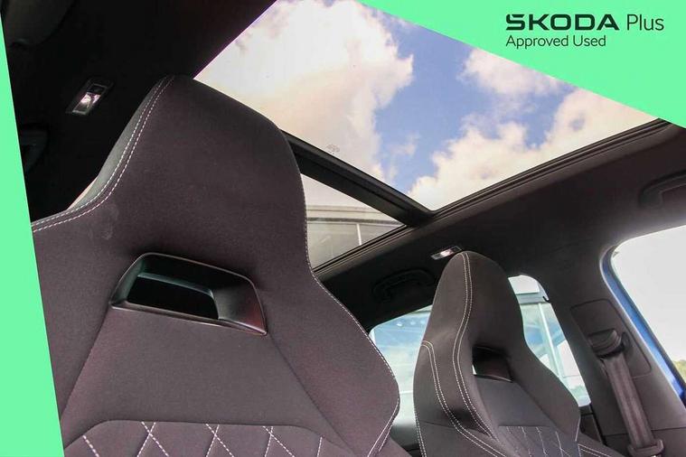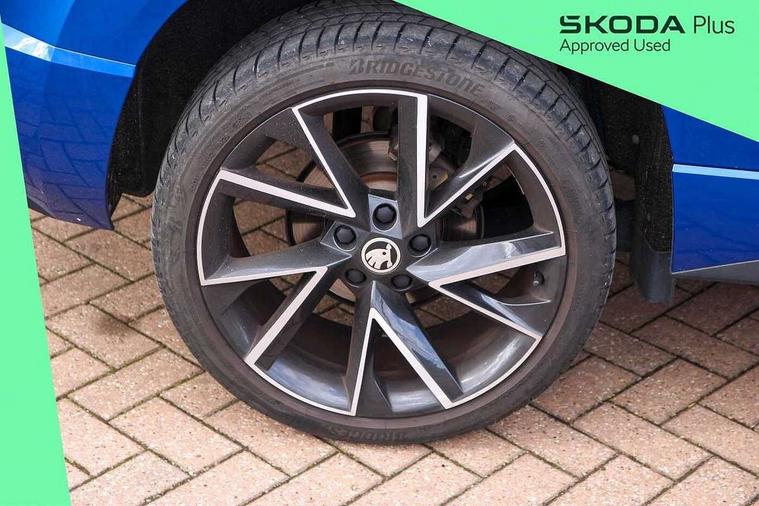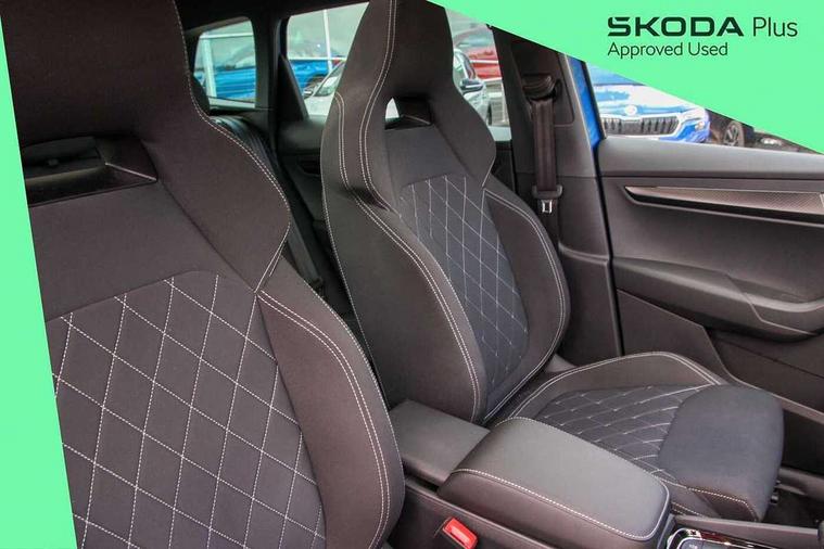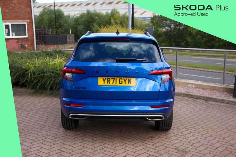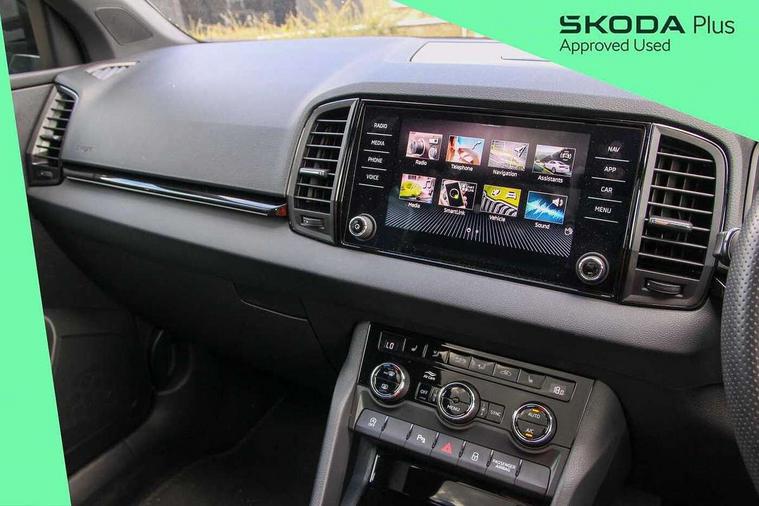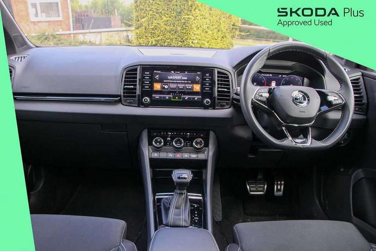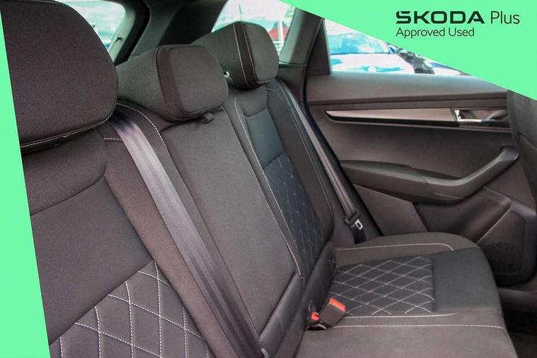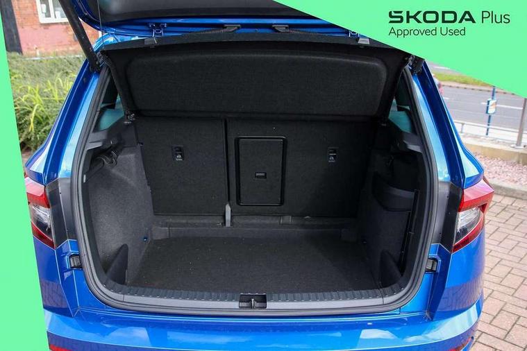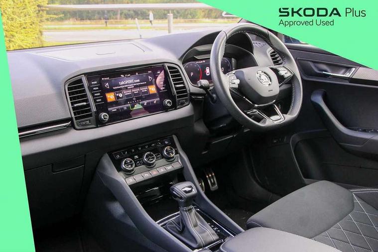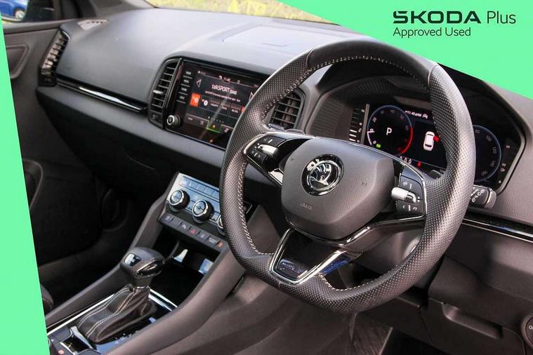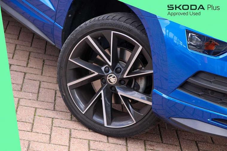 Care connect, Drive mode selector, Driver fatigue sensor, Multifunction colour trip computer, Outside temperature gauge, Service interval indicator, SmartLink wireless for Apple and wired for Android, Start/stop system with regenerative braking, USB C Port x 2 in front centre console, DAB radio with Bluetooth, USB connection, Wireless charging without wireless aerial connection, Acoustic glass, Aero front windscreen wipers with intermittent function, Automatic headlight control system, Black door mirrors, Black electric window control buttons, Black radiator grille, Black roof rails, Body colour door handles, Body coloured bumpers, Electric front and rear windows with child proof lock, Front door steps with SportLine logo, Full LED headlights + adaptive front light system + LED daytime running lights and front cornering fog lights, Headlight washers, Heated rear windscreen, LED rear lights with high functionality, Light assistant (coming/leaving home/tunnel light), Panoramic sliding sunroof, Privacy glass, Protective door side sills in body colour, Rear diffuser, Safety reflectors on front doors, Skoda lettering on tailgate in black, Sportline badge on front fender, Sportline decorative inserts with badging, Sports front and rear bumpers, Third brake light, 1.5 litre bottle holders in driver and front passenger door panels, 12V socket in boot, 12v socket in front centre armrest with storage compartment and rear air vents, 2 Folding hooks and nets in boot, 2 Front readings lights for driver and passenger, 3 rear height adjustable headrests, 4 foldable roof handles with rear coat hooks, Aluminium pedals, Black roof headlining, Cargo elements in boot, Chrome inner door handles, Door sill scuff plates, Driver and passenger seats height adjust, Front head restraints, Height adjustable front three point seats belts with tensioners, Height/reach adjust steering wheel, Ice scraper, Illuminated and cooled glovebox, Illuminated luggage compartment, Isofix child seat preparation outer rear, Manual lumbar support for front seats, Net programme in boot, Pen holder, Pollen filter, Rear reading lights, Rear seats fixed folding and divided 60:40, Retractable parcel shelf attachable to tailgate, Safety vest holder, Solid rear boot cover, Storage box in upper central dashboard closed, Storage compartment below the passenger seat, Sunvisors with illuminated vanity mirrors, Textile floor mats, Umbrella under passenger seat, Welcome animation with sportline logo, LED Interior lighting pack with Skoda welcome logo - Karoq, Airbags - Front side, head, knee and curtain, Automatic door unlocking in case of crash, Automatic fuel cut off in case of crash, Driver airbag, Electronic parking brake with auto hold function, Emergency rear braking signal, ESC including ABS, MSR, ASR, EDS, HBA, DSR, RBS, MKB and traction control, Front assist radar scanning of the space in front of the car with automatic braking, Hill hold control, Passenger airbag with switch-off function, Pedestrian monitor, Seatbelt reminder signalisation and pretensioner for all seats, Three point seatbelts rear, Two tone horn, Tyre pressure display, Tyre pressure monitor, Alarm with interior monitoring, back up horn and tilt sensor with safe function, Electronic engine immobiliser, Keyless entry and keyless start with safe system, Remote central locking with 2 remote folding keys, Black air vent surround, 19" Vega anthracite alloy wheels, Anti-theft wheel bolts protection, Storage on wheel cover,