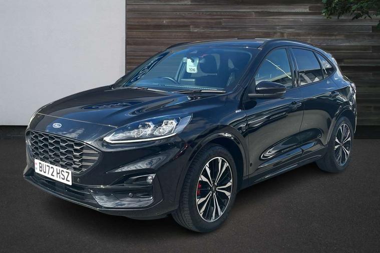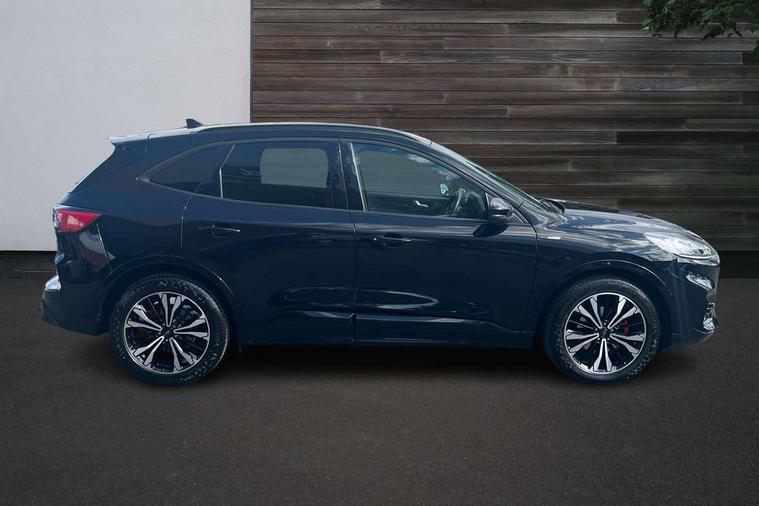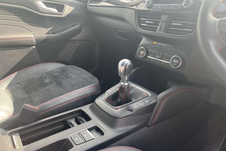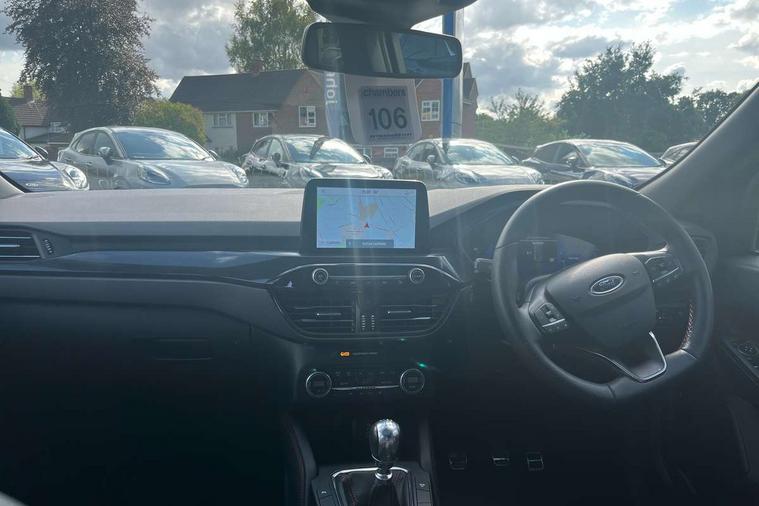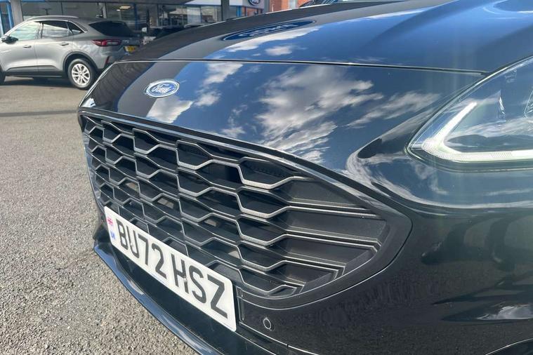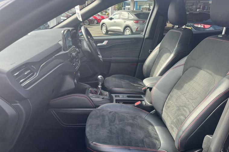 12.3" digital colour instrument cluster, Ford easy fuel, Ford SYNC 3 with 8" TFT LCD touchscreen, App Link, andriod auto/apple carPlay, emergency assistance and navigation with Ford pass connect, Front and rear parking sensors, Hands free power tailgate, Lane keeping aid with lane departure warning, Power assist steering, Rear view camera, Selectable drive modes, Service interval indicator, Sports suspension, Twist beam rear suspension, B&O premium audio system with 10 speakers and subwoofer, 2 USB ports, DAB radio/CD, Auto headlamps with high and low beam, Black roof rails, Day/night rear view mirror, Front LED fog lamps, Large rear spoiler, LED daytime running lights, LED rear lights, Power folding heated door mirrors with puddle lights, Power front/rear windows with global close, Power opening panoramic roof, Privacy glass, Quickclear heated windscreen, Rear side wing doors, Rear wiper, ST Line body styling kit with unique front and rear fascia and bumper, rear painted diffuser, front painted skid plates, dark mesh upper grille, ST Line front scuff plates, Third brake light, Twin exhausts, 10 way power adjustable drivers seat, 2nd row sliding seats with 60:40 split, 8 way manual passenger seat including lumbar support and height adjust, Alloy pedals, Centre console with electronic parking brake, Dark headlining and pillars, Dual electronic automatic temperature control, Flat bottomed leather steering wheel in sensico with red stitching, Front and rear head restraints, Heated passenger and driver seats, Heated rear seats, Heated steering wheel, Partial premium touch sensico leather upholstery with black cloth inserts and red stitching, Rear charging point, Single front passenger seat, Sports seats, ST Line front and rear floor mats, ST Line gear knob, 3x3 point rear seatbelts, Airbags - front driver/passenger, front and rear curtain, Drivers knee airbag, Electronic stability control (ESC) and ABS, Ford MyKey Gen 2 safety system, Manual child proof rear door locks, Post collision braking, Pre collision assist with autonomous emergency braking, Rear seat Occupancy alert, Red brake calipers, Tyre pressure monitoring system, Engine immobiliser, Keyless entry and Ford power start button, Locking wheel nuts, Remote powered central double locking doors, Thatcham category 1 alarm,