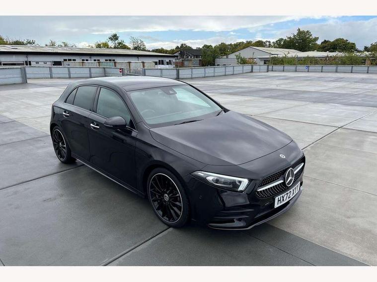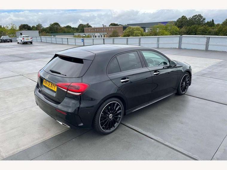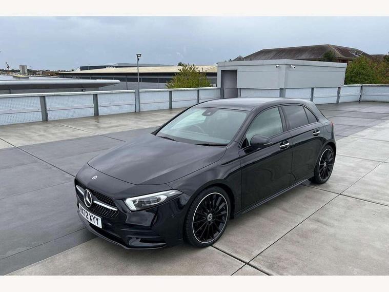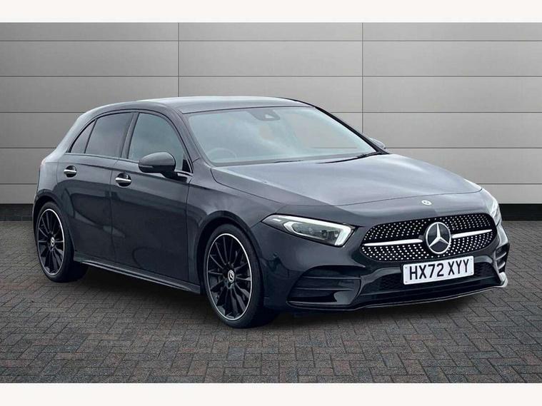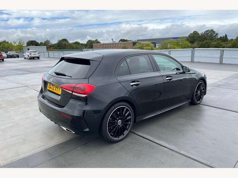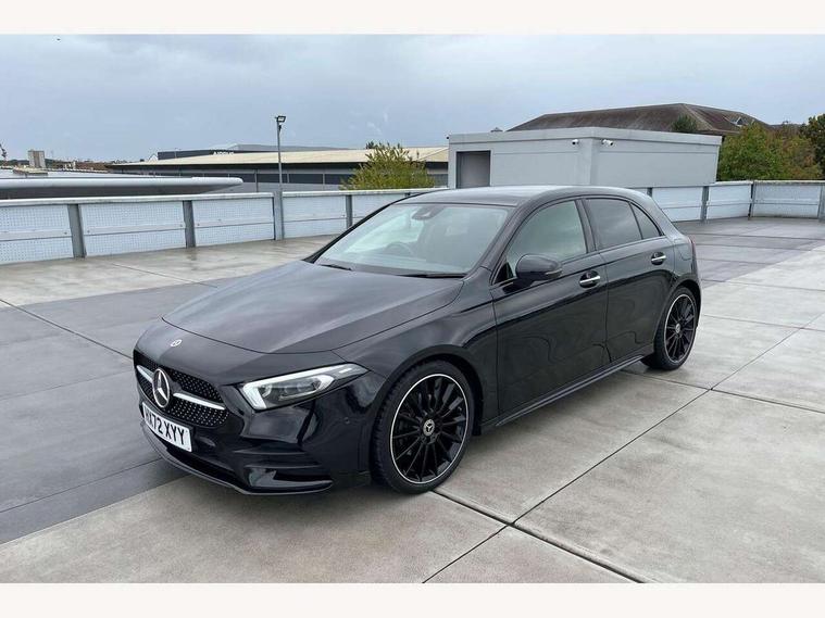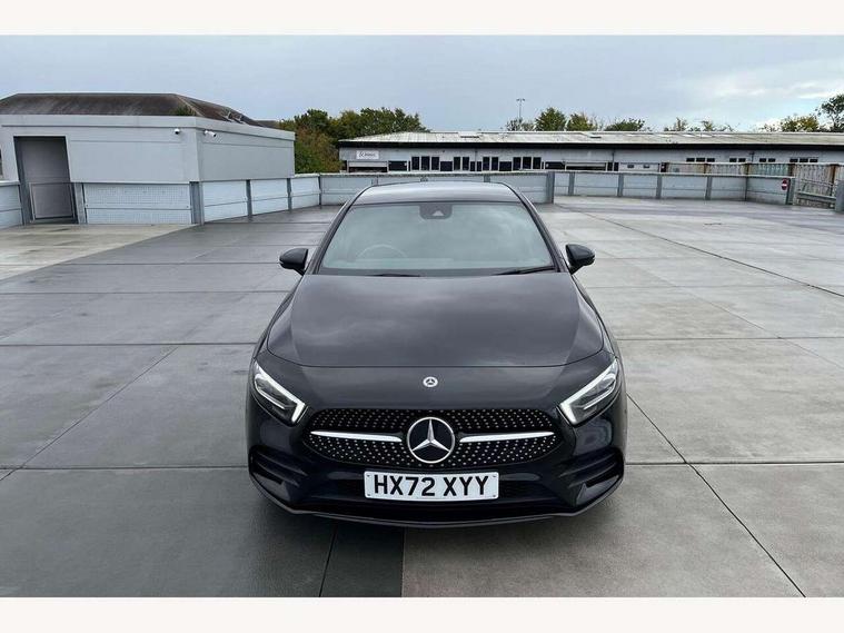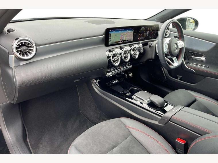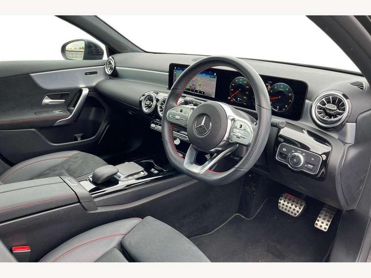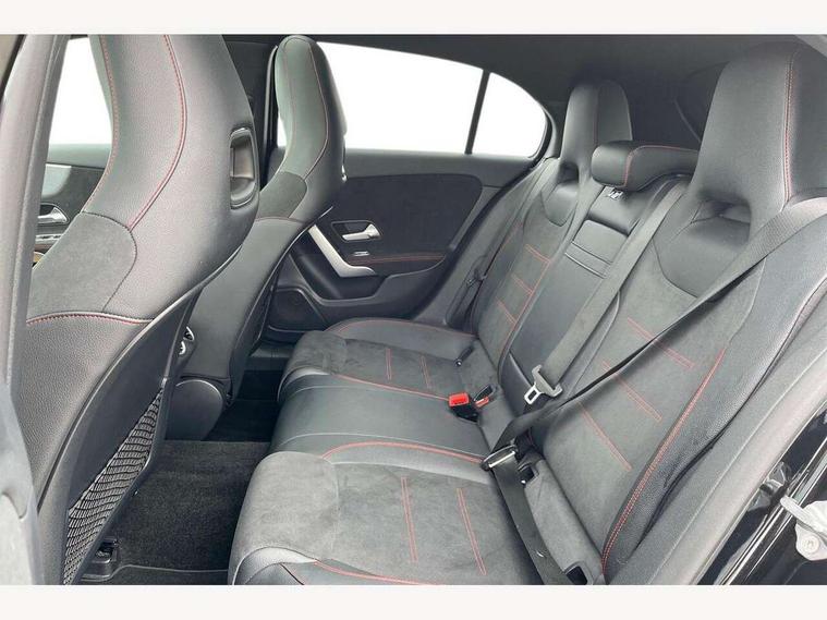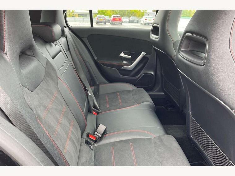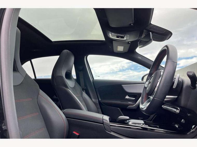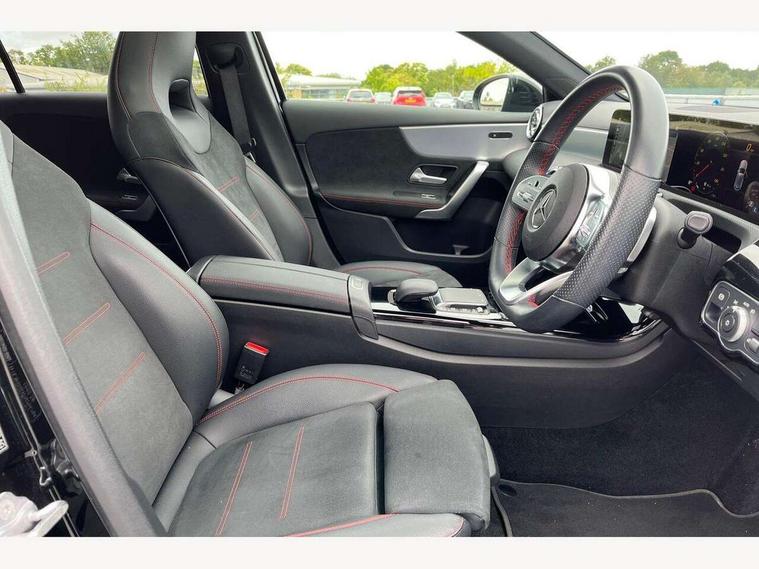 10.25" Digital instrument cluster display screen, 10.25" media display, 180 degree rear view camera with parking guidelines, Active parking assist with visual and audible warning of detected obstacles, Attention assist, Brake pad wear indicator warning light, Car wash mode, Cruise control + speed limiter, Direct steering, Dual bluetooth interfaces, DYNAMIC SELECT with a choice of driving modes (ECO, Comfort, Sport and Individual), ECO start/stop function, Fluid level warning indicator for fuel, oil, coolant and washer fluid, Hard-disk navigation, Hey Mercedes Voice activation, Lamp failure indicator, Lane keeping system, Mercedes me connect including emergency call system, accident recovery, breakdown and maintenance management, Mercedes me remote services, Outside temperature gauge, Owners manual in English, Pre-installation for private car sharing, Preinstallation for Mercedes Benz link, Service indicator (ASSYST), Smartphone integration with Apple CarPlay and Android auto, Speed limit assist, Speed sensitive power steering, Traffic sign assist, Trip computer, Ultrasonic sensors positioned in the front and rear bumpers, Lowered comfort suspension, Rear axle torsion beam, 2 USB ports (type C) in rear stowage compartment and one in front of center console, 6 speakers, DAB Digital radio, MBUX multimedia system with DAB digital radio and touchpad including satellite navigation, Mercedes-Benz sound system - 100W, 4 Electric Front and Rear windows, Adaptive brake lights, AMG bodystyling - Front apron with splitter in chrome, rear apron with chrome trim and chrome visible trim elements in tailpipe, Automatic headlights, Black weather strip, Body colour bumpers, Body colour door handles with chrome inserts, Body colour side skirt, Electric adjustable and heated door mirrors with integrated LED side indicators, Exclusive diamond radiator grille, Exhaust system - Twin visible tailpipes in polished stainless steel, Headlamp assist automatic headlamp activation, Heated glass rear windscreen + timer control, LED daytime running lights, LED High level third brake light, LED tail lamp, Multibeam LED headlights with adaptive highbeam assist plus, Panoramic sliding sunroof, Privacy glass, Radio aerial, Rain sensing windscreen wipers with two sensitivity settings, Rear fog lights, Rear side wing doors, Rear wiper, 3 seat bench in 2nd row, 3 Spoke flat bottom leather multi function steering wheel with perforated leather in grip area, 40:20:40 split folding rear seats, Artico man-made leather/Microfibre Dinamica upholstery with red contrast stitching, Auto Mercedes-Benz child seat recognition sensor, Black air vents with surround in silver chrome, Black roof lining, Brushed stainless steel sports pedals with rubber studs, Controller on centre console with chrome surround, Floor mats with AMG lettering, Front centre armrest with storage compartment, Front seat backs luggage nets, Galvanished gear shift paddles on steering wheel, Heated front seats, Height/reach adjustable steering column, Illuminated Mercedes Benz lettering front door sills with changeable cover, Interior lighting - 64 colour Ambient lighting, Interior mirror with reading lamps in black and frameless, Rear armrest with 2 cupholders, Rear head restraints, Seat occupancy sensor for front passenger seat, Single front passenger seat, Sports seats with integrated headrests, Stowage compartment in centre console with retractable cover, Sunvisors with illuminated vanity mirrors, Touchpad on center console, Twin front cupholders, Two zone thermotronic luxury automatic climate control, Light and sight pack - A Class, Mirror package - A Class, Night pack - A Class Saloon/Hatchback, Seat comfort pack - A Class, 3 rear 3 point seatbelts, ABS with Brake Assist, Active bonnet, Active brake assist includes forward collision warning system with autonomous braking, Adaptive brake assist with hold function and hill start assist, Black seatbelts, Childproof locks manually operated for rear doors and electrically operated for rear power windows, Crash responsive emergency lighting, Driver and passenger head and side airbags, Drivers knee airbag, Dual stage driver/passenger airbags, Electronic parking brake, ESP curve dynamic assist, ESP with ASR, Front and rear seatbelt reminder, Front brake callipers with Mercedes Benz lettering, ISOFIX and top tether child seat fixing points in two outer rear seats, Tyre pressure monitoring system, Warning triangle and first aid kit, Window airbags, Alarm system/interior protection/immobiliser, Keyless entry lock/unlock, Keyless Go, Remote central locking and crash sensor with emergency opening function, Urban guard vehicle protection system with immobiliser and interior protection, Matrix look light longitudinal grain aluminium trim element, 19" multi spoke light alloy wheels painted in black with a high sheen rim flange, Summer tyres, Tirefit sealant kit,