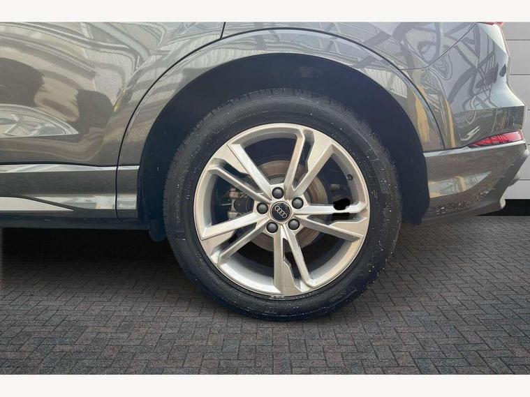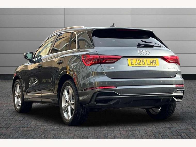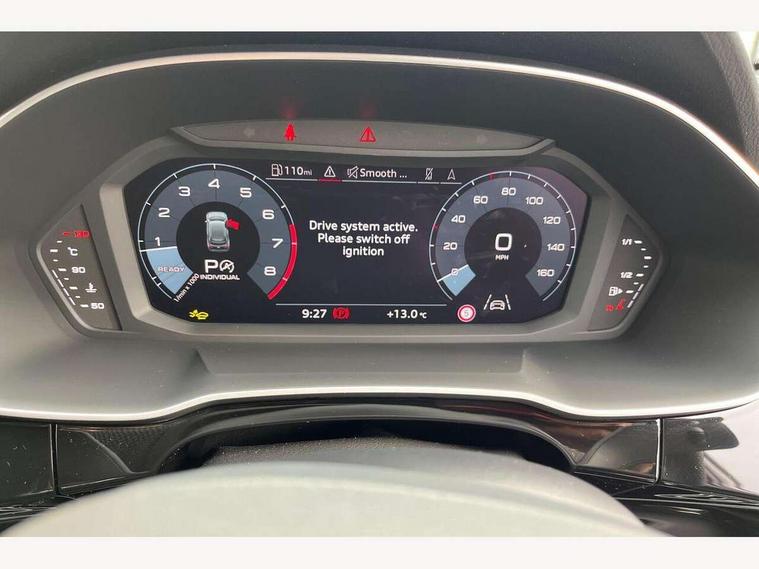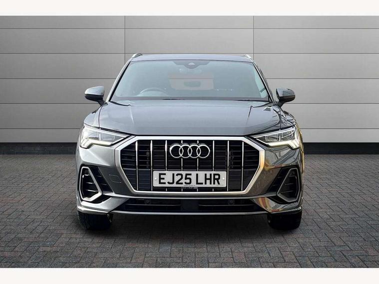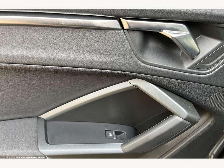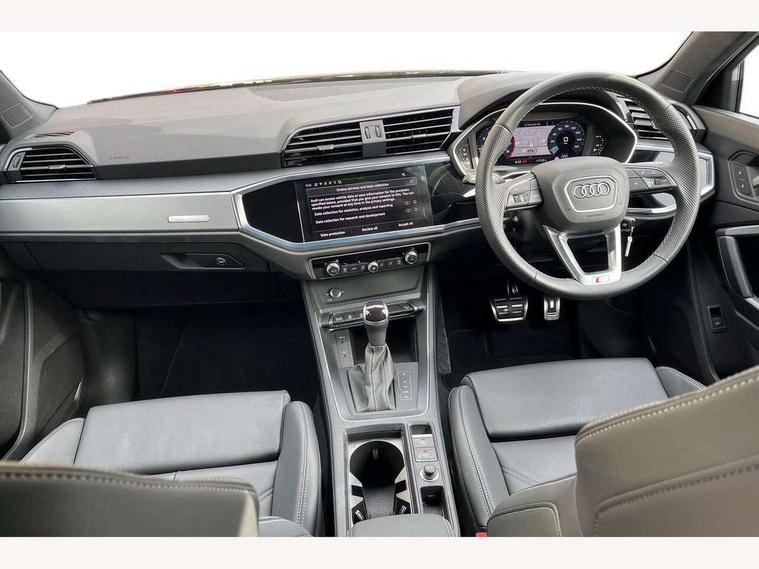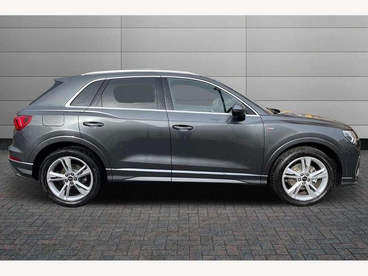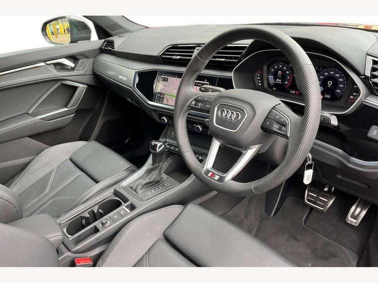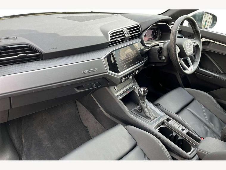 Amazon alexa Integration, Audi connect safety and service, Audi drive select, Audi lane departure warning, Audi Virtual Cockpit - 10.25" display, Bluetooth interface, Camera based traffic sign recognition, Distraction and Fatigue warning, Legal emergency call, MMI Navigation Plus with high resolution 10.1 inch touchscreen colour display, Power operated tailgate, Progressive steering, Service interval indicator, Smartphone interface includes wireless Apple carplay/Android Auto, Start stop system with recuperation, Voice control system with natural language interaction, Sports suspension, 2 USB-C ports with charge and data functions, 6 passive loudspeakers, DAB digital radio module, Acoustic windscreen, Aluminium roof rails, Aluminium window trim, Anthracite black radiator grille, Auto dimming door mirrors, Auto dimming frameless rear view mirror, Body colour front spoiler blade, Electrically folding, adjustable and heated door mirrors with integrated LED side indicators and kerb view function for passenger side, Front and rear electric windows, Front fog lights, Front side air inlets in matt platinum grey, Grille vertical bars in aluminium silver/Matt, High gloss black finish B and C pillars, LED Dynamic rear indicators, LED headlights with LED daytime running lights, LED rear lights, LED third brake light, Privacy glass dark tinted rear and rear-side windows (from B-pillar backwards), Rain and light sensors, Rear diffuser grille in grained matt black, Rear diffuser strip in matt anthracite black, Rear side wing doors, Rear wiper, S line badges on front wings, S line front and rear bumpers and side skirts in contrasting Manhattan grey paint finish, Side skirt insert in matt Platinium grey, Variable front intermittent wipers, 12V socket in rear centre console, 3 seat bench in 2nd row, 3 spoke leather multifunction steering wheel features S badging and grips in perforated leather with contrast stitching, 40:20:40 folding with manual adjustment for 60:40 forwards/backwards position and backrest angle, Adjustable rear seat bench/backrest with centre armrest and cupholder, Black cloth headlining, Dual zone electronic climate control, Electric lumbar support, Front and rear black floor mats with contrast stitching in rock grey, Front and rear headrests, Front centre armrest, Height and reach adjustable steering wheel, Illuminated door sill trims with S logo, ISOFIX child seat mounting for front passenger with airbag deactivation and outer rear seat including top tether attachment point for outer rear seats, Manual front seats with height adjustment, Perforated leather gearknob, Single front passenger seat, Stainless steel luggage compartment sill finisher, Stainless steel pedals, Twin leather upholstery with front sport seats + S embossing, Non smoking pack - Q3, 3x3 point rear seatbelts, 6 airbags - Driver, front passenger, curtain and side windows, Audi pre-sense front with pedestrain and cyclist recognition, Electrically operated child locks on rear doors, Electromechanical parking brake, Electronic stabilisation control including ABS, ASR and EDL, Front seatbelt reminder, Hill descent control, Hill hold assist, Pre sense basic, Seatbelt monitoring, Tyre pressure warning, Warning triangle and first aid kit, Anti theft wheel bolts, Immobiliser, Remote central locking, Thatcham approved category 1 anti theft alarm, Aluminium look interior elements, Dark matt brushed aluminium inlay, Detail dashboard around MMI touch colour display in glass look, black with surround in aluminium look, Leatherette door armrest,