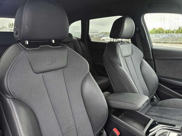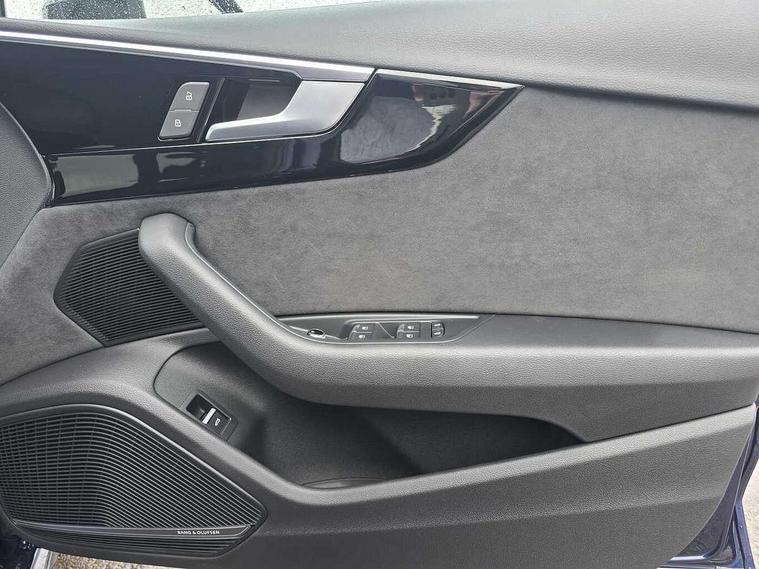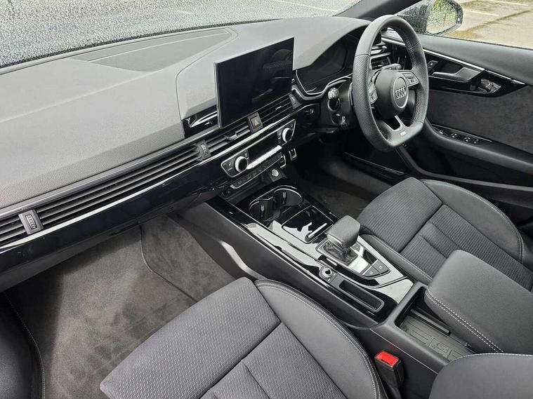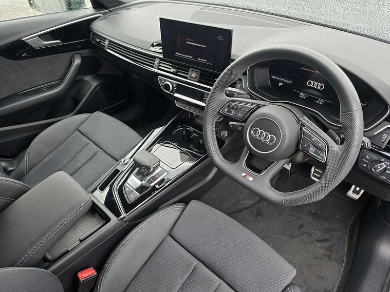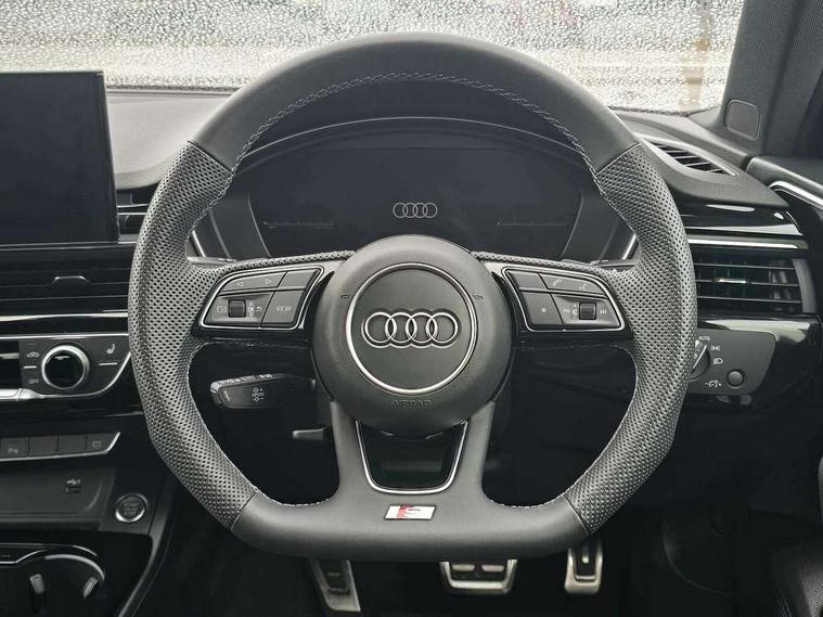 Audi connect safety and service (e-call), Audi drive select, Audi smartphone interface, Audi virtual cockpit, Automatic start-stop system with coasting functionality and efficiency programme, Bluetooth interface, Camera based traffic sign recognition, Electromechanical power steering, Email, calendar and text messages displayed via MMI, Front and rear parking sensors, Lane departure warning, MMI Navigation plus with MMI touch includes 10.1" high resolution colour MMI display, 3D map, Power operated tailgate, Rear view camera, Voice control system, Sports suspension lowered by 23mm, 2 USB charging ports, 8 passive loudspeakers, DAB digital radio reception, Audi beam uses LEDs to project the audi logo onto the ground as you exit your A4, Auto dimming rear view mirror, Black Audi rings and black badging (model name in black badging, no engine badging), Body colour door handles, Body colour front spoiler lip, Body colour side sill trim, Electric adjustable/heated/folding door mirrors with auto dimming, Exhaust tailpipes in high dark chrome, Grained matt black side air inlets with matt aluminium silver inlay, High beam assistant, High gloss black B pillar trims and triangular rear door trim, LED headlights with LED rear lights + dynamic rear indicators + headlight adjustment and high beam, turning light + LED daytime running lights, LED third brake light, Privacy glass, Rain and light sensors, Rear diffuser in matt black with trim strip in matt aluminium silver, Rear side wing doors, Rear wiper, RS4 rear spoiler in body colour, S Line roof edge spoiler, Sport front and rear bumpers with side skirts, Variable intermittent front wash/wipe, Windscreen with acoustic glazing, 4 way electric lumbar support for driver and front passenger, 40/20/40 split folding 3 rear seat bench in 3 parts with rear centre armrest, Black carpets, Black cloth headlining, Black perforated leather gearknob, Contrast stitching on seats, steering wheel and gear lever gaiter, Deluxe 3 zone electronic climate control, Electric load area cover, Front and rear head restraints, Front centre armrest, Heated front seats, Illuminated door sill trims with S logo, ISOFIX child seat mounting and top tether, Manual seat adjustment, Single front passenger seat, Stainless steel pedals and foot rest, Tool kit, Black styling pack - A4 Avant, LED Interior light pack - A4/S4, 3 rear seatbelts, 6 airbags - Driver, front passenger, curtain and side windows, Attention and drowsiness assist, Electronic Stabilisation Control (ESC) including ABS, ASR and EDL, Hill hold assist, Multi collision brake assist, Pop-up bonnet for pedestrian protection, Pre sense city, Rear door child safety locks, Seatbelt monitoring, Warning triangle and first aid kit, Anti theft alarm, Anti theft wheel bolts, Central locking, Keyless Go, Piano black finish inlay, Tyre repair kit,