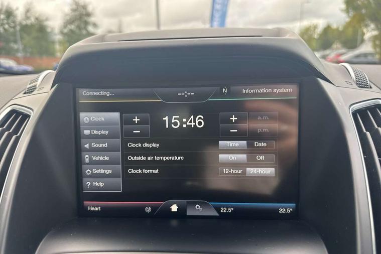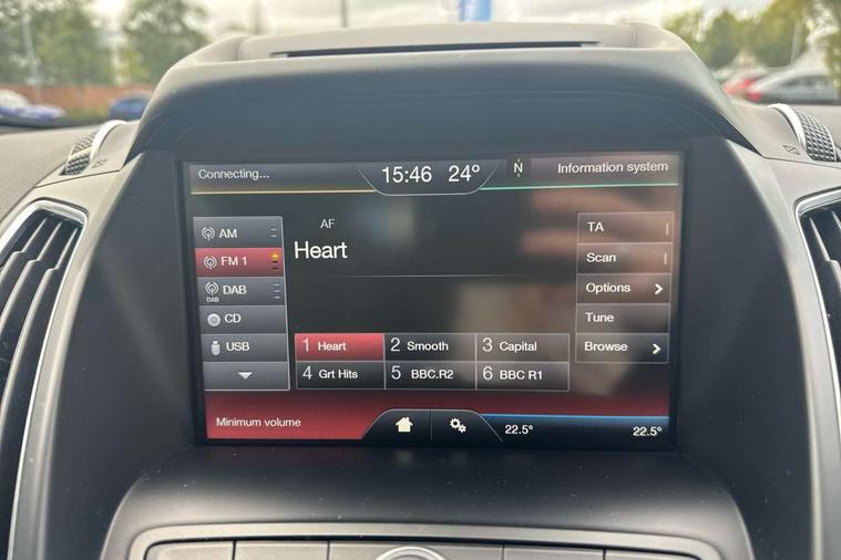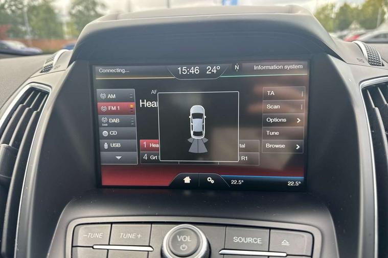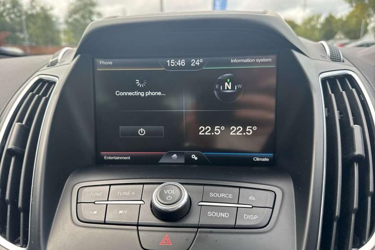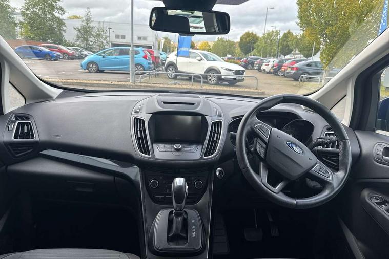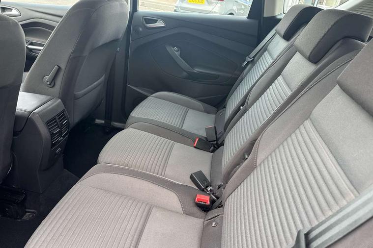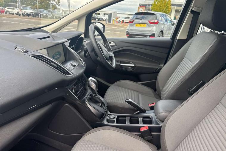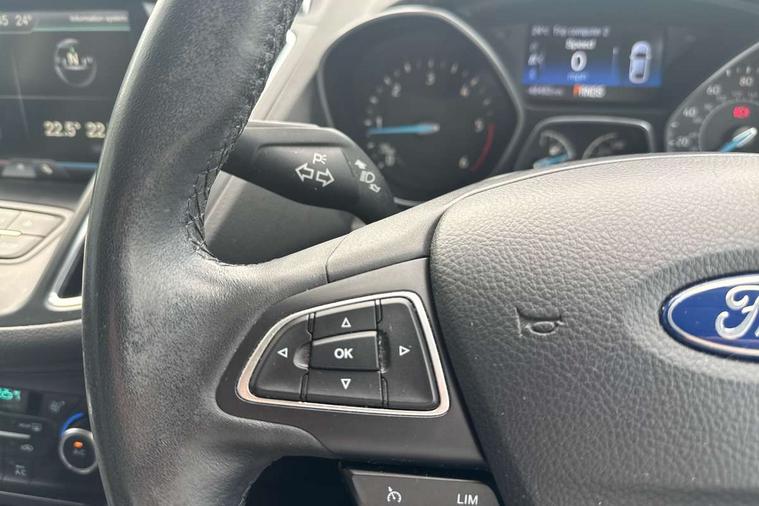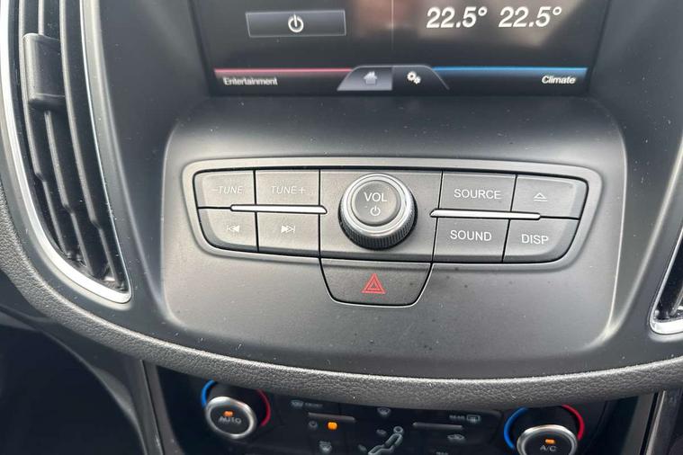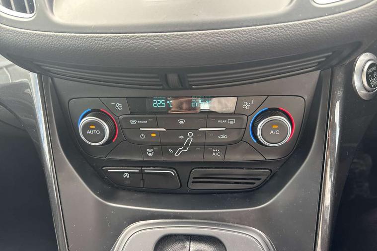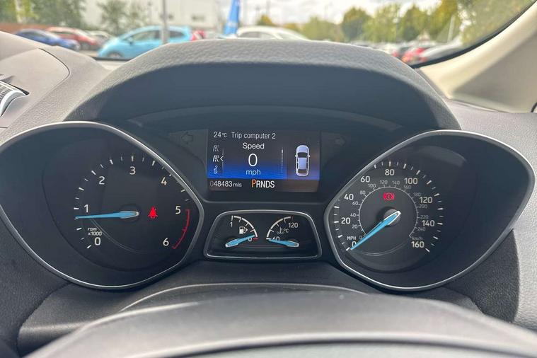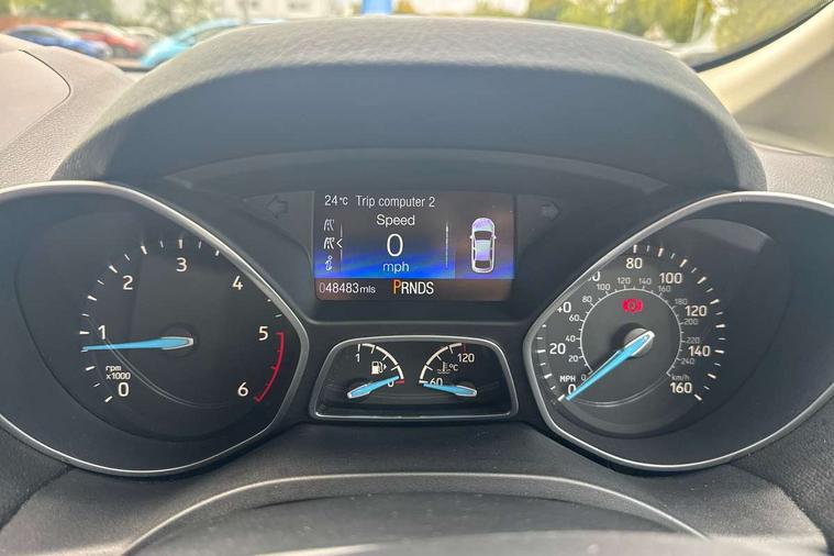 Driver's information system, Easy fuel capless refuelling system, Electric power steering, Engine start button, Multi function display colour screen, Trip computer, Diesel particulate filter, Steering wheel mounted audio controls, SYNC 2 DAB radio/CD, 8" colour touch screen, emergency assistance, Bluetooth connection, advanced voice control, USB connection, 'Global' closing of front/rear windows, Auto dimming rear view mirror, Automatic headlights, Automatic rain sensing wipers, Body colour bumpers with black rubbing strip, Body colour door handles, Body colour door mirrors with integral indicators, Chrome finish on upper door line, Electric front windows + drivers one touch, Electric heated door mirrors, Electric rear windows, Front fog lamps, Intermittent rear wash/wipe, LED daytime running lights, Quickclear heated windscreen, 12V accessory sockets - front and rear, 3 spoke steering wheel, Aluminium scuff plates, Ambient interior lighting, Auxiliary power socket, Centre armrest with storage box, Child observation mirror, Cloth upholstery, Courtesy light in luggage compartment, Driver's seat manual height adjust, Driver/passenger lumbar adjustment, Dual zone electronic climate control, Footwell illumination, Front + rear carpet mats, Front/rear courtesy lights, Front/rear reading lights, Fully adjustable front headrests, Isofix child seat attachment, Leather gearknob, Passenger seat height adjuster, Premium centre console, Rake/reach adjustable steering wheel, Rear parcel shelf, Satin chrome interior door handles, Sports style front seats, Three height adjustable rear head restraints, Versatile split folding rear seat - 40/20/40, 3x3 point rear seatbelts, ABS + traction control, Driver and passenger airbags, Driver and passenger side airbags, Electronic brake force distribution, Emergency brake assist, ESP, Front and rear curtain airbags, Height adjustable front seatbelts, Hill start assist, Intelligent Protection System (IPS), Power child locks, Tyre pressure monitoring system, Anti-theft immobiliser, Locking wheel nuts, MyKey system, Thatcham 1 volume sensing alarm, Satin black trim, Mini steel spare wheel,