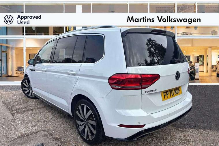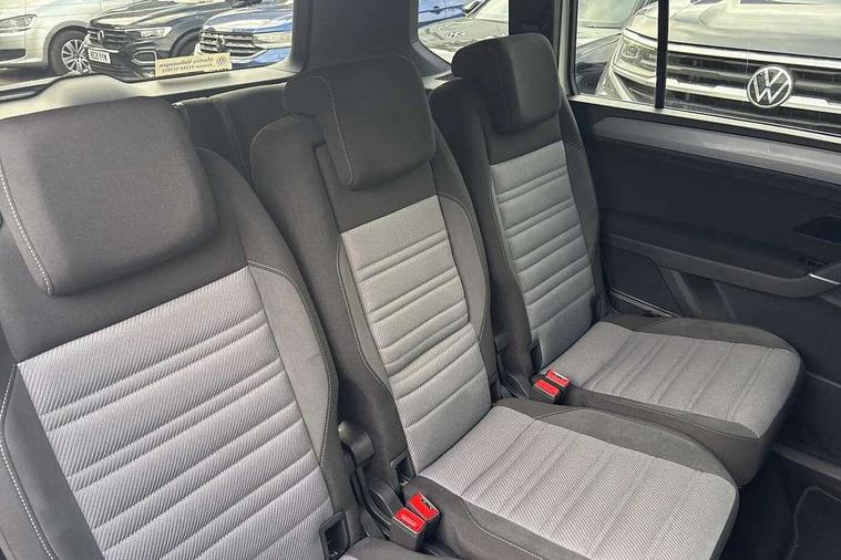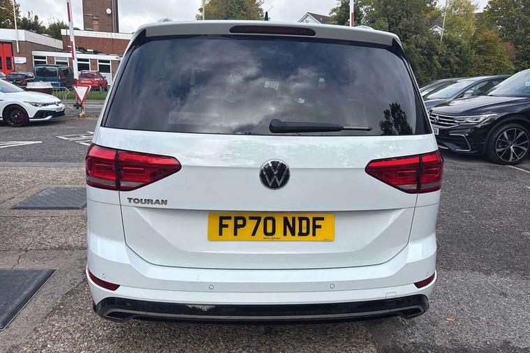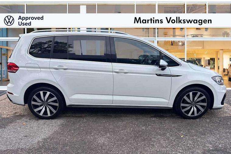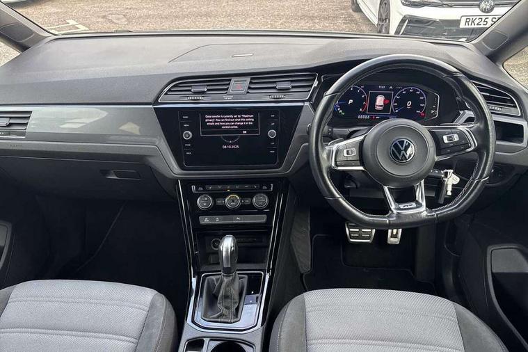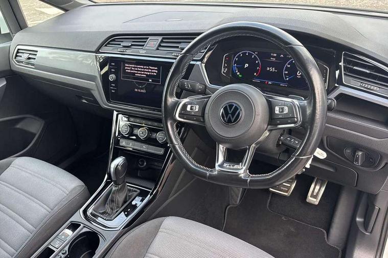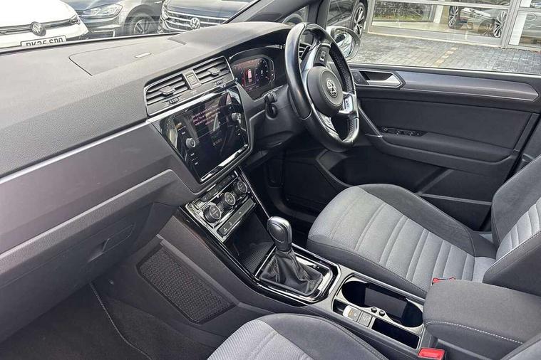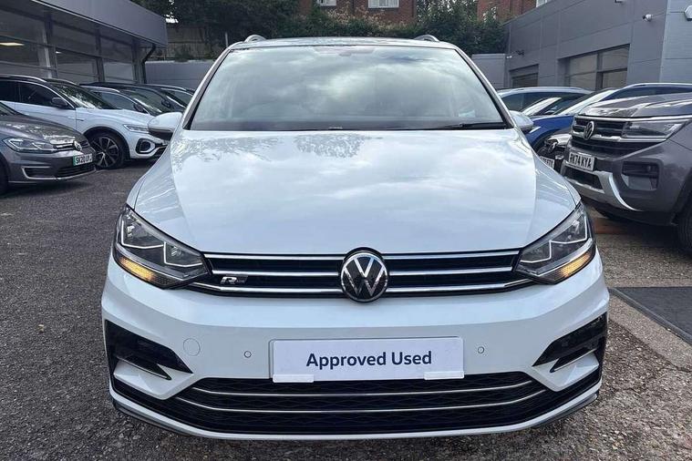 Adaptive cruise control, Audible lights on warning, Bluetooth telephone connectivity, Car information display, Driver alert system, Driver electronic voice amplification function, Electronic odometer, External temperature gauge, Flat tyre indicator, Mobile pairing with SMS function, Multifunction colour display, Rev counter with fuel gauge, Speed limiter, Speed sensitive power steering, Stop/start system, Think blue trainer driver tips and journey analysis, Trip and service interval display, Petrol Particulate Filter, XDS electronic differential lock, 4x20 watt output, Audio Connectivity System, DAB Digital radio, MP3/WMA compatability, SD card slot, Title and cover art display, USB connection, Aerial integrated into side window, Body colour bumpers, Body colour door handles, Body colour door mirrors with integral indicators, Chrome fog light surround, Chrome lower front bumper insert, Chrome trimmed front air intake surrounds, Chrome trimmed radiator grille louvre inserts, Chrome trimmed side windows, Dusk sensor + auto driving lights, Electric folding door mirrors with reverse activated kerb-view adjustment on passenger's door mirror, Front and rear electric windows, Fully galvanised body, Gloss black finish B pillar, Green tinted heat insulating glass, High level third brake light, Rear tinted glass from B-pillar backwards approx 65% tinted, Rear wash/wipe with intermittent wipe setting, Silver roof rails, Tailgate wiper- reverse gear activation, Twin chrome exhaust tailpipes, Unique R Line badging, Volkswagen roundel, Windscreen wipers intermittent wipe, 12V power point for Row 2, 12V socket in luggage compartment, 2 individual fold flat 3rd row seats, 2 three point seatbelts in 3rd row, 2nd row centre armrest, 2nd row centre seat converts into table, 3 single slide/fold/removable 2nd row seats, 3 Zone electronic climate control with automatic air recirculation, 3x3 point seatbelts on 2nd row with height adjust on outer seats, 4 boot load lashing points, 4 way adjustable front head restraints, 5 headrests, Aluminium kick plate, Ambient lighting in door trim and foot well, Black roof lining, Driver and front passenger under seat drawer, DSG Paddle Shifts, Dust/pollen filters, Foldable front passenger seat backrest, Front + rear carpet mats, Front and rear reading lights, Front centre armrest with storage compartment, Front comfort seats with lumbar support, Front cupholders x 2, Front passenger seat height adjust, Front seat R Line logo with rear seat backrest, Front seat storage pockets, Front seatback folding tables, Front seats with R-Line logo, Grey stitching on steering wheel, Height adjustable driver's seat, Height/reach adjust steering wheel, Illuminated glovebox, Illuminated vanity mirrors, Instrument lighting white adjustable panel illumination with red night time illumination, Interior light with delay, Isofix on 2nd row outer seats, Isofix on 3rd row seats, Large storage compartment in roof console, Leatherette on rear of front seats, Low tunnel 2nd row seat, Media box in dashboard on passenger side, Multi storage in passenger/luggage areas, Multi-function centre console with storage facilities, Multifunction leather trimmed steering wheel including leather trimmed gear knob with 3.5" screen with multifunction computer, R-Line door sill protectors, Retractable luggage cover, Split folding rear seat backrests, Stainless steel pedals, Storage bins on all doors, Convenience Pack - Touran, Mirror pack - Touran, R line styling pack - Touran, 3 point height adjustable front seatbelts, Auto hold function, Automatic post collision braking system, Door open warning reflectors, Driver/Front Passenger airbags, Drivers knee airbag, EDL + ASR, Electronic parking brake, Energy recovery system, ESC with ABS, First aid kit, Front and rear (row 2) curtain airbags, Front assist including city emergency braking, Front seat side impact airbags, Front/rear disc brakes, HBA (Hydraulic Brake Assist), Hill hold control, Loose wheel warning function, Passenger airbag deactivation system, Pre crash preventive occupant protection, Seatbelt warning lamp and buzzer, Traction control, Two tone horn, Warning triangle, Alarm with remote central locking and interior protection, Electronic engine immobiliser, Black lead grey decorative inserts dash and door panel, Chrome plated instrument surrounds, Embroidered emblems to headrestraints, 18" Marseille alloy wheels with self sealing tyres and anti-theft wheel bolts, Tyre mobility system,