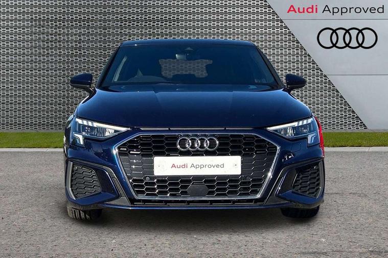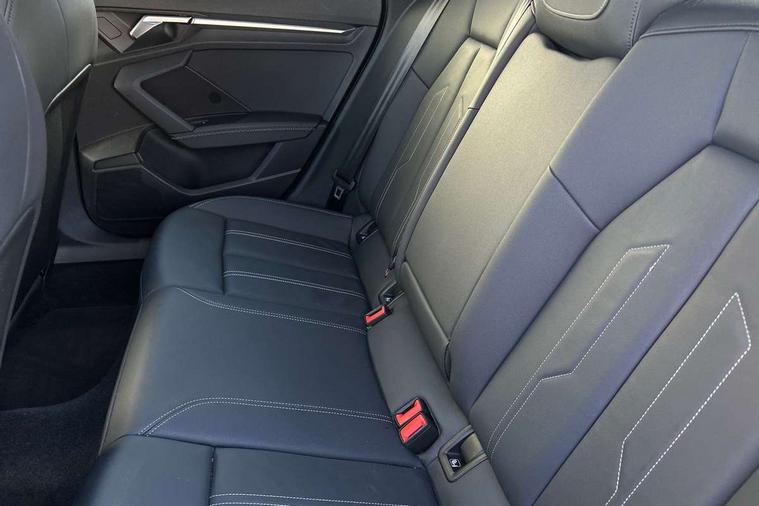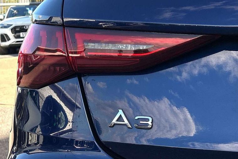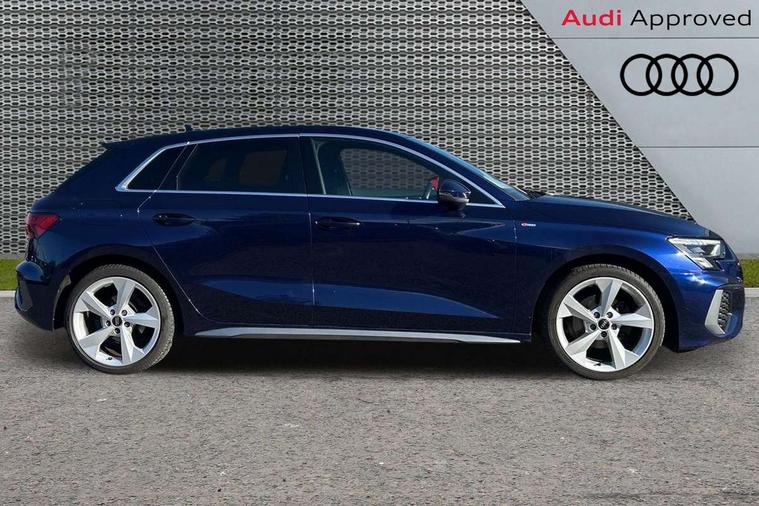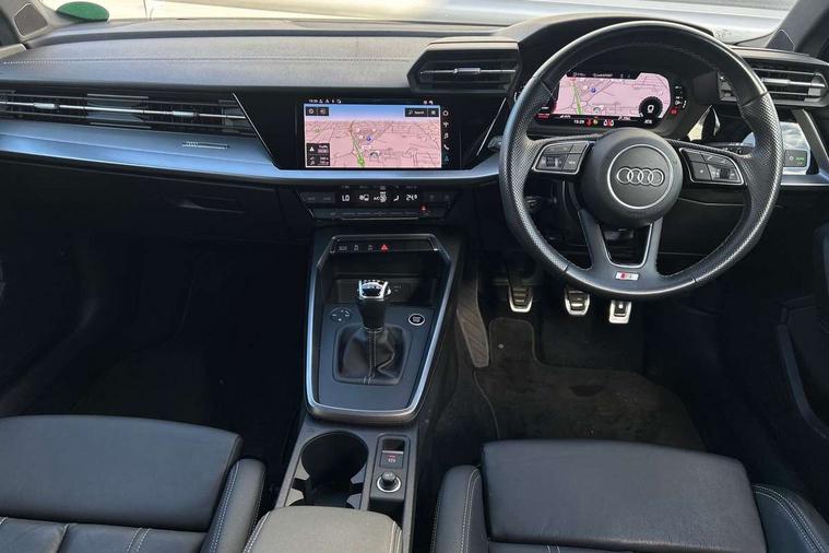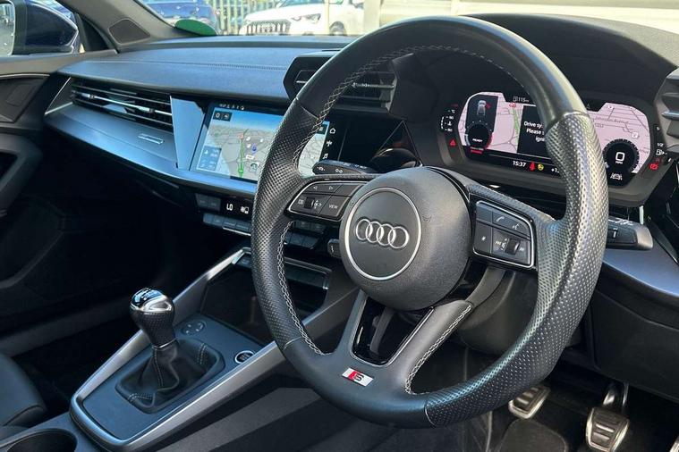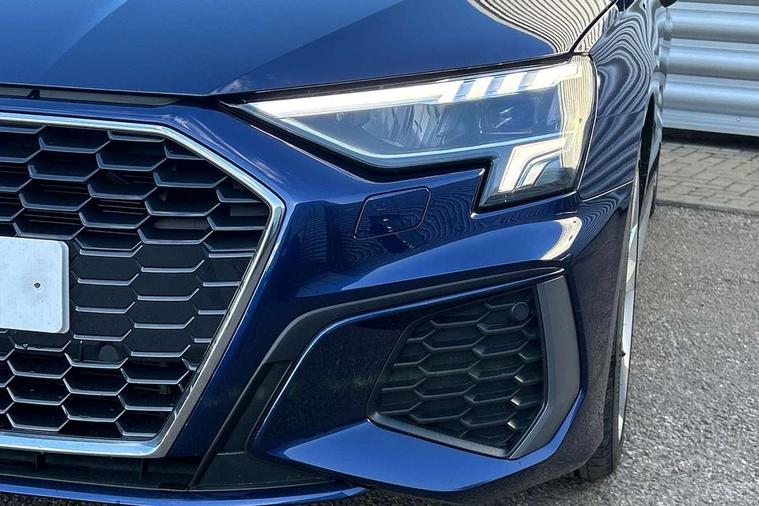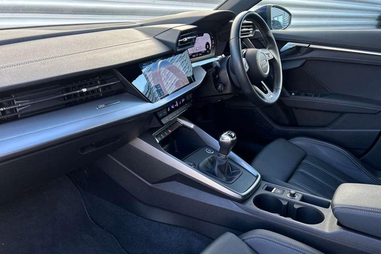 Audi drive select (Auto, Comfort, Dynamic and Individual), Audi smartphone interface, Audi Virtual Cockpit - 10.25" digital and colour instrument cluster, Automatic start/stop system with recuperation, Bluetooth interface, Camera based traffic sign recognition, Collision avoidance assistant, Cruise control, e-Call (emergency call), Electromechanical power speed sensitive steering, Lane departure warning system, MMI Navigation Plus with high resolution 10.1" colour touch screen display, Rear parking sensors, Service indicator, Trip computer, Voice control system with natural language interaction, Sports suspension, 2xUSB-C connection with data and charging functions, 6 passive loudspeakers, DAB Digital radio, 3rd brake light, Acoustic glass windscreen, Aluminium window trim, Auto dimming frameless rear view mirror, Body colour exterior mirrors, Electrically adjustable/heated/folding/auto dimming door mirrors with integrated LED indications + kerb view function for passenger side, Front electric windows, Illuminated door sills with aluminium inserts at the front with S logo, LED daytime running lights, LED headlights with LED rear lights and dynamic rear indicators, Light and rain sensors, Privacy glass - dark tinted rear window, rear door and side windows, Rear electric windows, Rear side air outlets in grained matt black, Rear side wing doors, Rear wiper, S line bumpers, S roof spoiler, 12V socket and storage compartment in front centre console, 3 seat bench in 2nd row, 3 spoke leather multifunction steering wheel, 4 way electrically adjustable lumbar support for driver and front passenger, 60/40 split folding rear seat bench, Black cloth headlining, Dual zone electronic climate control, Front and rear centre armrest in artificial leather, Front and rear headrests, Front/rear floor mats, Height and reach adjustable steering wheel, Interior lighting - glove compartment light and right hand side, Luggage compartment floor covering, Manual boot compartment lid, Manually adjustable front seats, Seat side bolsters, Single front passenger seat, Stainless steel pedals and front footrest in black, Twin leather upholstery with front sports seats S embossed logo, Aluminium interior elements pack - A3 Sportback, LED interior lighting pack - A3 Sportback, S line styling pack - A3 Sportback, 3x3 point rear seat belts, Driver and front passenger airbag with passenger airbag deactivation, Electronic Stabilisation Control (ESC) including ABS, ASR and EDL, First aid kit with warning triangle and 2 safety vests, Front side airbags with head airbags and interaction airbag, Pre-sense front with pedestrian and cyclist detection, Seatbelt monitoring, Tyre pressure loss indicator, Anti theft alarm, Anti-theft wheel bolts, Electronically operated child locks, Immobiliser, Remote control central locking, Dark spectrum aluminium inlays, accent surfaces in the dashboard and centre console in platinum grey silk effect paint finish,