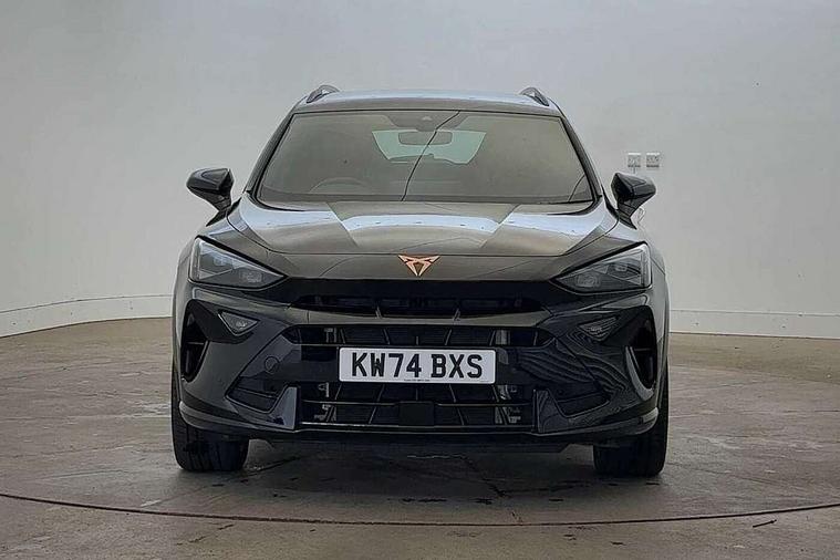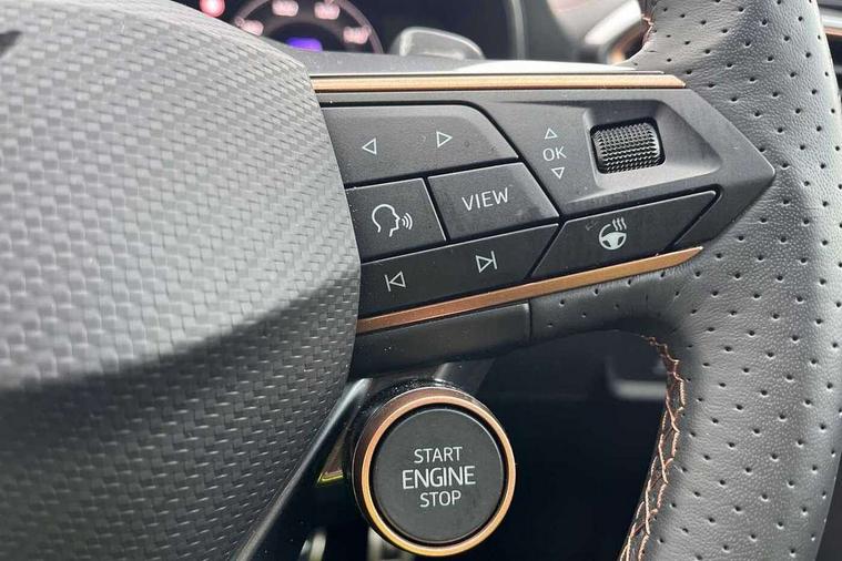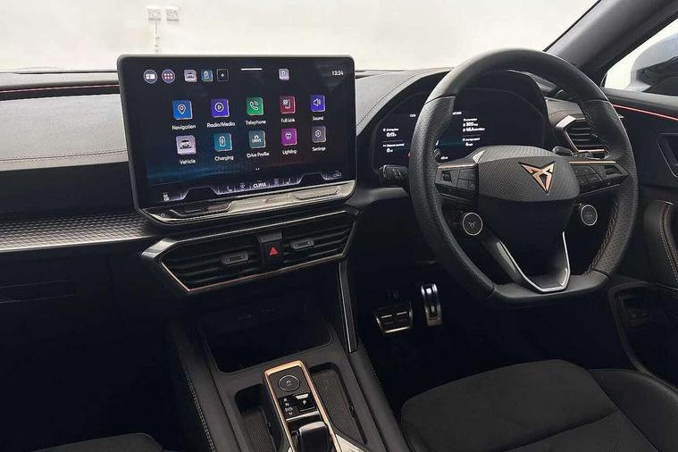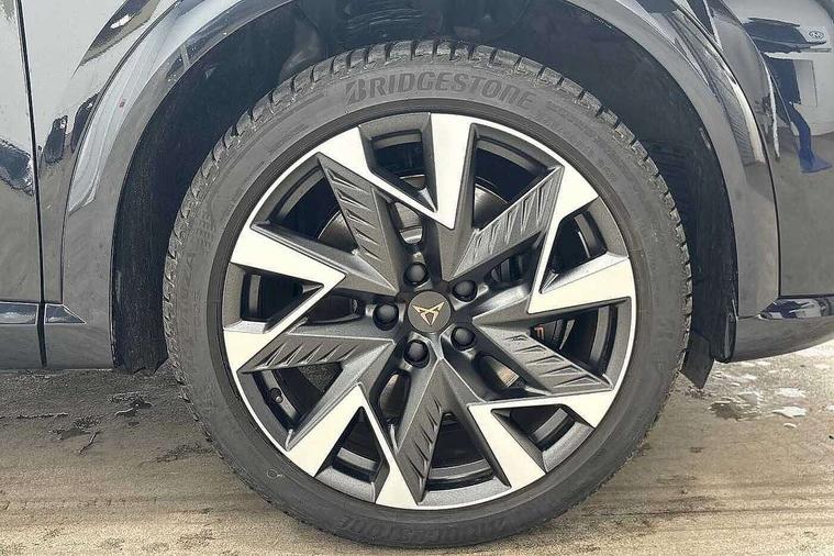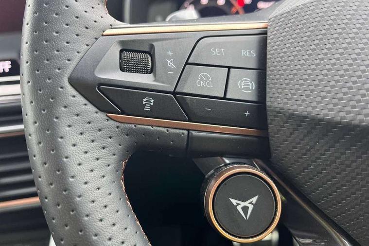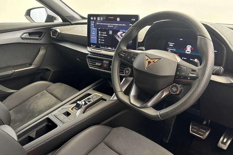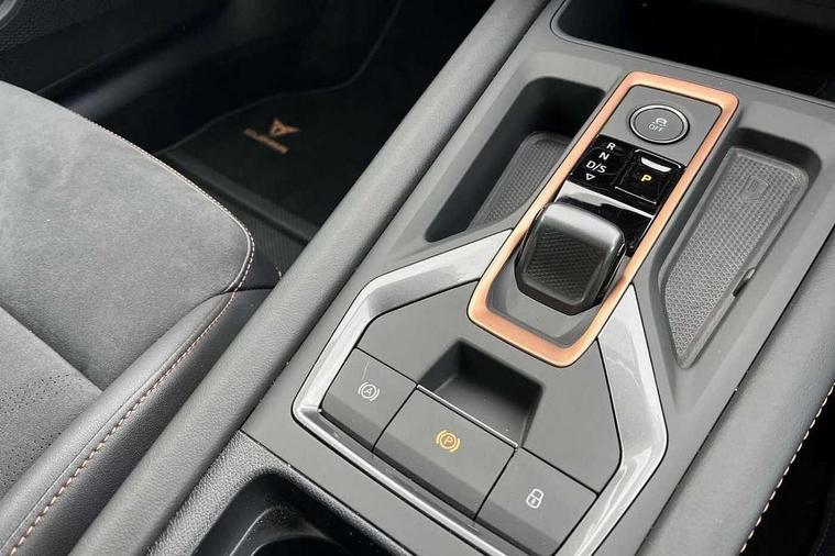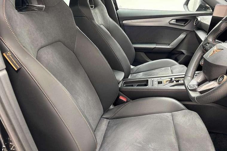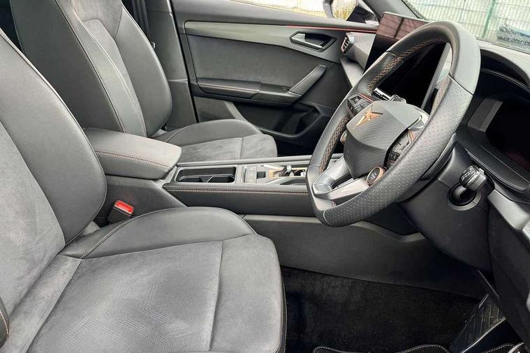 10.25" digital cockpit and configurable dashboard, Adaptive cruise control with follow-to-stop and speed limiter, Advanced driver alert system, Dynamic chassis control with driving profile selection (Comfort, Sport, CUPRA, Individual), Dynamic road sign display, Emergency steering support with turn assist, Forward collision warning with automatic braking, Front and rear parking sensors, Full link phone integration, Lane assist, Rear view camera, RPM, trip computer, outside temp gauge, instrument light brightness, low fuel warning light, lights on reminder, gearshift indicator, Service interval indicator, Speed sensitive power steering, Start/stop system with regenerative braking, Virtual pedal and electric tailgate, Voice control system, Wired Android Auto, Wireless apple carplay, Wireless phone charger, 10 amp mode 2 charging cable, 32 amp mode 3 charging cable, Adaptive chassis control with continuous operation, CUPRA sport suspension, Electronic locking differential and dynamic traction support, 2 front and 2 rear USB type C sockets, Media system with navigation, 12.9" touchscreen display, voice control, DAB, steering wheel mounted controls, Auto dimming rear view mirror, Body colour door handles, Body coloured bumpers, Dark grey wing mirror, Daytime running light with automatic headlight control and coming home feature, Door panel ambient lighting, Dynamic headlight range control, Electric front/rear windows, Electrically adjustable heated and folding door mirrors with memory function, Gloss black roof rails and window surrounds, High beam assist, LED 3rd brake light, LED front fog lamps with cornering function, LED Taillights with dynamic indicator, Matrix LED headlights with multifunction camera, Rain sensing wipers, Rear diffuser with copper simulated exhaust pipes, Rear fog lights, Rear side wing doors, Rear wash/wipe, Tinted rear windows, Welcome lights (within exterior mirror housing), 12V socket, 2 front and 2 rear reading lights, 3 seat bench in 2nd row, 60/40 split rear bench seat with armrest and mechanical seat release, Black headlining, Black interior roof lining, Cupra sports pedals, Dust/pollen filter, Electrically adjustable front seats with lumbar support and memory function, Front and rear head restraints, Front centre armrest, Heated front seats, Heated supersports multifunction leather steering wheel with satellite buttons and gear shift paddles, Height/reach adjust steering wheel, Illuminated aluminium doorsteps, Illuminated interior front door sills, Illuminated sunvisor with mirror, Isofix, Leather dashboard, door insert and side trim panel, LED smart wraparound lighting, PVC/Dinamica microfiber upholstery + bucket seats, Satellite steering wheel, Single front passenger seat, Storage pockets on rear of front seats, Three zone climate control with control panel in rear, 3 point seatbelts on all rear seats, ABS, Brake control system - ESC and brake booster, Child proof door locks, Driver and front passenger airbags with front passenger airbag de-activation, Electronic parking brake, Front and rear disc brakes, Front side curtain airbags, Hill hold control, Public e-call, Seat belt reminder for front and rear seats, Tyre pressure monitoring system, Anti theft alarm system, KESSY Advanced - Keyless start, keyless entry with SAFELOCK, Locking wheel bolts, Copper and aluminium interior detailing, 19" Sandstorm machined sport black and silver alloy wheels, Breakdown and tool kit,